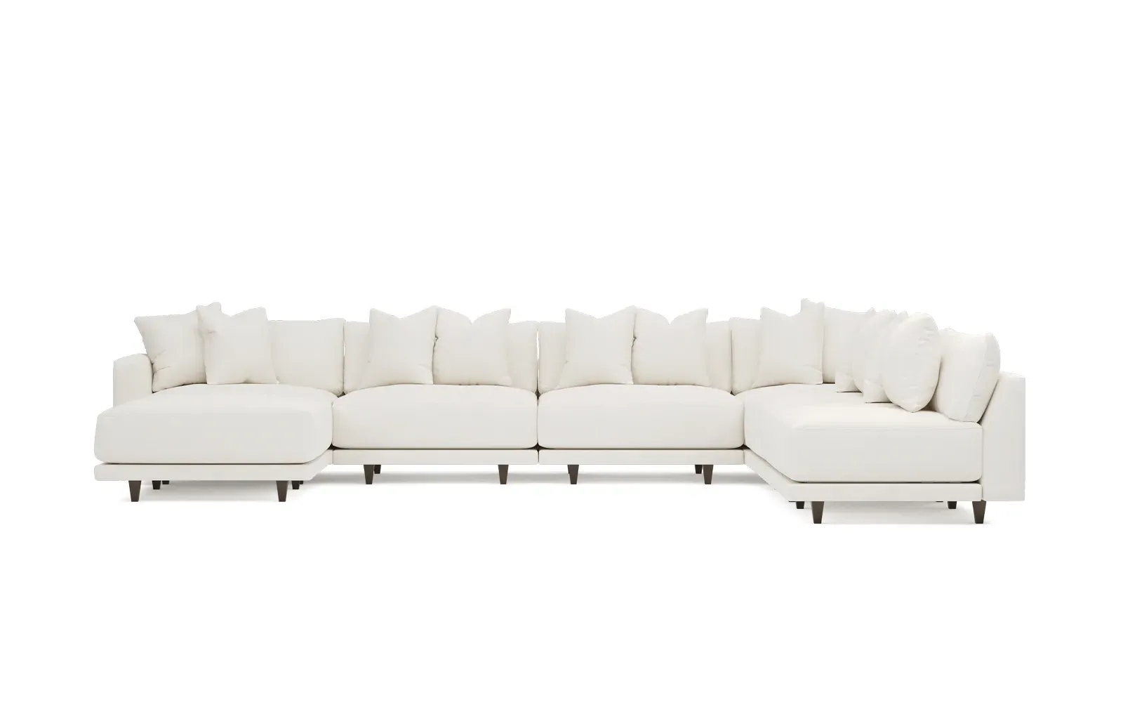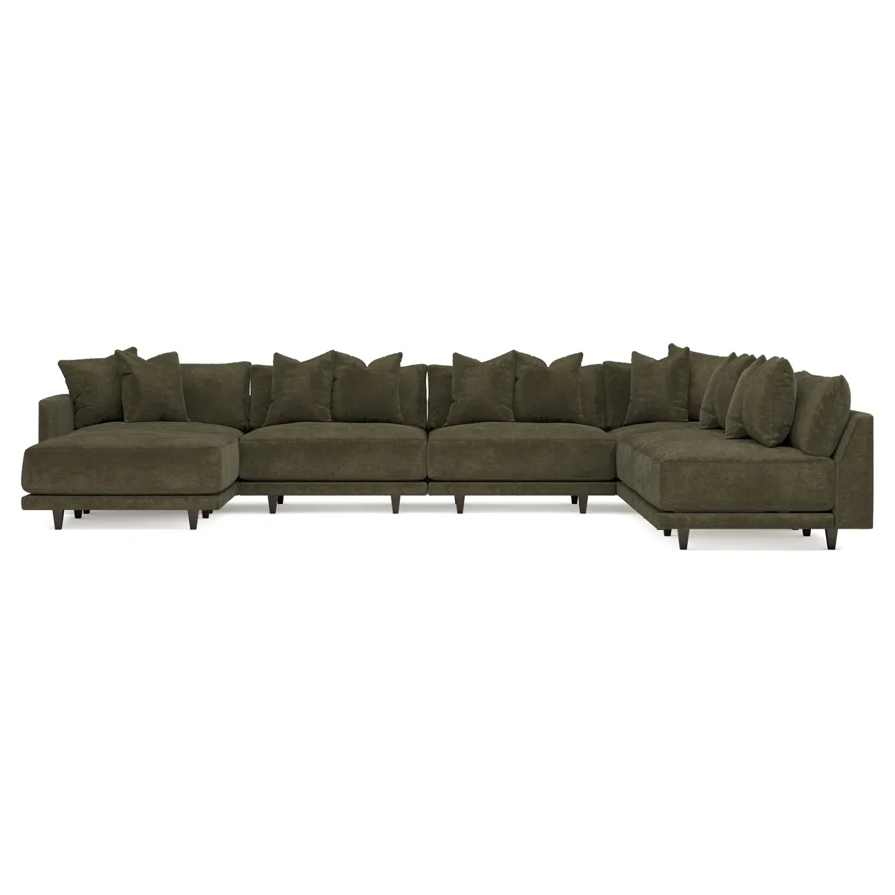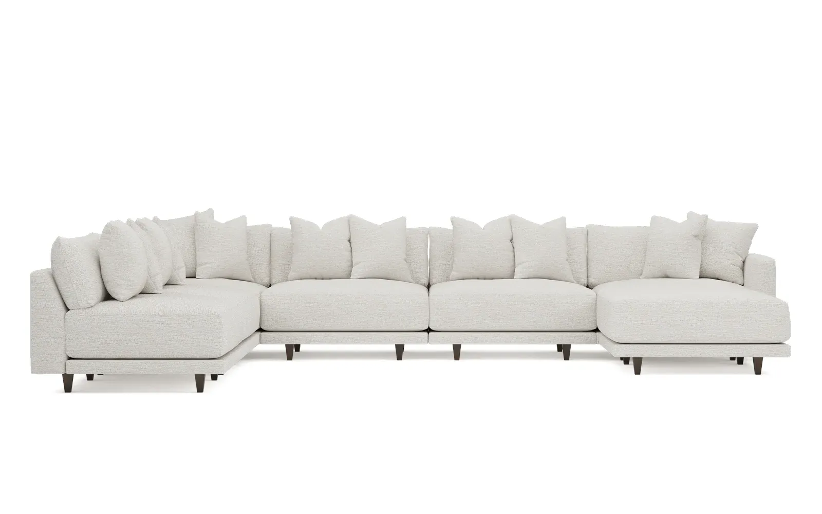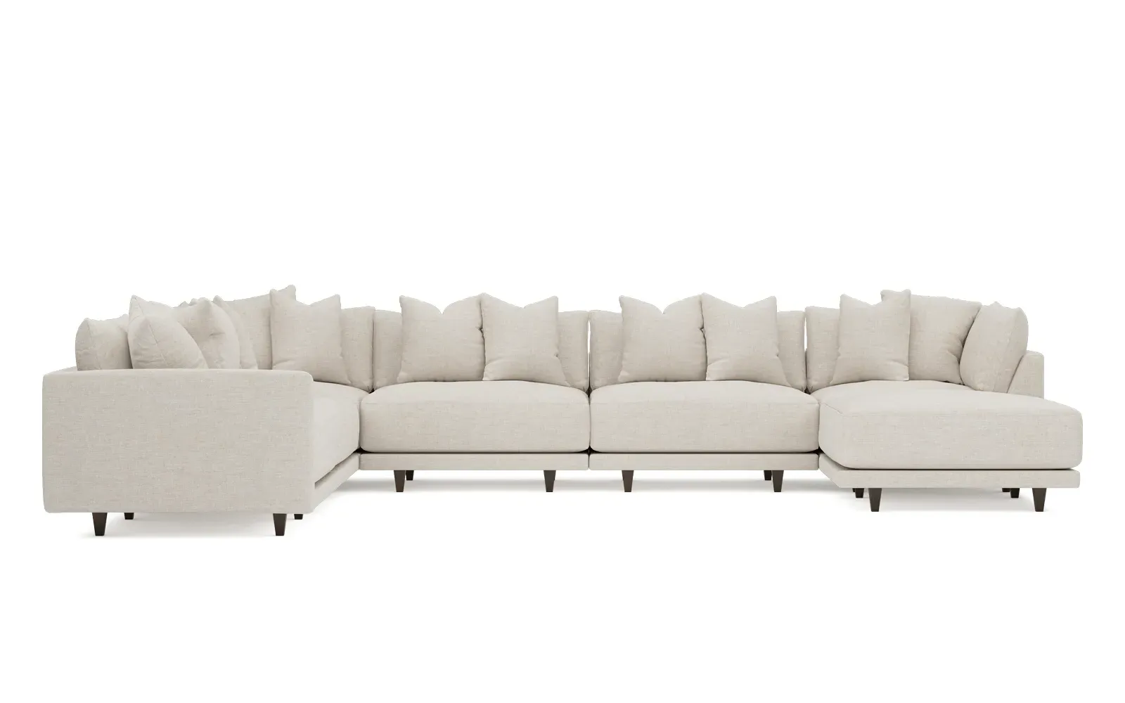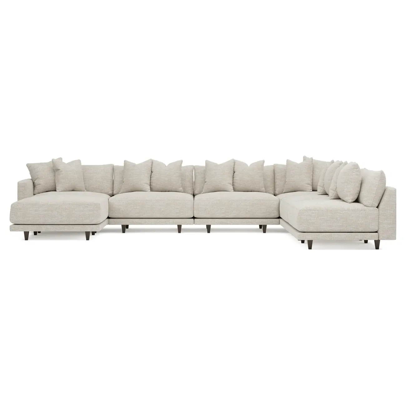 The left 171” Toulouse modular corner sectional is a family room’s perfect companion. With deep seating and oh-so-many plush pillows for sink-in comfort, the modern silhouette is delightfully relaxed. Recessed wood legs are hidden from sight, giving the sofa the appearance of floating. Lofted cushions are soft and supportive, with a foam core surrounded by a blend of fiber, down, and feather fill. Choose from a variety of upholstery options, including linen, velvet, and performance fabrics. <b>Overall Dimensions:</b> 171" W x 125" D x 35" H. <b>Ottoman Dimensions:</b> 40” W x 40” D x 20” H; <b>Corner Seat Dimensions:</b> 41” W x 41” D x 35” H; <b>Armless Seat Dimensions:</b> 42” W x 41” D x 35” H; <b>Single Seat Dimensions:</b> 46” W x 41” D x 35” H; <b>Seat Dimensions:</b> 29” D x 20” H; <b>Arm Height:</b> 27”; <b>Leg Height:</b> 5”. <b>Materials:</b> FSC®-certified, US-sourced, formaldehyde-free solid kiln-dried hardwood and furniture-grade laminates. <b>Material Finish:</b> Espresso legs. <b>Pieces Included:</b> Ottoman, Corner Seat, 4 Armless Seats, Left Single Seat.
