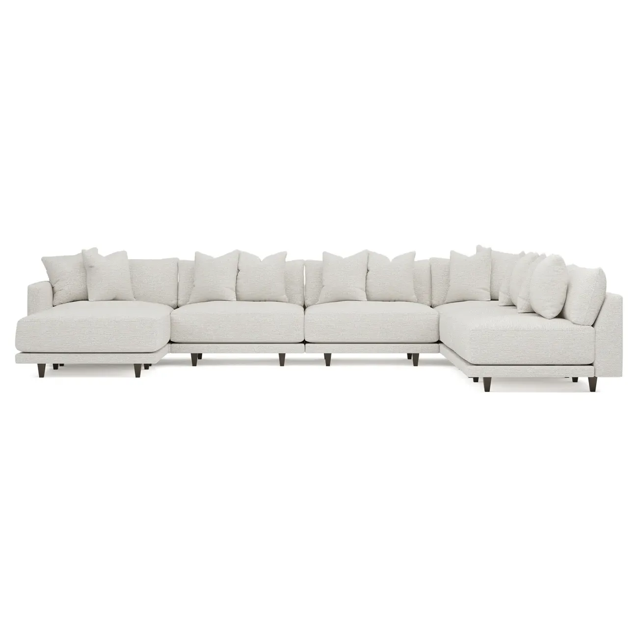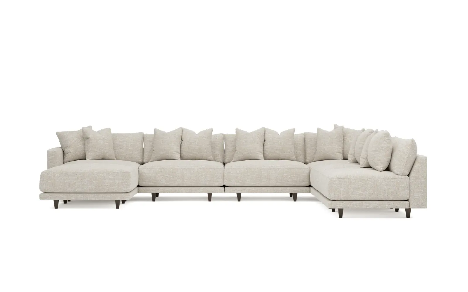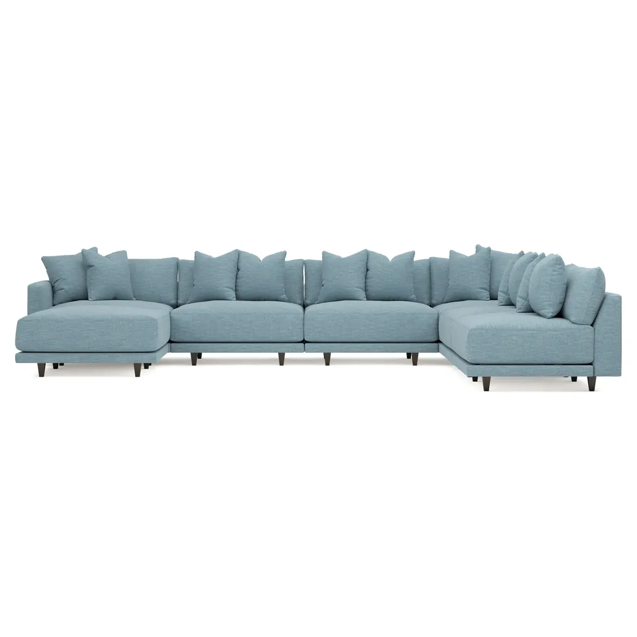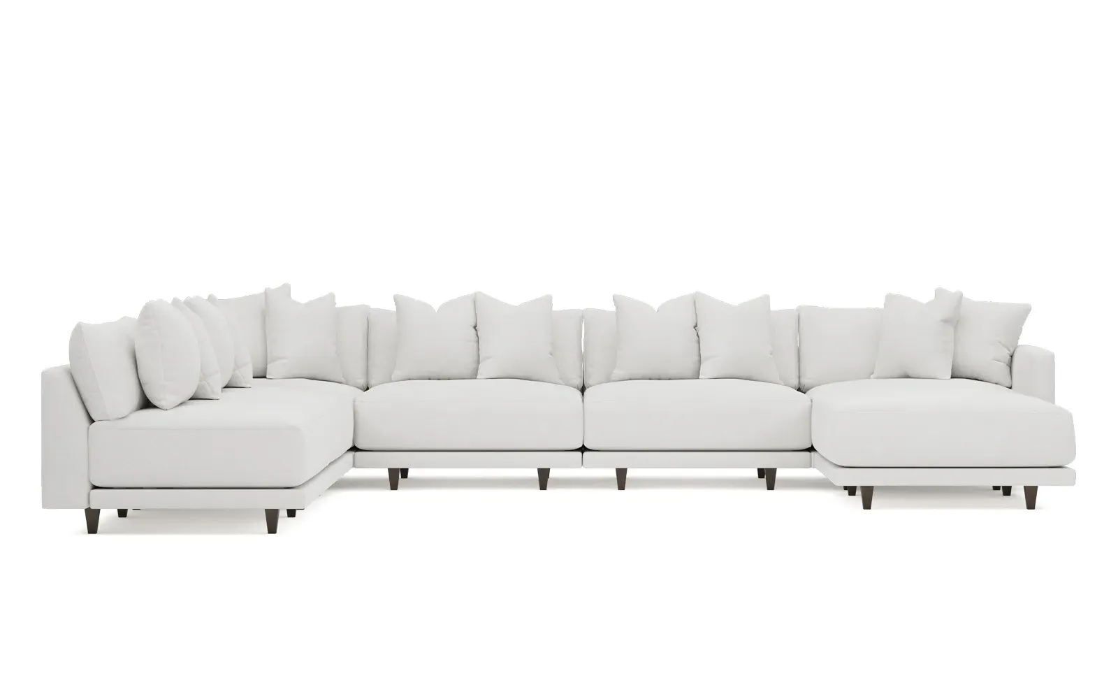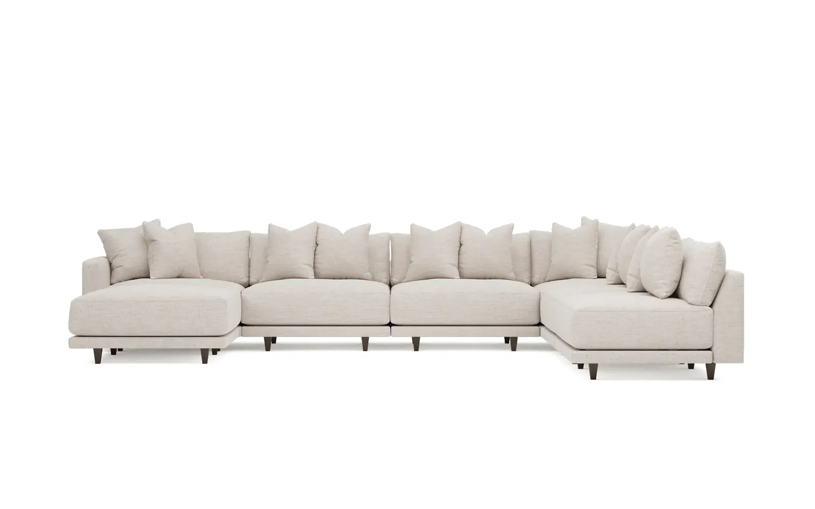 The left 171” Toulouse modular corner sectional is a family room’s perfect companion. With deep seating and oh-so-many plush pillows for sink-in comfort, the modern silhouette is delightfully relaxed. Recessed wood legs are hidden from sight, giving the sofa the appearance of floating. Lofted cushions are soft and supportive, with a foam core surrounded by a blend of fiber, down, and feather fill. Choose from a variety of upholstery options, including linen, velvet, and performance fabrics. <b>Overall Dimensions:</b> 171" W x 125" D x 35" H. <b>Ottoman Dimensions:</b> 40” W x 40” D x 20” H; <b>Corner Seat Dimensions:</b> 41” W x 41” D x 35” H; <b>Armless Seat Dimensions:</b> 42” W x 41” D x 35” H; <b>Single Seat Dimensions:</b> 46” W x 41” D x 35” H; <b>Seat Dimensions:</b> 29” D x 20” H; <b>Arm Height:</b> 27”; <b>Leg Height:</b> 5”. <b>Materials:</b> FSC®-certified, US-sourced, formaldehyde-free solid kiln-dried hardwood and furniture-grade laminates. <b>Material Finish:</b> Espresso legs. <b>Pieces Included:</b> Ottoman, Corner Seat, 4 Armless Seats, Left Single Seat.