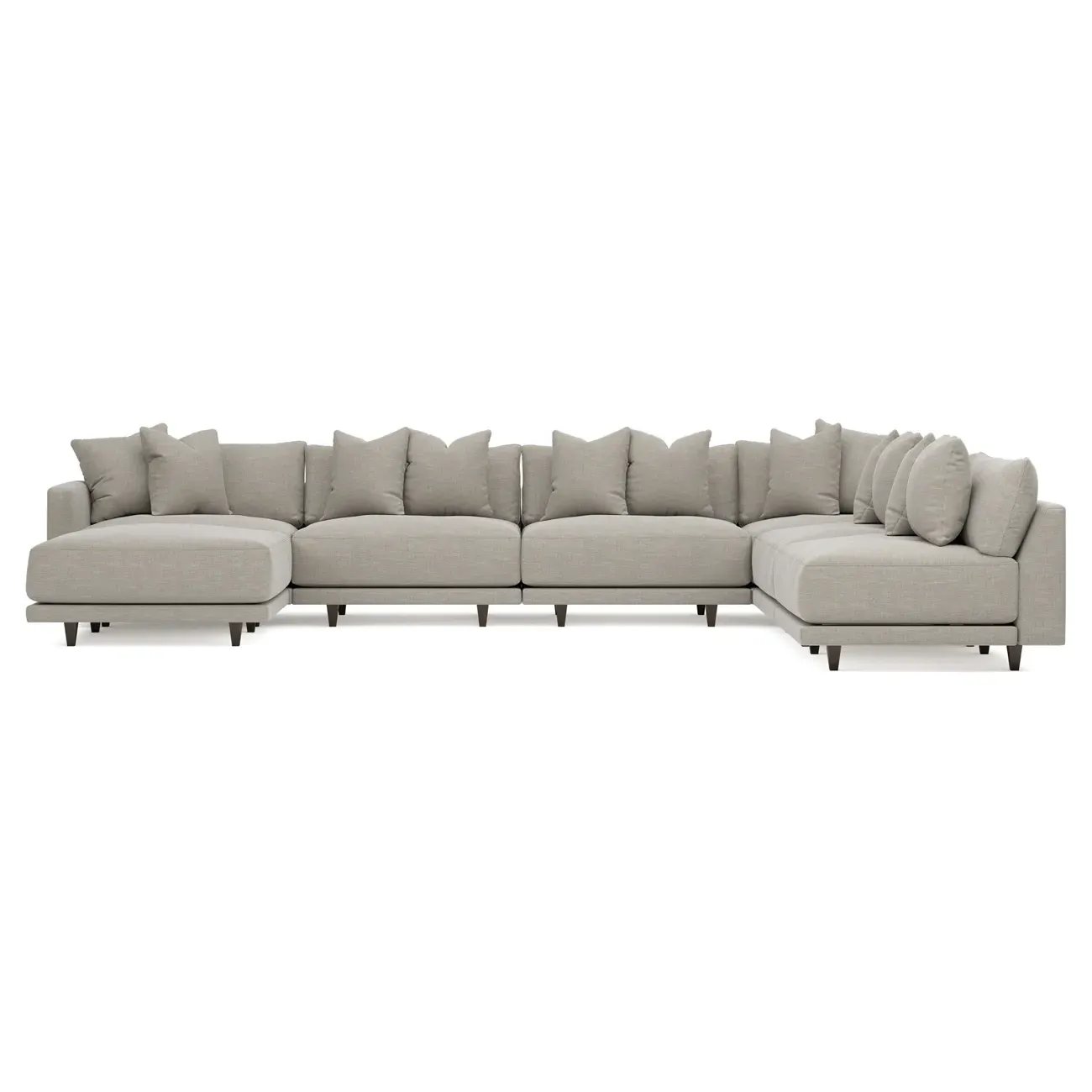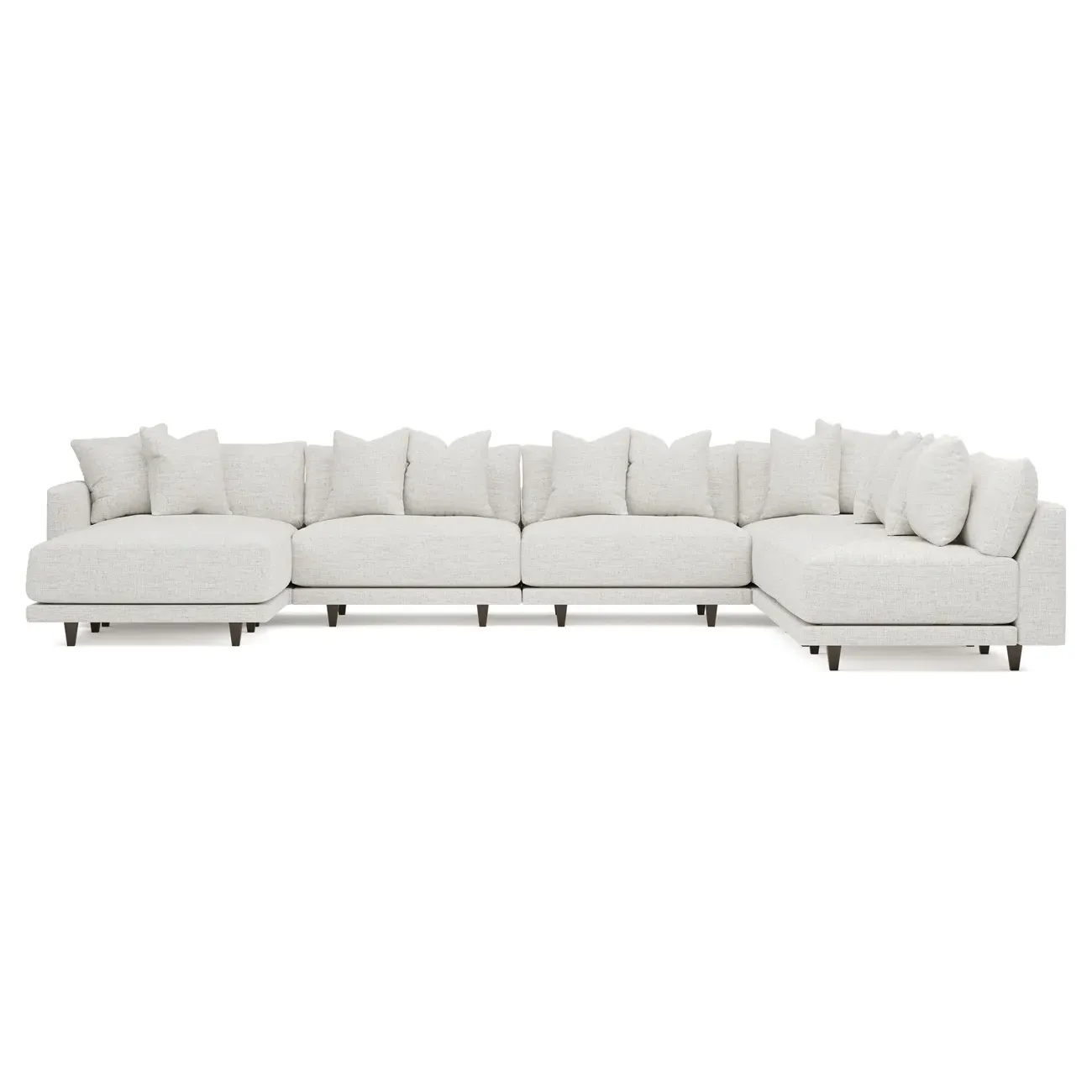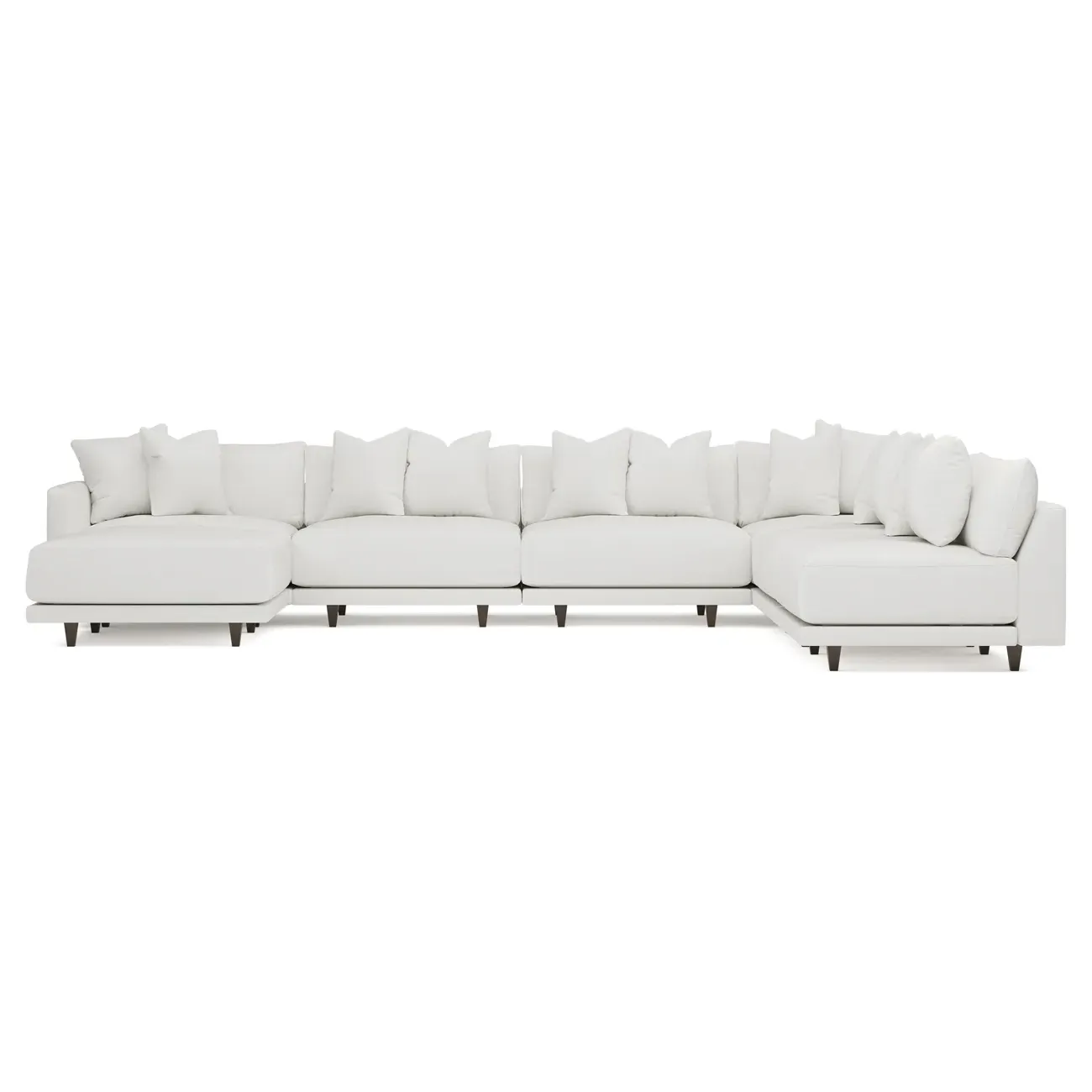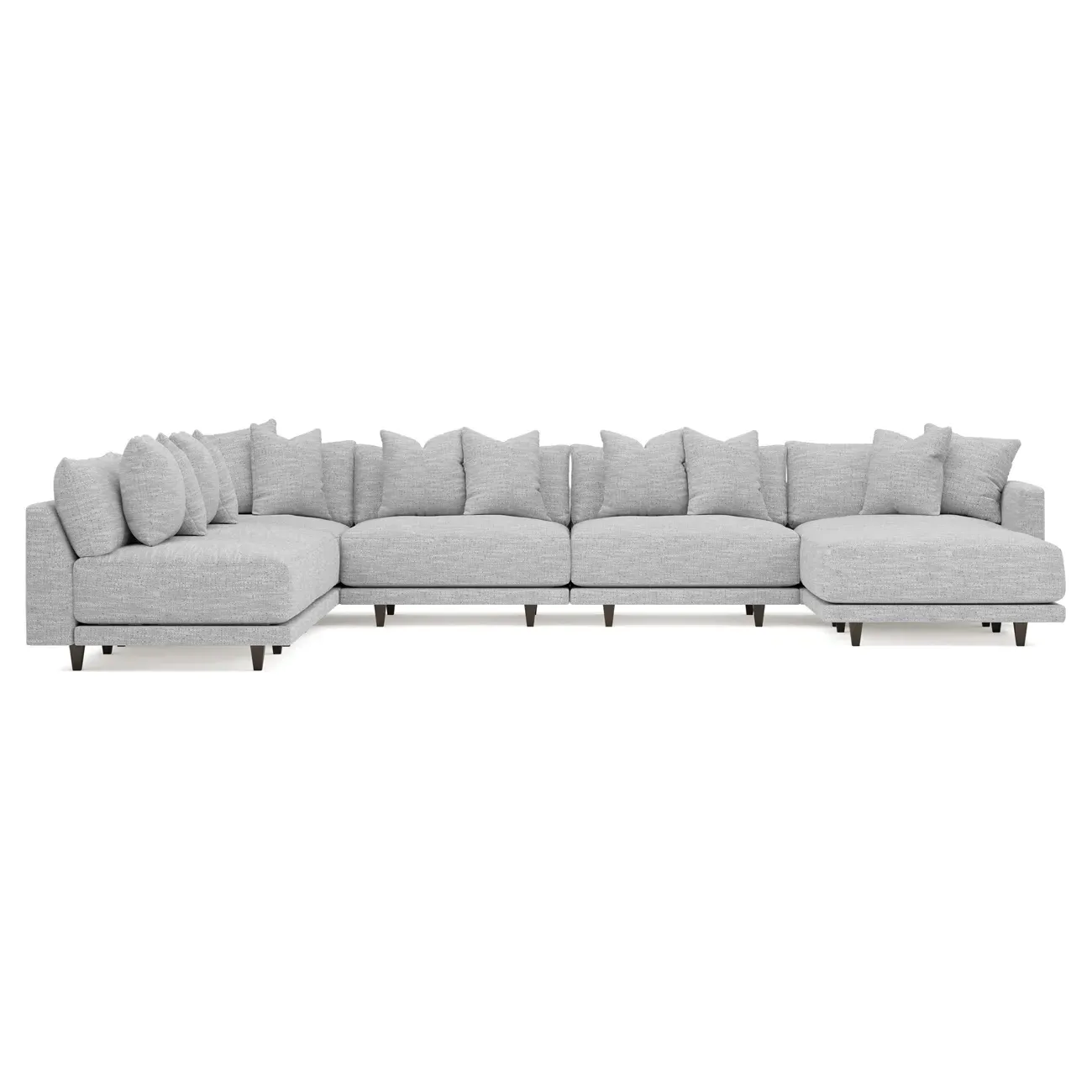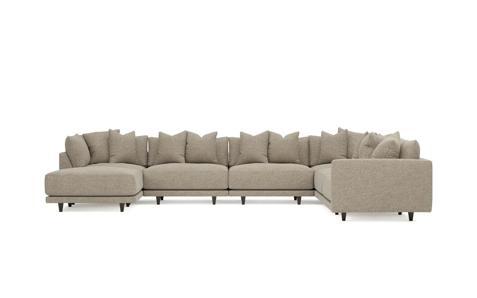 The left 171” Toulouse modular corner sectional is a family room’s perfect companion. With deep seating and oh-so-many plush pillows for sink-in comfort, the modern silhouette is delightfully relaxed. Recessed wood legs are hidden from sight, giving the sofa the appearance of floating. Lofted cushions are soft and supportive, with a foam core surrounded by a blend of fiber, down, and feather fill. Choose from a variety of upholstery options, including linen, velvet, and performance fabrics. <b>Overall Dimensions:</b> 171" W x 125" D x 35" H. <b>Ottoman Dimensions:</b> 40” W x 40” D x 20” H; <b>Corner Seat Dimensions:</b> 41” W x 41” D x 35” H; <b>Armless Seat Dimensions:</b> 42” W x 41” D x 35” H; <b>Single Seat Dimensions:</b> 46” W x 41” D x 35” H; <b>Seat Dimensions:</b> 29” D x 20” H; <b>Arm Height:</b> 27”; <b>Leg Height:</b> 5”. <b>Materials:</b> FSC®-certified, US-sourced, formaldehyde-free solid kiln-dried hardwood and furniture-grade laminates. <b>Material Finish:</b> Espresso legs. <b>Pieces Included:</b> Ottoman, Corner Seat, 4 Armless Seats, Left Single Seat.