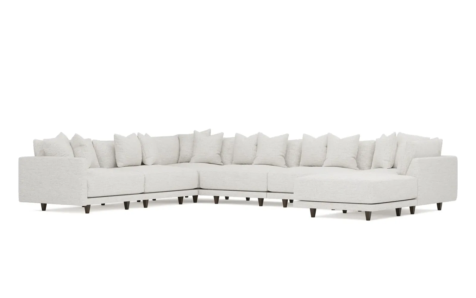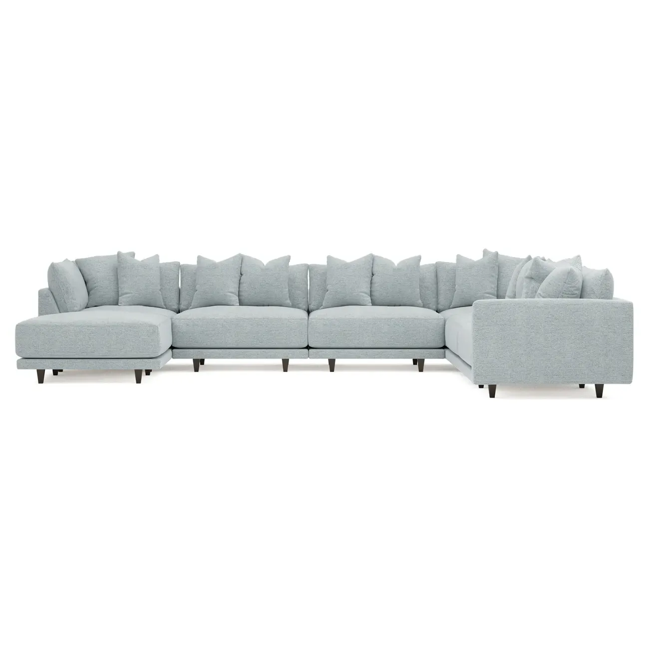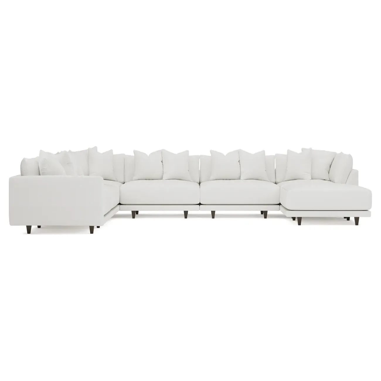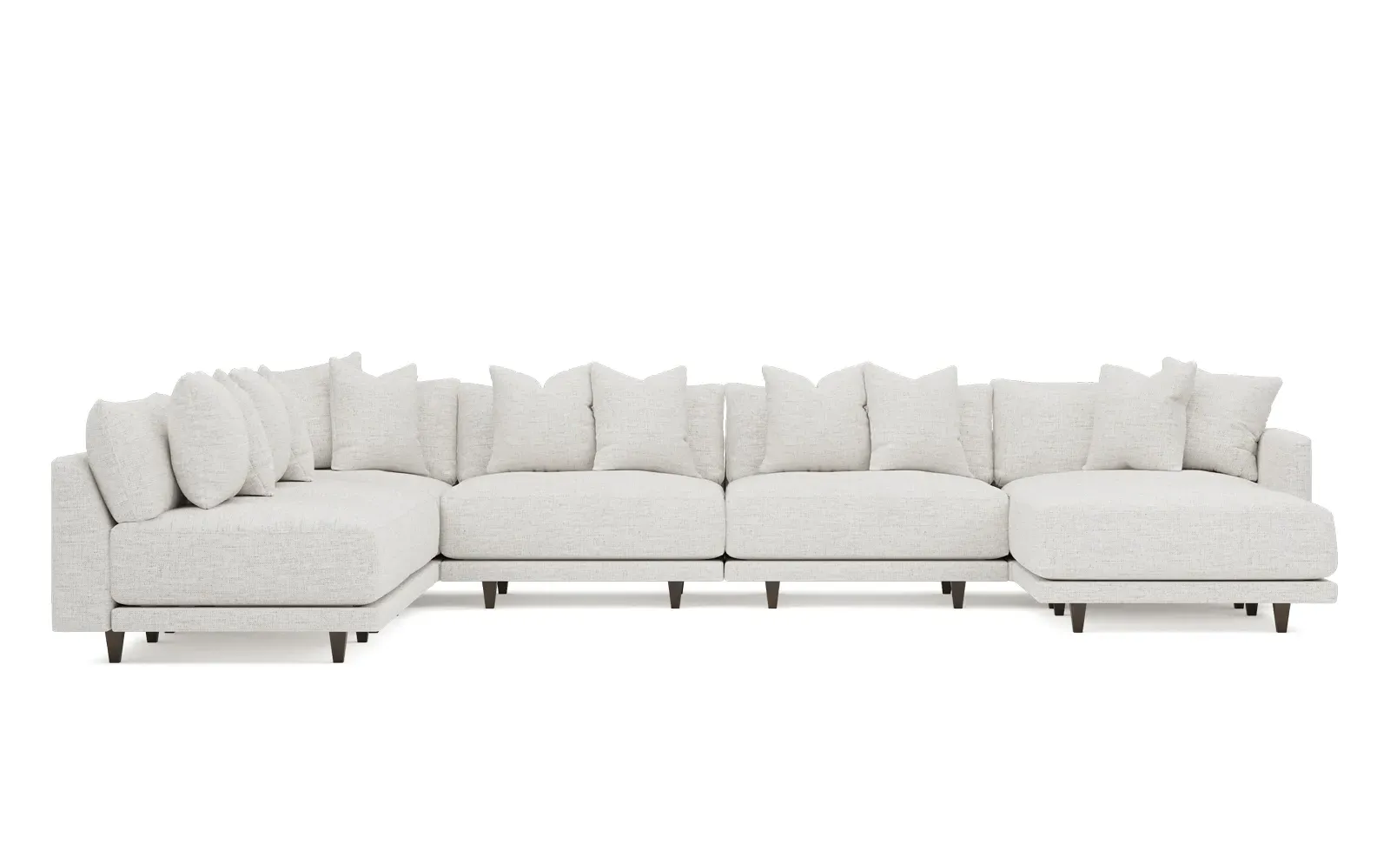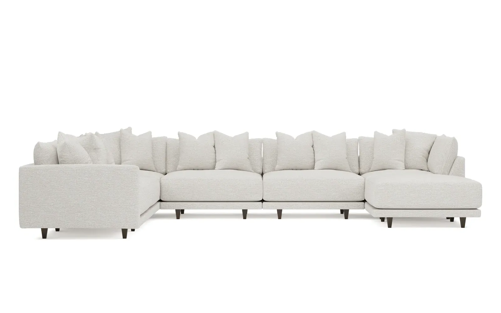The left 171” Toulouse modular corner sectional is a family room’s perfect companion. With deep seating and oh-so-many plush pillows for sink-in comfort, the modern silhouette is delightfully relaxed. Recessed wood legs are hidden from sight, giving the sofa the appearance of floating. Lofted cushions are soft and supportive, with a foam core surrounded by a blend of fiber, down, and feather fill. Choose from a variety of upholstery options, including linen, velvet, and performance fabrics. <b>Overall Dimensions:</b> 171" W x 125" D x 35" H. <b>Ottoman Dimensions:</b> 40” W x 40” D x 20” H; <b>Corner Seat Dimensions:</b> 41” W x 41” D x 35” H; <b>Armless Seat Dimensions:</b> 42” W x 41” D x 35” H; <b>Single Seat Dimensions:</b> 46” W x 41” D x 35” H; <b>Seat Dimensions:</b> 29” D x 20” H; <b>Arm Height:</b> 27”; <b>Leg Height:</b> 5”. <b>Materials:</b> FSC®-certified, US-sourced, formaldehyde-free solid kiln-dried hardwood and furniture-grade laminates. <b>Material Finish:</b> Espresso legs. <b>Pieces Included:</b> Ottoman, Corner Seat, 4 Armless Seats, Left Single Seat.