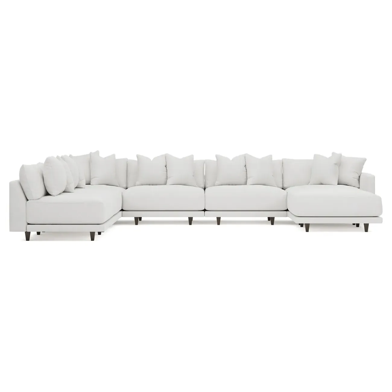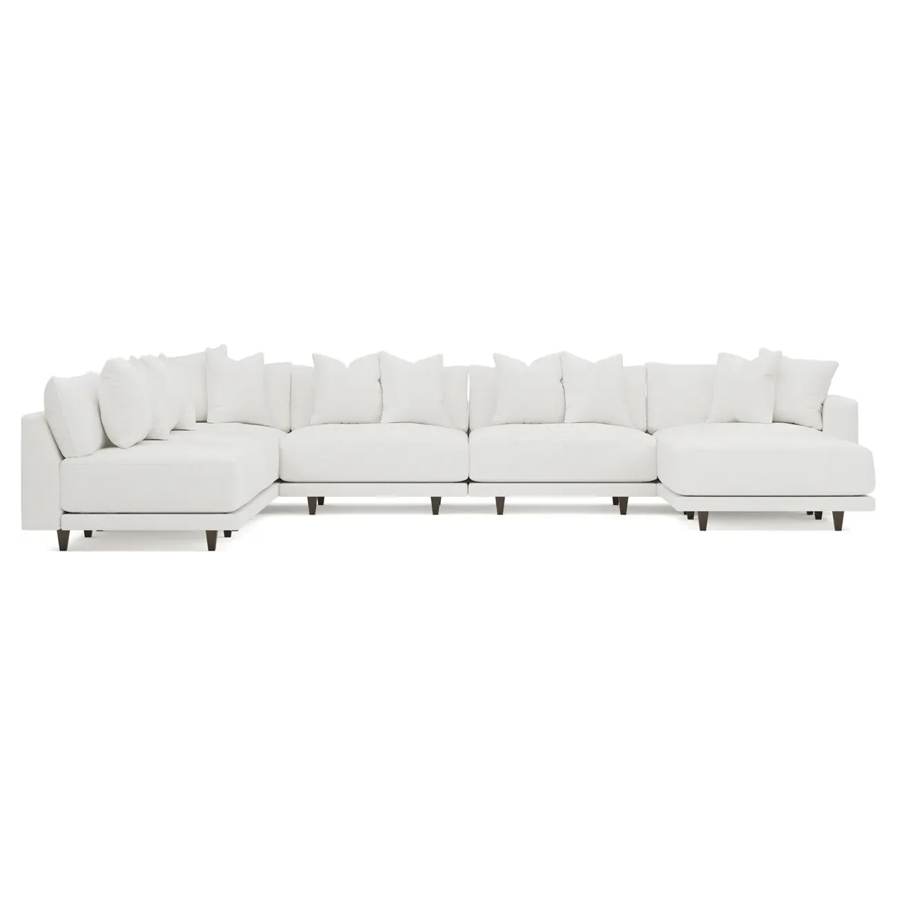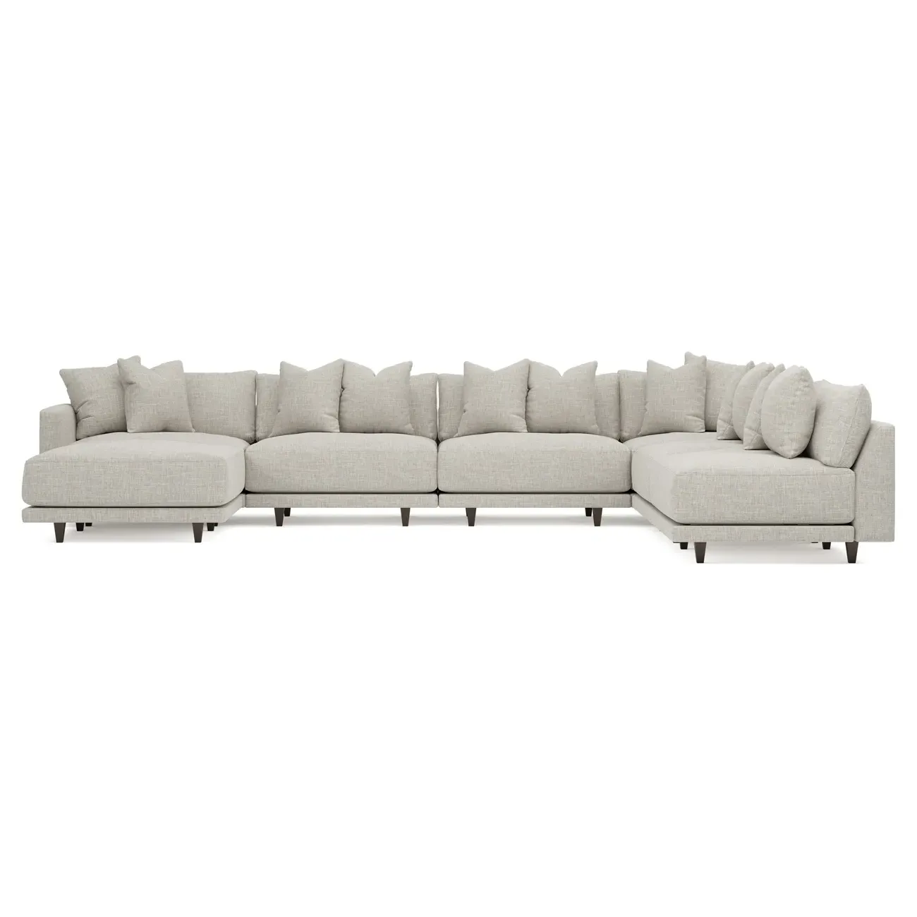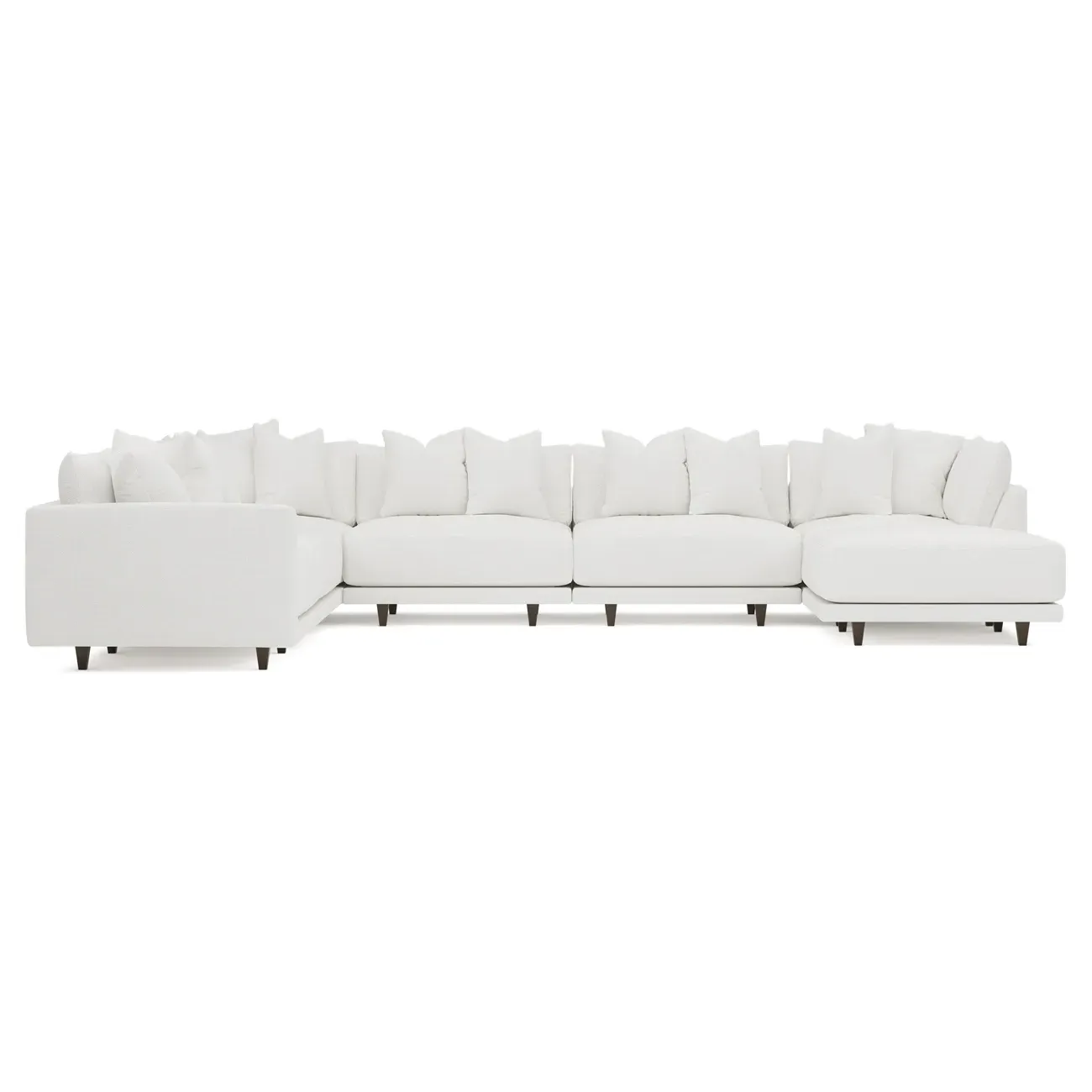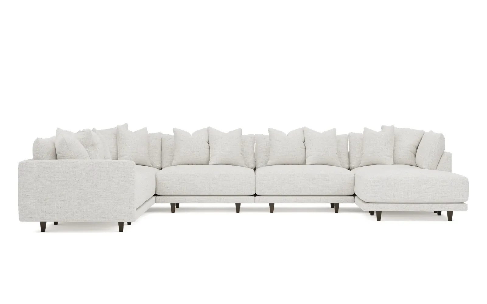 The left 171” Toulouse modular corner sectional is a family room’s perfect companion. With deep seating and oh-so-many plush pillows for sink-in comfort, the modern silhouette is delightfully relaxed. Recessed wood legs are hidden from sight, giving the sofa the appearance of floating. Lofted cushions are soft and supportive, with a foam core surrounded by a blend of fiber, down, and feather fill. Choose from a variety of upholstery options, including linen, velvet, and performance fabrics. <b>Overall Dimensions:</b> 171" W x 125" D x 35" H. <b>Ottoman Dimensions:</b> 40” W x 40” D x 20” H; <b>Corner Seat Dimensions:</b> 41” W x 41” D x 35” H; <b>Armless Seat Dimensions:</b> 42” W x 41” D x 35” H; <b>Single Seat Dimensions:</b> 46” W x 41” D x 35” H; <b>Seat Dimensions:</b> 29” D x 20” H; <b>Arm Height:</b> 27”; <b>Leg Height:</b> 5”. <b>Materials:</b> FSC®-certified, US-sourced, formaldehyde-free solid kiln-dried hardwood and furniture-grade laminates. <b>Material Finish:</b> Espresso legs. <b>Pieces Included:</b> Ottoman, Corner Seat, 4 Armless Seats, Left Single Seat.