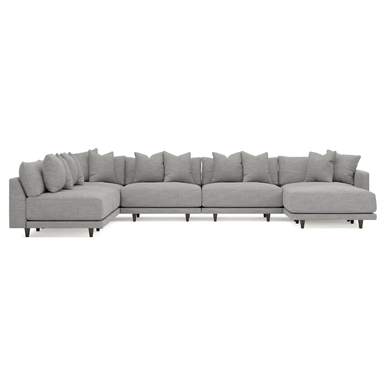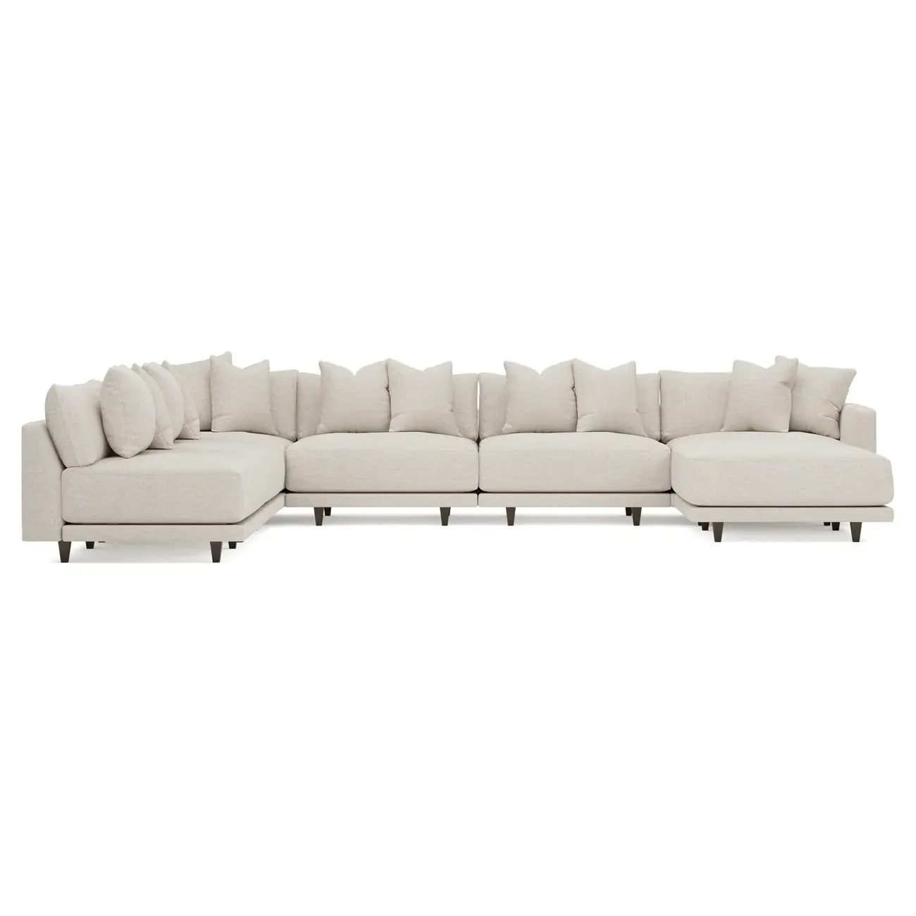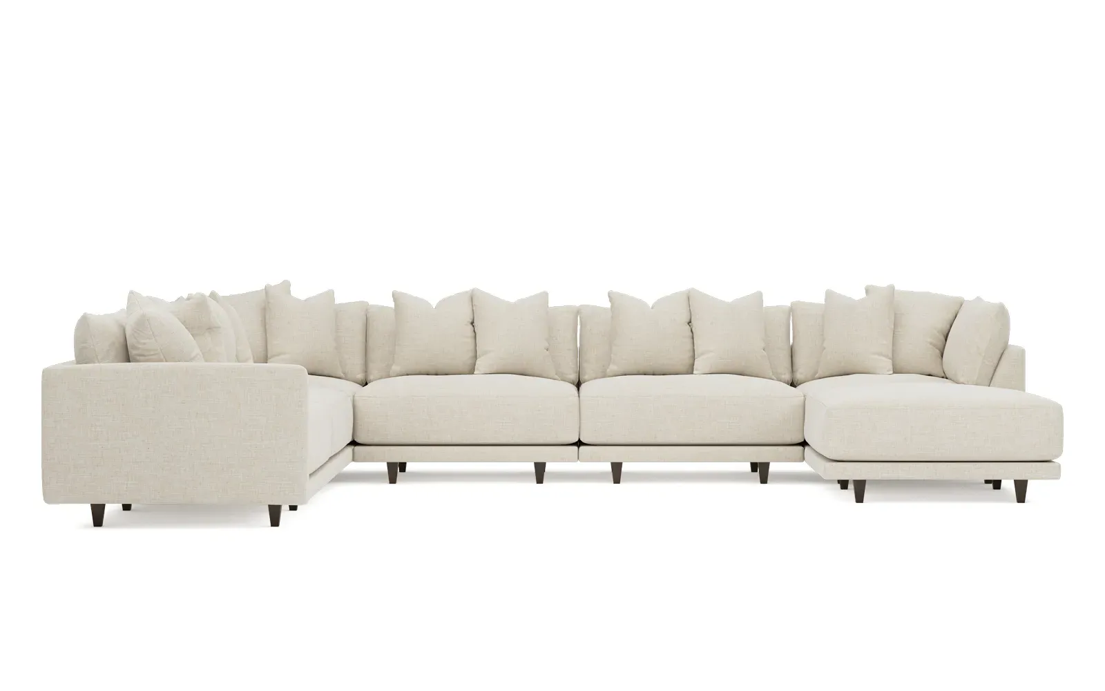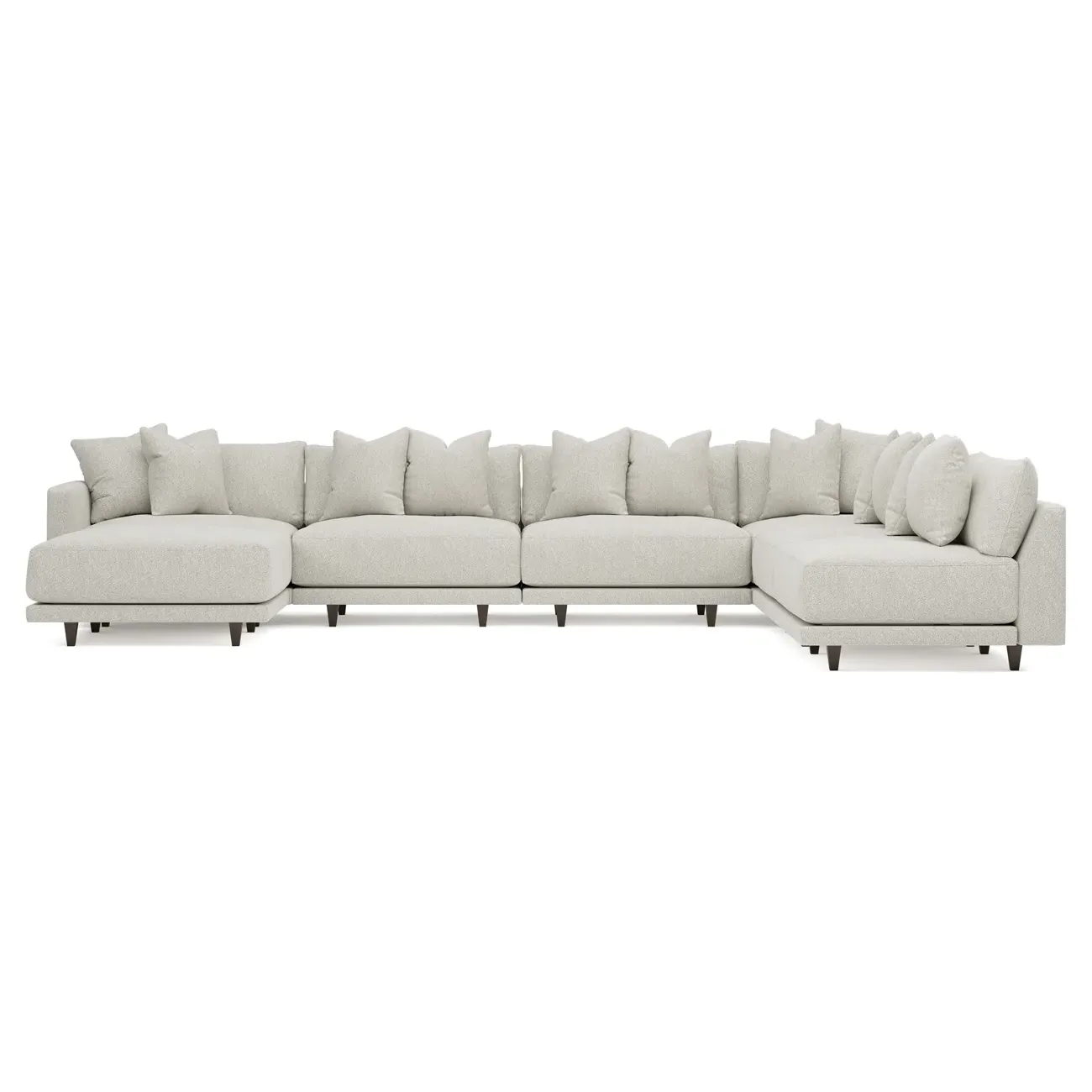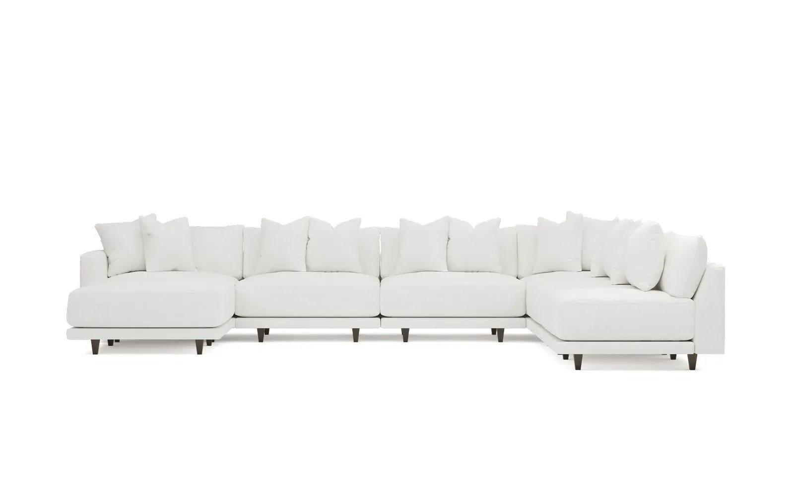 The left 171” Toulouse modular corner sectional is a family room’s perfect companion. With deep seating and oh-so-many plush pillows for sink-in comfort, the modern silhouette is delightfully relaxed. Recessed wood legs are hidden from sight, giving the sofa the appearance of floating. Lofted cushions are soft and supportive, with a foam core surrounded by a blend of fiber, down, and feather fill. Choose from a variety of upholstery options, including linen, velvet, and performance fabrics. <b>Overall Dimensions:</b> 171" W x 125" D x 35" H. <b>Ottoman Dimensions:</b> 40” W x 40” D x 20” H; <b>Corner Seat Dimensions:</b> 41” W x 41” D x 35” H; <b>Armless Seat Dimensions:</b> 42” W x 41” D x 35” H; <b>Single Seat Dimensions:</b> 46” W x 41” D x 35” H; <b>Seat Dimensions:</b> 29” D x 20” H; <b>Arm Height:</b> 27”; <b>Leg Height:</b> 5”. <b>Materials:</b> FSC®-certified, US-sourced, formaldehyde-free solid kiln-dried hardwood and furniture-grade laminates. <b>Material Finish:</b> Espresso legs. <b>Pieces Included:</b> Ottoman, Corner Seat, 4 Armless Seats, Left Single Seat.