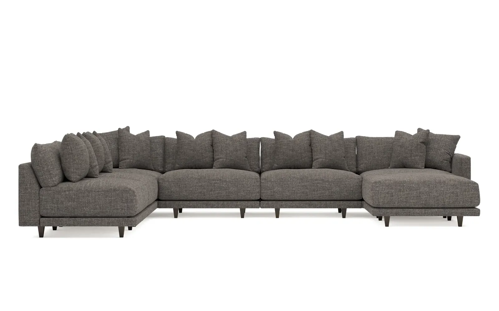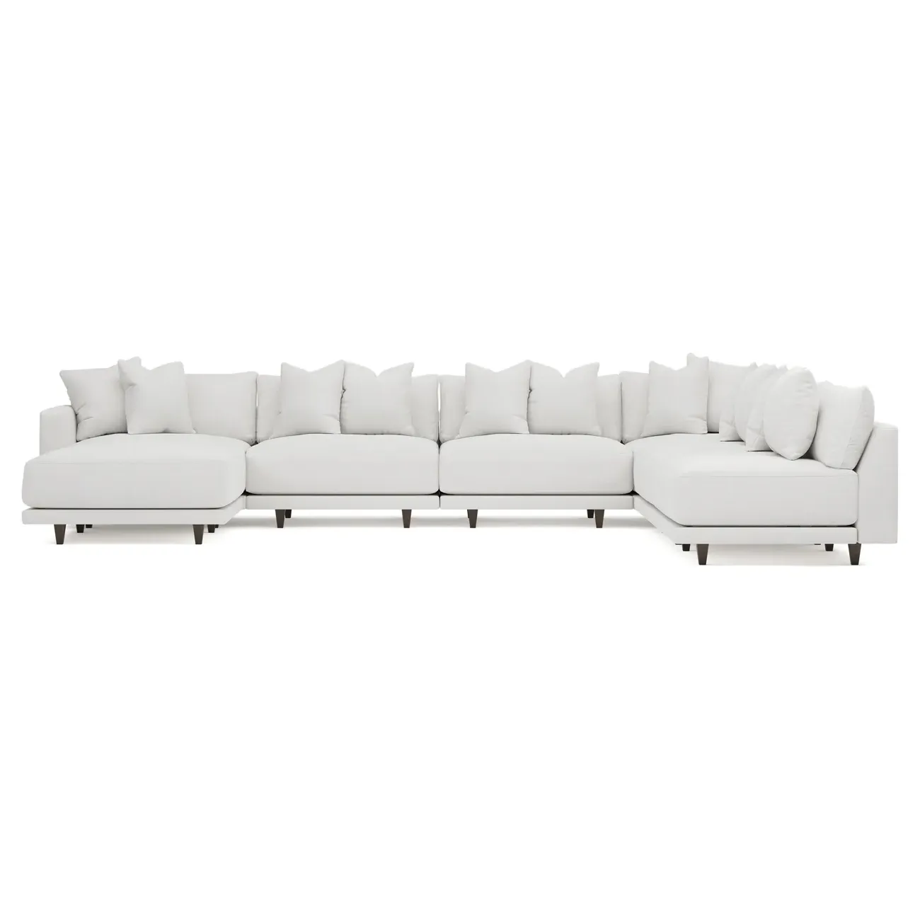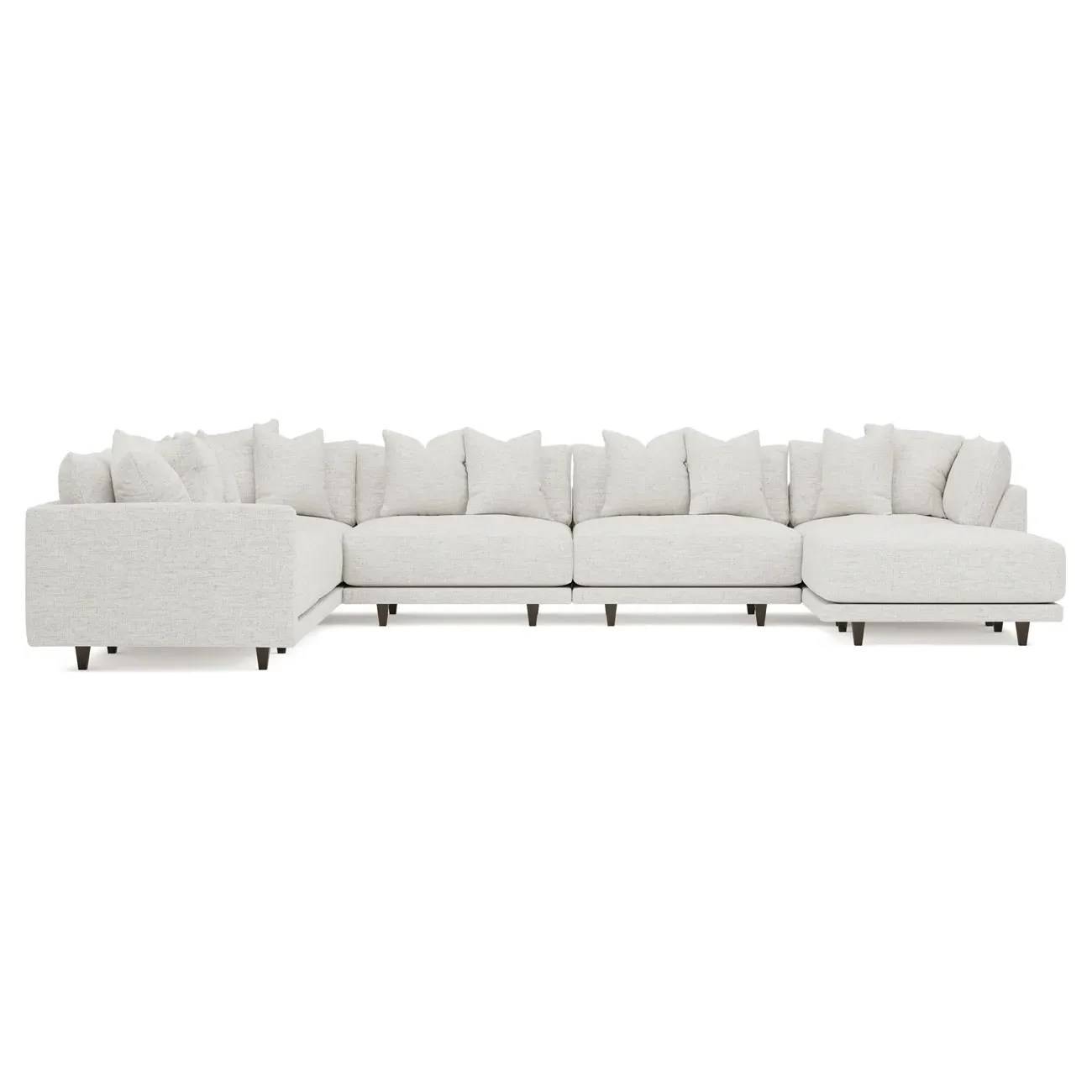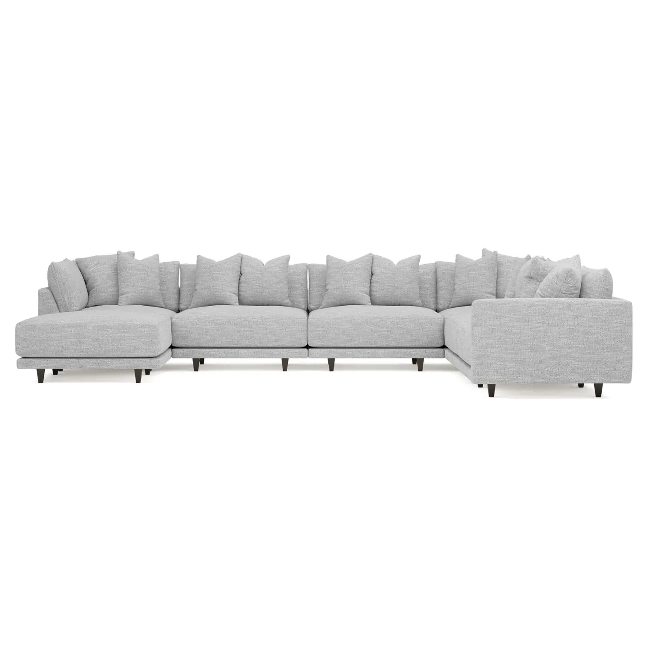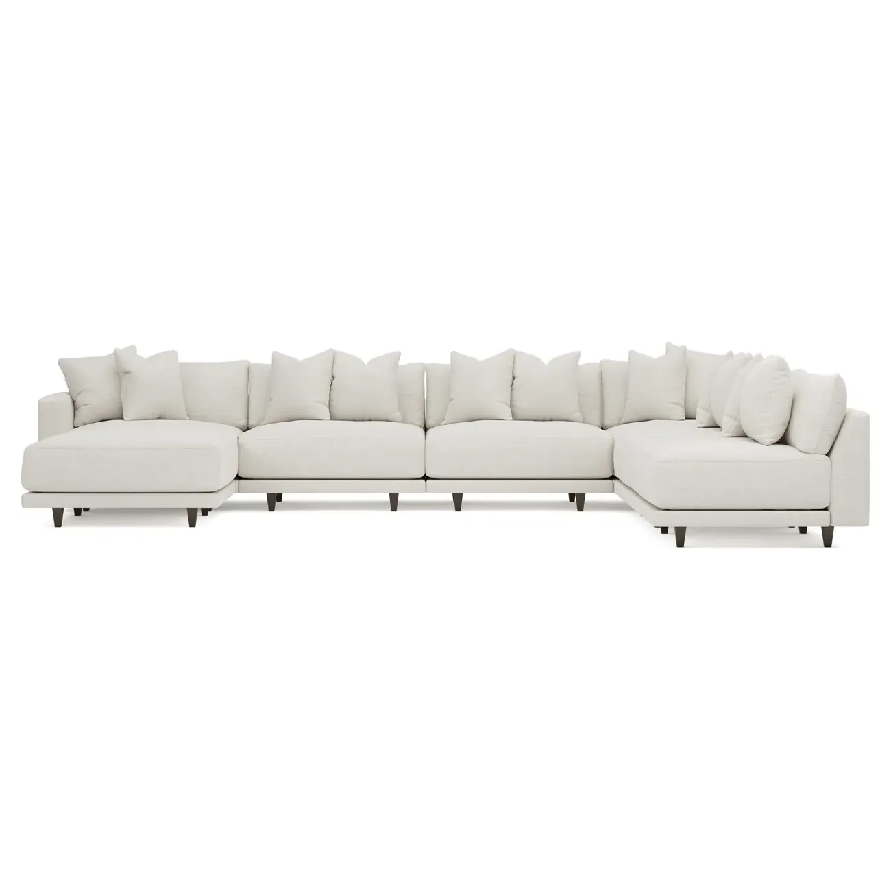 The left 171” Toulouse modular corner sectional is a family room’s perfect companion. With deep seating and oh-so-many plush pillows for sink-in comfort, the modern silhouette is delightfully relaxed. Recessed wood legs are hidden from sight, giving the sofa the appearance of floating. Lofted cushions are soft and supportive, with a foam core surrounded by a blend of fiber, down, and feather fill. Choose from a variety of upholstery options, including linen, velvet, and performance fabrics. <b>Overall Dimensions:</b> 171" W x 125" D x 35" H. <b>Ottoman Dimensions:</b> 40” W x 40” D x 20” H; <b>Corner Seat Dimensions:</b> 41” W x 41” D x 35” H; <b>Armless Seat Dimensions:</b> 42” W x 41” D x 35” H; <b>Single Seat Dimensions:</b> 46” W x 41” D x 35” H; <b>Seat Dimensions:</b> 29” D x 20” H; <b>Arm Height:</b> 27”; <b>Leg Height:</b> 5”. <b>Materials:</b> FSC®-certified, US-sourced, formaldehyde-free solid kiln-dried hardwood and furniture-grade laminates. <b>Material Finish:</b> Espresso legs. <b>Pieces Included:</b> Ottoman, Corner Seat, 4 Armless Seats, Left Single Seat.