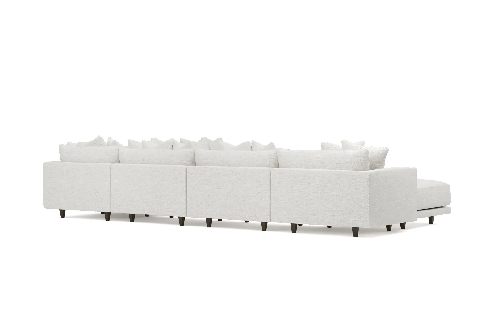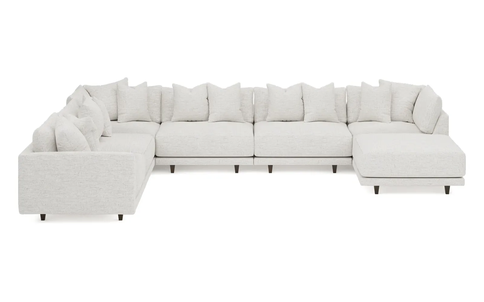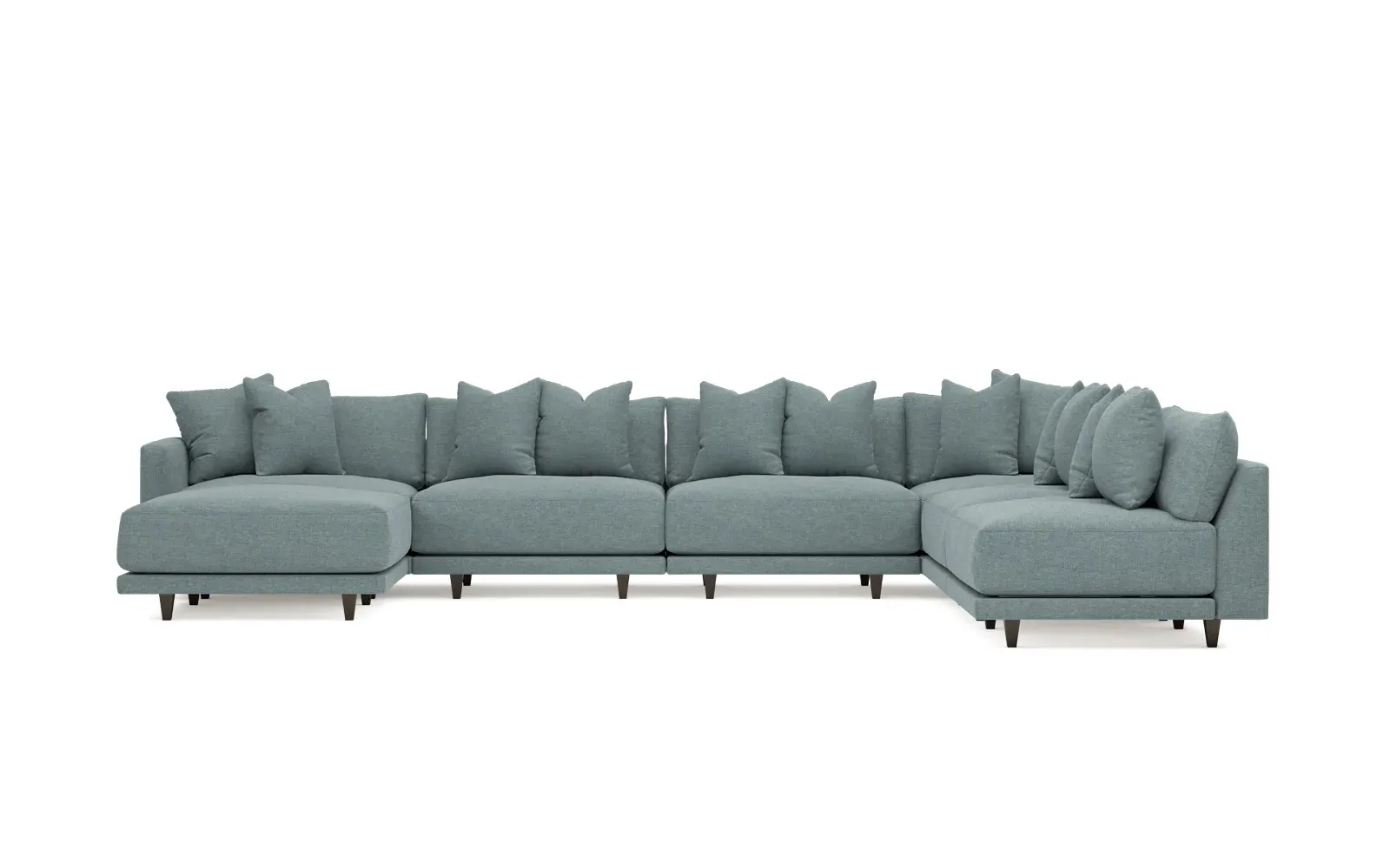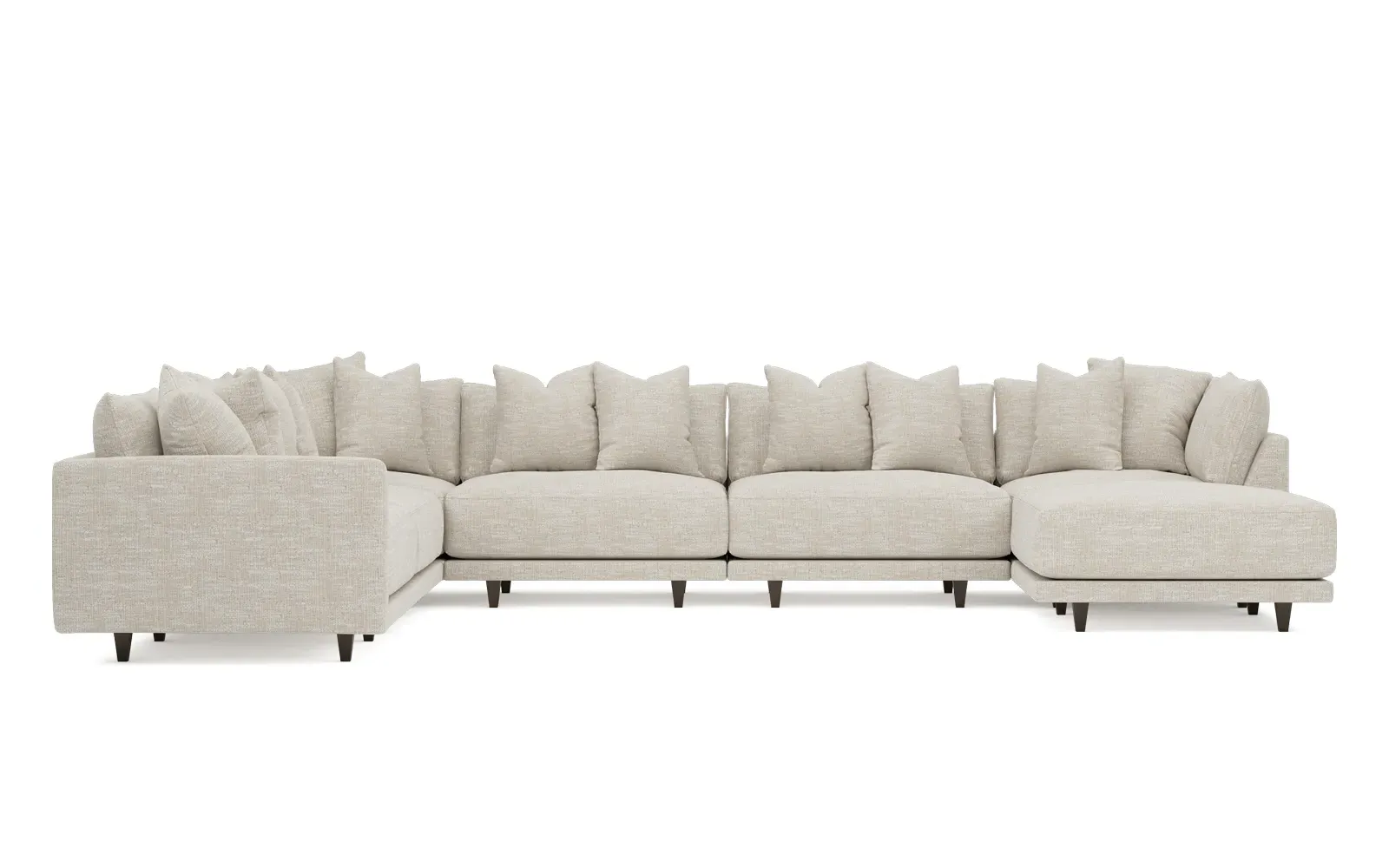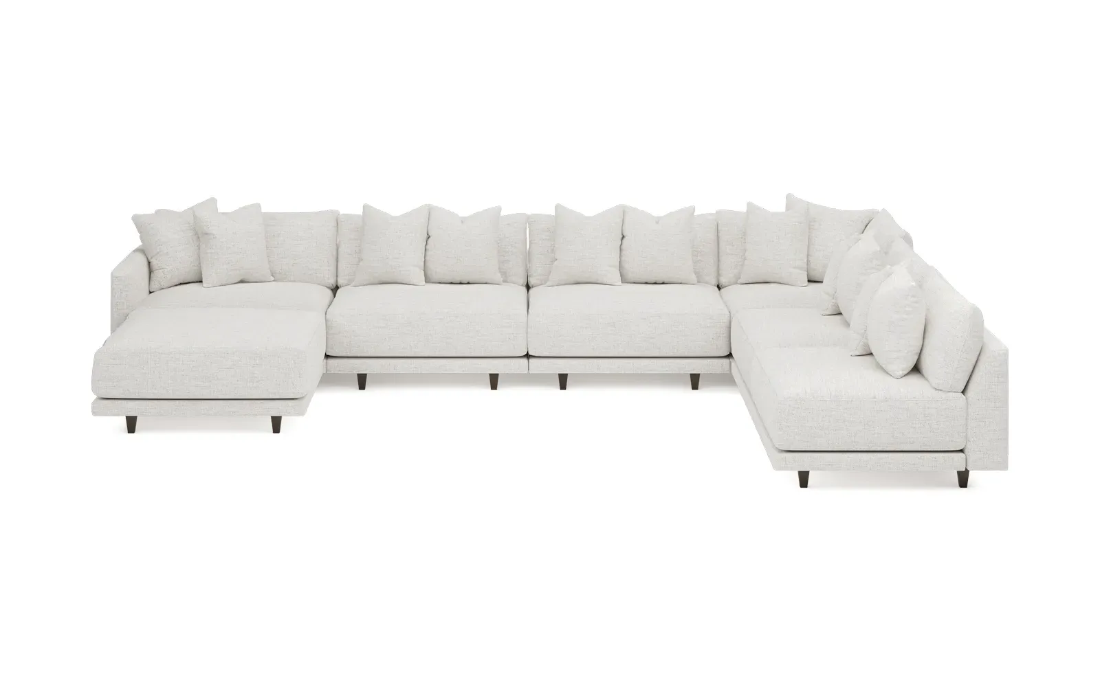 The left 171” Toulouse modular corner sectional is a family room’s perfect companion. With deep seating and oh-so-many plush pillows for sink-in comfort, the modern silhouette is delightfully relaxed. Recessed wood legs are hidden from sight, giving the sofa the appearance of floating. Lofted cushions are soft and supportive, with a foam core surrounded by a blend of fiber, down, and feather fill. Choose from a variety of upholstery options, including linen, velvet, and performance fabrics. <b>Overall Dimensions:</b> 171" W x 125" D x 35" H. <b>Ottoman Dimensions:</b> 40” W x 40” D x 20” H; <b>Corner Seat Dimensions:</b> 41” W x 41” D x 35” H; <b>Armless Seat Dimensions:</b> 42” W x 41” D x 35” H; <b>Single Seat Dimensions:</b> 46” W x 41” D x 35” H; <b>Seat Dimensions:</b> 29” D x 20” H; <b>Arm Height:</b> 27”; <b>Leg Height:</b> 5”. <b>Materials:</b> FSC®-certified, US-sourced, formaldehyde-free solid kiln-dried hardwood and furniture-grade laminates. <b>Material Finish:</b> Espresso legs. <b>Pieces Included:</b> Ottoman, Corner Seat, 4 Armless Seats, Left Single Seat.