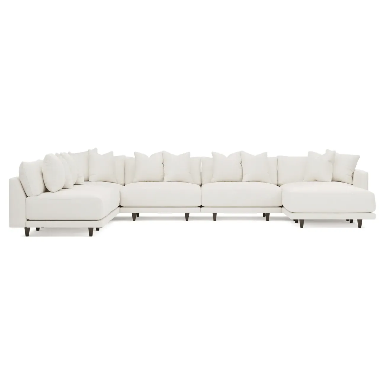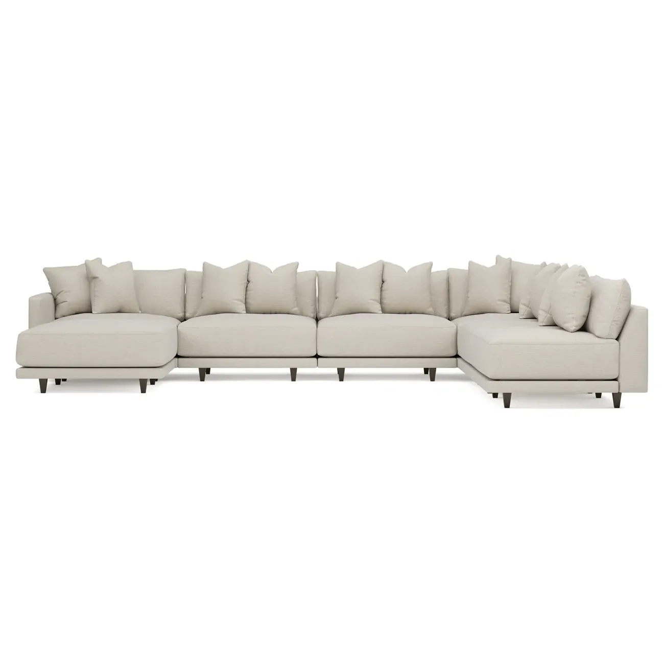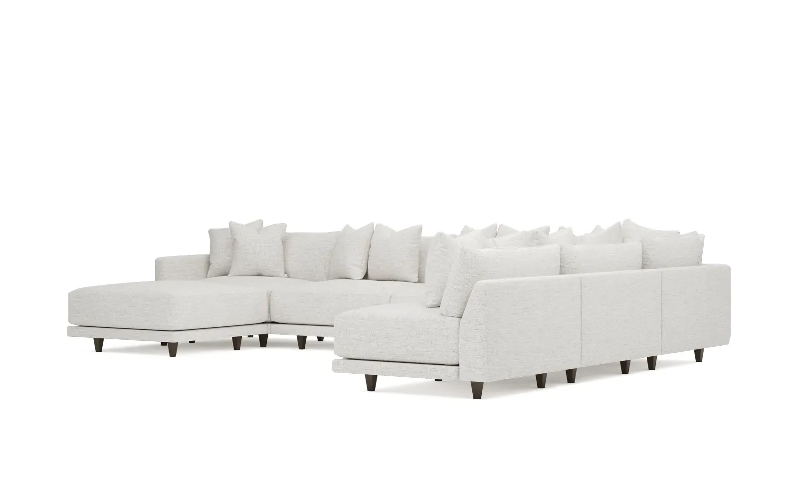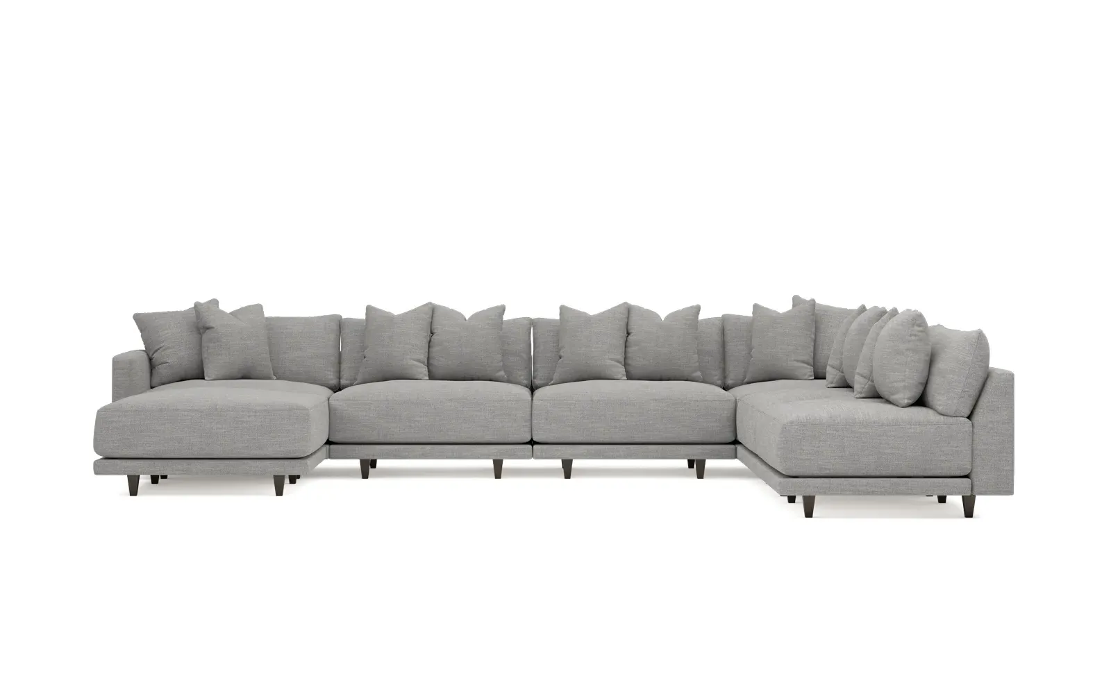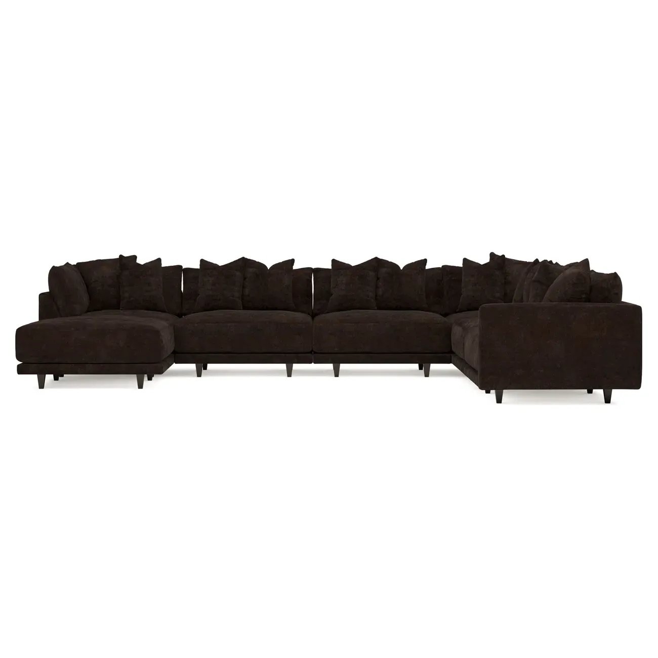 The left 171” Toulouse modular corner sectional is a family room’s perfect companion. With deep seating and oh-so-many plush pillows for sink-in comfort, the modern silhouette is delightfully relaxed. Recessed wood legs are hidden from sight, giving the sofa the appearance of floating. Lofted cushions are soft and supportive, with a foam core surrounded by a blend of fiber, down, and feather fill. Choose from a variety of upholstery options, including linen, velvet, and performance fabrics. <b>Overall Dimensions:</b> 171" W x 125" D x 35" H. <b>Ottoman Dimensions:</b> 40” W x 40” D x 20” H; <b>Corner Seat Dimensions:</b> 41” W x 41” D x 35” H; <b>Armless Seat Dimensions:</b> 42” W x 41” D x 35” H; <b>Single Seat Dimensions:</b> 46” W x 41” D x 35” H; <b>Seat Dimensions:</b> 29” D x 20” H; <b>Arm Height:</b> 27”; <b>Leg Height:</b> 5”. <b>Materials:</b> FSC®-certified, US-sourced, formaldehyde-free solid kiln-dried hardwood and furniture-grade laminates. <b>Material Finish:</b> Espresso legs. <b>Pieces Included:</b> Ottoman, Corner Seat, 4 Armless Seats, Left Single Seat.