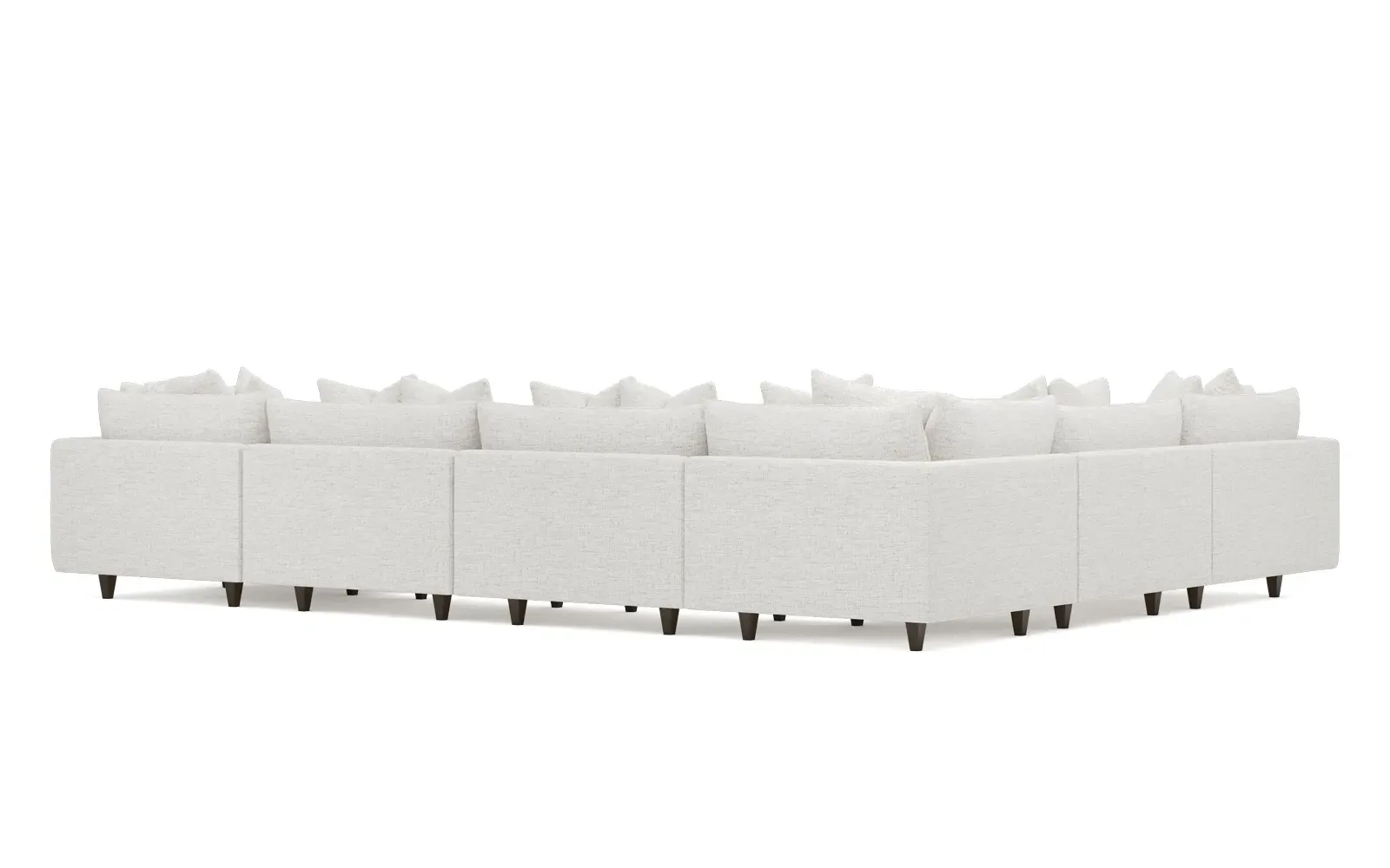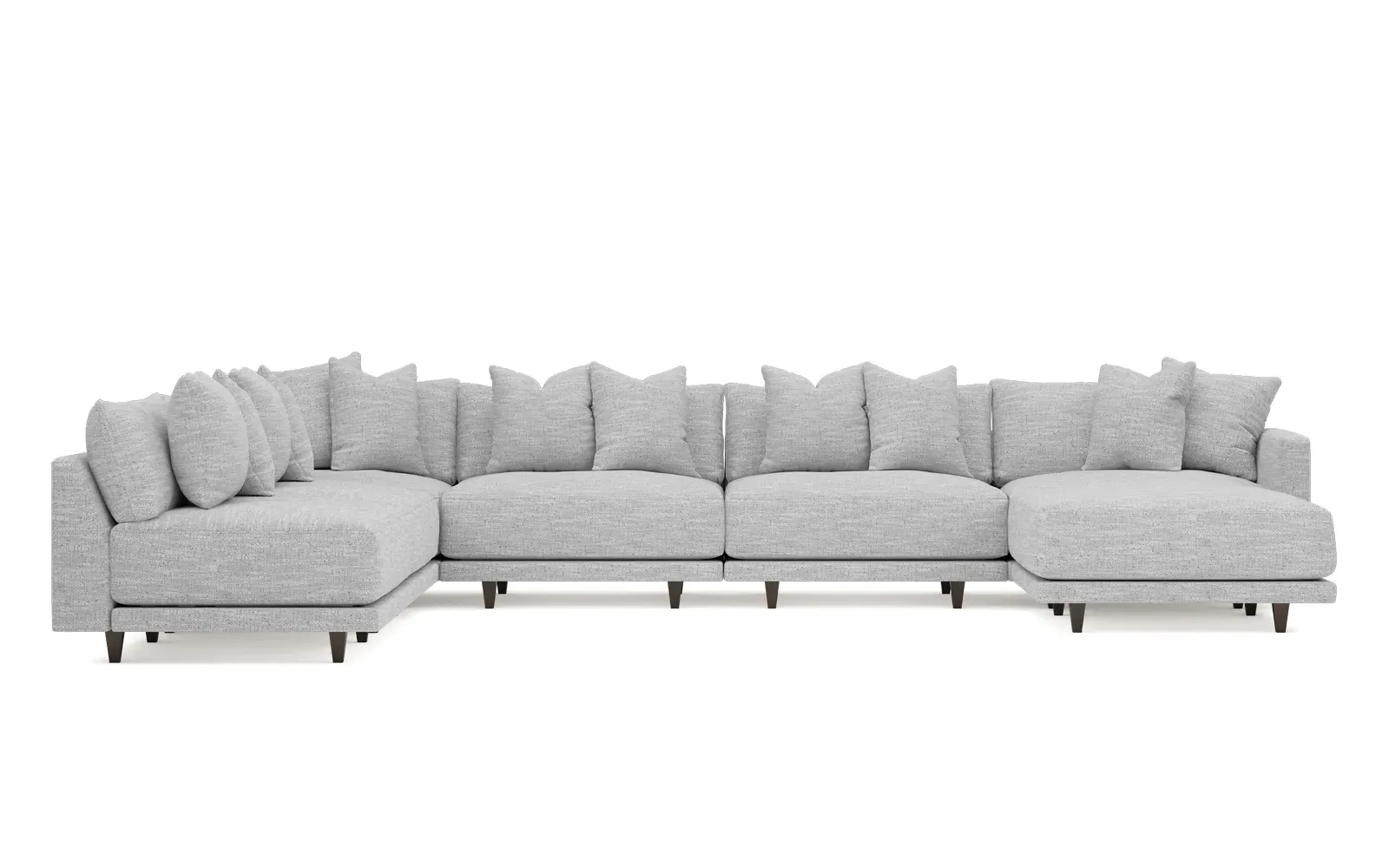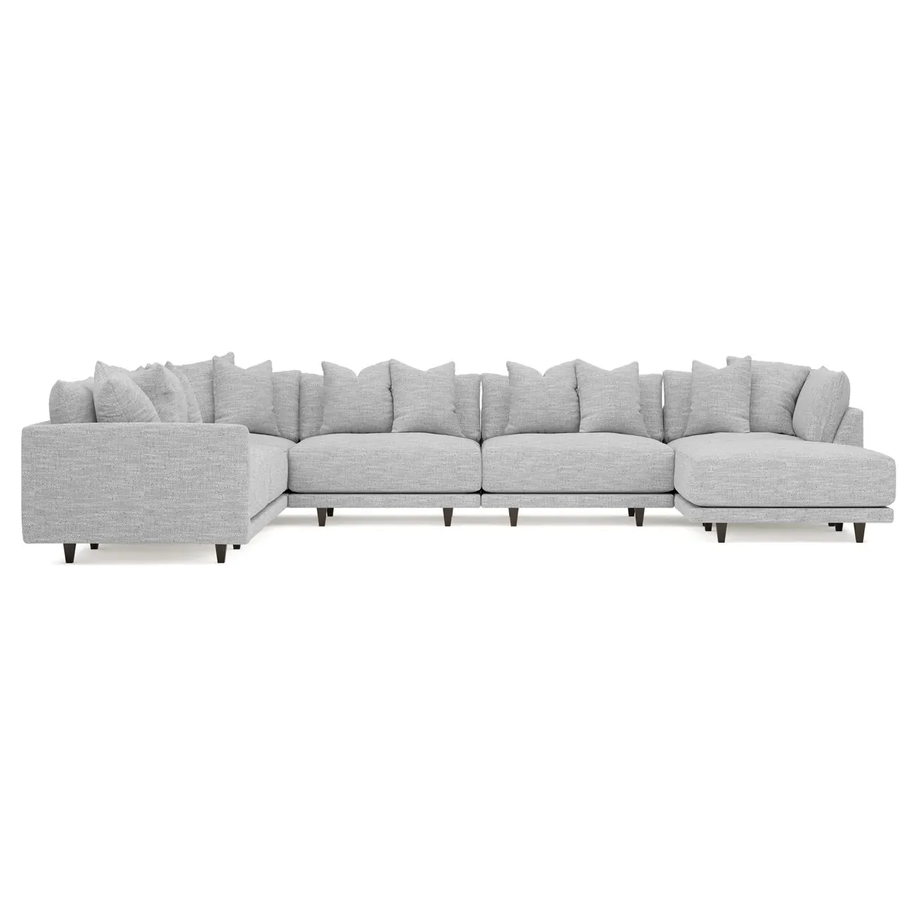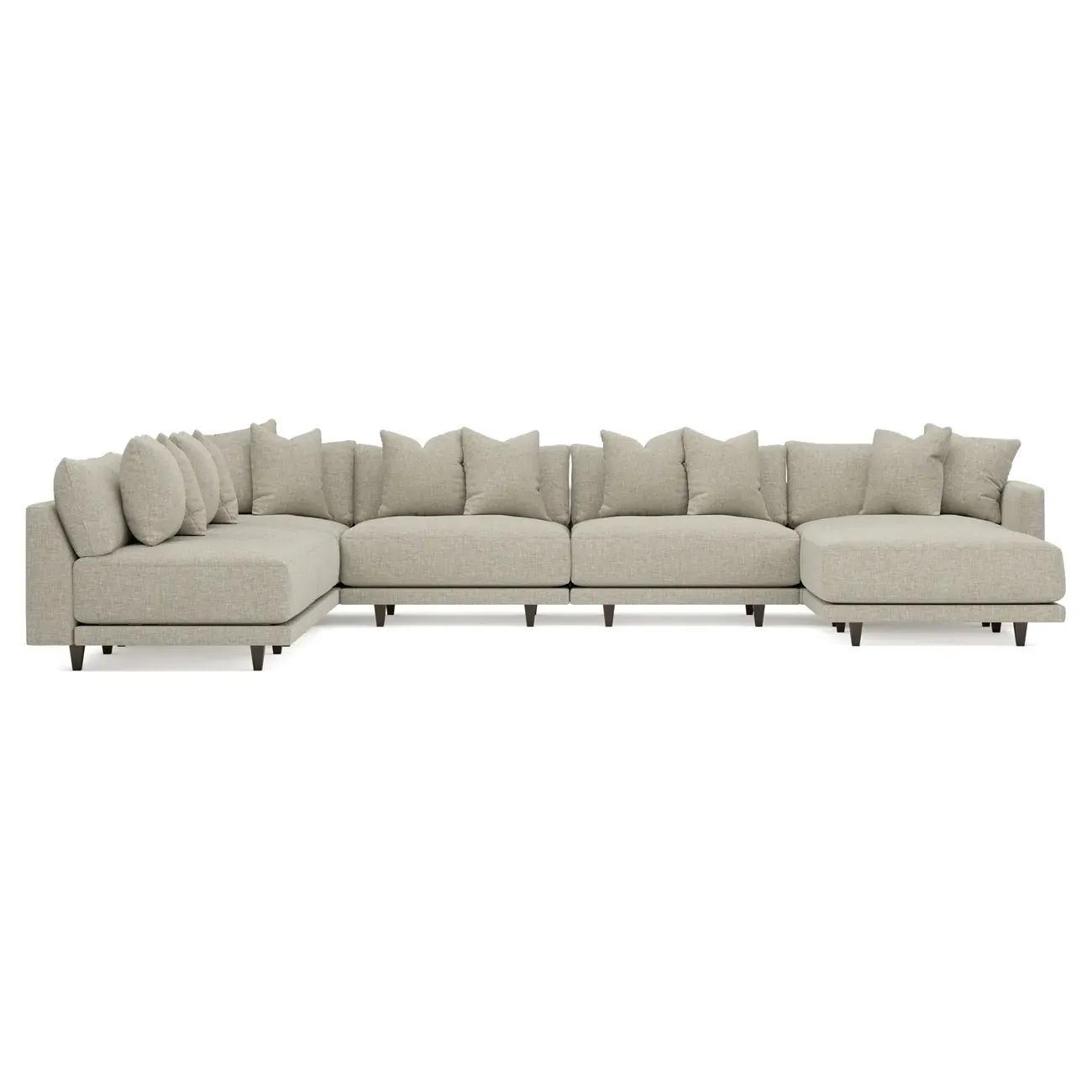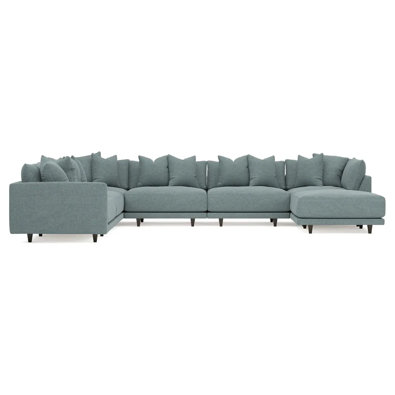 The left 171” Toulouse modular corner sectional is a family room’s perfect companion. With deep seating and oh-so-many plush pillows for sink-in comfort, the modern silhouette is delightfully relaxed. Recessed wood legs are hidden from sight, giving the sofa the appearance of floating. Lofted cushions are soft and supportive, with a foam core surrounded by a blend of fiber, down, and feather fill. Choose from a variety of upholstery options, including linen, velvet, and performance fabrics. <b>Overall Dimensions:</b> 171" W x 125" D x 35" H. <b>Ottoman Dimensions:</b> 40” W x 40” D x 20” H; <b>Corner Seat Dimensions:</b> 41” W x 41” D x 35” H; <b>Armless Seat Dimensions:</b> 42” W x 41” D x 35” H; <b>Single Seat Dimensions:</b> 46” W x 41” D x 35” H; <b>Seat Dimensions:</b> 29” D x 20” H; <b>Arm Height:</b> 27”; <b>Leg Height:</b> 5”. <b>Materials:</b> FSC®-certified, US-sourced, formaldehyde-free solid kiln-dried hardwood and furniture-grade laminates. <b>Material Finish:</b> Espresso legs. <b>Pieces Included:</b> Ottoman, Corner Seat, 4 Armless Seats, Left Single Seat.