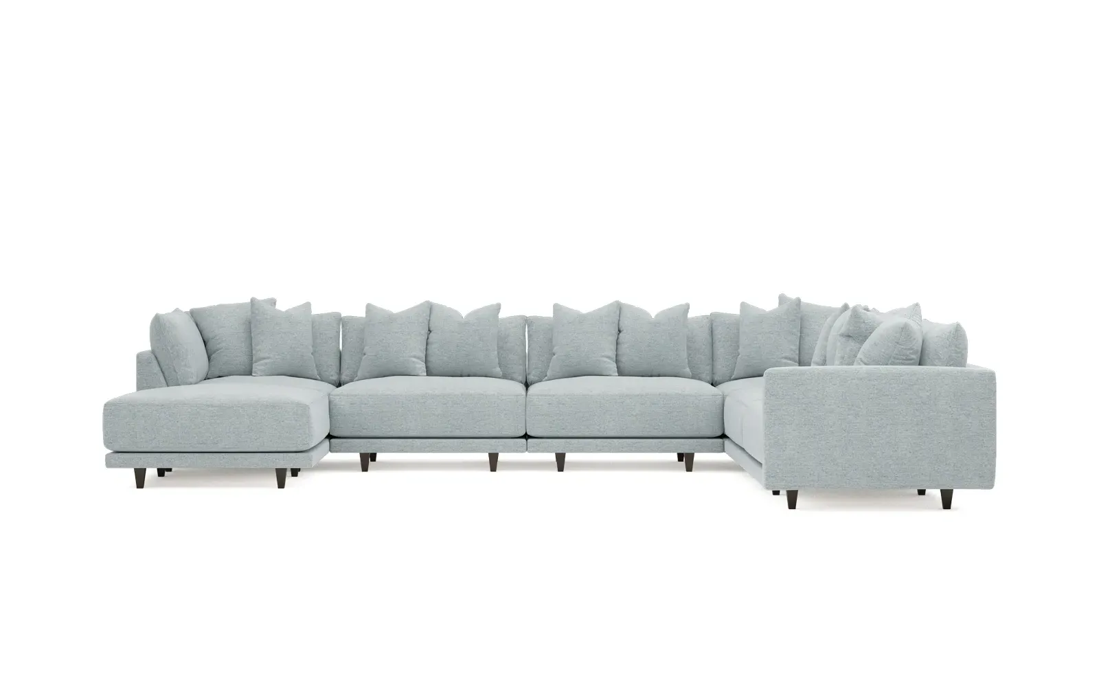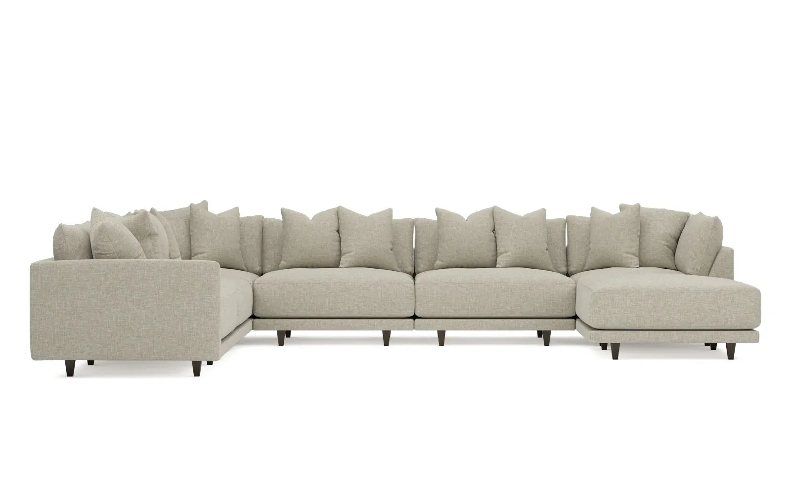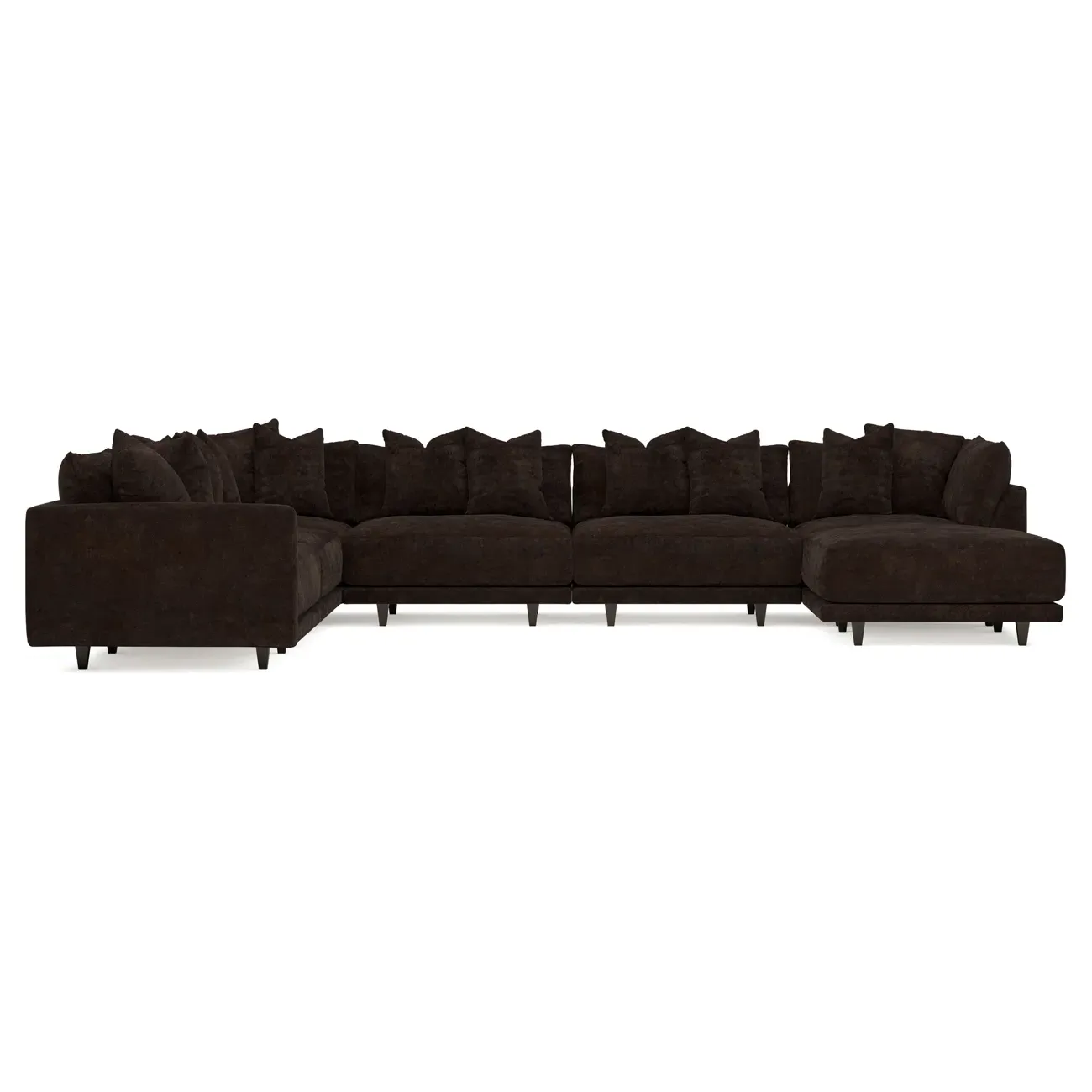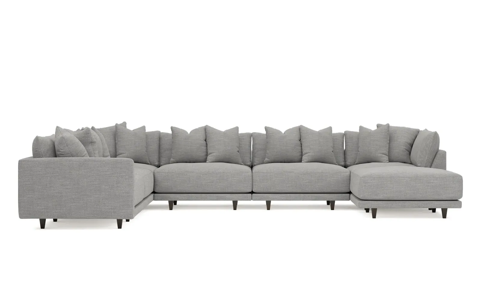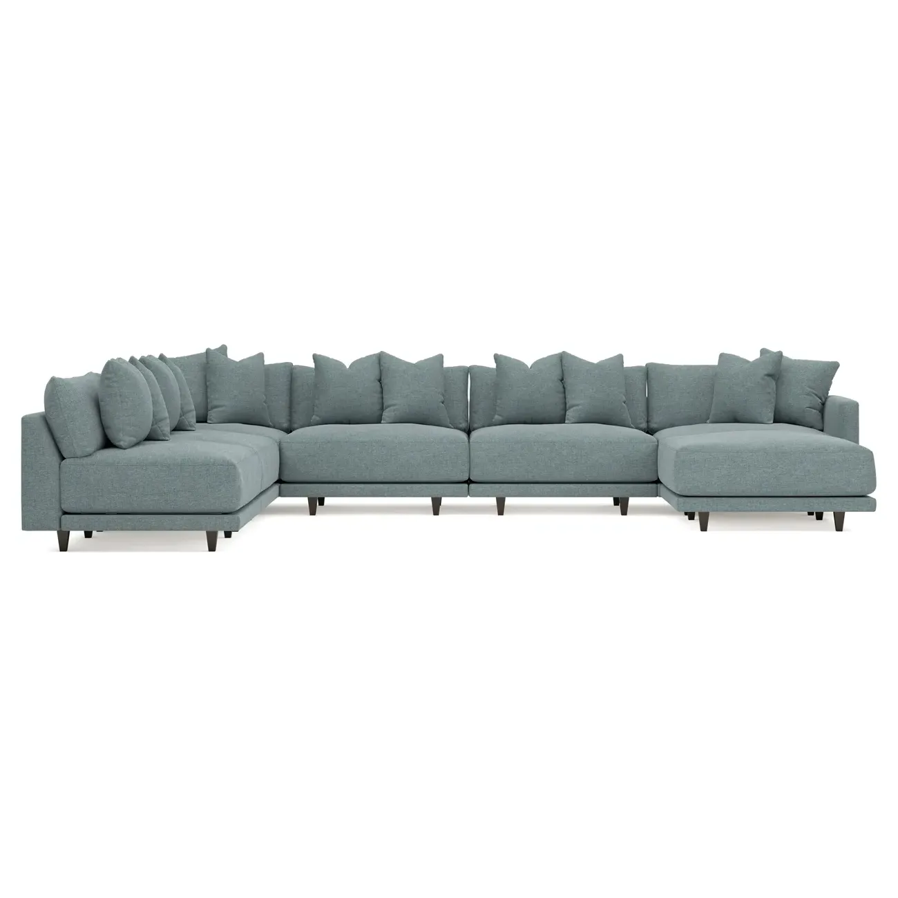 The left 171” Toulouse modular corner sectional is a family room’s perfect companion. With deep seating and oh-so-many plush pillows for sink-in comfort, the modern silhouette is delightfully relaxed. Recessed wood legs are hidden from sight, giving the sofa the appearance of floating. Lofted cushions are soft and supportive, with a foam core surrounded by a blend of fiber, down, and feather fill. Choose from a variety of upholstery options, including linen, velvet, and performance fabrics. <b>Overall Dimensions:</b> 171" W x 125" D x 35" H. <b>Ottoman Dimensions:</b> 40” W x 40” D x 20” H; <b>Corner Seat Dimensions:</b> 41” W x 41” D x 35” H; <b>Armless Seat Dimensions:</b> 42” W x 41” D x 35” H; <b>Single Seat Dimensions:</b> 46” W x 41” D x 35” H; <b>Seat Dimensions:</b> 29” D x 20” H; <b>Arm Height:</b> 27”; <b>Leg Height:</b> 5”. <b>Materials:</b> FSC®-certified, US-sourced, formaldehyde-free solid kiln-dried hardwood and furniture-grade laminates. <b>Material Finish:</b> Espresso legs. <b>Pieces Included:</b> Ottoman, Corner Seat, 4 Armless Seats, Left Single Seat.