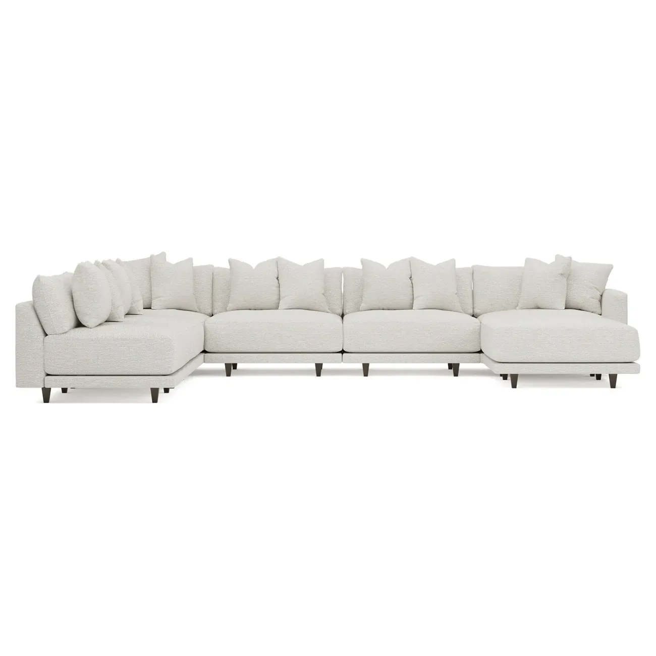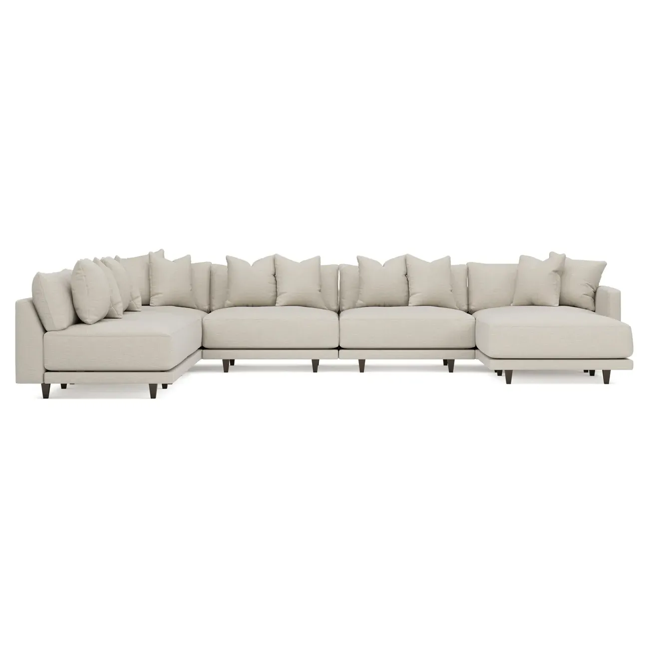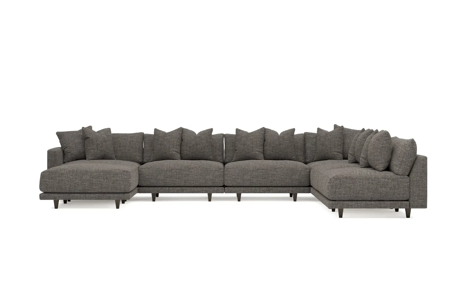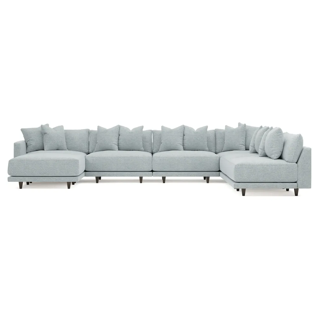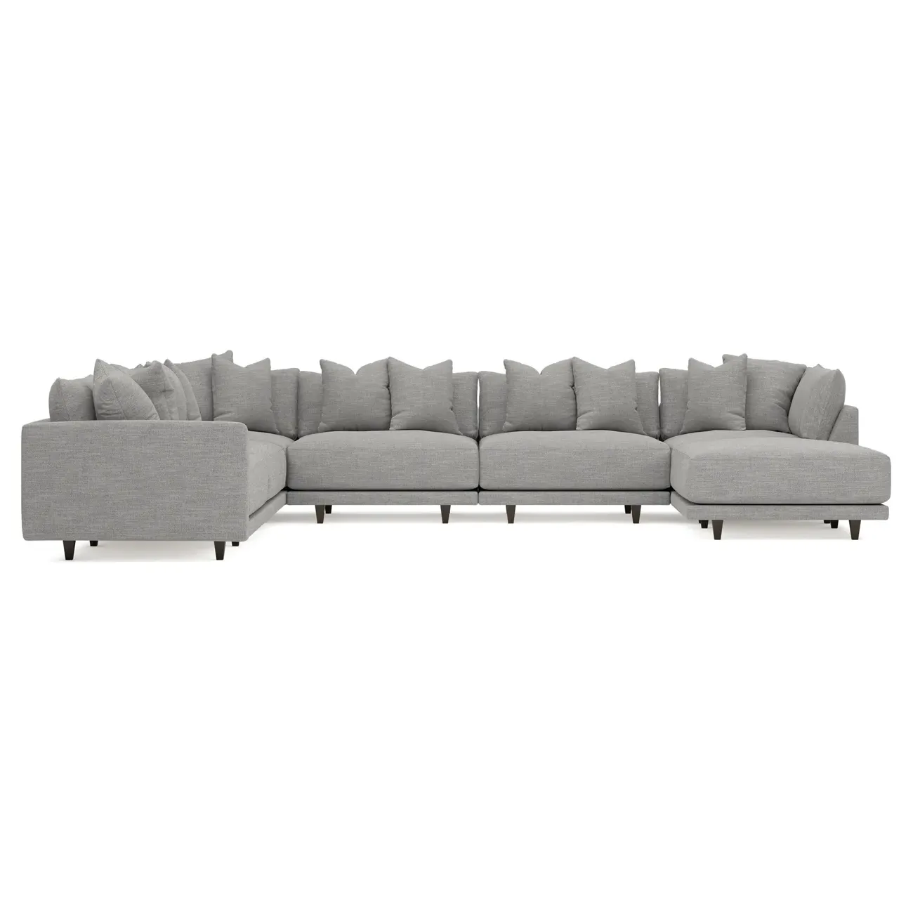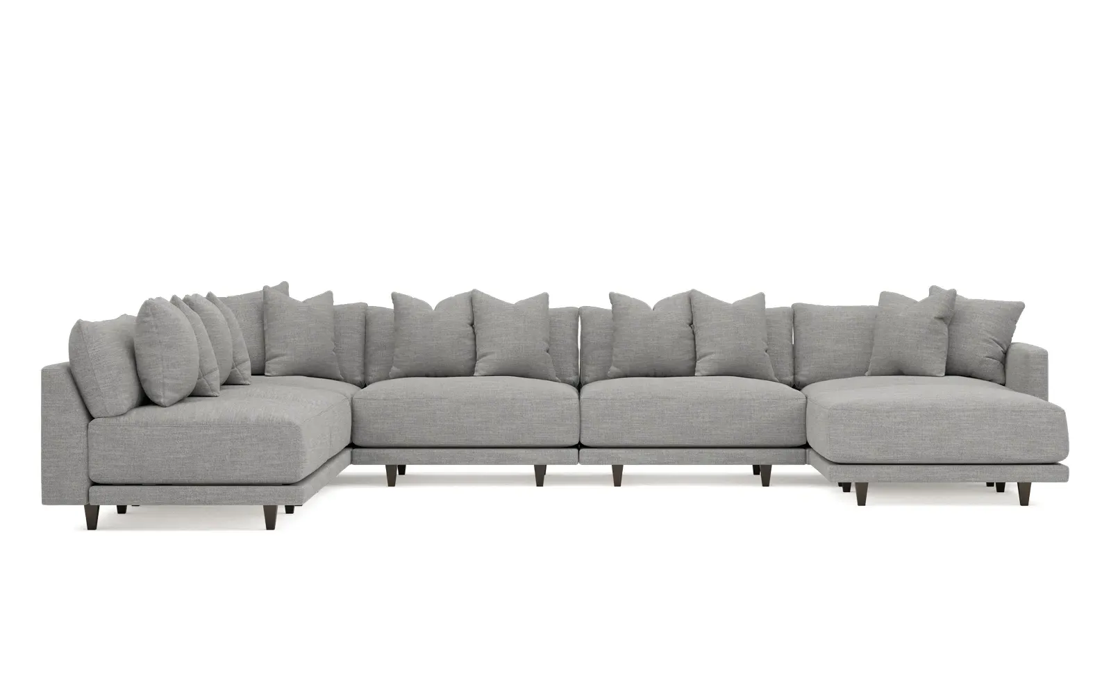 The left 171” Toulouse modular corner sectional is a family room’s perfect companion. With deep seating and oh-so-many plush pillows for sink-in comfort, the modern silhouette is delightfully relaxed. Recessed wood legs are hidden from sight, giving the sofa the appearance of floating. Lofted cushions are soft and supportive, with a foam core surrounded by a blend of fiber, down, and feather fill. Choose from a variety of upholstery options, including linen, velvet, and performance fabrics. <b>Overall Dimensions:</b> 171" W x 125" D x 35" H. <b>Ottoman Dimensions:</b> 40” W x 40” D x 20” H; <b>Corner Seat Dimensions:</b> 41” W x 41” D x 35” H; <b>Armless Seat Dimensions:</b> 42” W x 41” D x 35” H; <b>Single Seat Dimensions:</b> 46” W x 41” D x 35” H; <b>Seat Dimensions:</b> 29” D x 20” H; <b>Arm Height:</b> 27”; <b>Leg Height:</b> 5”. <b>Materials:</b> FSC®-certified, US-sourced, formaldehyde-free solid kiln-dried hardwood and furniture-grade laminates. <b>Material Finish:</b> Espresso legs. <b>Pieces Included:</b> Ottoman, Corner Seat, 4 Armless Seats, Left Single Seat.