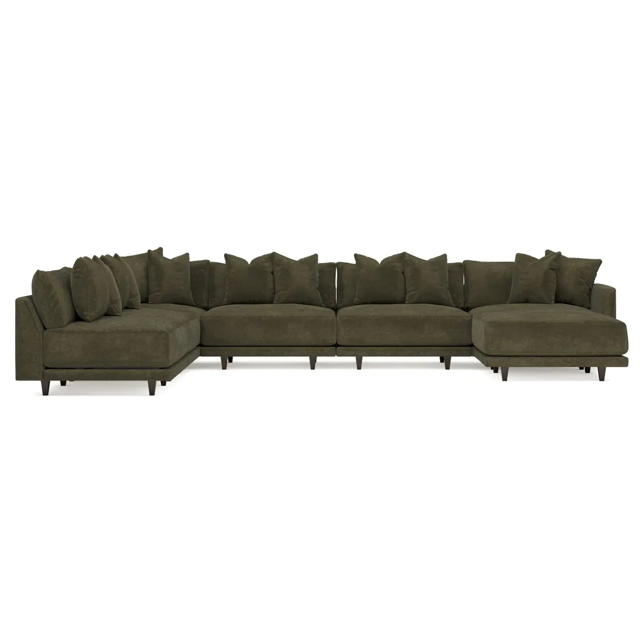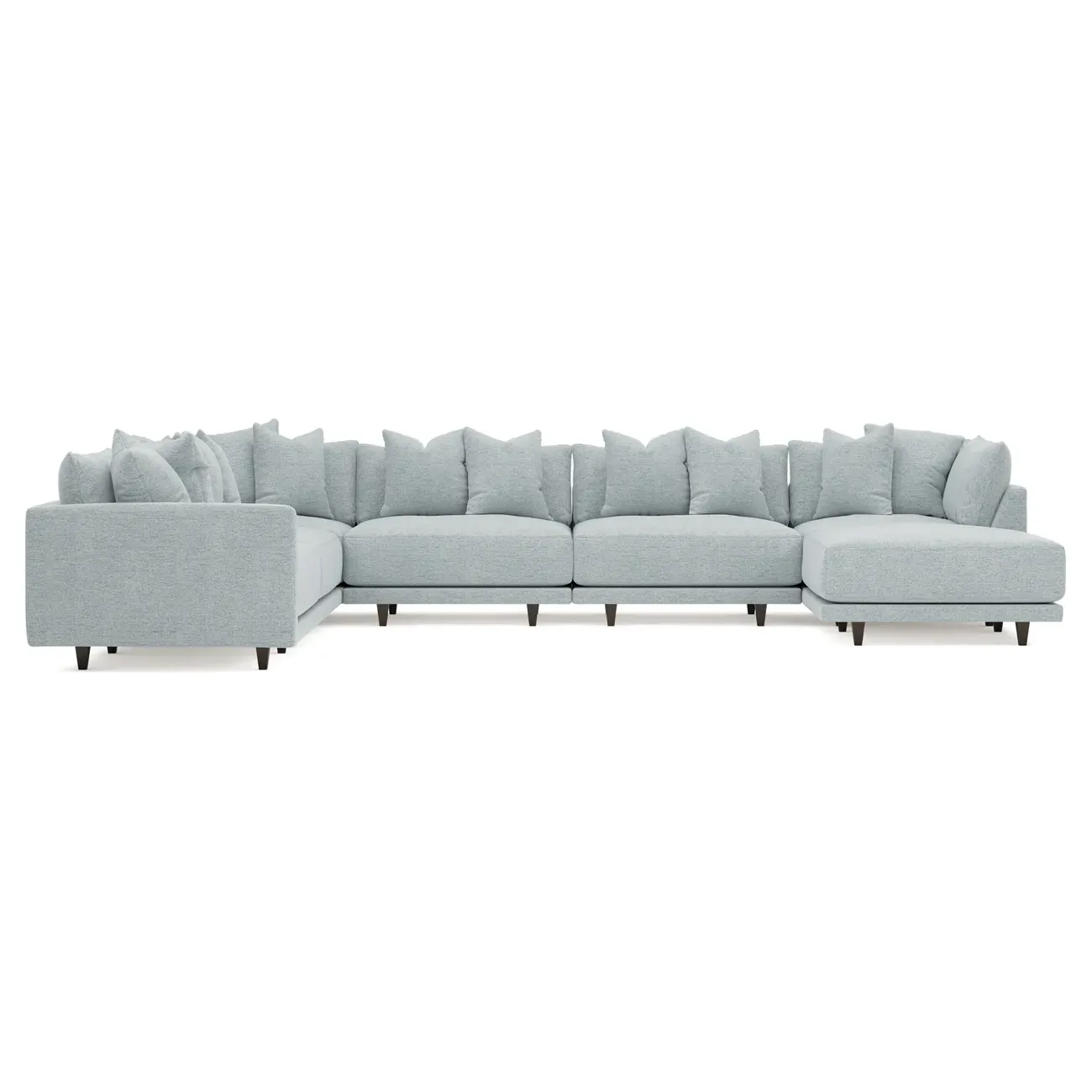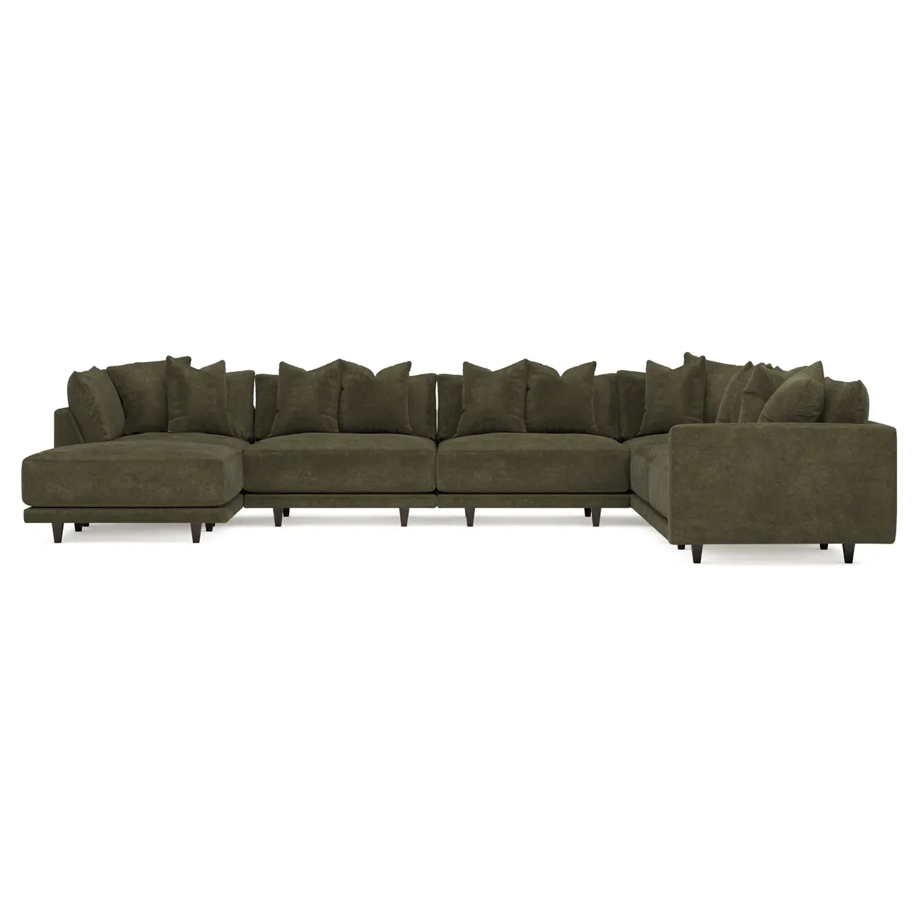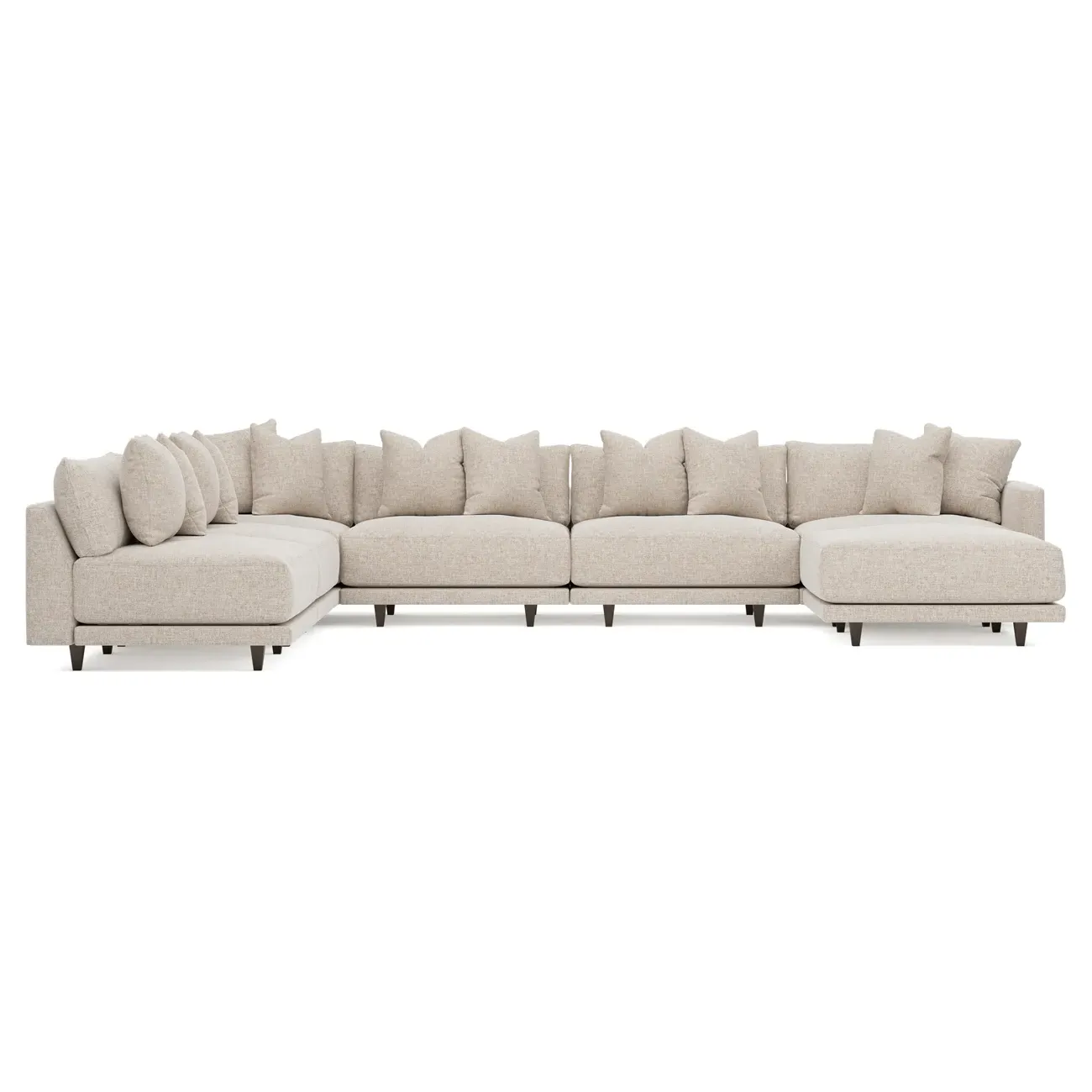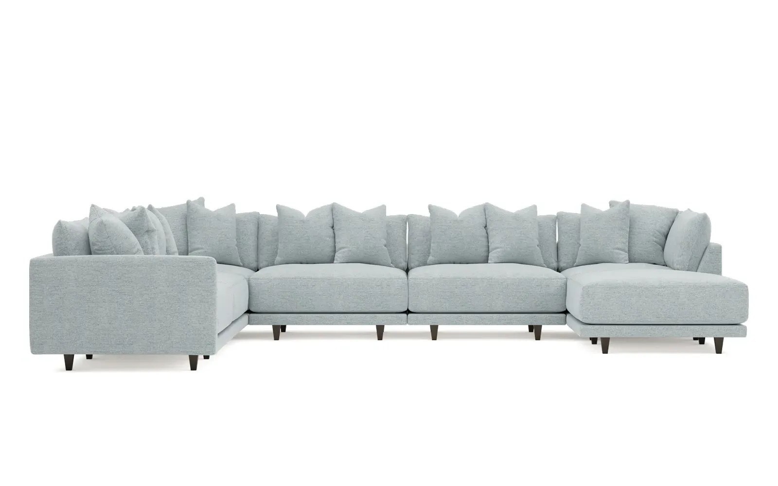 The left 171” Toulouse modular corner sectional is a family room’s perfect companion. With deep seating and oh-so-many plush pillows for sink-in comfort, the modern silhouette is delightfully relaxed. Recessed wood legs are hidden from sight, giving the sofa the appearance of floating. Lofted cushions are soft and supportive, with a foam core surrounded by a blend of fiber, down, and feather fill. Choose from a variety of upholstery options, including linen, velvet, and performance fabrics. <b>Overall Dimensions:</b> 171" W x 125" D x 35" H. <b>Ottoman Dimensions:</b> 40” W x 40” D x 20” H; <b>Corner Seat Dimensions:</b> 41” W x 41” D x 35” H; <b>Armless Seat Dimensions:</b> 42” W x 41” D x 35” H; <b>Single Seat Dimensions:</b> 46” W x 41” D x 35” H; <b>Seat Dimensions:</b> 29” D x 20” H; <b>Arm Height:</b> 27”; <b>Leg Height:</b> 5”. <b>Materials:</b> FSC®-certified, US-sourced, formaldehyde-free solid kiln-dried hardwood and furniture-grade laminates. <b>Material Finish:</b> Espresso legs. <b>Pieces Included:</b> Ottoman, Corner Seat, 4 Armless Seats, Left Single Seat.