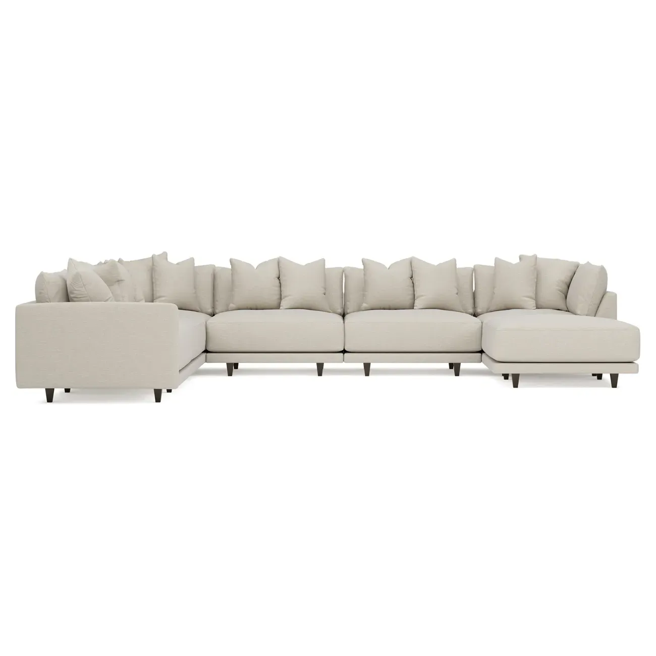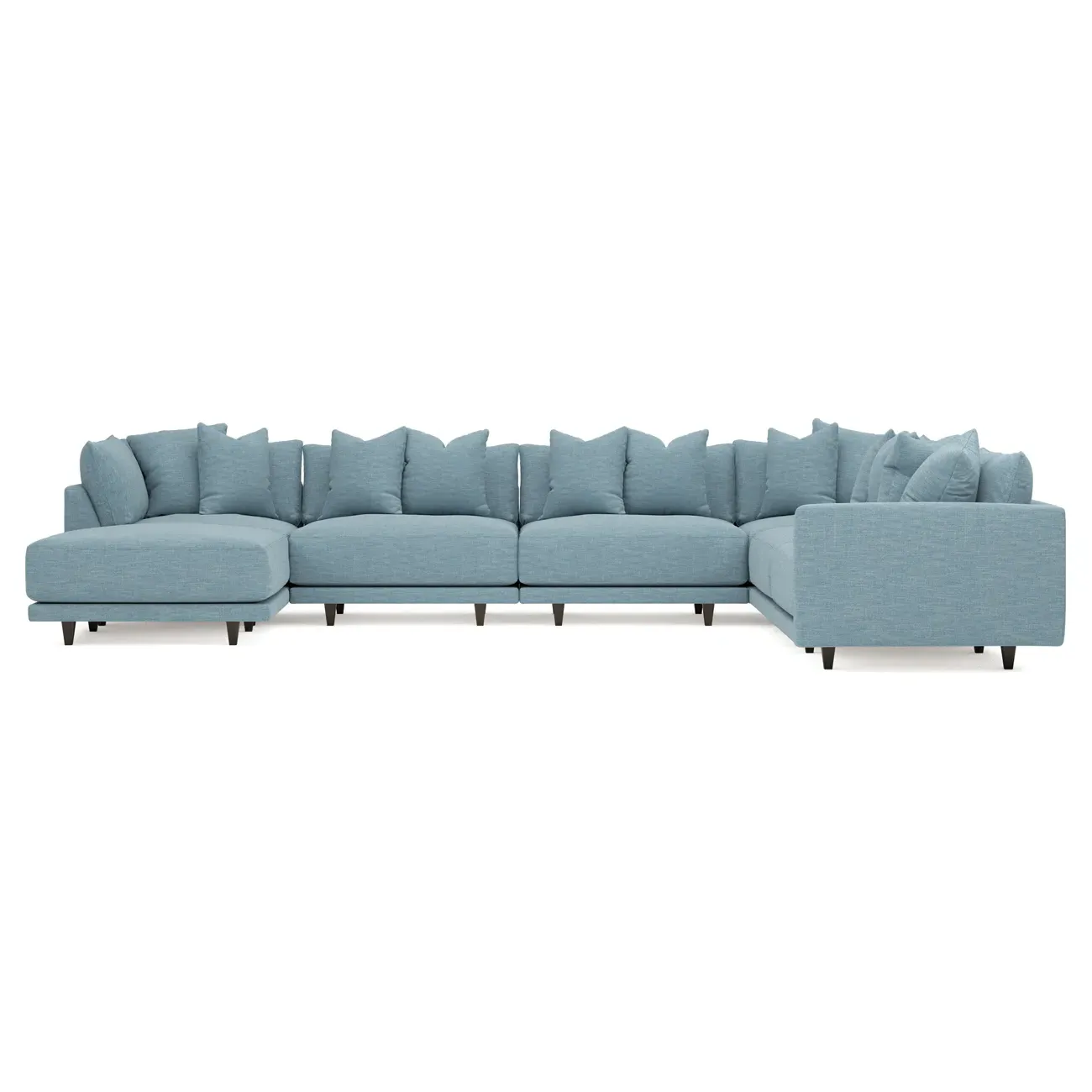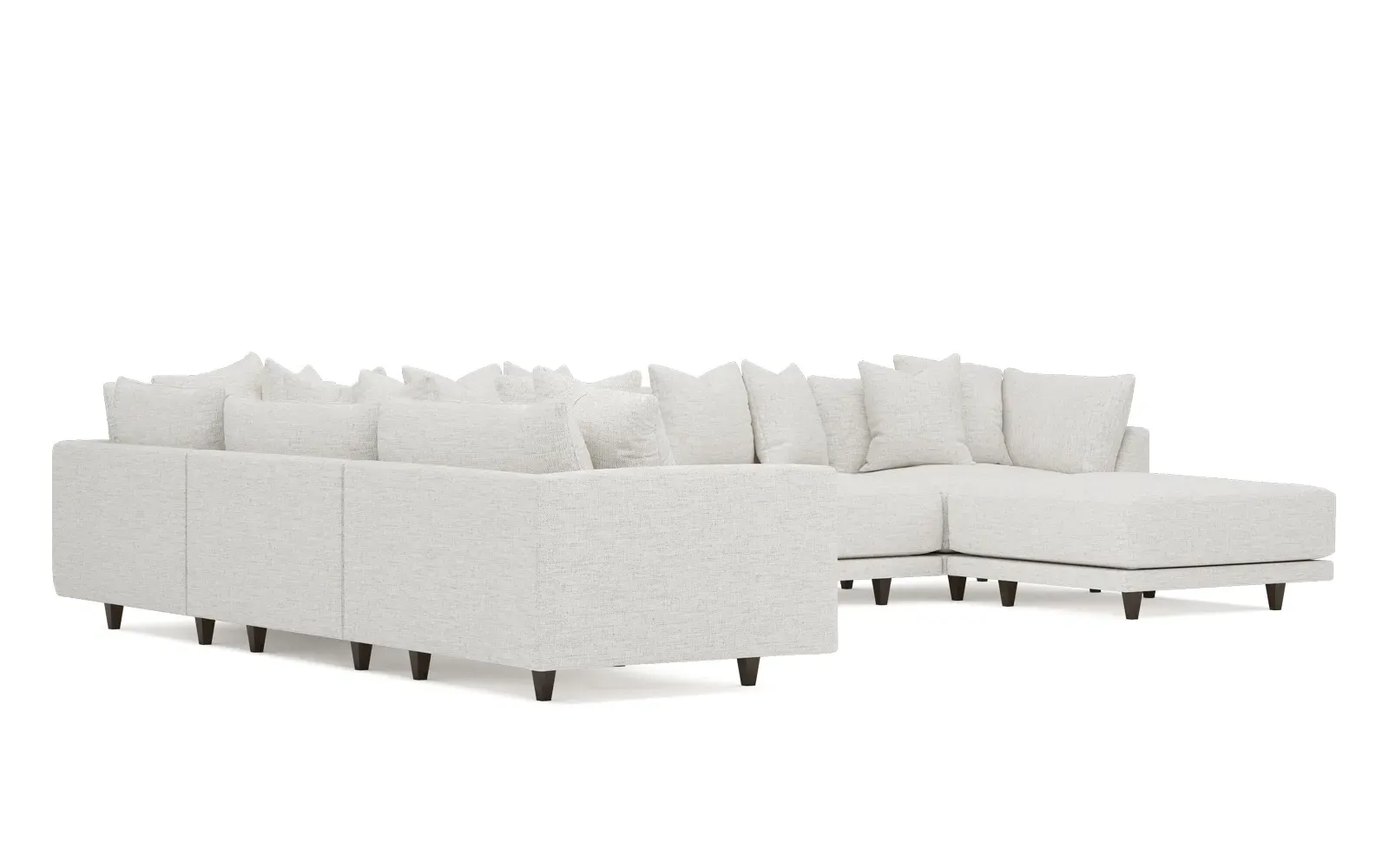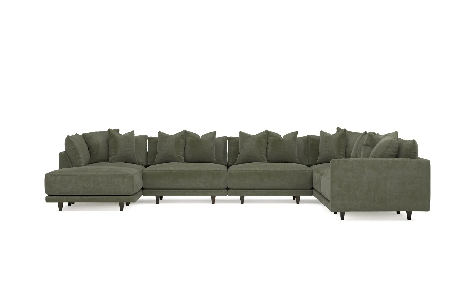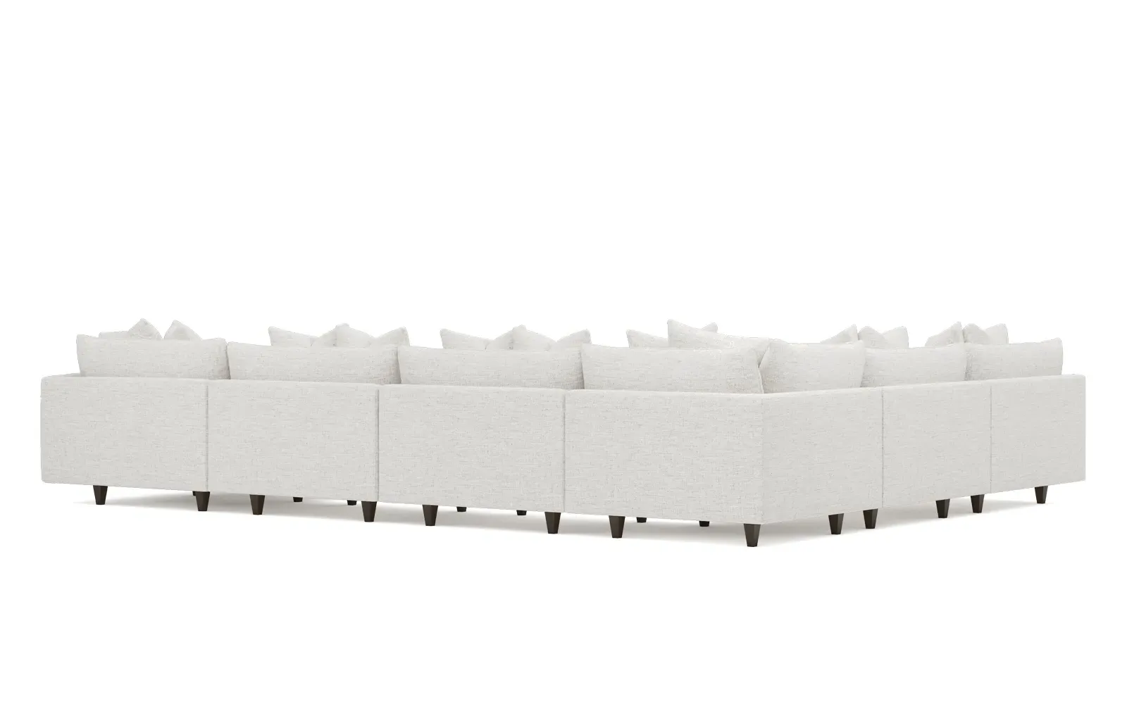 The left 171” Toulouse modular corner sectional is a family room’s perfect companion. With deep seating and oh-so-many plush pillows for sink-in comfort, the modern silhouette is delightfully relaxed. Recessed wood legs are hidden from sight, giving the sofa the appearance of floating. Lofted cushions are soft and supportive, with a foam core surrounded by a blend of fiber, down, and feather fill. Choose from a variety of upholstery options, including linen, velvet, and performance fabrics. <b>Overall Dimensions:</b> 171" W x 125" D x 35" H. <b>Ottoman Dimensions:</b> 40” W x 40” D x 20” H; <b>Corner Seat Dimensions:</b> 41” W x 41” D x 35” H; <b>Armless Seat Dimensions:</b> 42” W x 41” D x 35” H; <b>Single Seat Dimensions:</b> 46” W x 41” D x 35” H; <b>Seat Dimensions:</b> 29” D x 20” H; <b>Arm Height:</b> 27”; <b>Leg Height:</b> 5”. <b>Materials:</b> FSC®-certified, US-sourced, formaldehyde-free solid kiln-dried hardwood and furniture-grade laminates. <b>Material Finish:</b> Espresso legs. <b>Pieces Included:</b> Ottoman, Corner Seat, 4 Armless Seats, Left Single Seat.