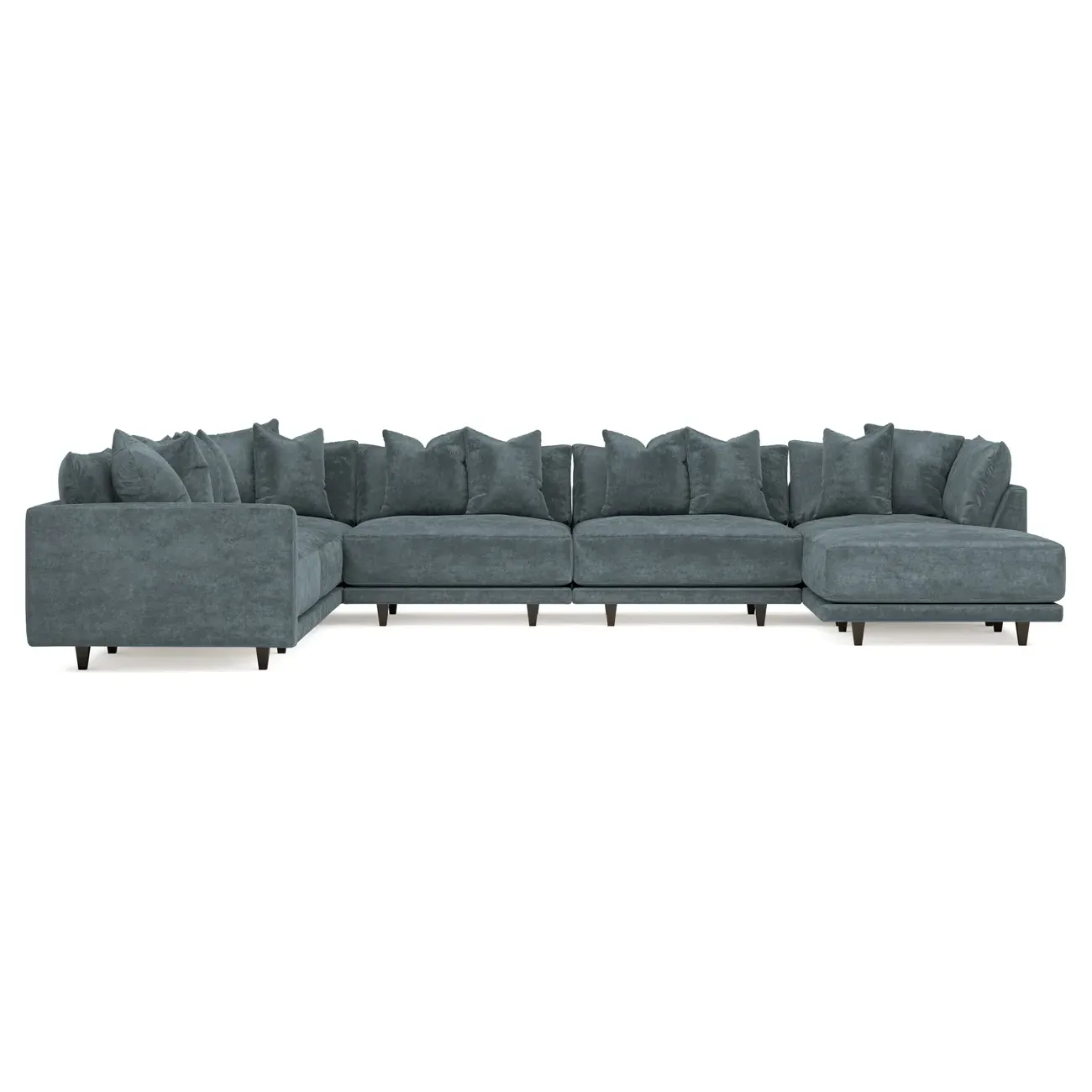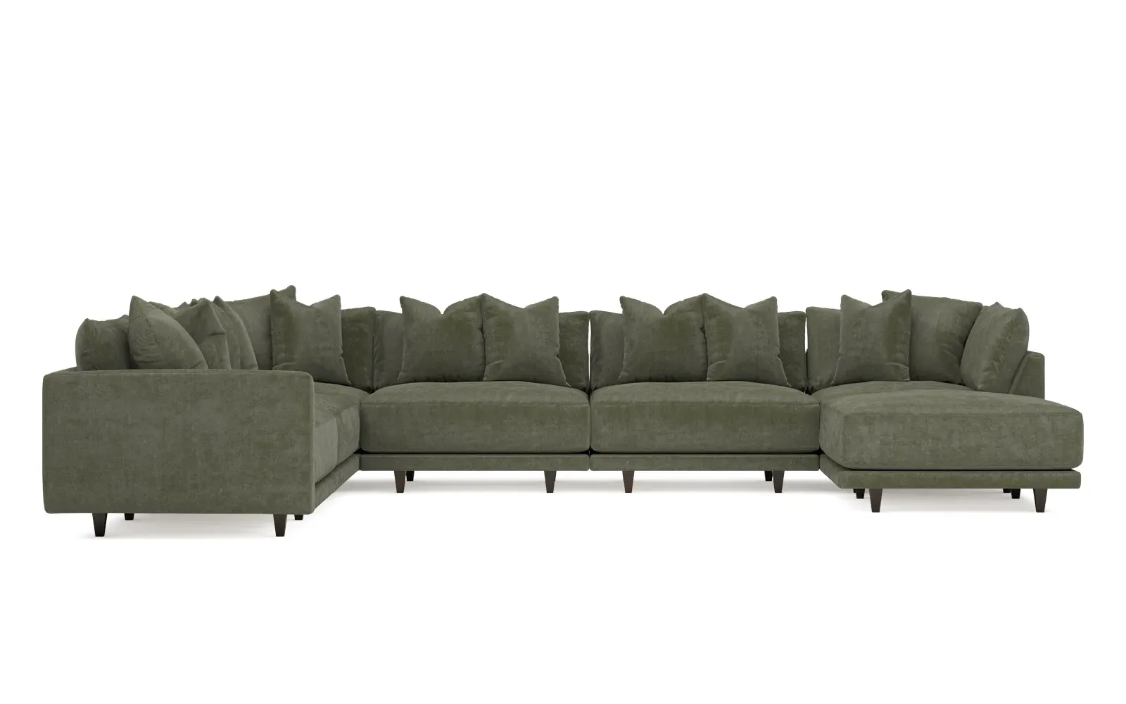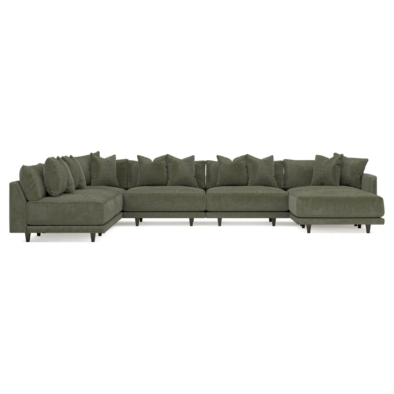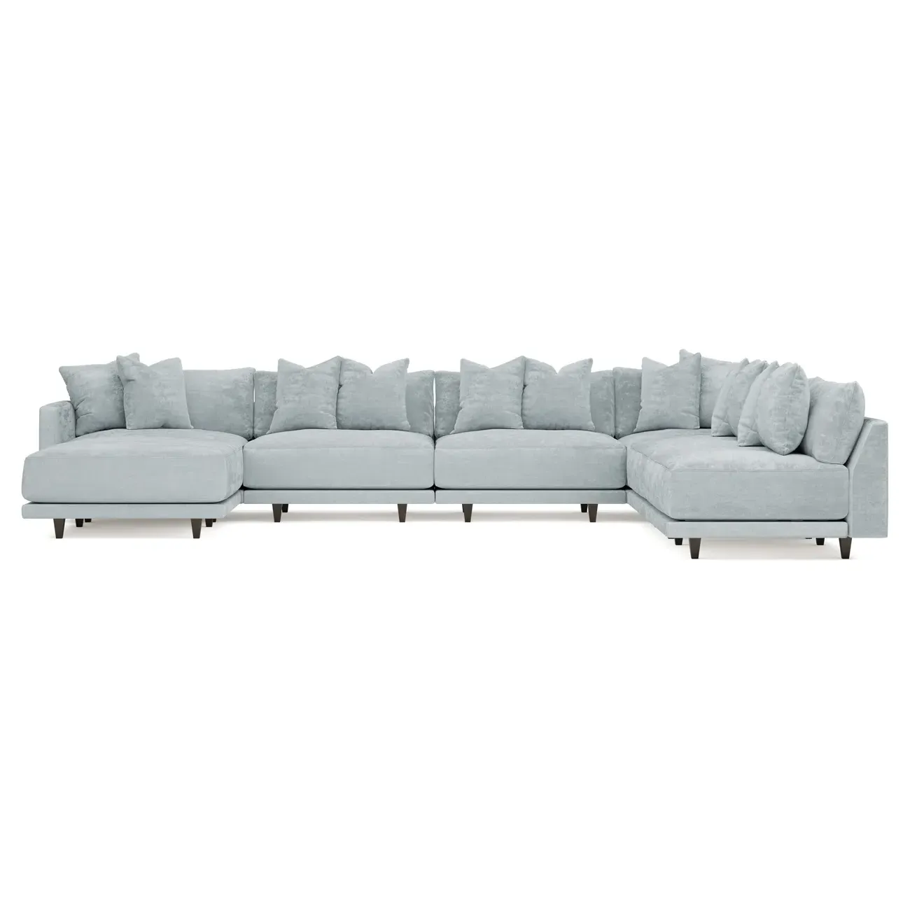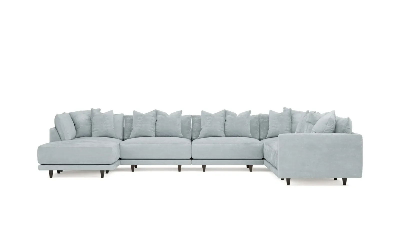 The left 171” Toulouse modular corner sectional is a family room’s perfect companion. With deep seating and oh-so-many plush pillows for sink-in comfort, the modern silhouette is delightfully relaxed. Recessed wood legs are hidden from sight, giving the sofa the appearance of floating. Lofted cushions are soft and supportive, with a foam core surrounded by a blend of fiber, down, and feather fill. Choose from a variety of upholstery options, including linen, velvet, and performance fabrics. <b>Overall Dimensions:</b> 171" W x 125" D x 35" H. <b>Ottoman Dimensions:</b> 40” W x 40” D x 20” H; <b>Corner Seat Dimensions:</b> 41” W x 41” D x 35” H; <b>Armless Seat Dimensions:</b> 42” W x 41” D x 35” H; <b>Single Seat Dimensions:</b> 46” W x 41” D x 35” H; <b>Seat Dimensions:</b> 29” D x 20” H; <b>Arm Height:</b> 27”; <b>Leg Height:</b> 5”. <b>Materials:</b> FSC®-certified, US-sourced, formaldehyde-free solid kiln-dried hardwood and furniture-grade laminates. <b>Material Finish:</b> Espresso legs. <b>Pieces Included:</b> Ottoman, Corner Seat, 4 Armless Seats, Left Single Seat.
