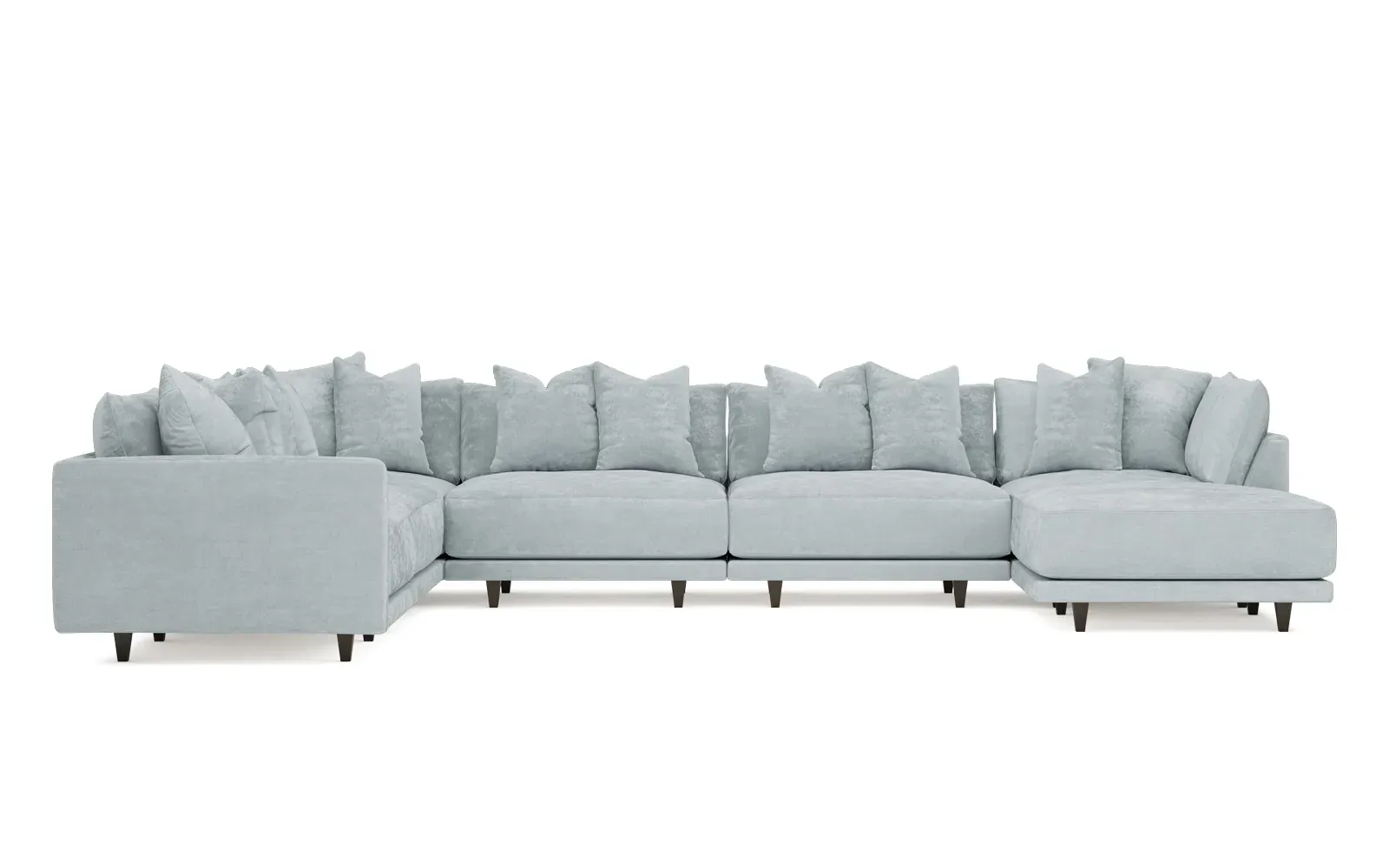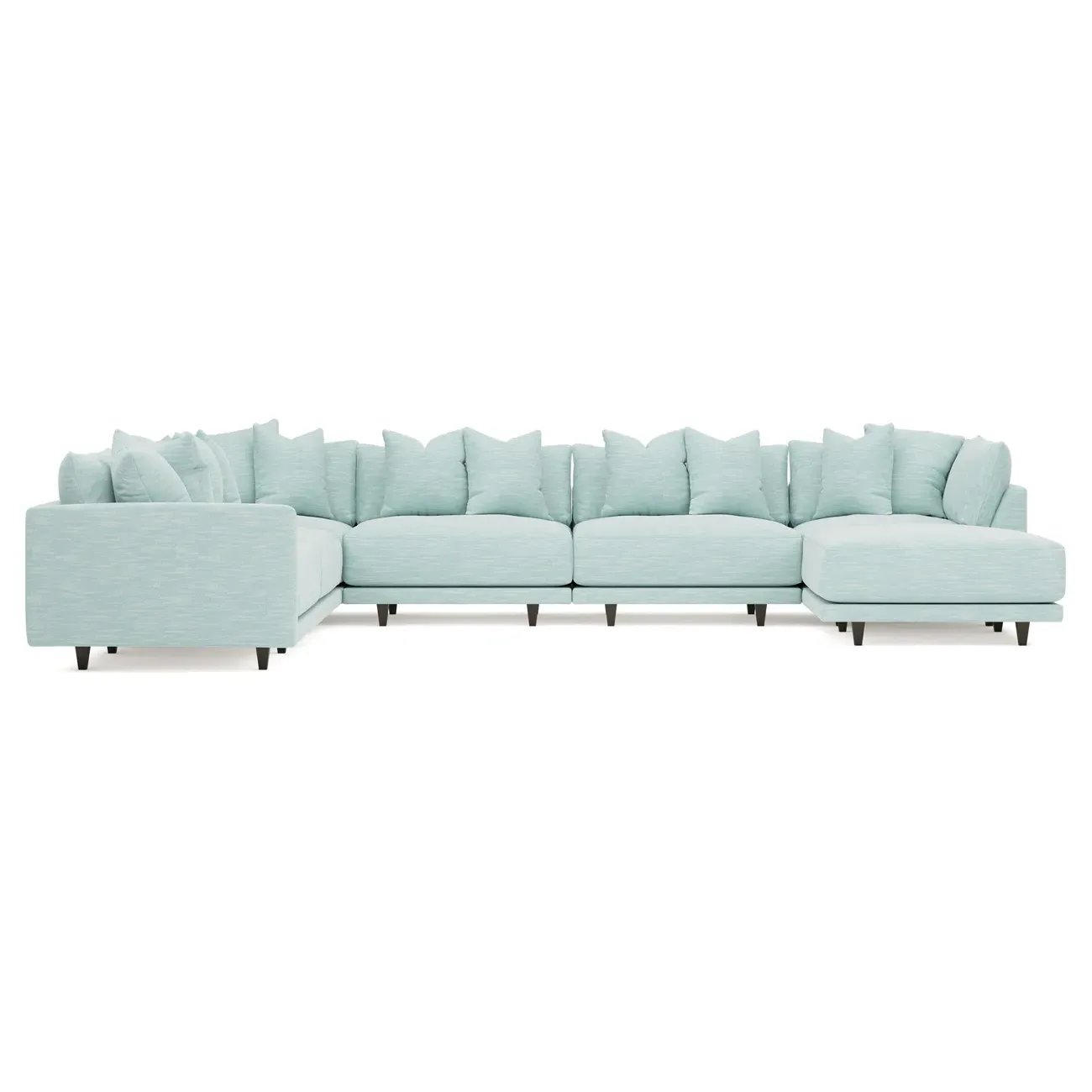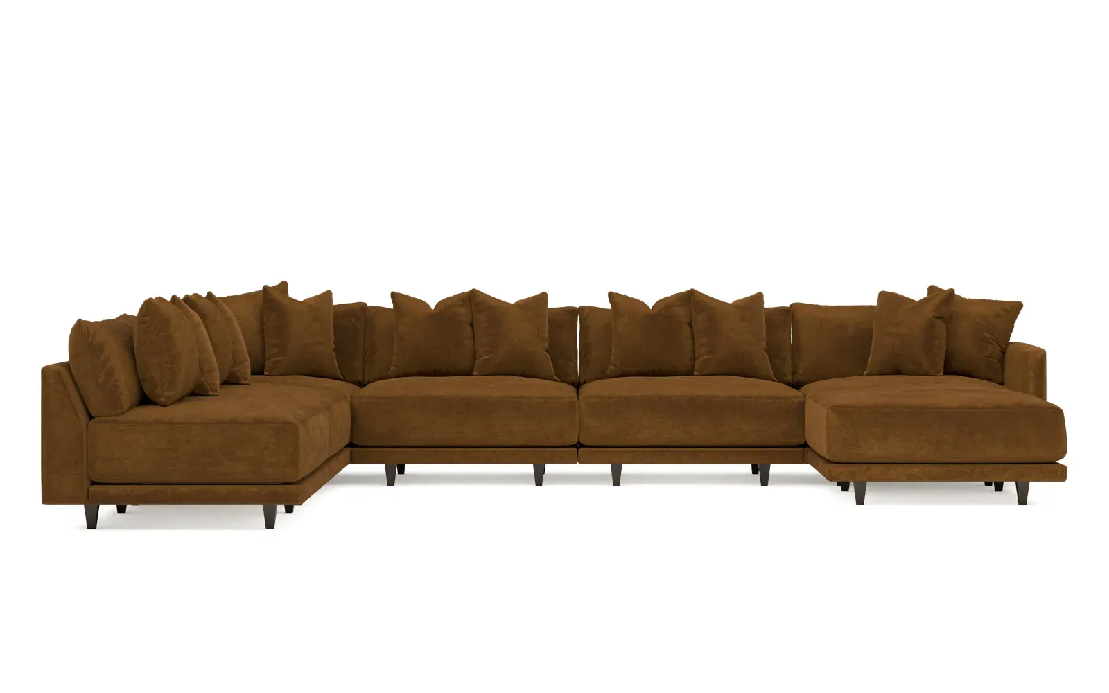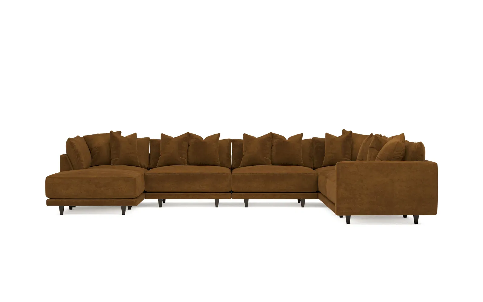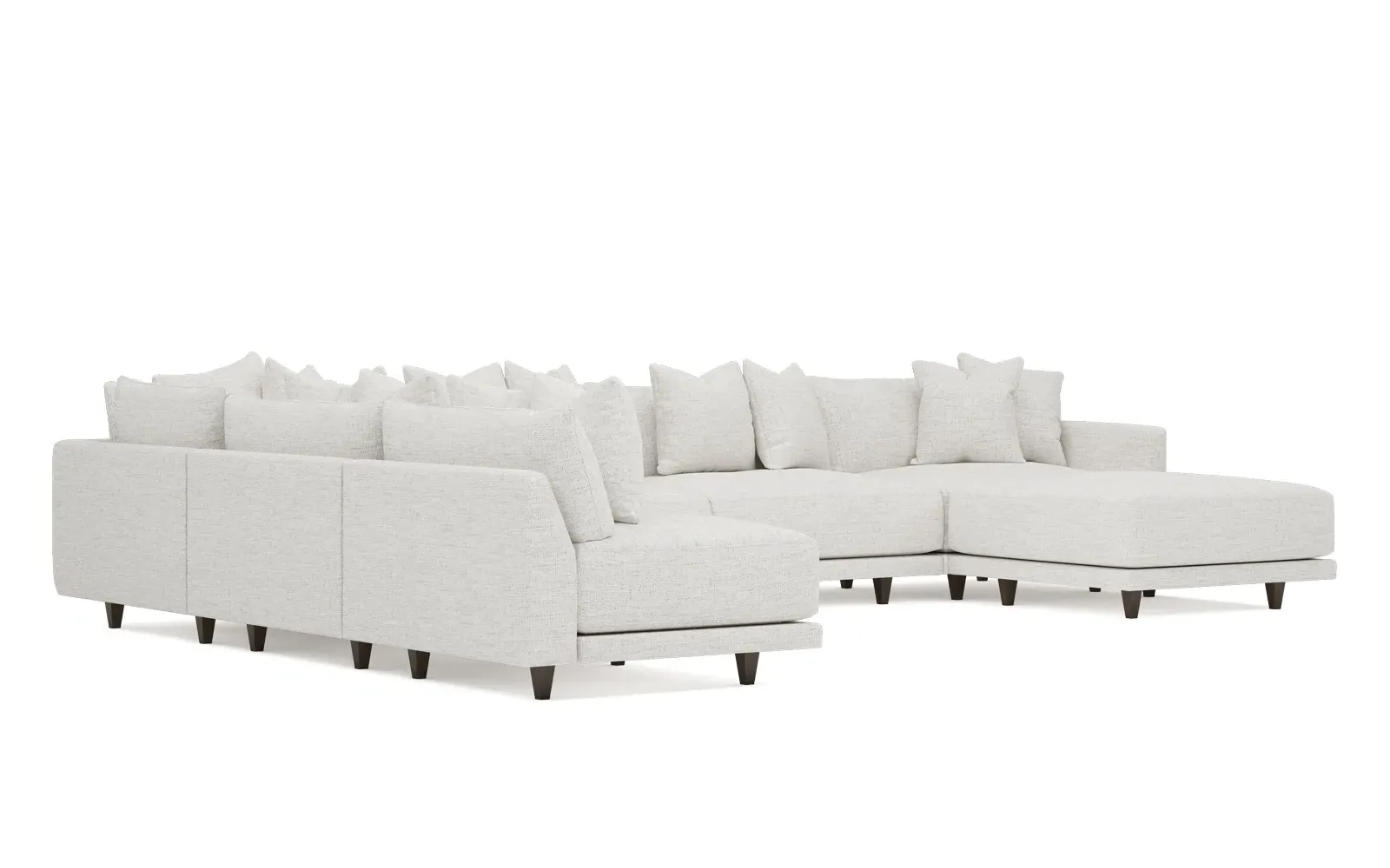 The left 171” Toulouse modular corner sectional is a family room’s perfect companion. With deep seating and oh-so-many plush pillows for sink-in comfort, the modern silhouette is delightfully relaxed. Recessed wood legs are hidden from sight, giving the sofa the appearance of floating. Lofted cushions are soft and supportive, with a foam core surrounded by a blend of fiber, down, and feather fill. Choose from a variety of upholstery options, including linen, velvet, and performance fabrics. <b>Overall Dimensions:</b> 171" W x 125" D x 35" H. <b>Ottoman Dimensions:</b> 40” W x 40” D x 20” H; <b>Corner Seat Dimensions:</b> 41” W x 41” D x 35” H; <b>Armless Seat Dimensions:</b> 42” W x 41” D x 35” H; <b>Single Seat Dimensions:</b> 46” W x 41” D x 35” H; <b>Seat Dimensions:</b> 29” D x 20” H; <b>Arm Height:</b> 27”; <b>Leg Height:</b> 5”. <b>Materials:</b> FSC®-certified, US-sourced, formaldehyde-free solid kiln-dried hardwood and furniture-grade laminates. <b>Material Finish:</b> Espresso legs. <b>Pieces Included:</b> Ottoman, Corner Seat, 4 Armless Seats, Left Single Seat.