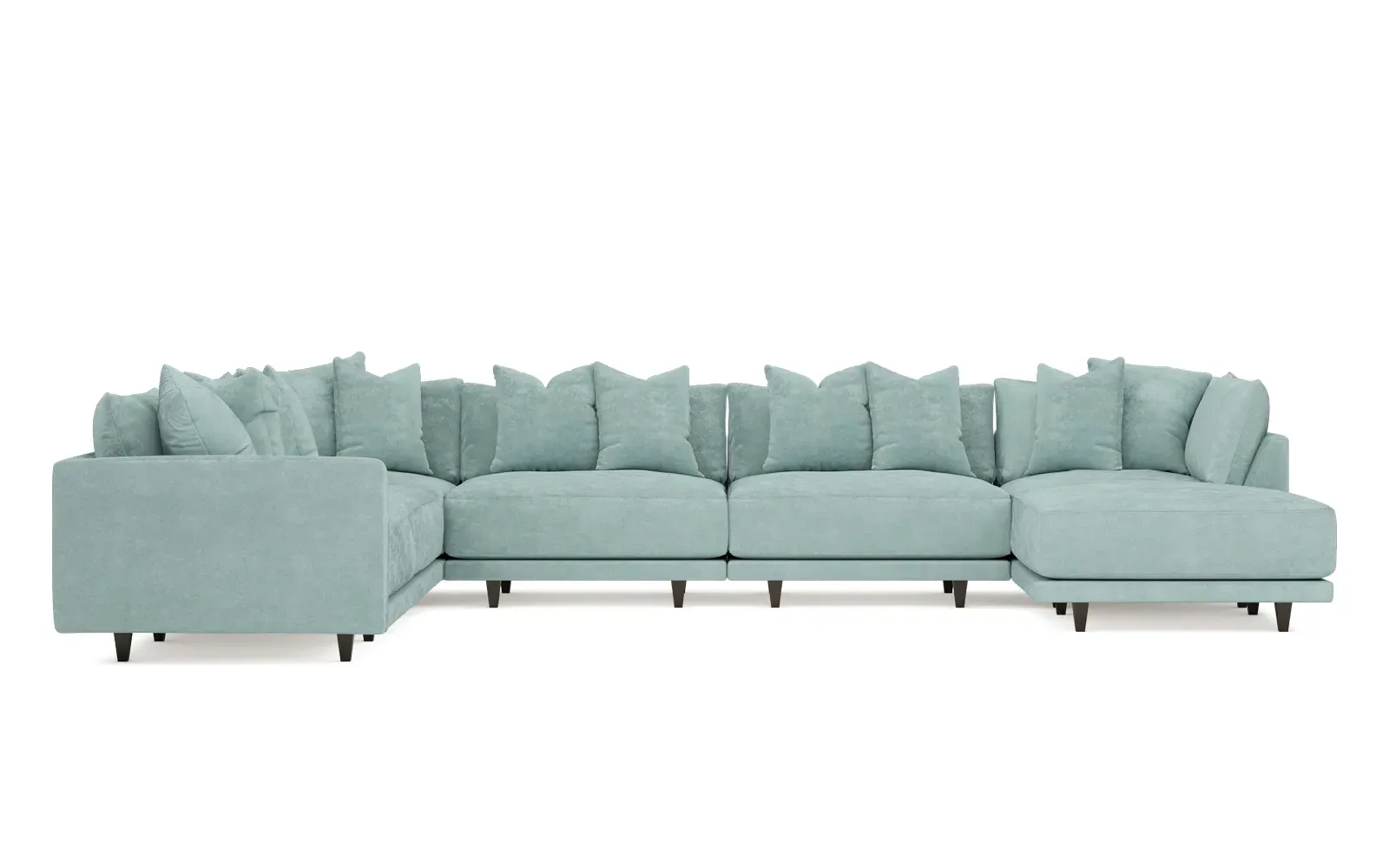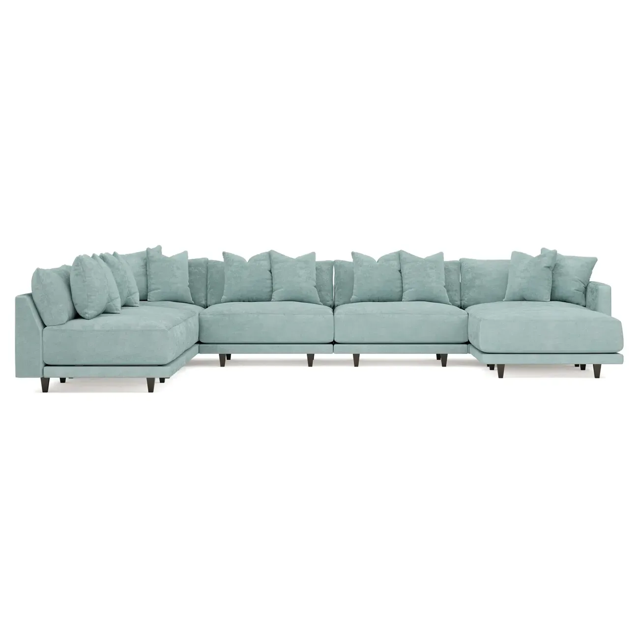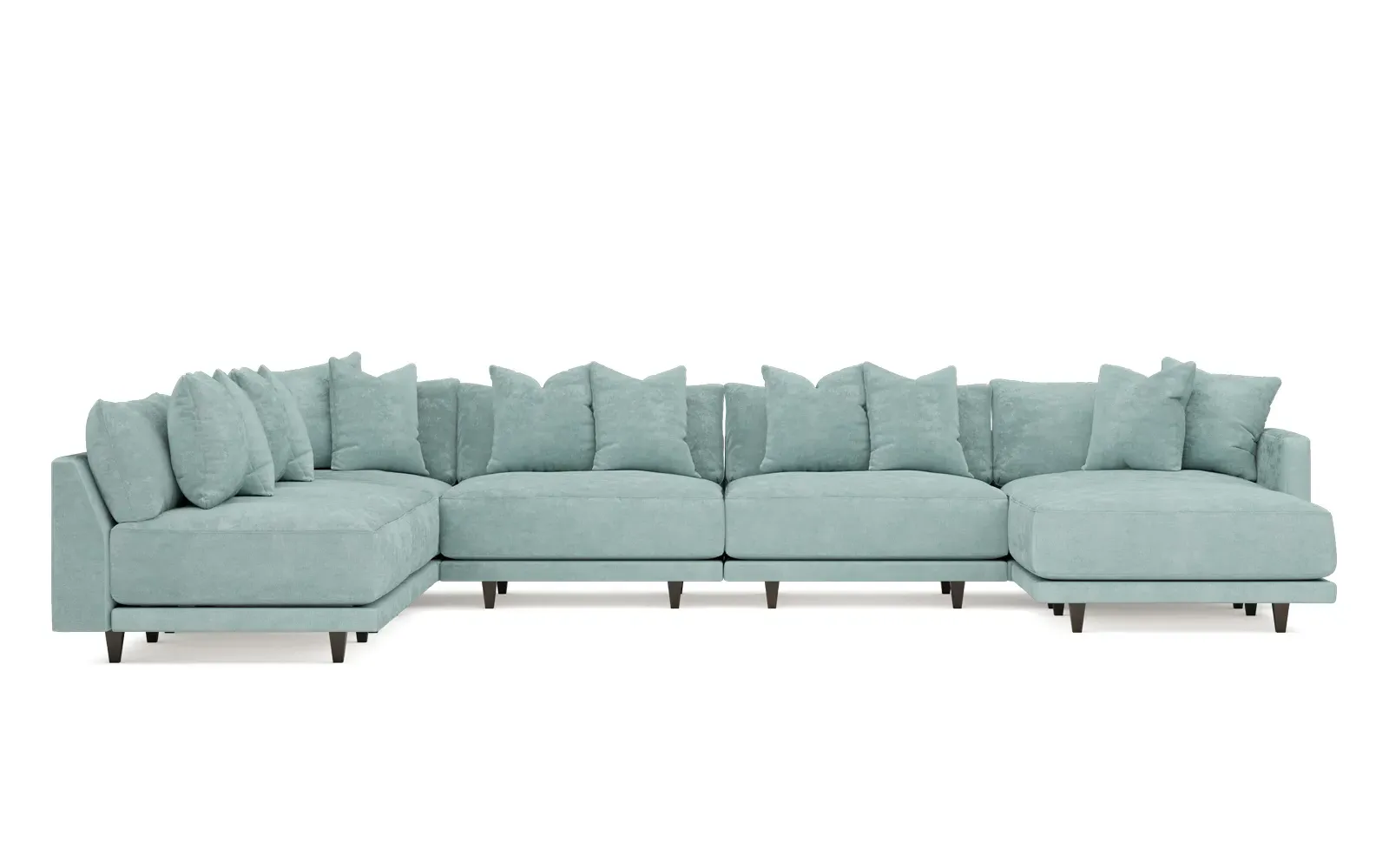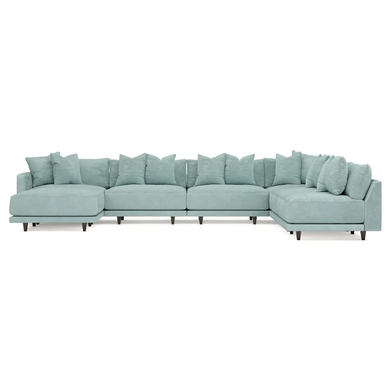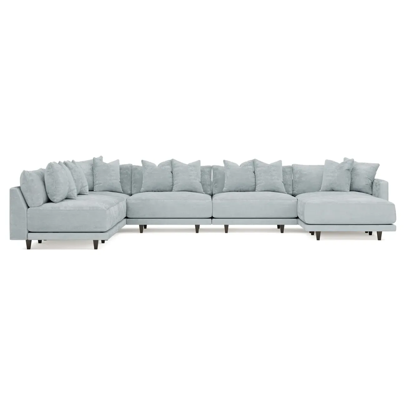 The left 171” Toulouse modular corner sectional is a family room’s perfect companion. With deep seating and oh-so-many plush pillows for sink-in comfort, the modern silhouette is delightfully relaxed. Recessed wood legs are hidden from sight, giving the sofa the appearance of floating. Lofted cushions are soft and supportive, with a foam core surrounded by a blend of fiber, down, and feather fill. Choose from a variety of upholstery options, including linen, velvet, and performance fabrics. <b>Overall Dimensions:</b> 171" W x 125" D x 35" H. <b>Ottoman Dimensions:</b> 40” W x 40” D x 20” H; <b>Corner Seat Dimensions:</b> 41” W x 41” D x 35” H; <b>Armless Seat Dimensions:</b> 42” W x 41” D x 35” H; <b>Single Seat Dimensions:</b> 46” W x 41” D x 35” H; <b>Seat Dimensions:</b> 29” D x 20” H; <b>Arm Height:</b> 27”; <b>Leg Height:</b> 5”. <b>Materials:</b> FSC®-certified, US-sourced, formaldehyde-free solid kiln-dried hardwood and furniture-grade laminates. <b>Material Finish:</b> Espresso legs. <b>Pieces Included:</b> Ottoman, Corner Seat, 4 Armless Seats, Left Single Seat.