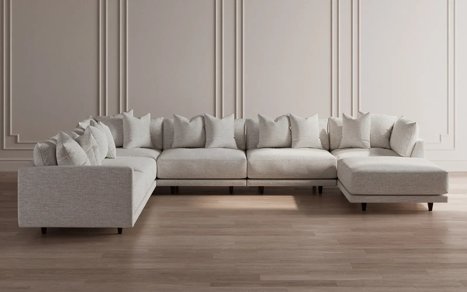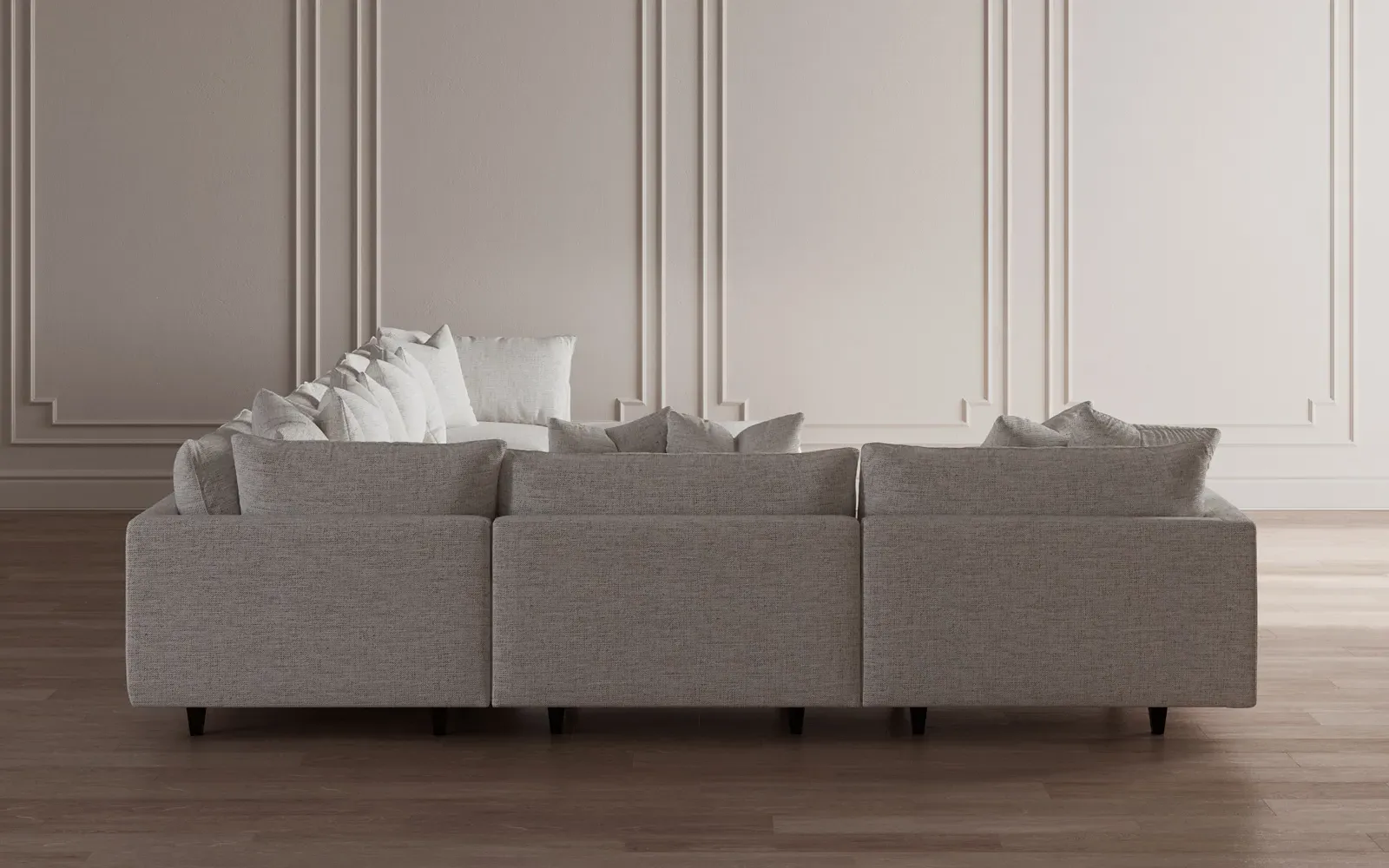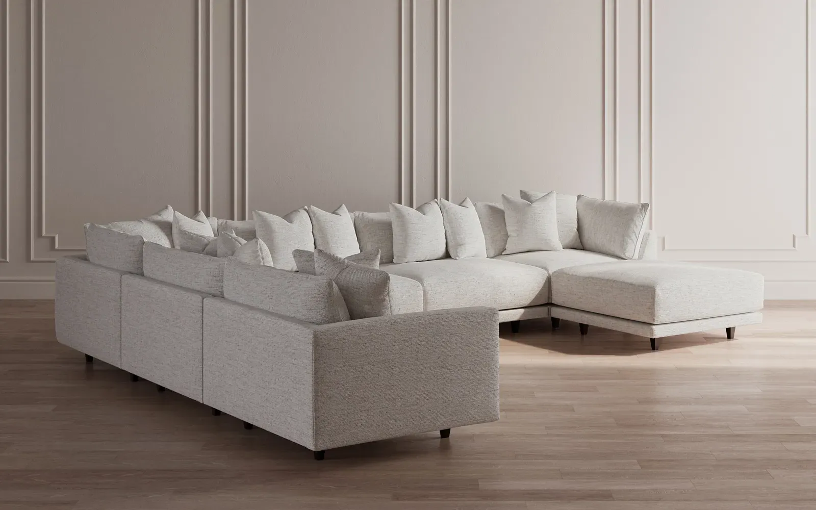 The Toulouse modular corner sectional offers deep seating with plush pillows for sink-in comfort. Its recessed wood legs remain hidden from sight, giving the sofa a floating appearance, while lofted cushions provide soft support with a foam core surrounded by fiber, down, and feather fill. The FSC-certified kiln-dried hardwood frame ensures durability, and the espresso-finished legs add a refined touch. W434 x D318 x H89 cm.