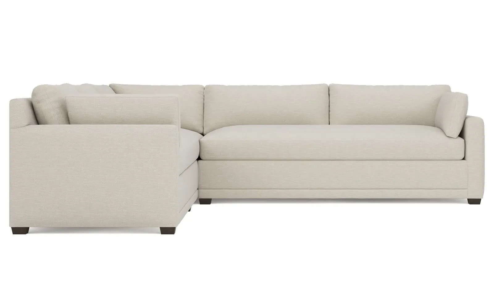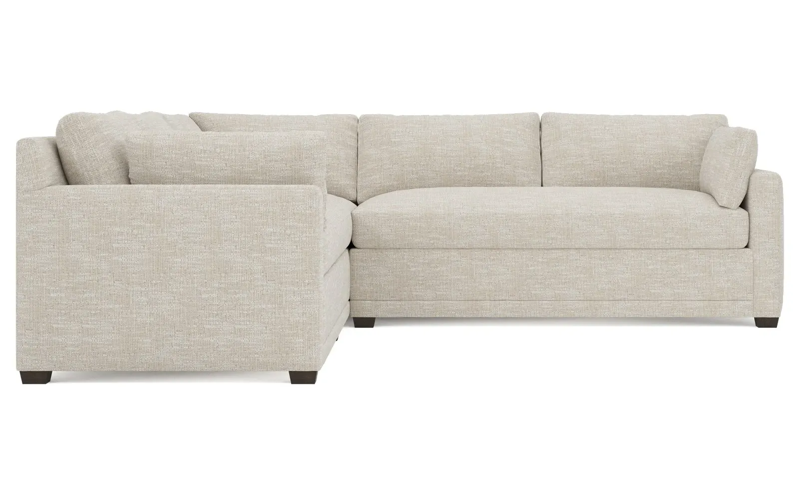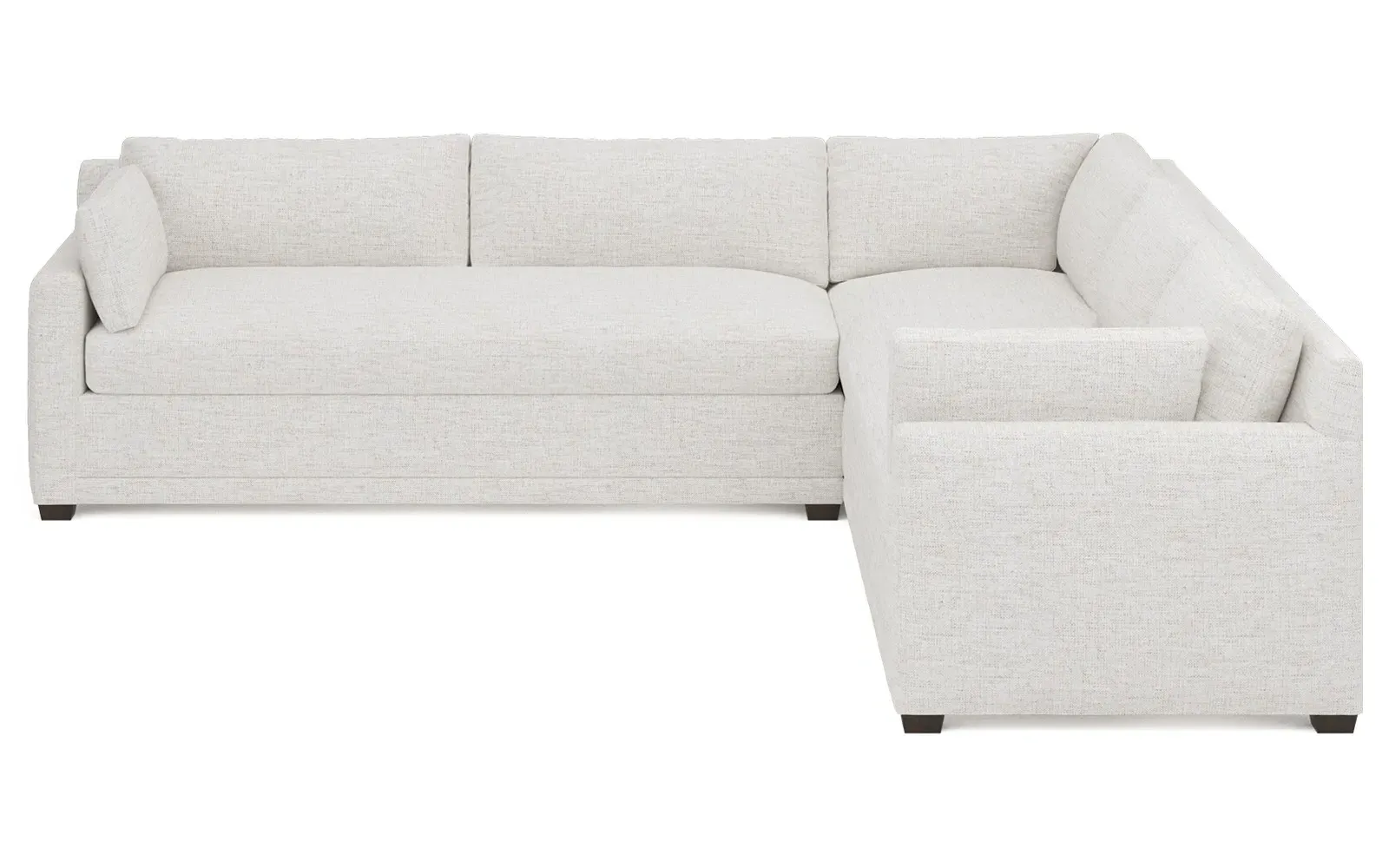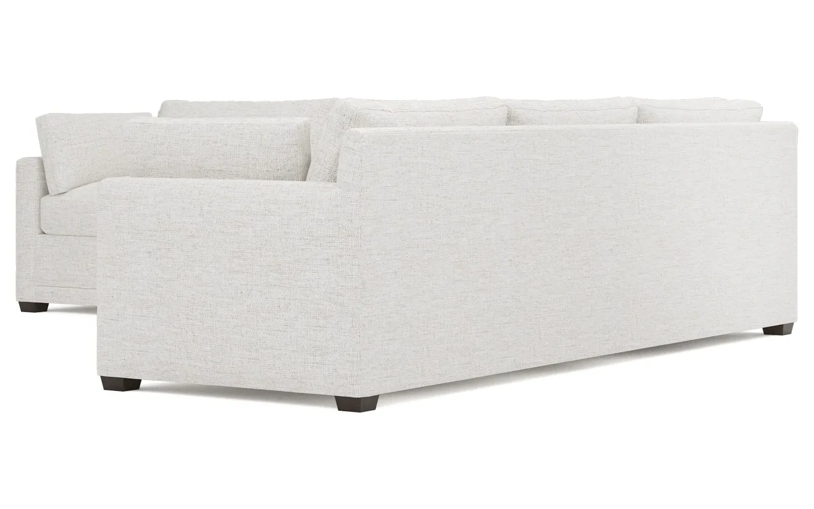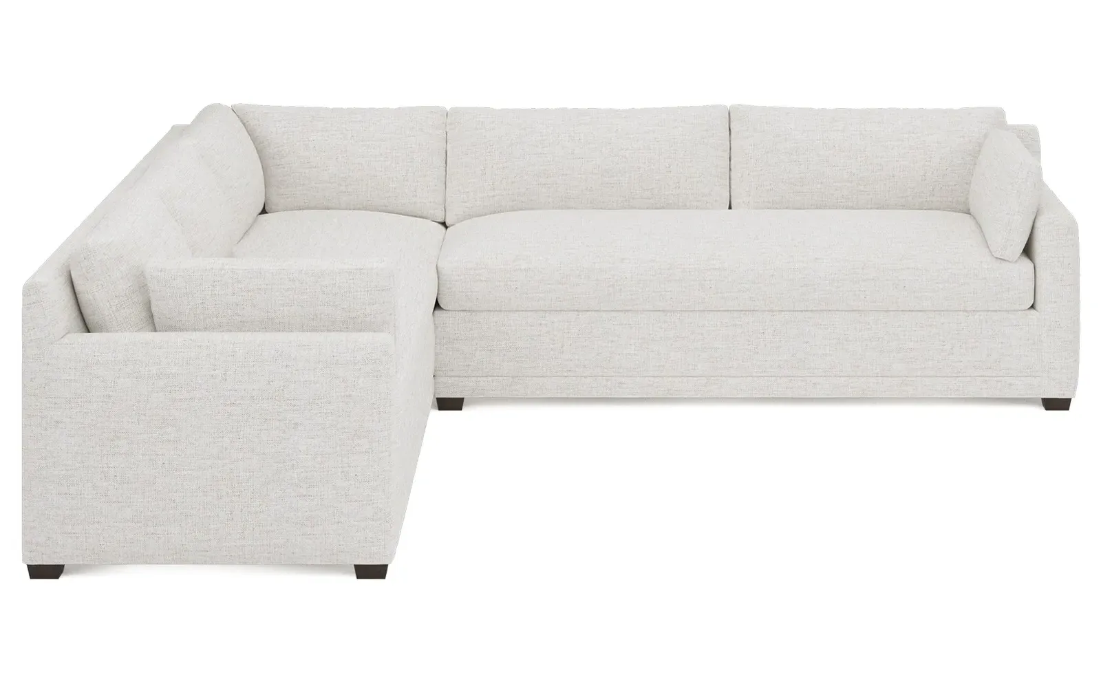 The Weybridge corner sectional offers generous seating with its plush box cushions and streamlined track arms. Its foam core surrounded by fiber, down, and feather fill provides cloud-like comfort, while the long bench seat ensures uninterrupted relaxation. The tapered wood legs with espresso finish add stability and visual appeal. W279 x D295 x H89 cm.