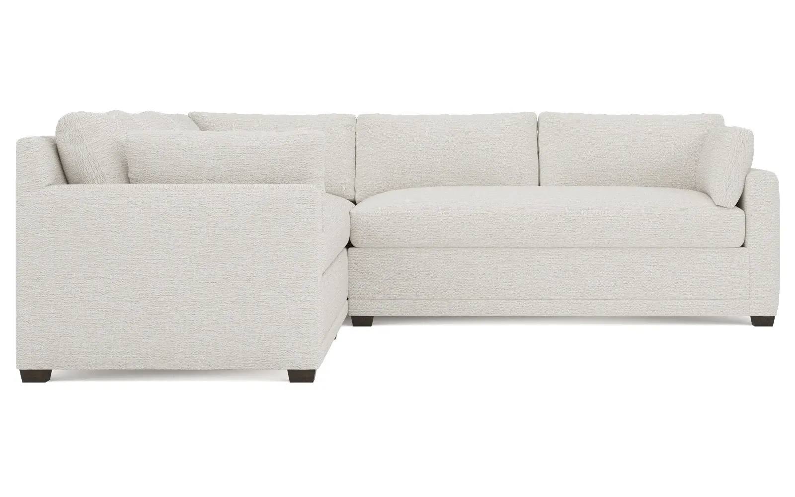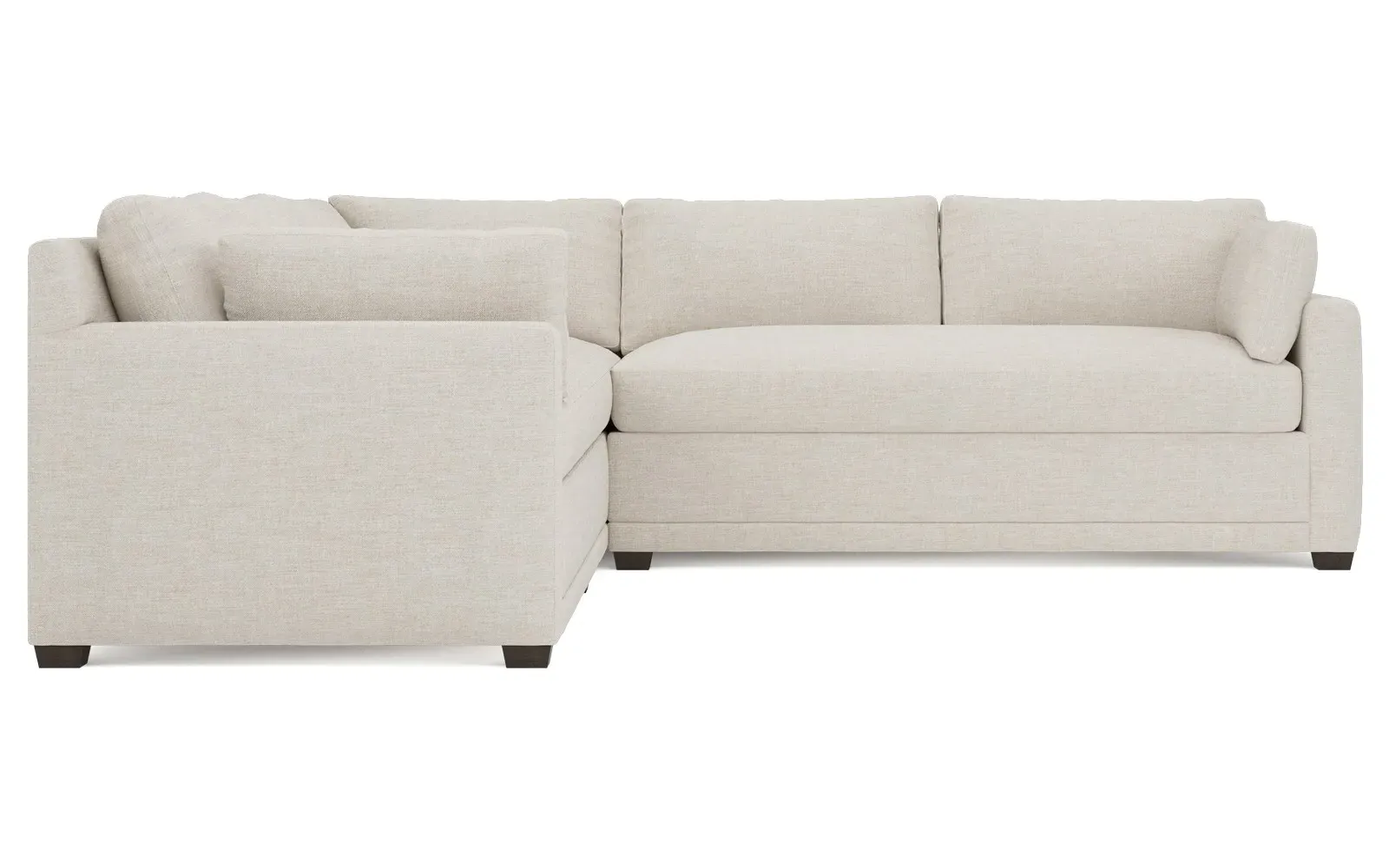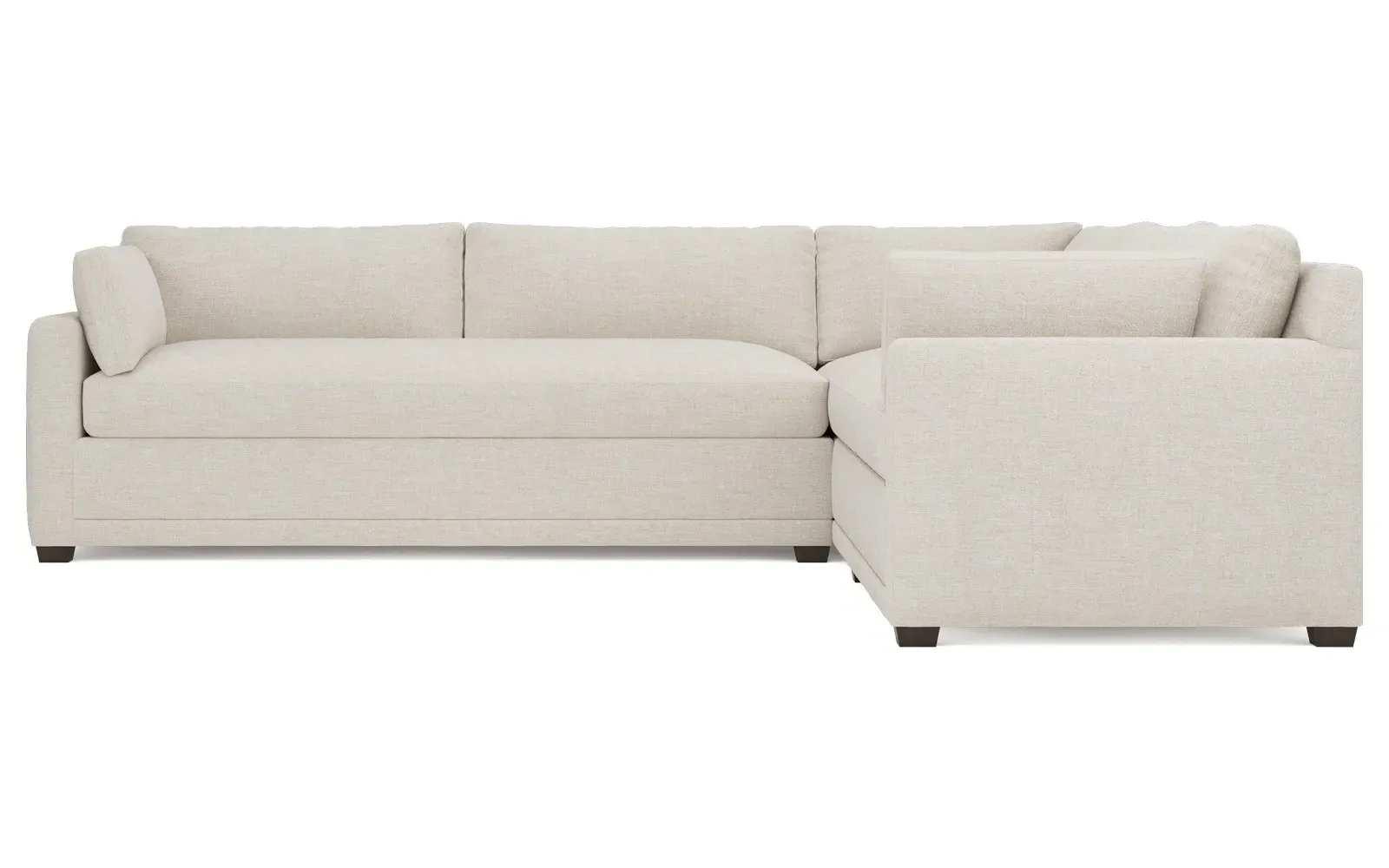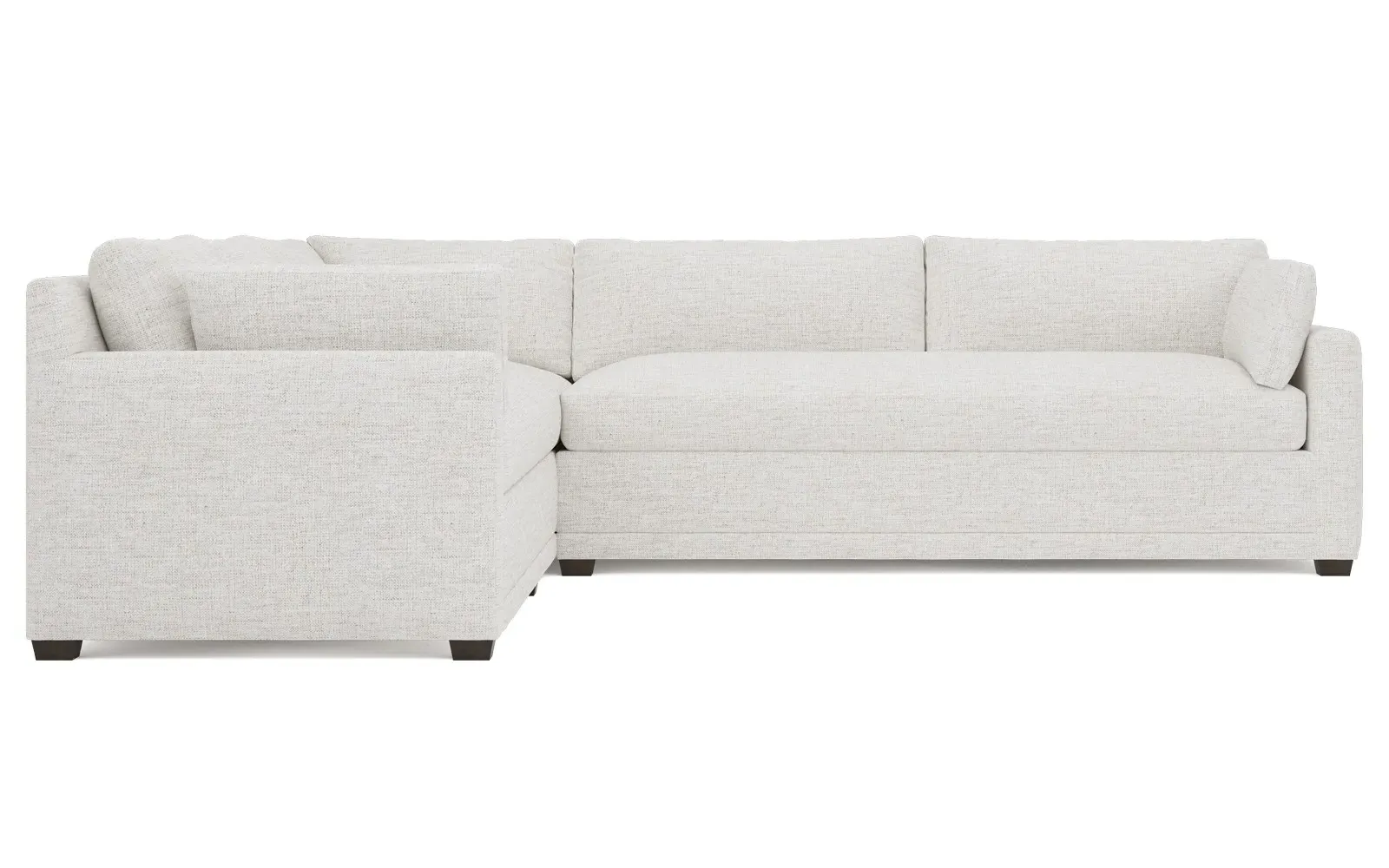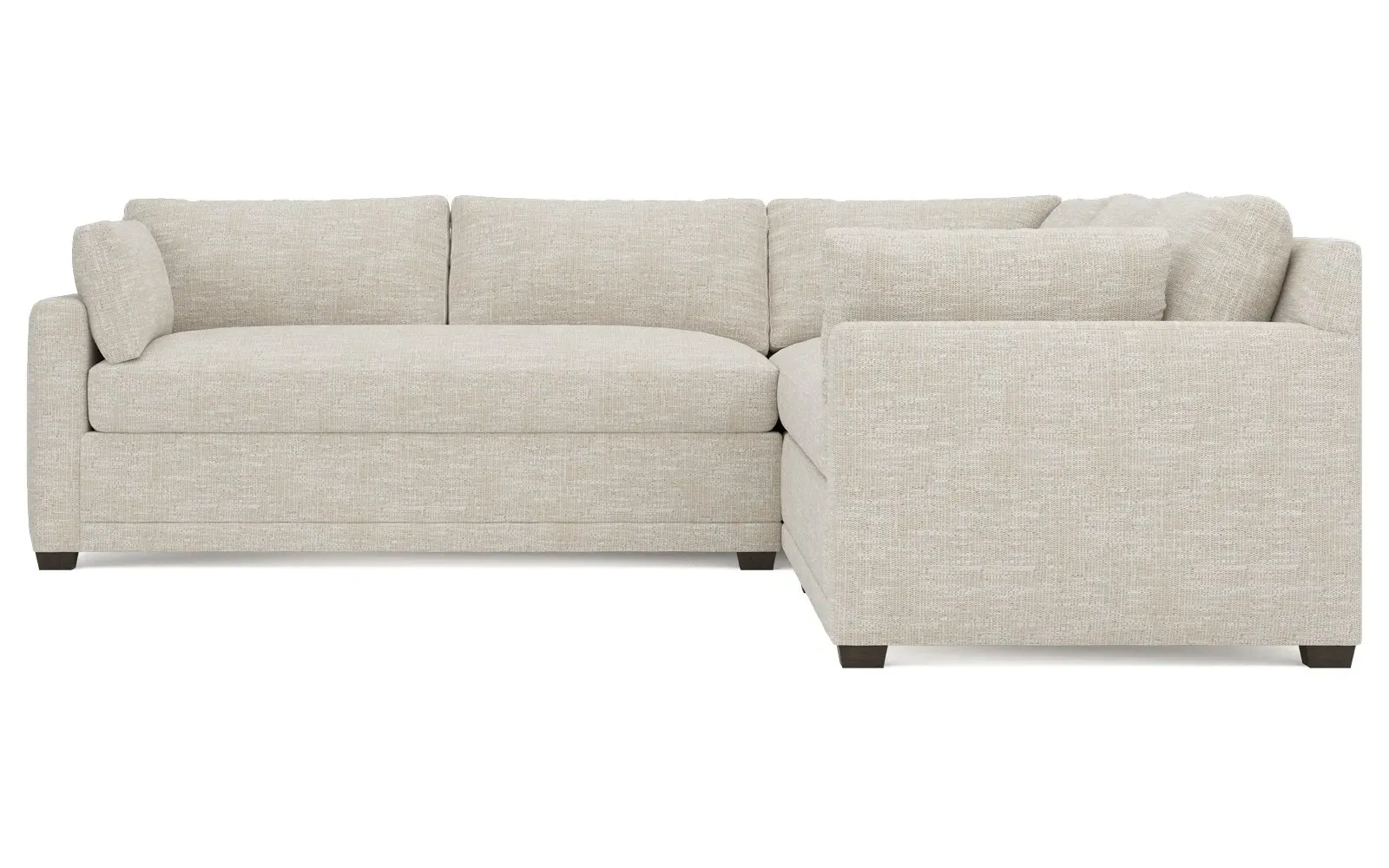 The Weybridge corner sectional offers generous seating with its plush box cushions and streamlined track arms. Its foam core surrounded by fiber, down, and feather fill provides cloud-like comfort, while the long bench seat ensures uninterrupted relaxation. The tapered wood legs with espresso finish add stability and visual appeal. W279 x D295 x H89 cm.