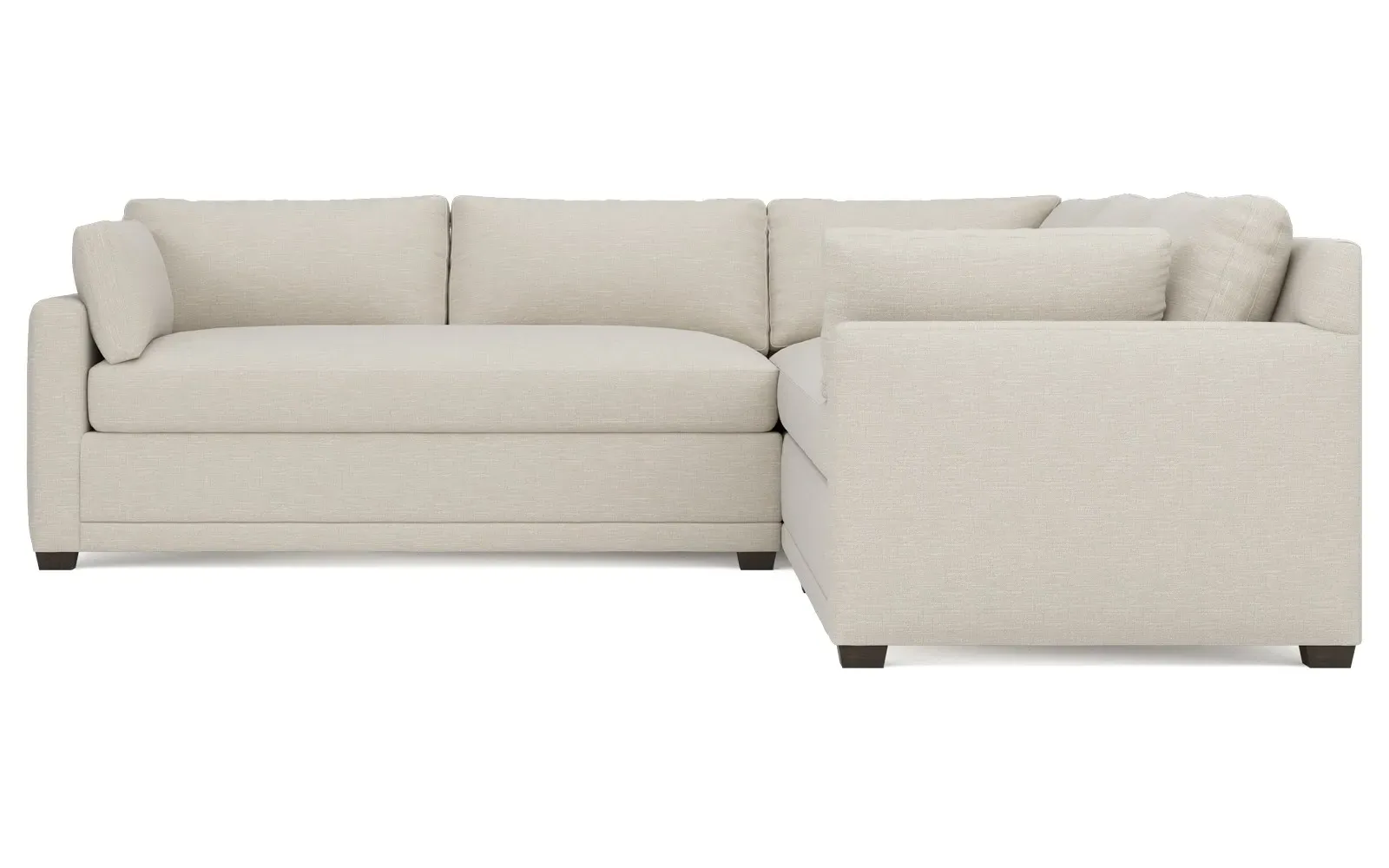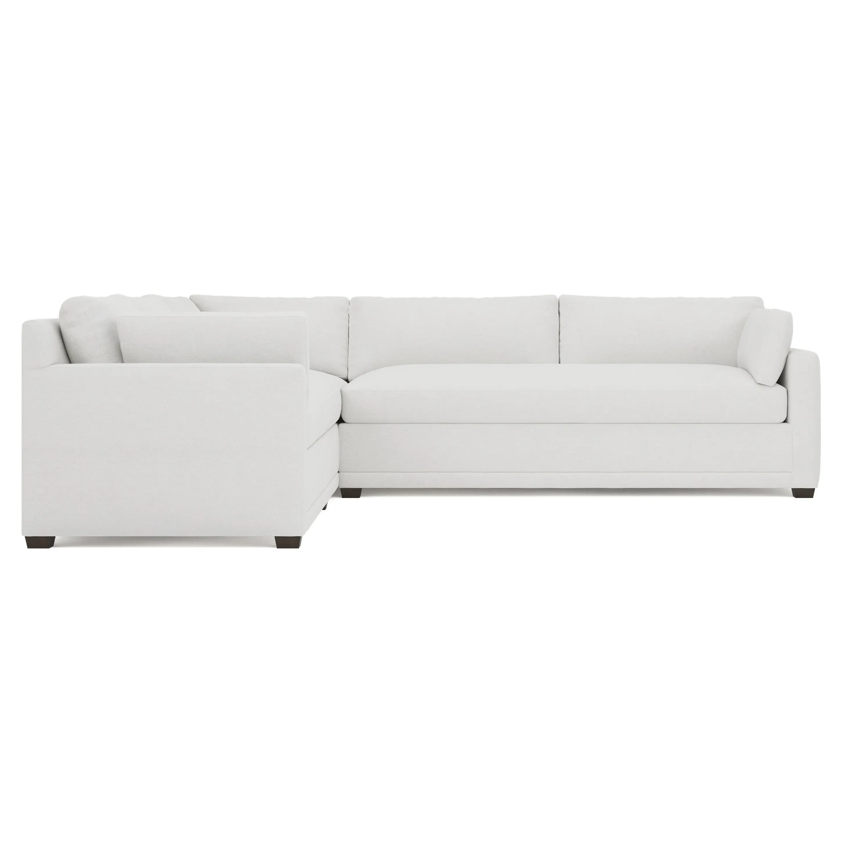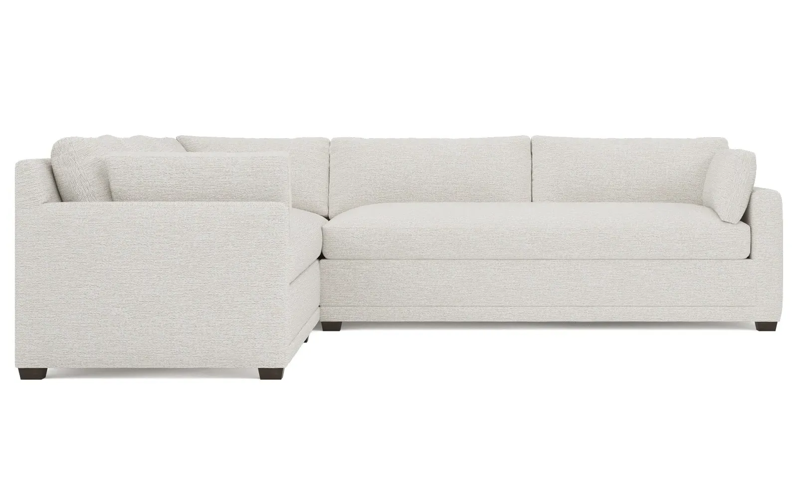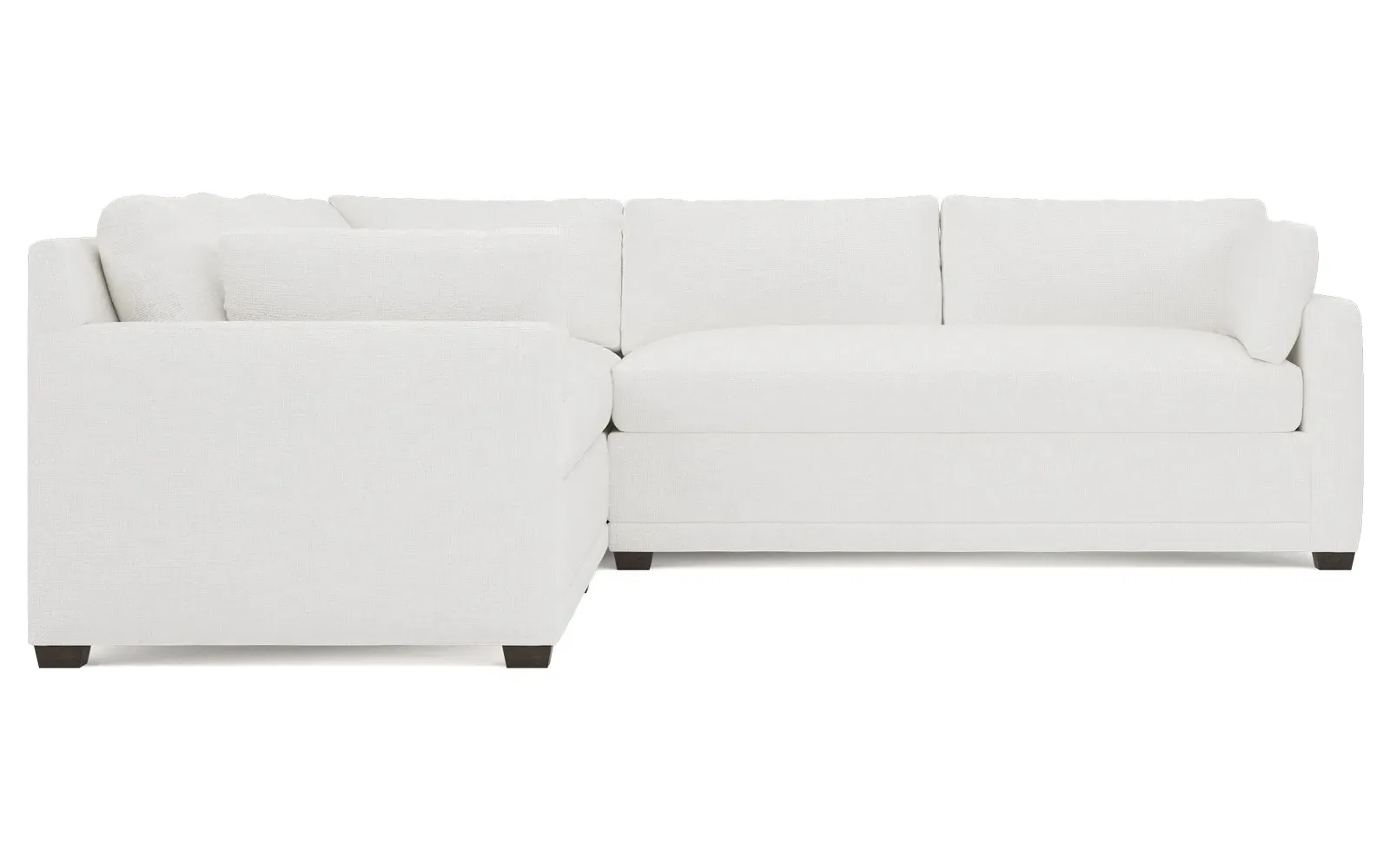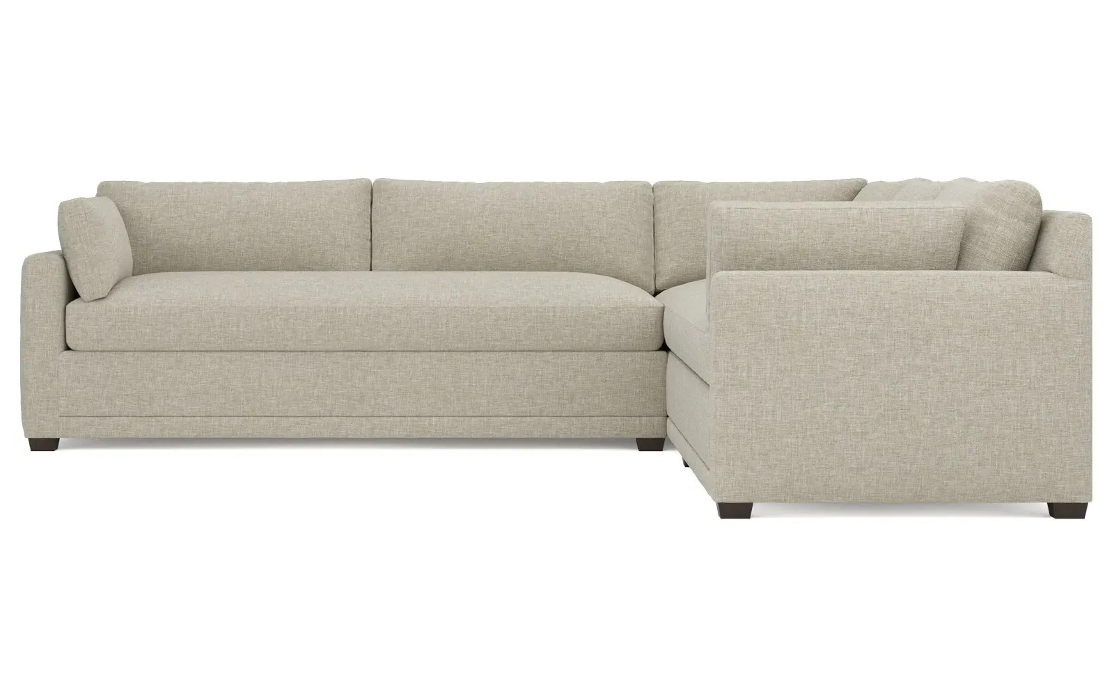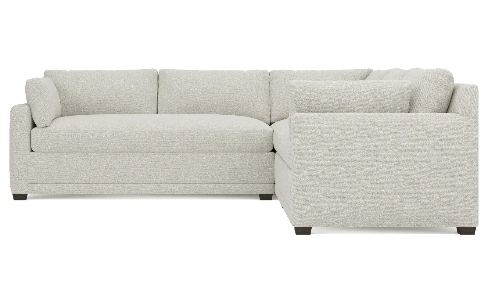 The Weybridge corner sectional offers generous seating with its plush box cushions and streamlined track arms. Its foam core surrounded by fiber, down, and feather fill provides cloud-like comfort, while the long bench seat ensures uninterrupted relaxation. The tapered wood legs with espresso finish add stability and visual appeal. W279 x D295 x H89 cm.