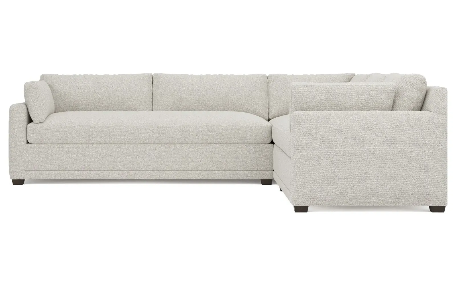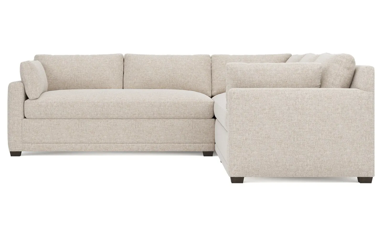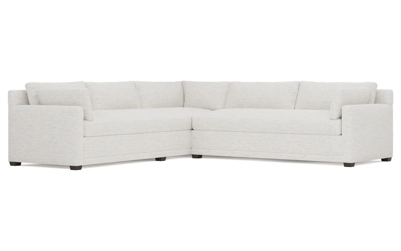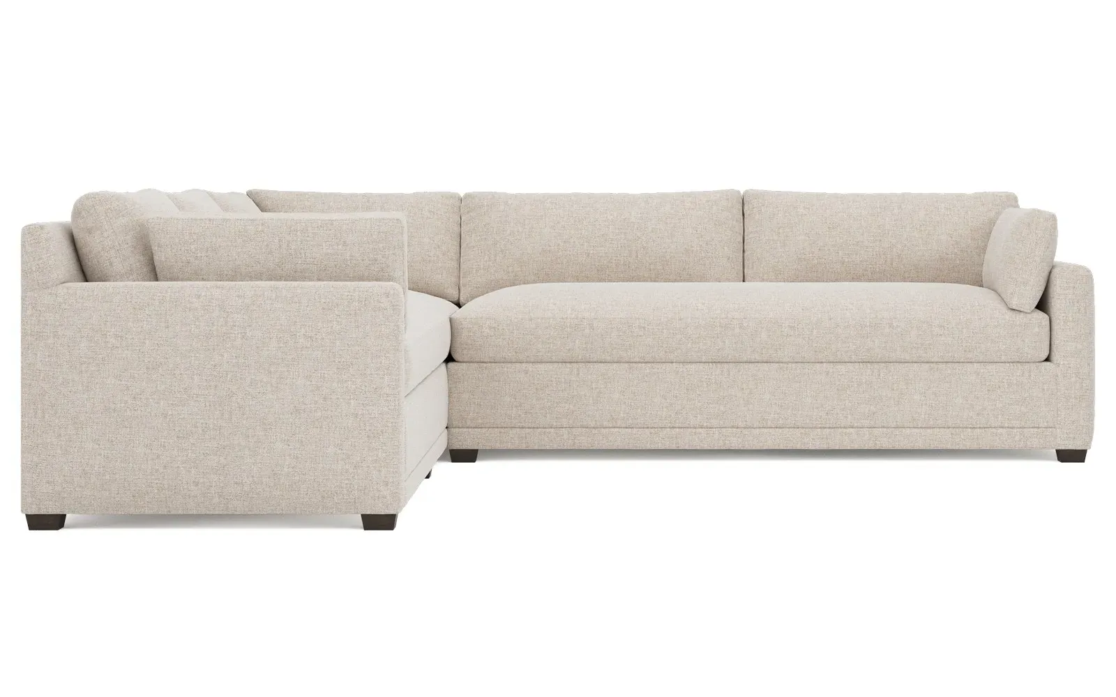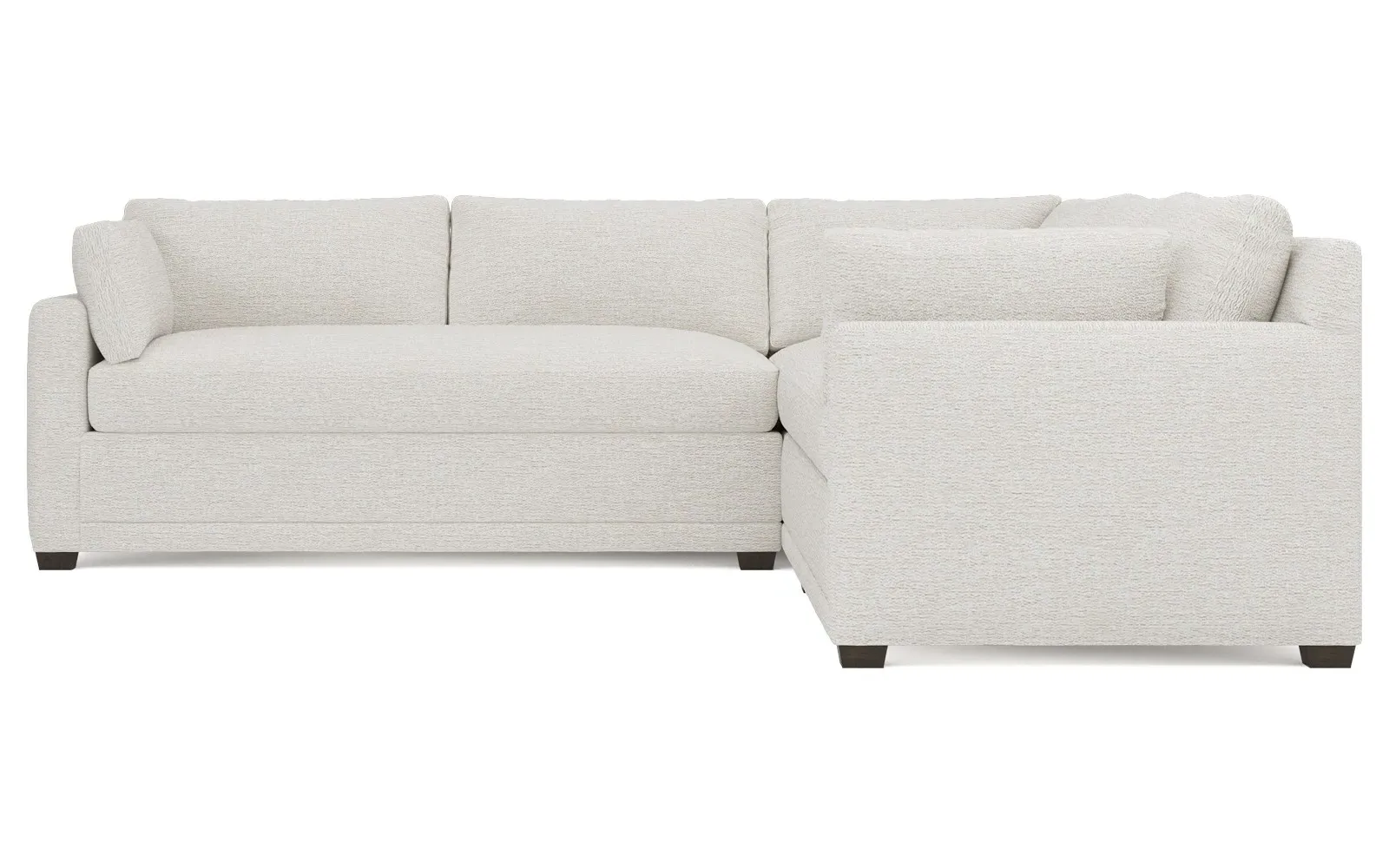The Weybridge corner sectional offers generous seating with its plush box cushions and streamlined track arms. Its foam core surrounded by fiber, down, and feather fill provides cloud-like comfort, while the long bench seat ensures uninterrupted relaxation. The tapered wood legs with espresso finish add stability and visual appeal. W279 x D295 x H89 cm.