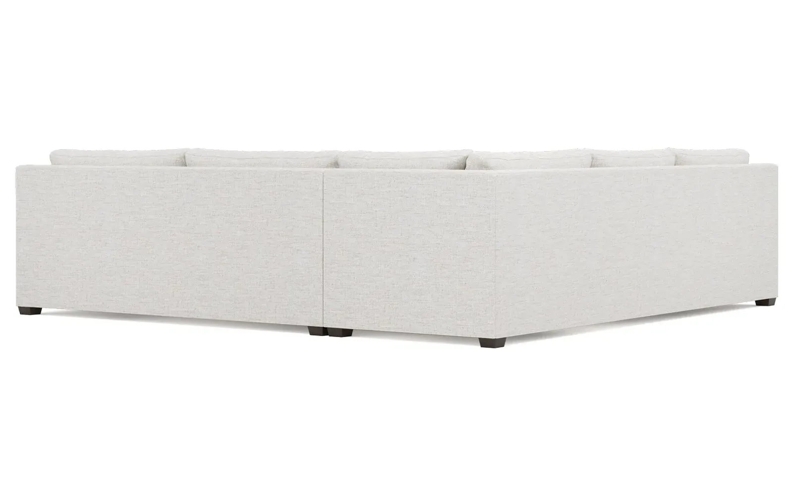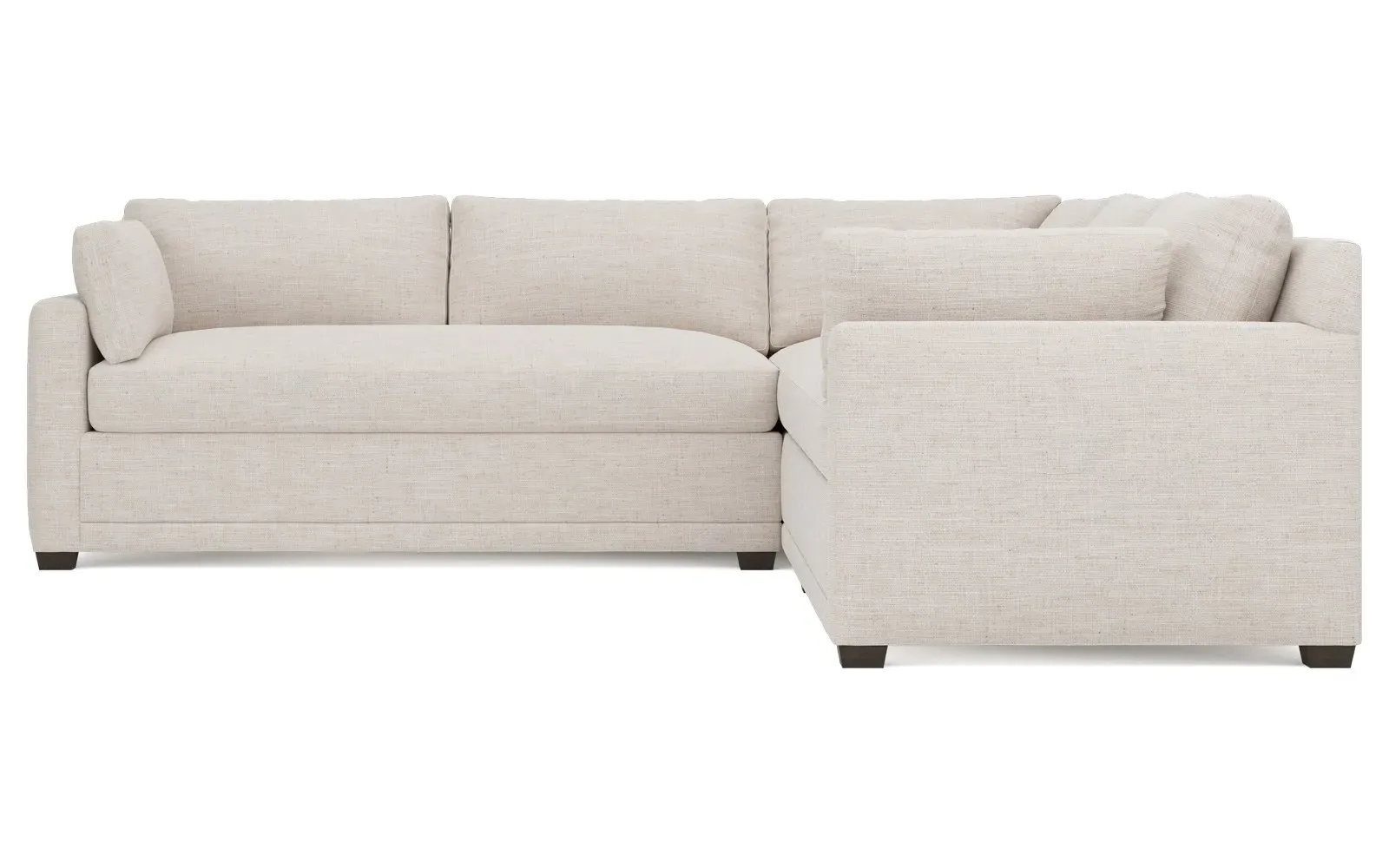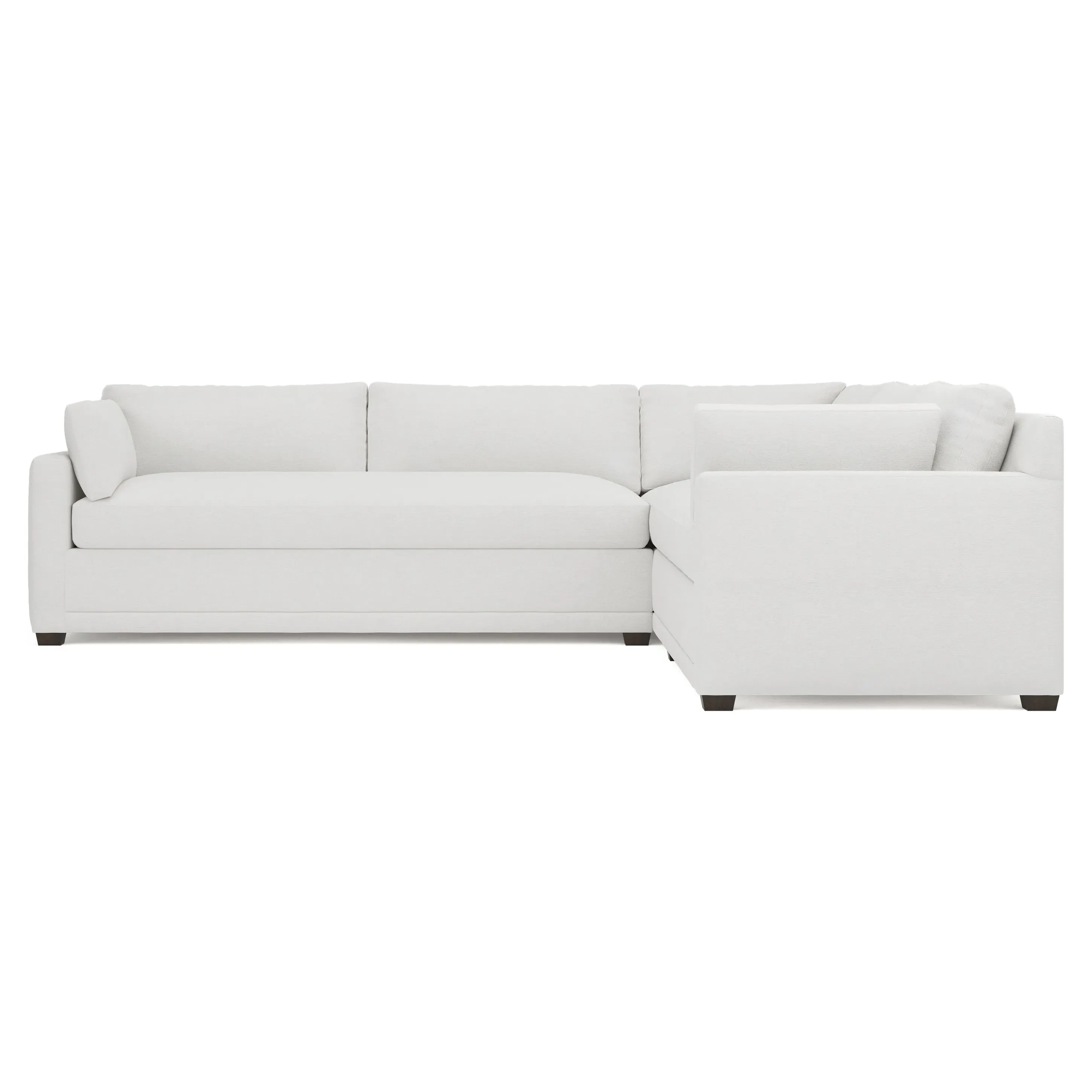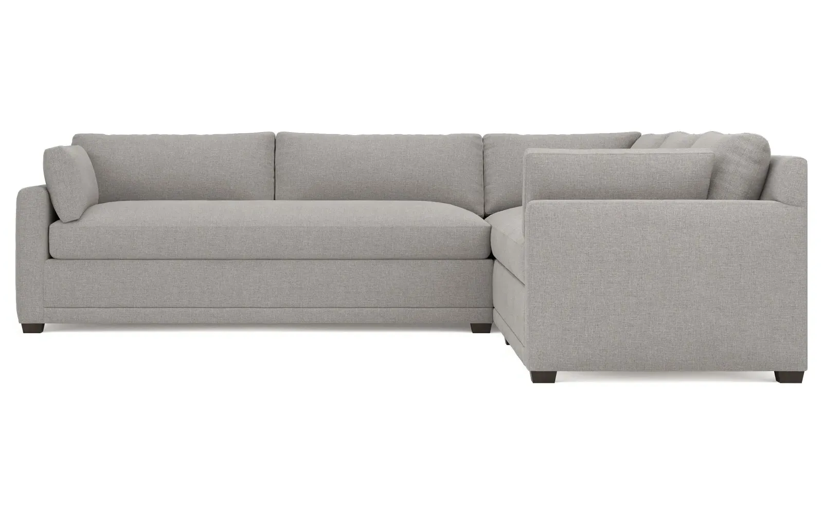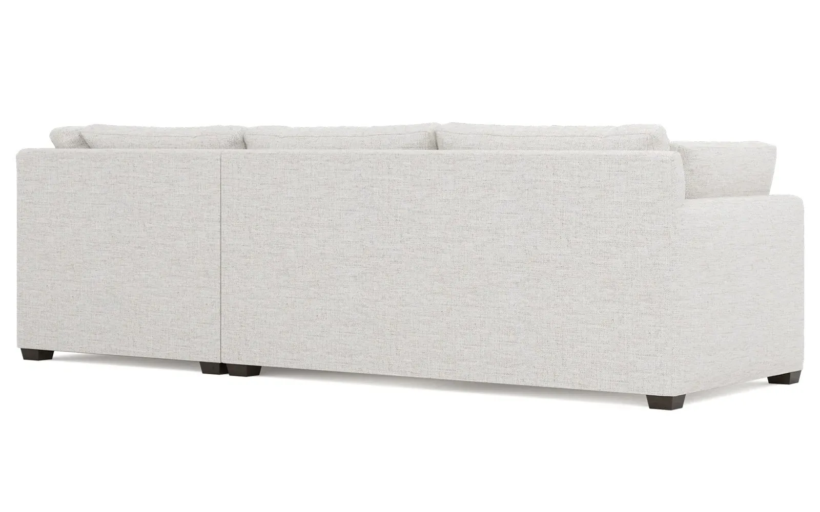 The Weybridge corner sectional offers generous seating with its plush box cushions and streamlined track arms. Its foam core surrounded by fiber, down, and feather fill provides cloud-like comfort, while the long bench seat ensures uninterrupted relaxation. The tapered wood legs with espresso finish add stability and visual appeal. W279 x D295 x H89 cm.