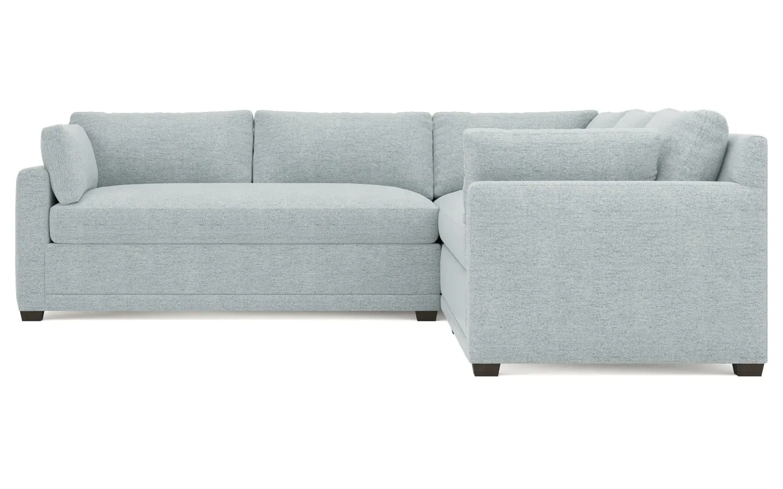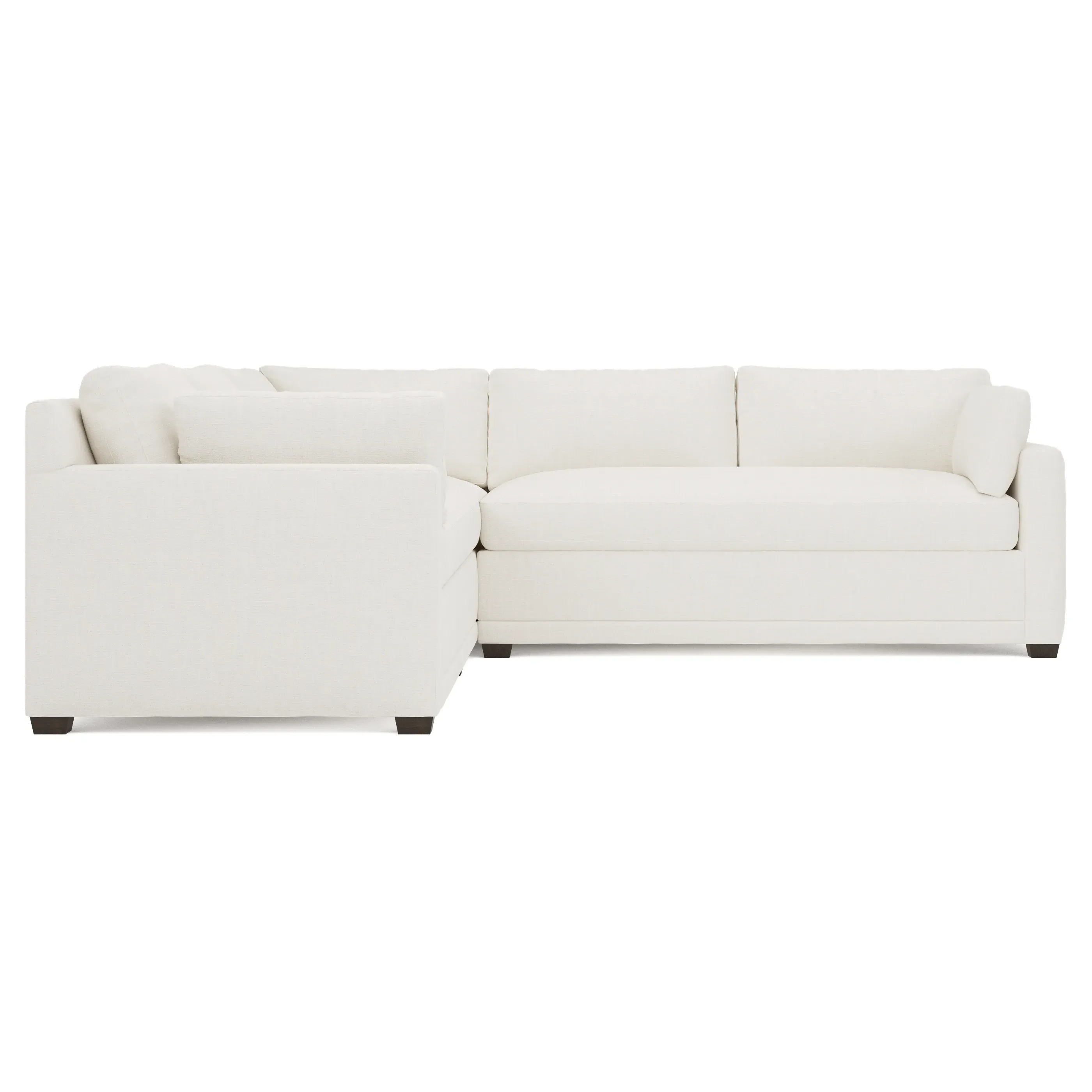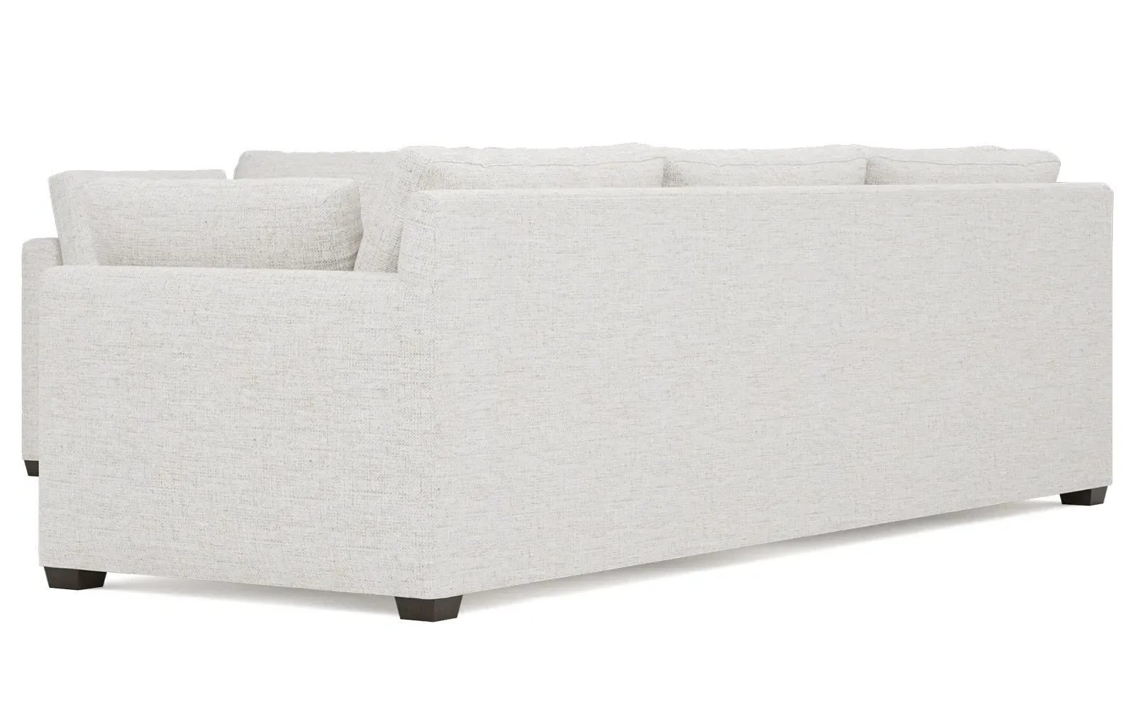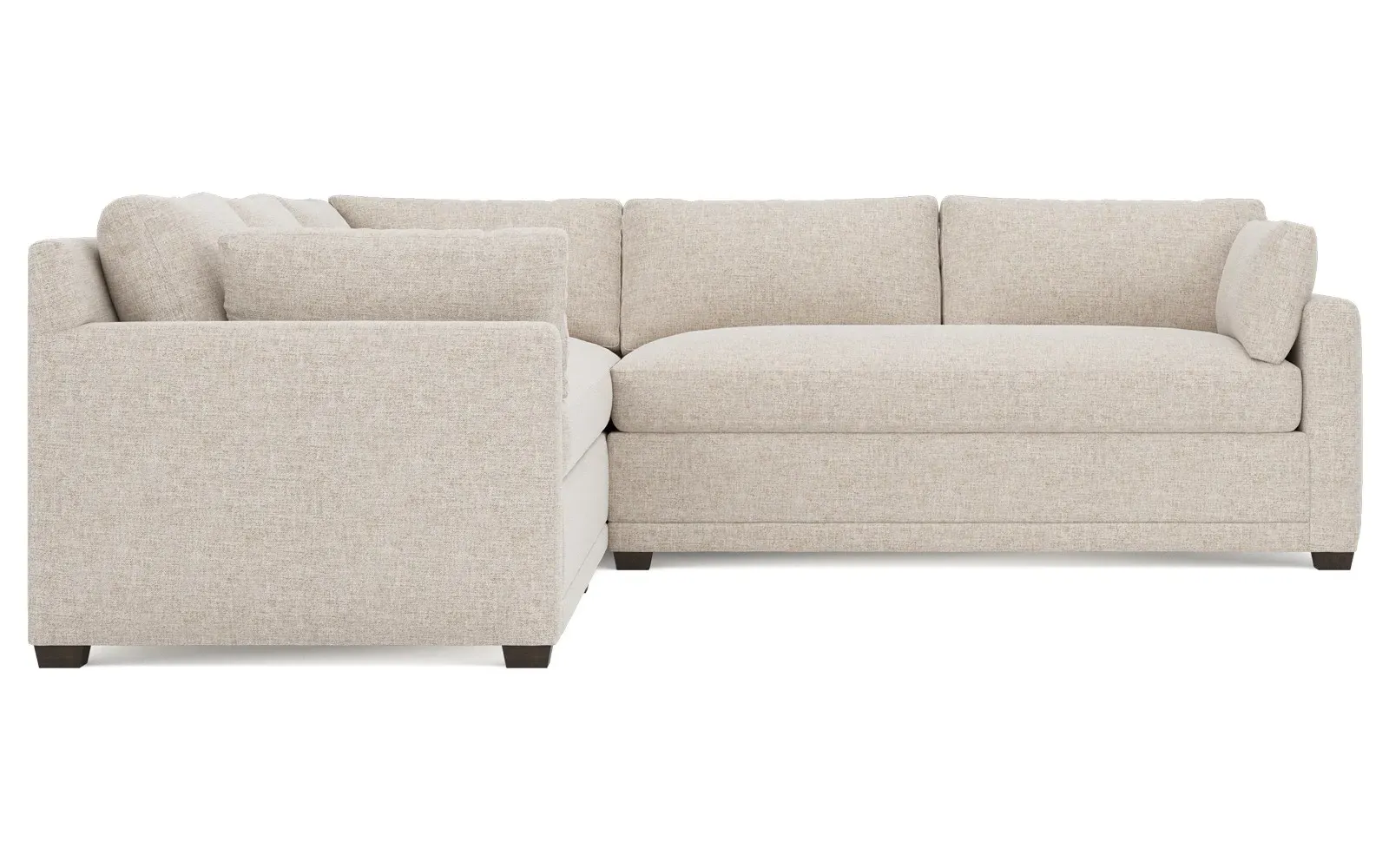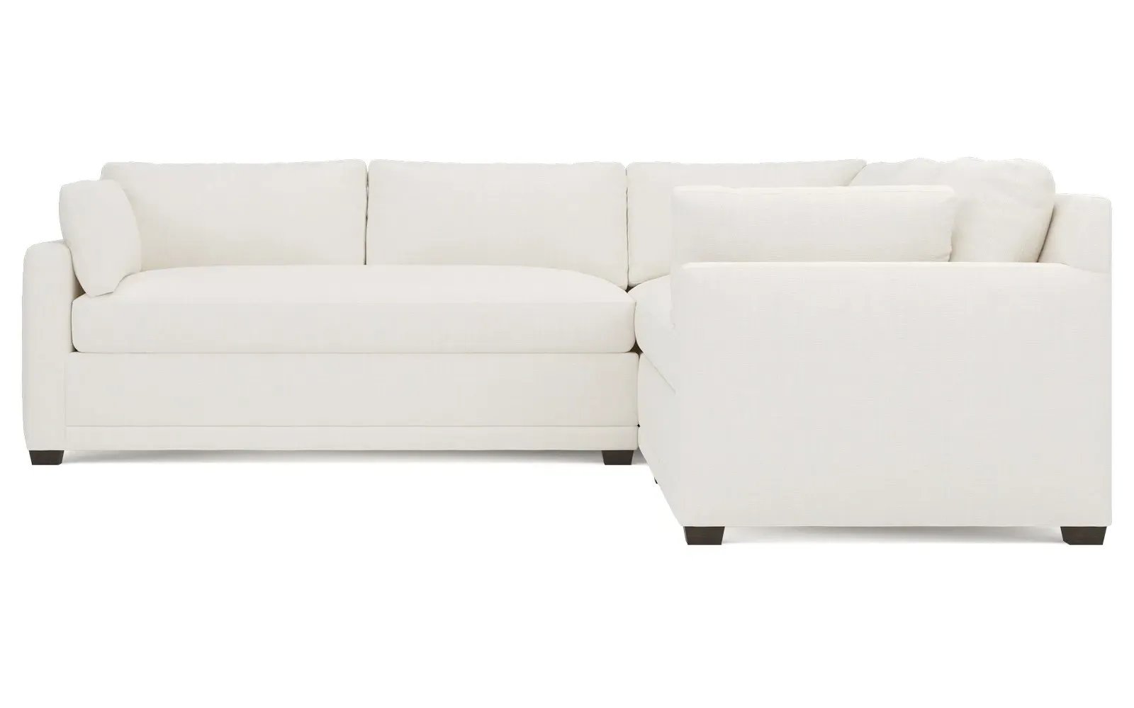 The Weybridge corner sectional offers generous seating with its plush box cushions and streamlined track arms. Its foam core surrounded by fiber, down, and feather fill provides cloud-like comfort, while the long bench seat ensures uninterrupted relaxation. The tapered wood legs with espresso finish add stability and visual appeal. W279 x D295 x H89 cm.