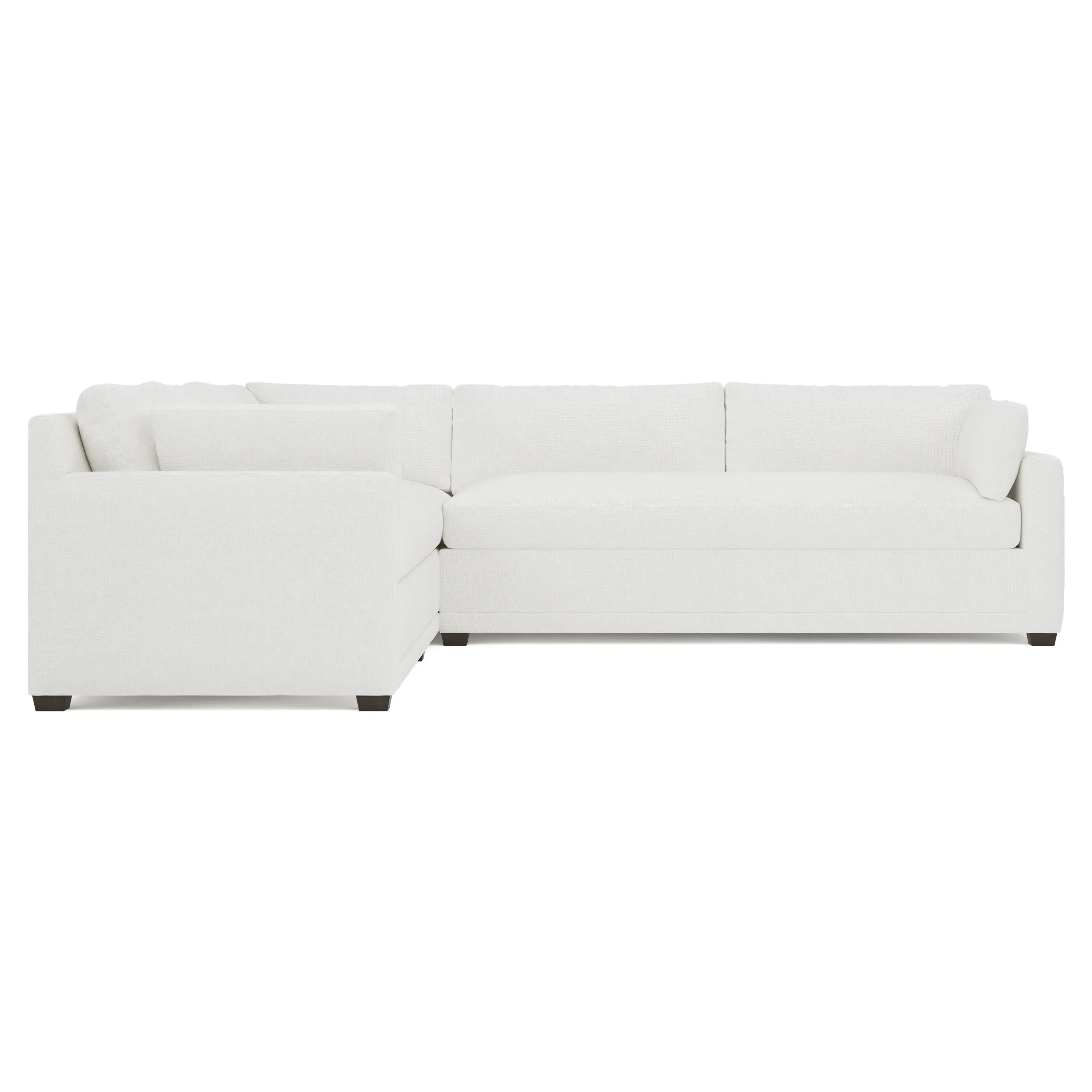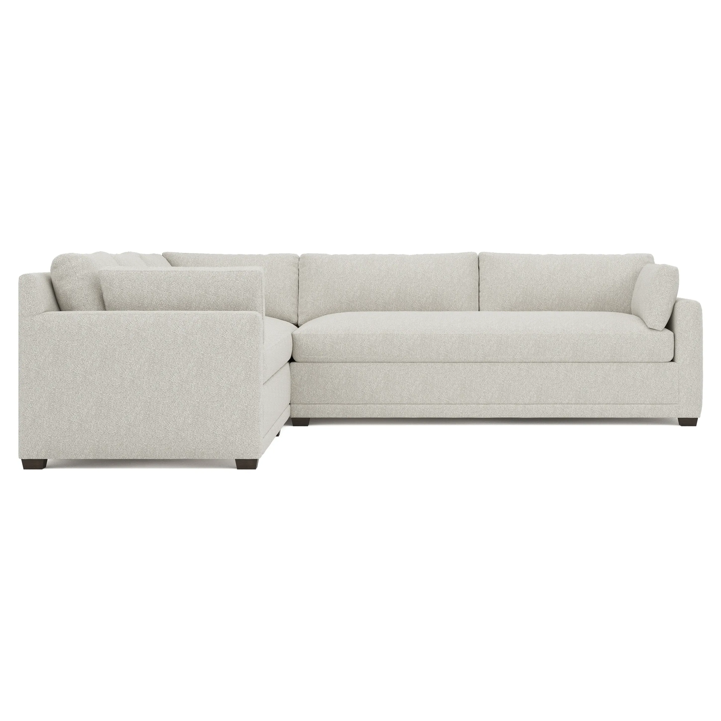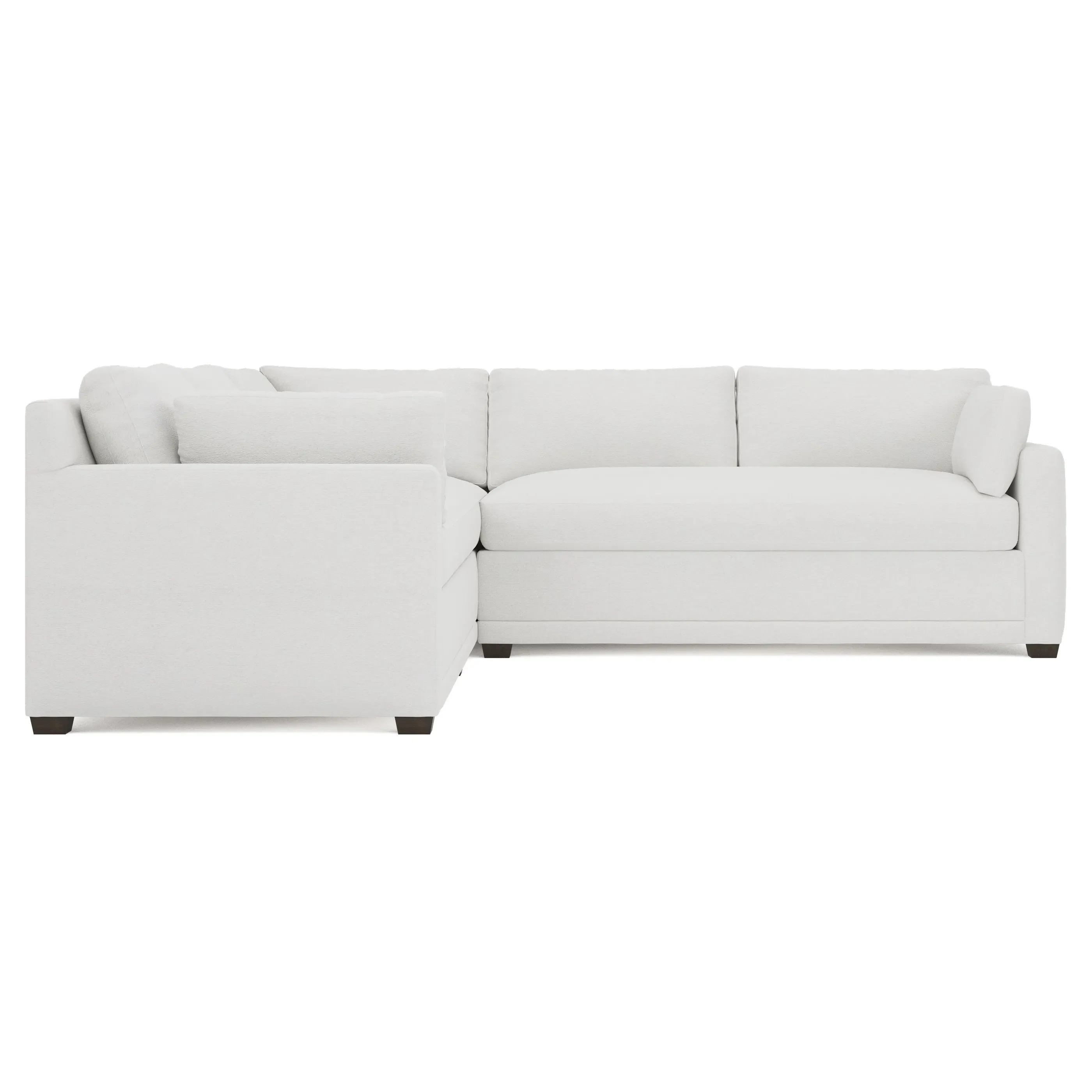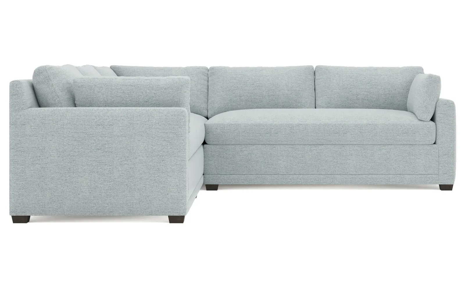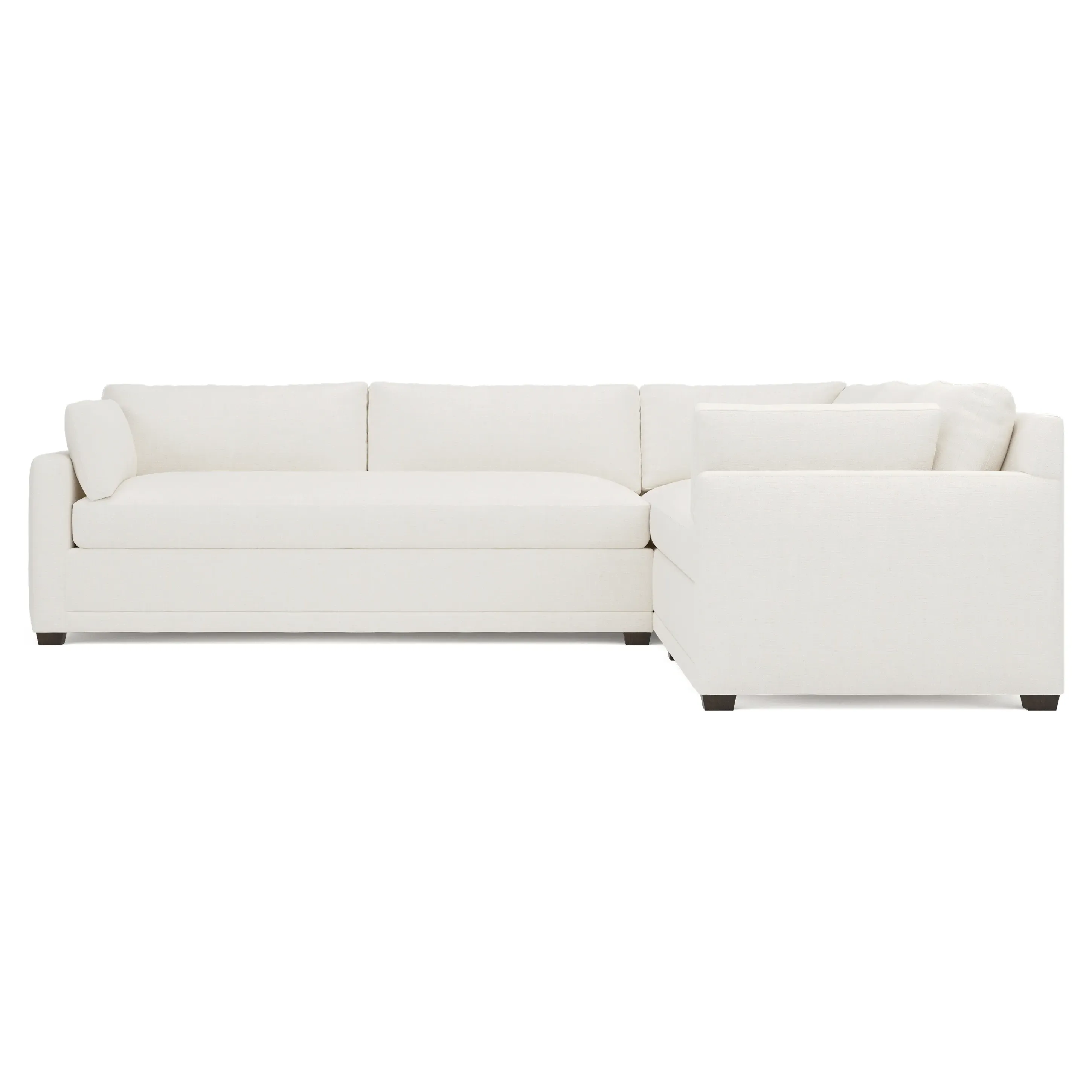 The Weybridge corner sectional offers generous seating with its plush box cushions and streamlined track arms. Its foam core surrounded by fiber, down, and feather fill provides cloud-like comfort, while the long bench seat ensures uninterrupted relaxation. The tapered wood legs with espresso finish add stability and visual appeal. W279 x D295 x H89 cm.
