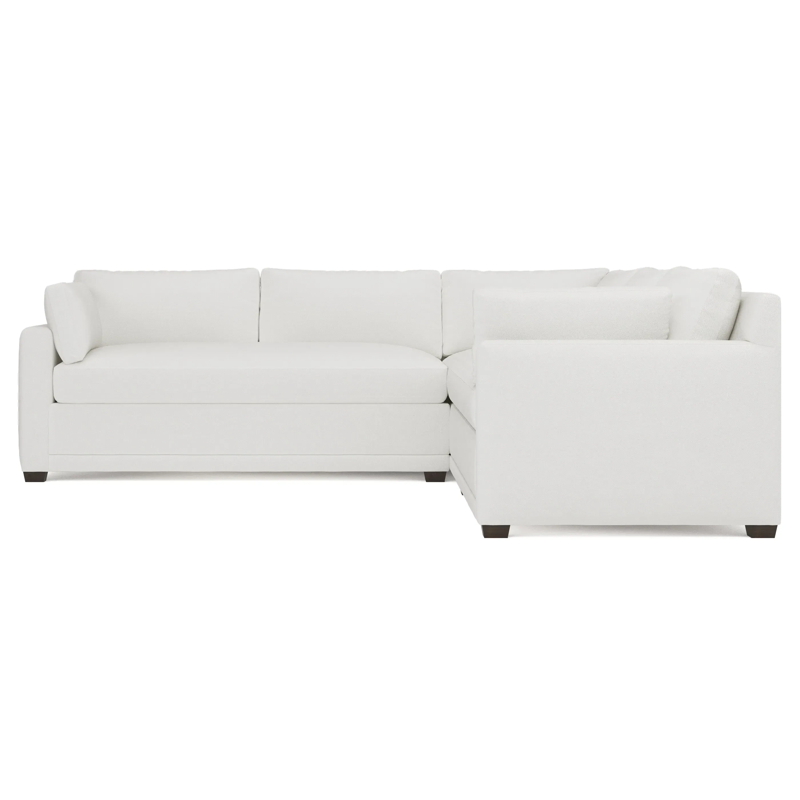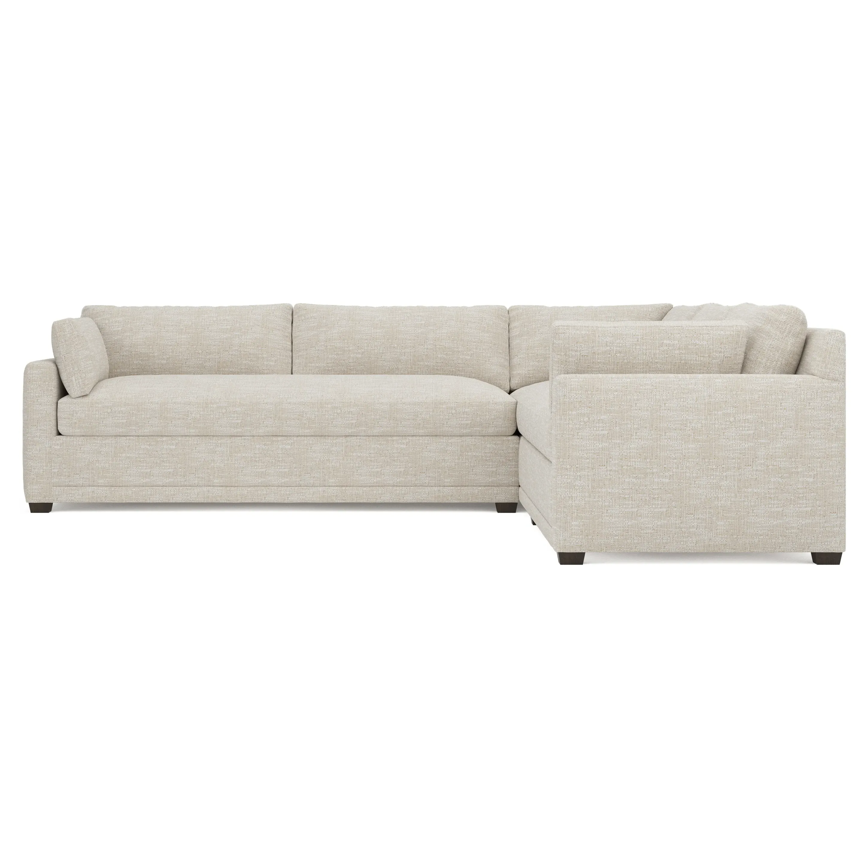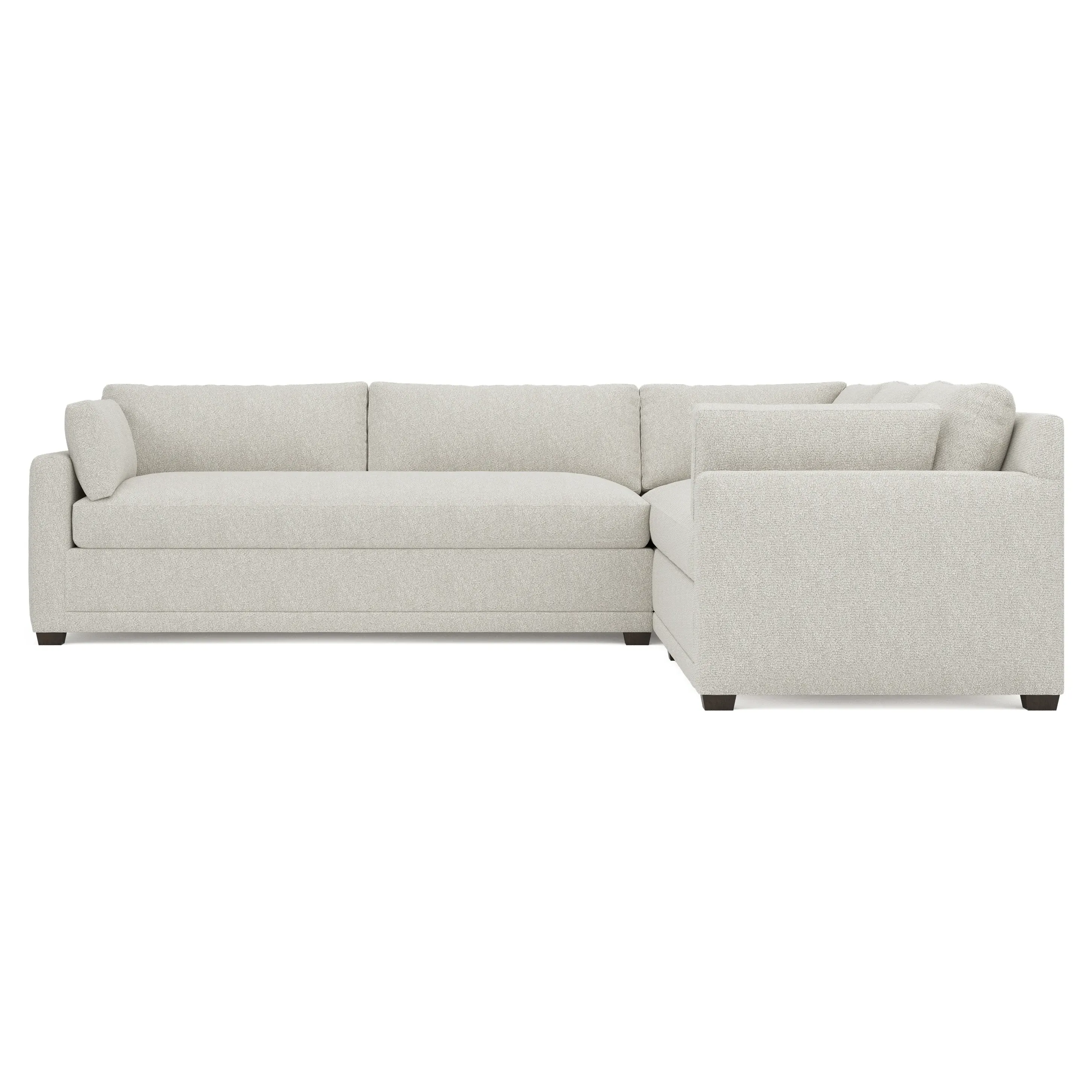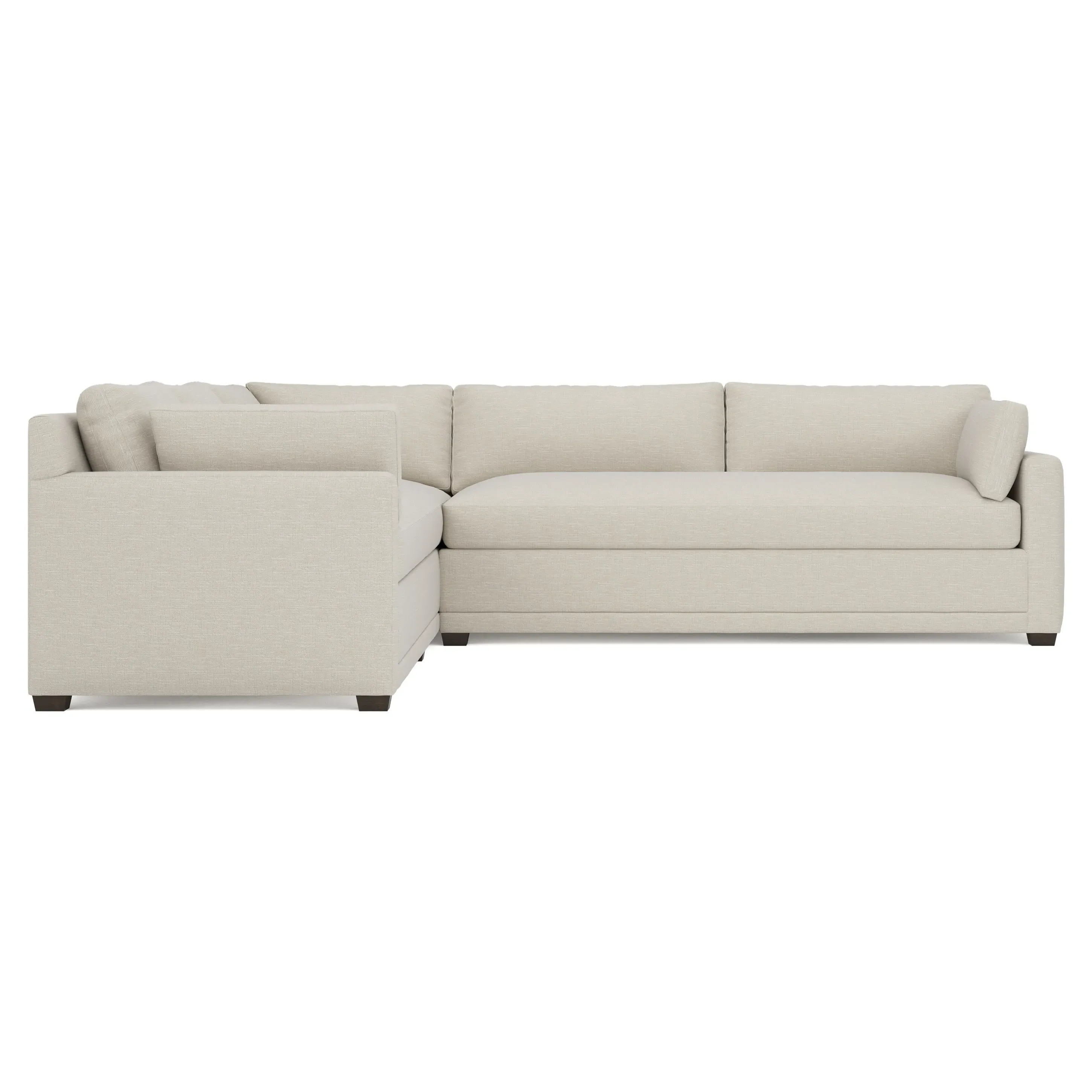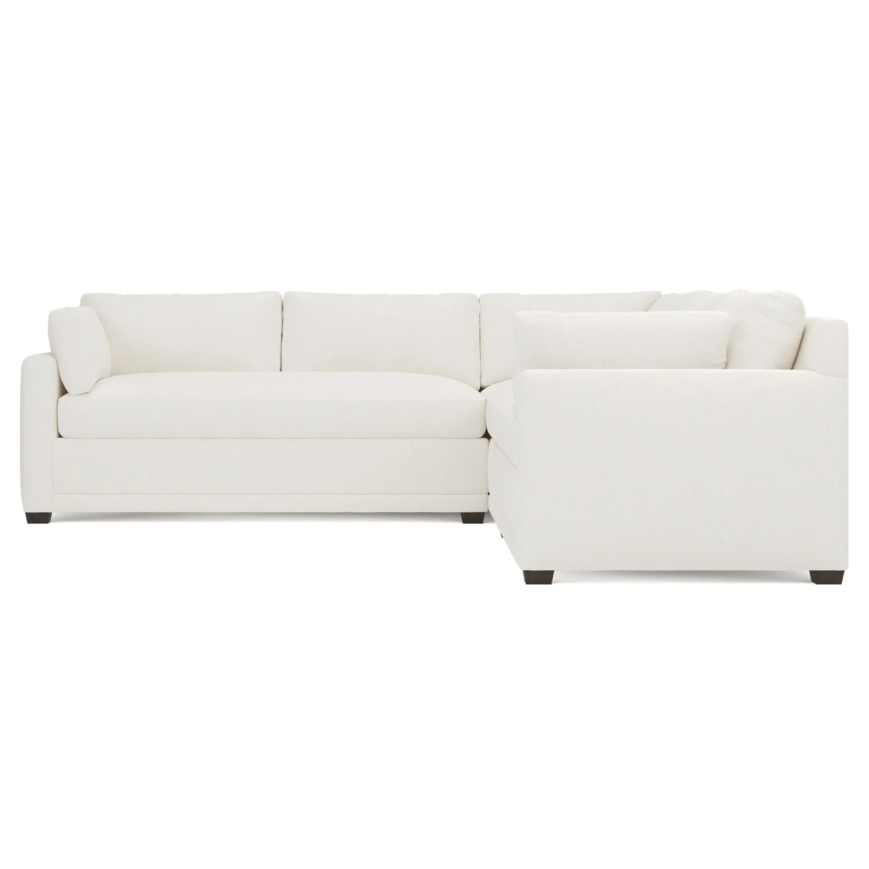 The Weybridge corner sectional offers generous seating with its plush box cushions and streamlined track arms. Its foam core surrounded by fiber, down, and feather fill provides cloud-like comfort, while the long bench seat ensures uninterrupted relaxation. The tapered wood legs with espresso finish add stability and visual appeal. W279 x D295 x H89 cm.