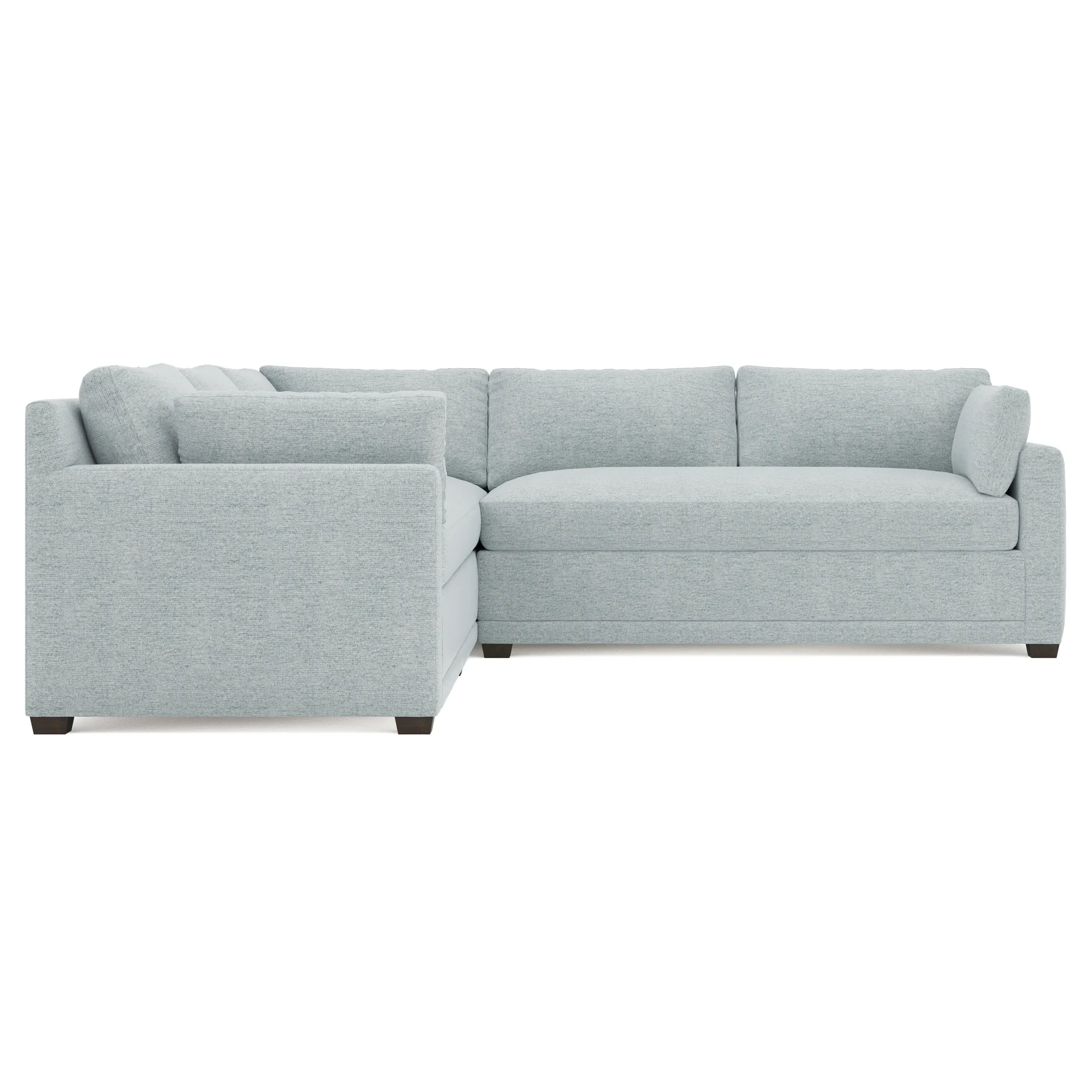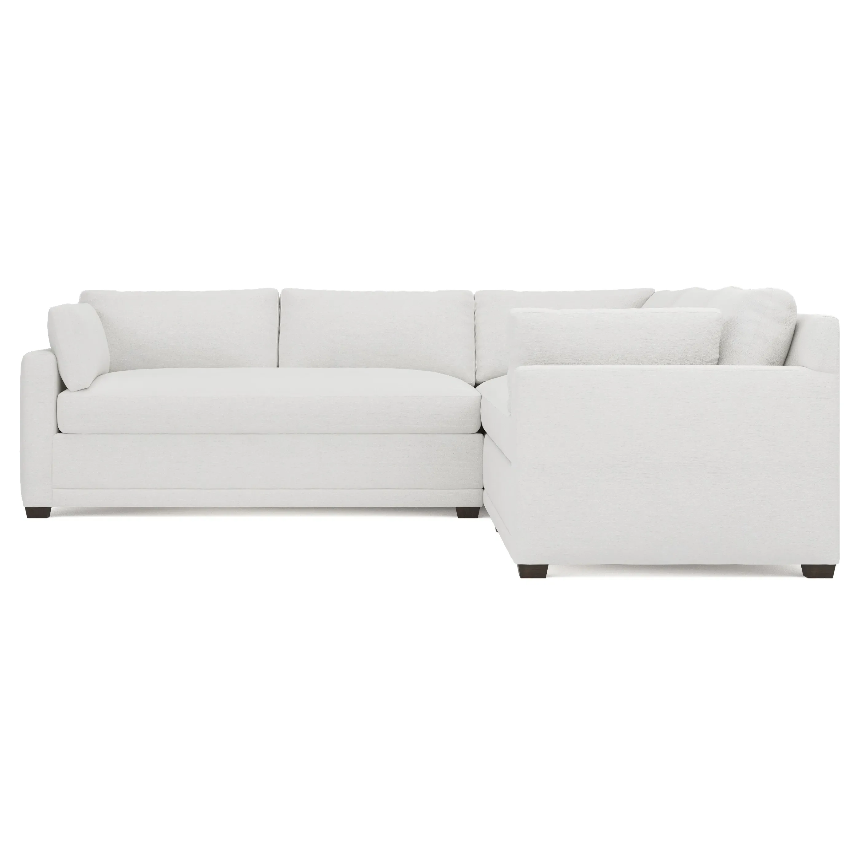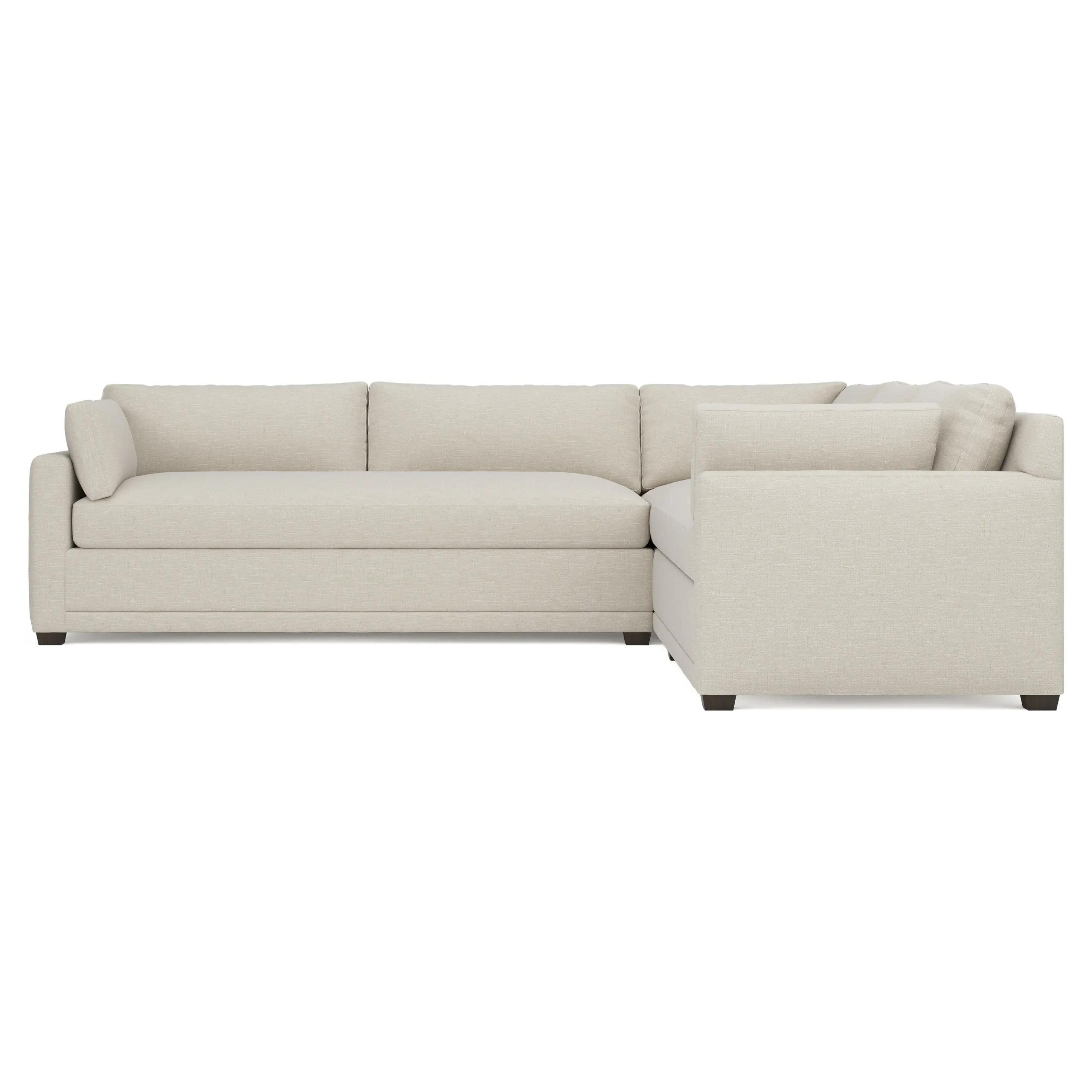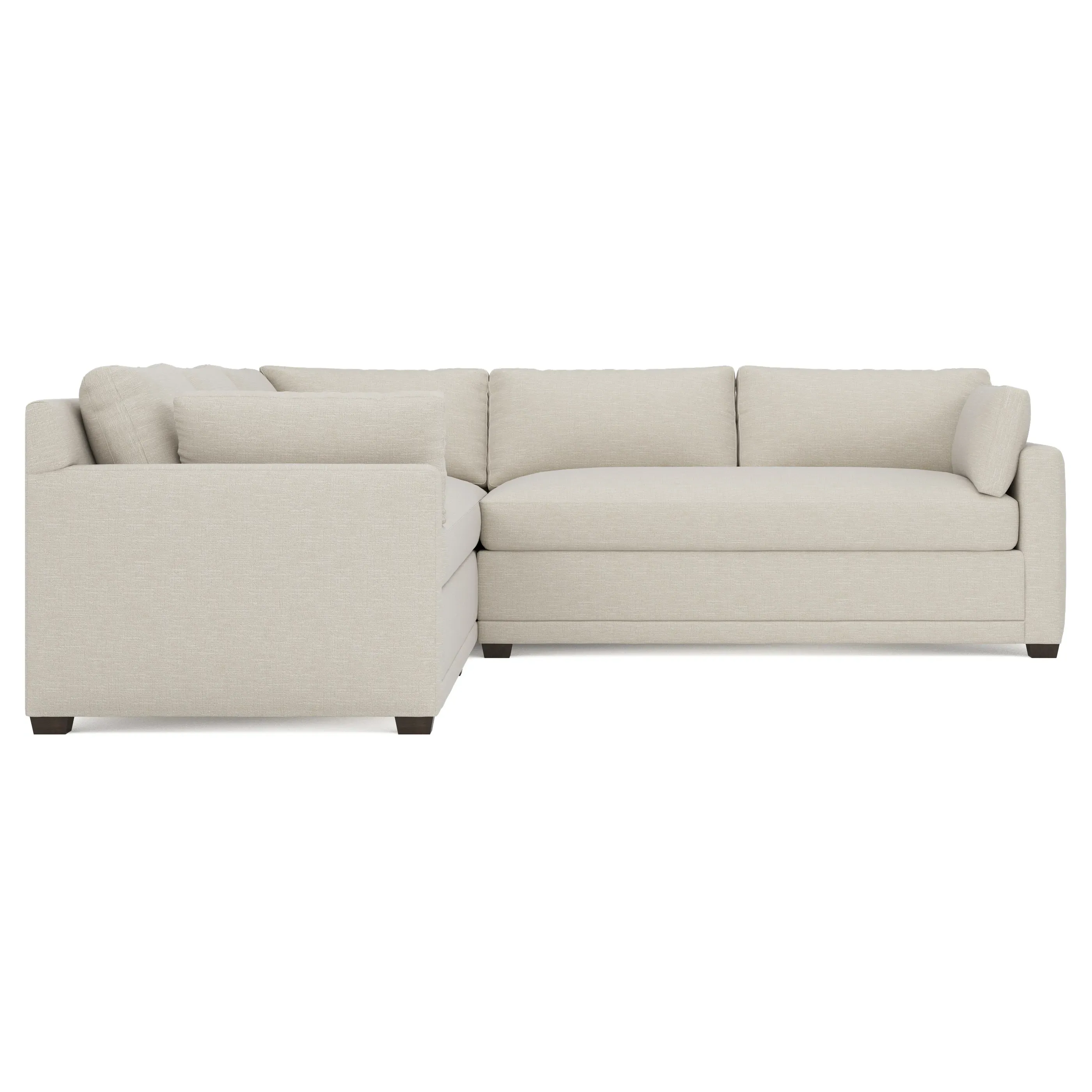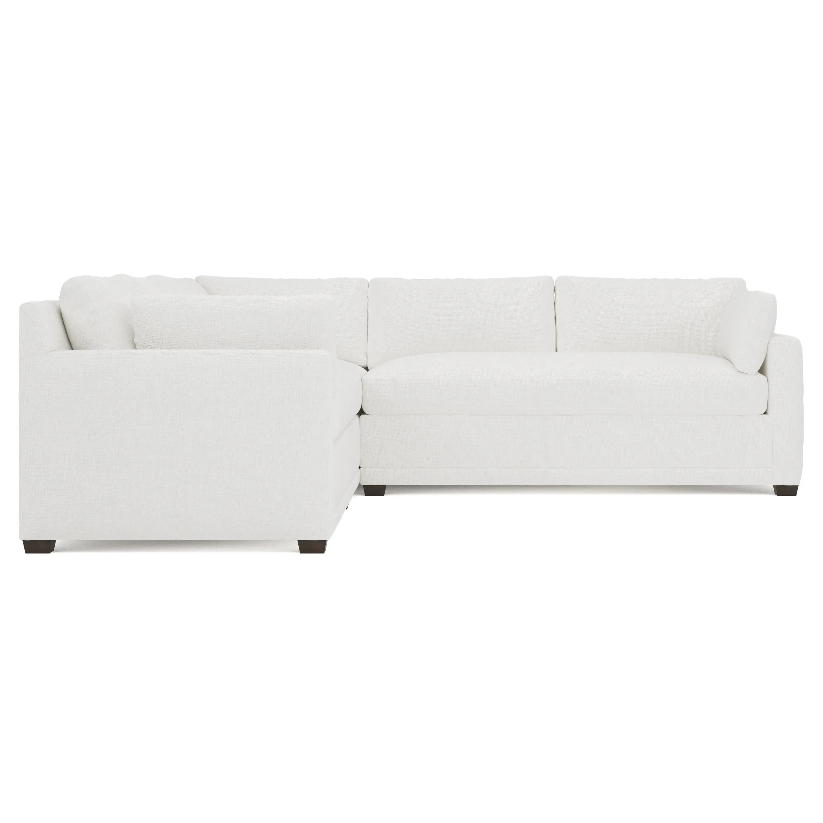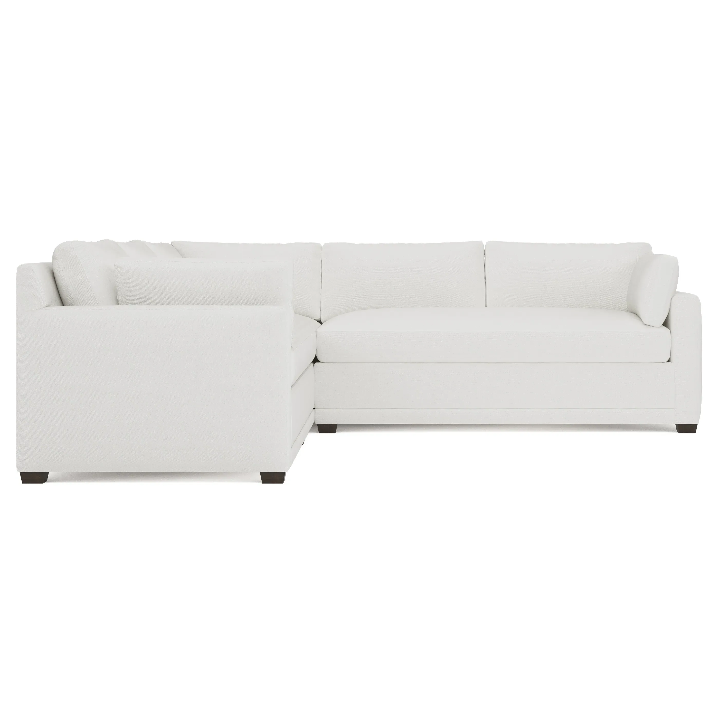The Weybridge corner sectional offers generous seating with its plush box cushions and streamlined track arms. Its foam core surrounded by fiber, down, and feather fill provides cloud-like comfort, while the long bench seat ensures uninterrupted relaxation. The tapered wood legs with espresso finish add stability and visual appeal. W279 x D295 x H89 cm.