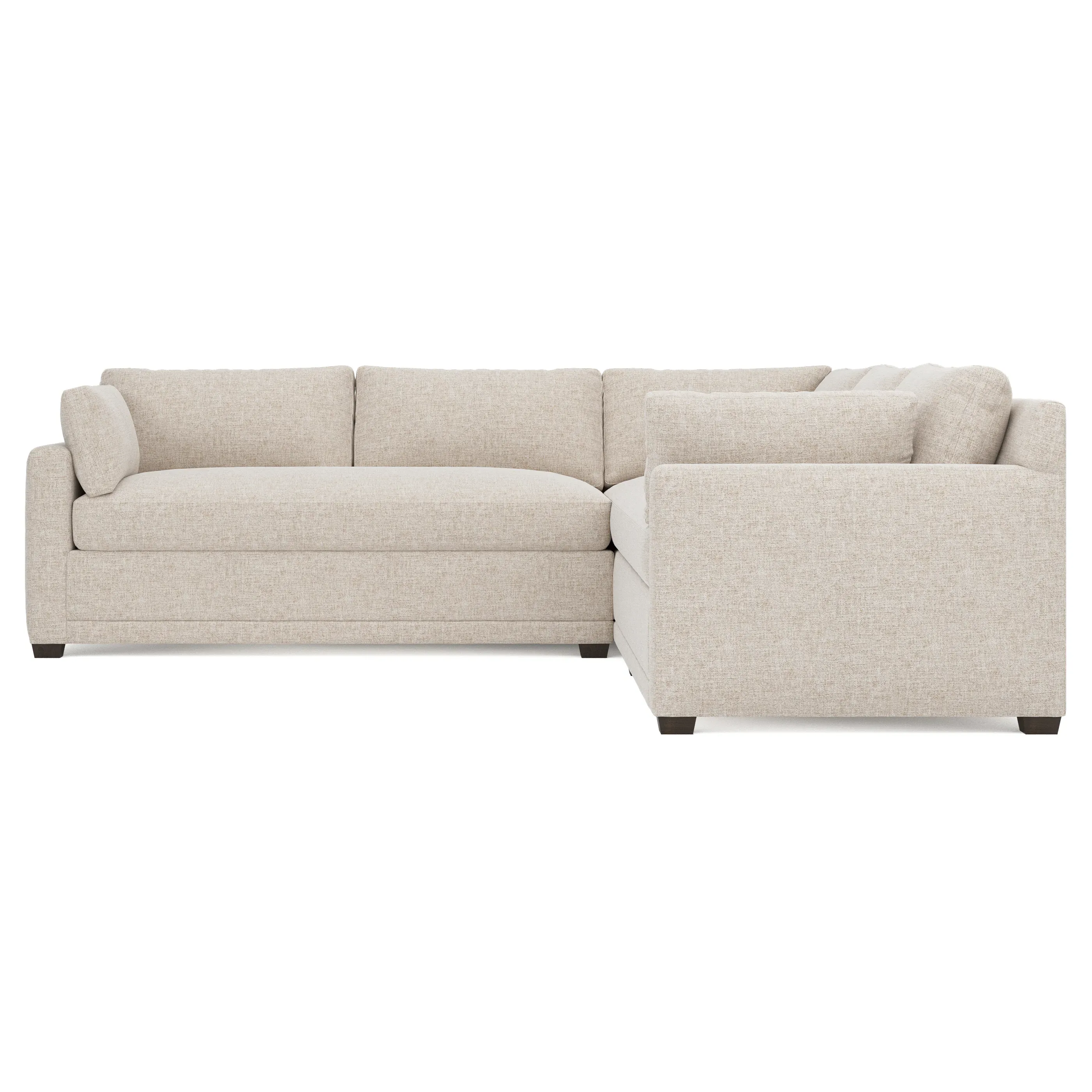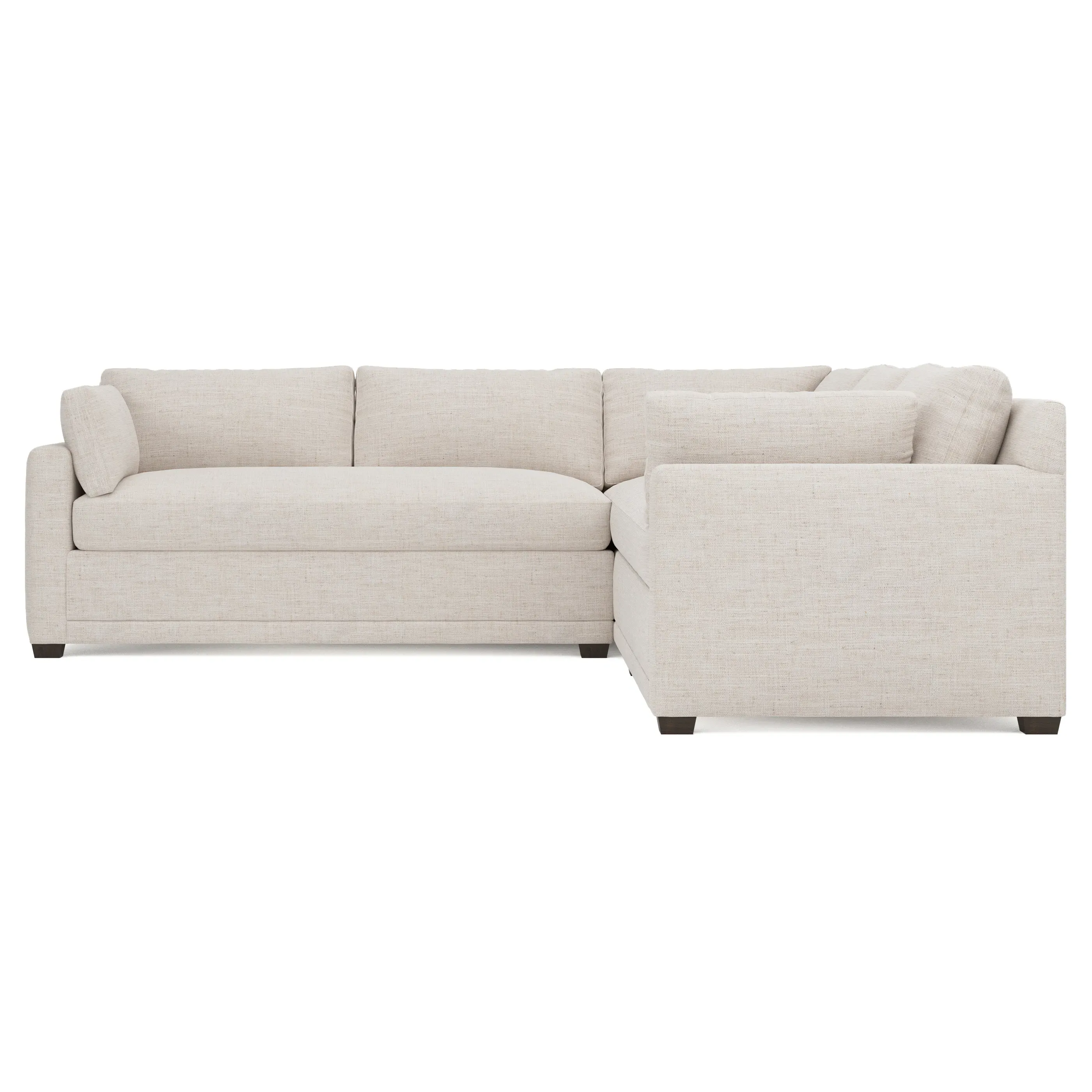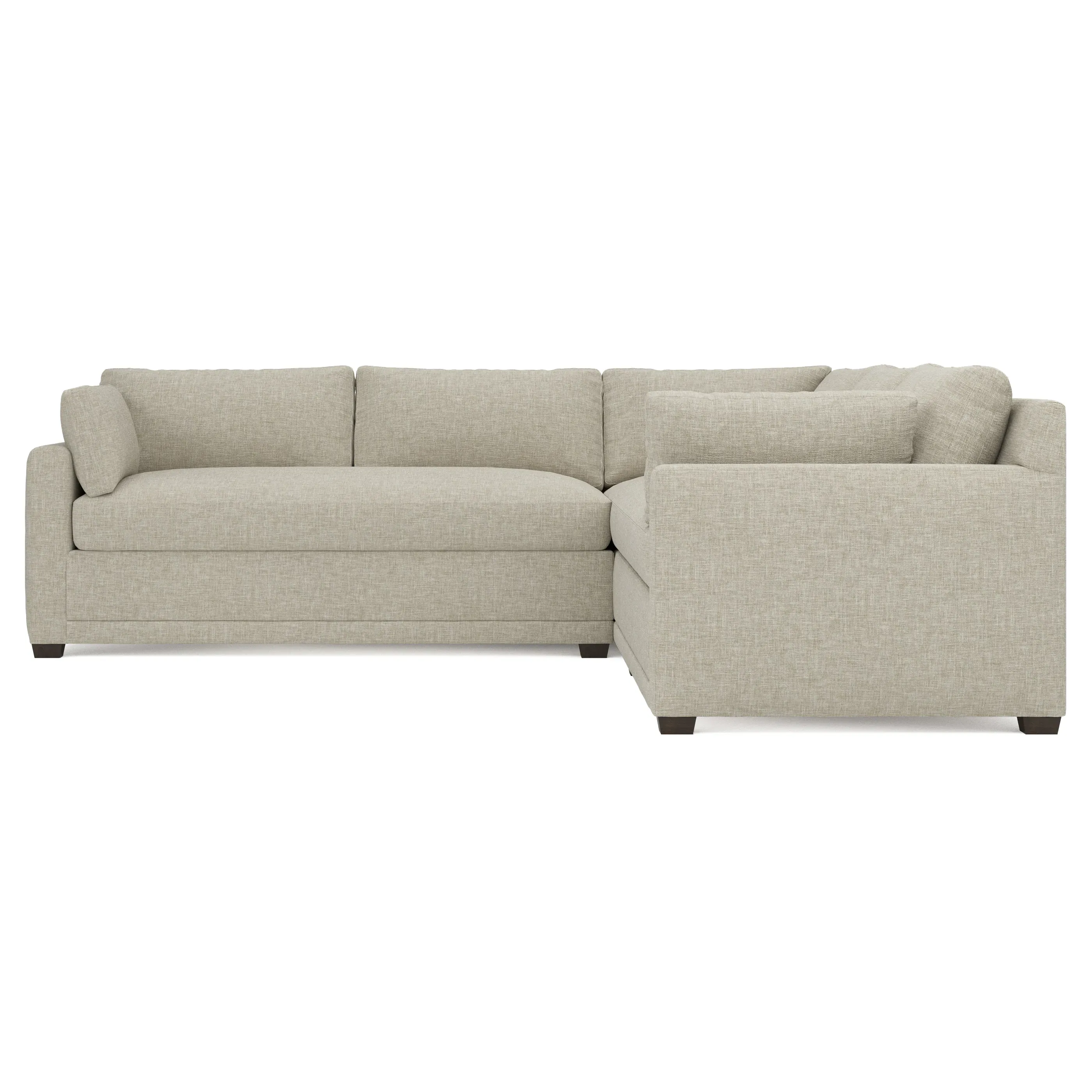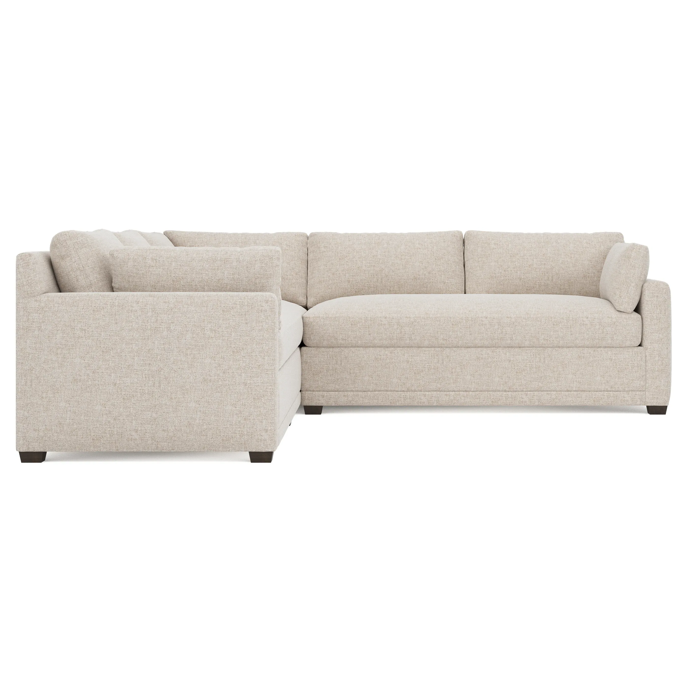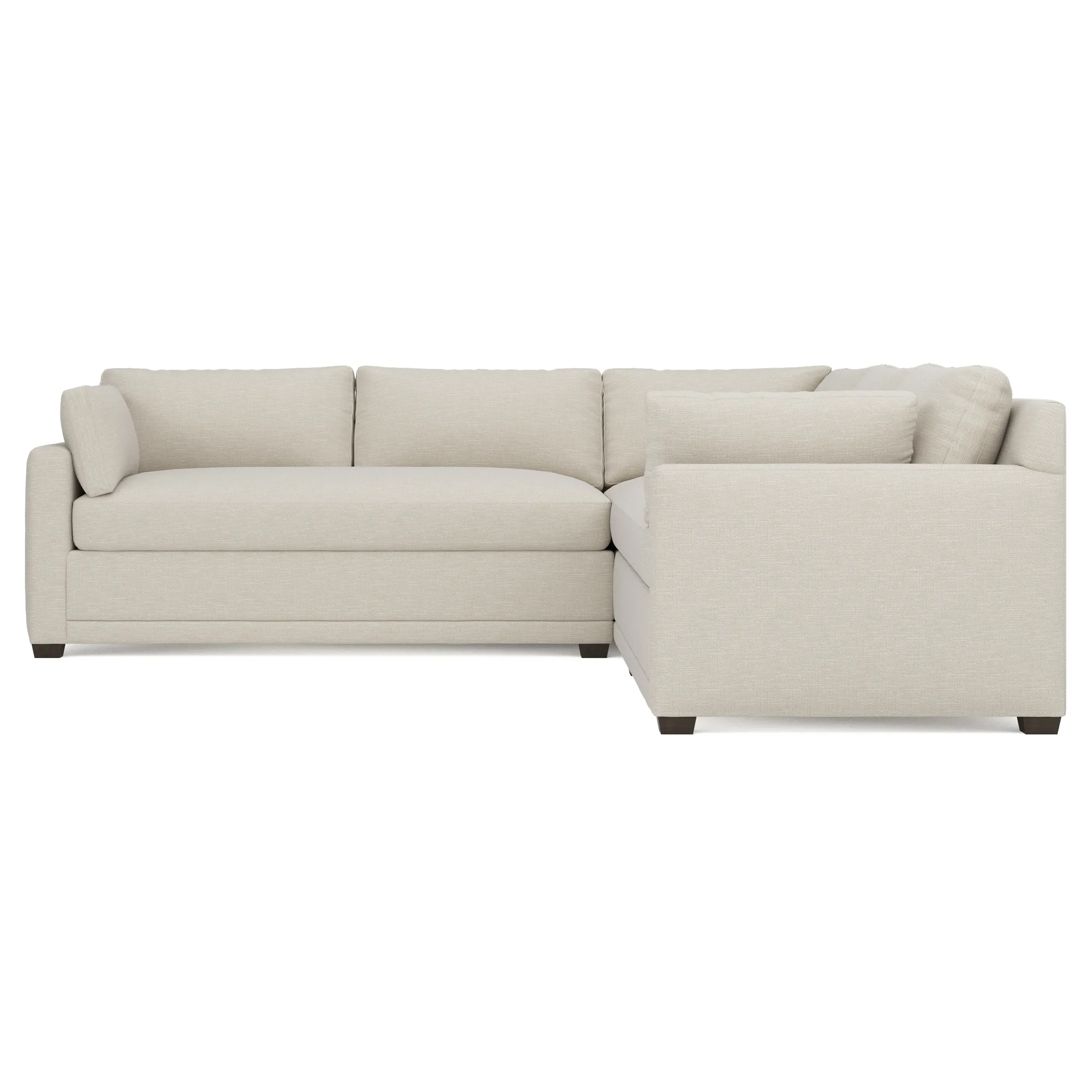 The Weybridge corner sectional offers generous seating with its plush box cushions and streamlined track arms. Its foam core surrounded by fiber, down, and feather fill provides cloud-like comfort, while the long bench seat ensures uninterrupted relaxation. The tapered wood legs with espresso finish add stability and visual appeal. W279 x D295 x H89 cm.