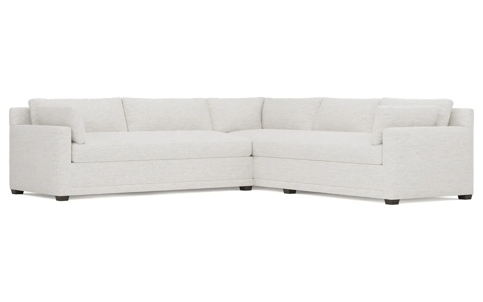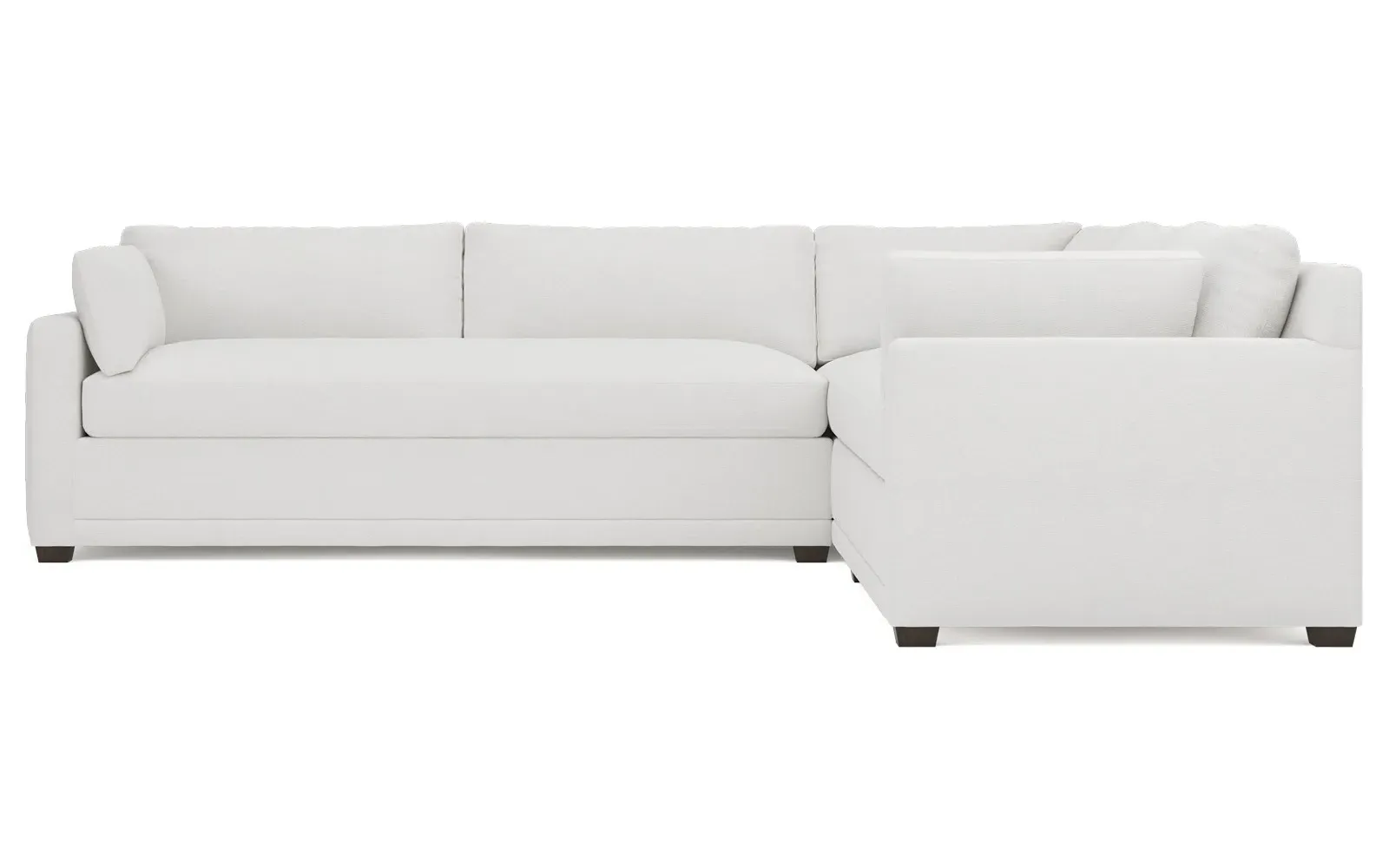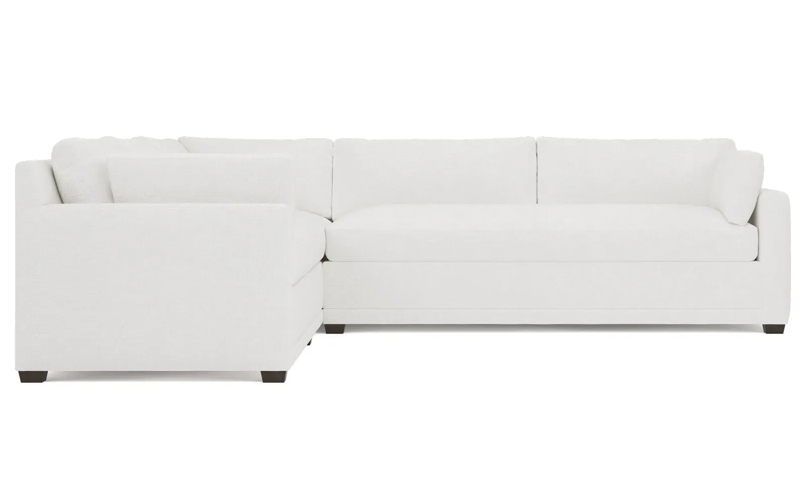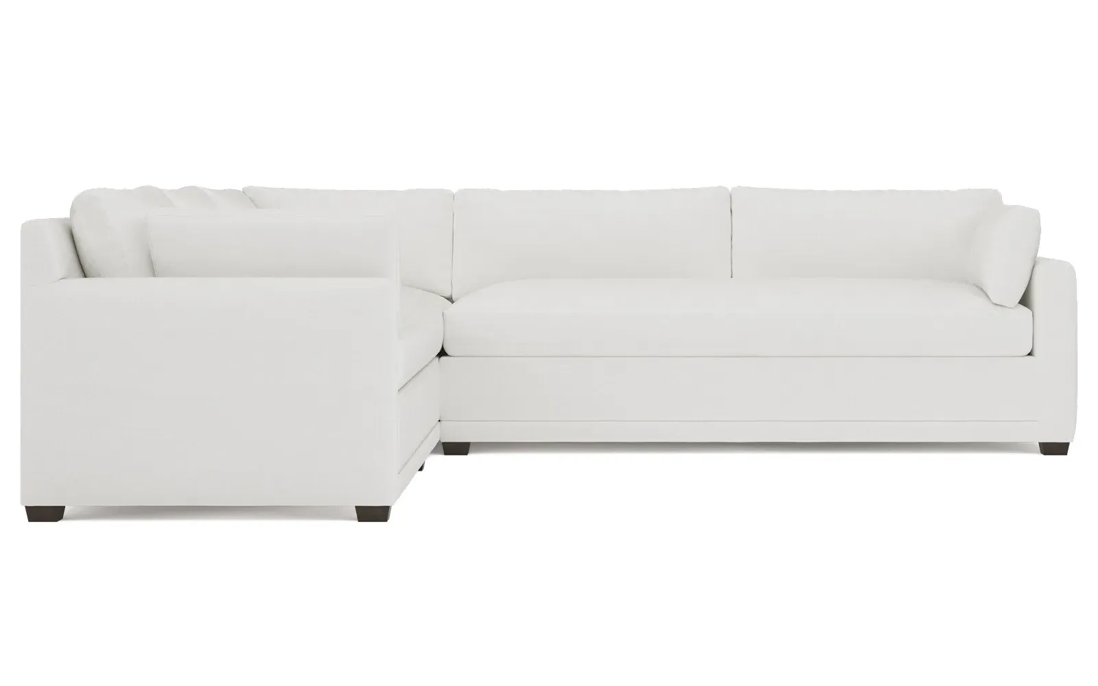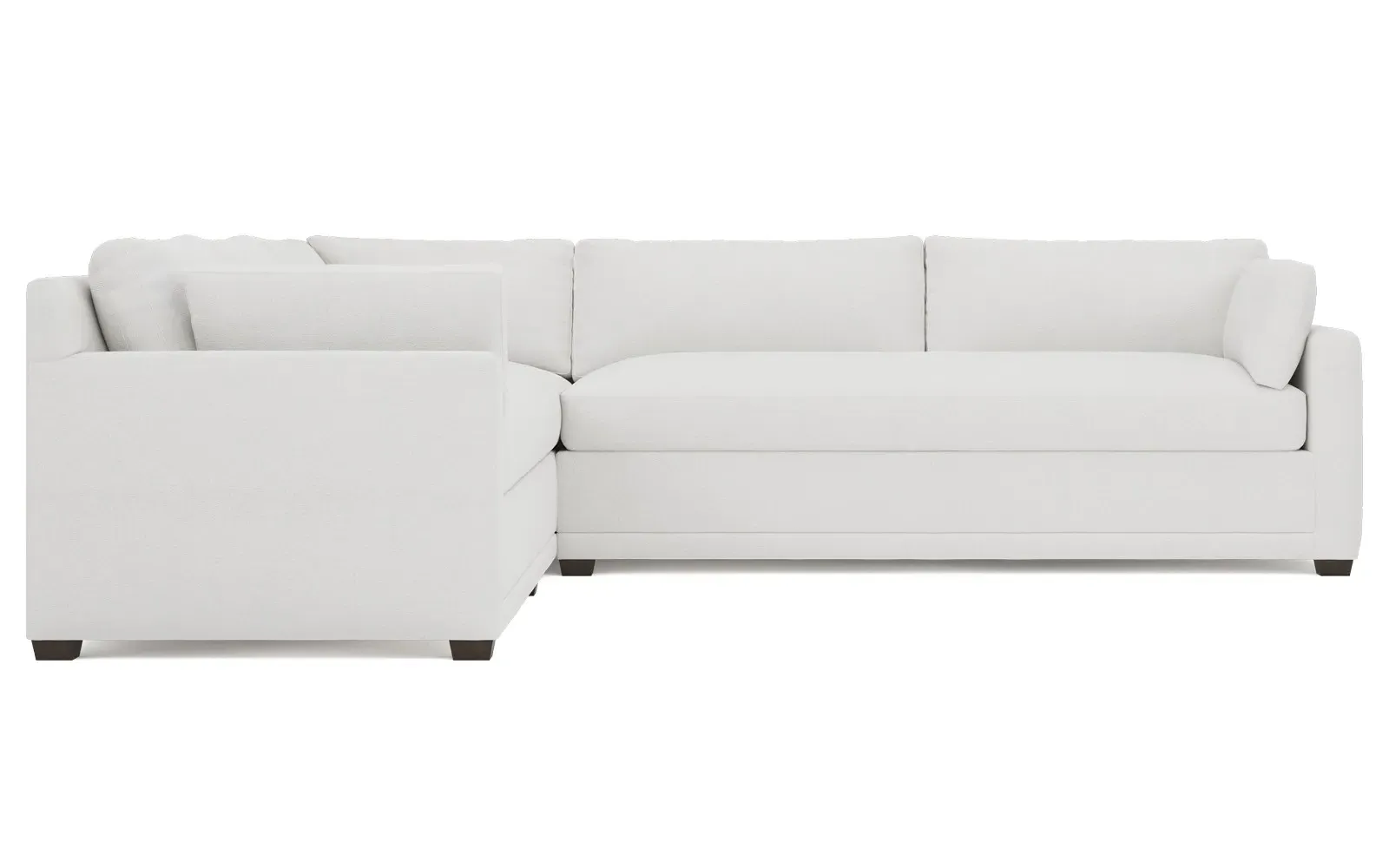With a generous profile and plush box cushions, the left 110” Weybridge corner sectional is perfect for large gatherings. Streamlined track arms and tapered wood legs elevate the simple, modern silhouette. Soft and supportive cushioning offers plush, cloud-like comfort, with a foam core surrounded by a blend of fiber, down, and feather fill. The long bench seat provides uninterrupted comfort. Choose from a variety of upholstery options, including linen, velvet, and performance fabrics. <b>Overall Dimensions:</b> 110" W x 116" D x 35" H. <b>End Sofa Dimensions:</b> 71” W x 39” D x 35” H; <b>End Sofa with Corner Dimensions:</b> 116” W x 39” D x 35” H; <b>Seat Dimensions:</b> 24” D x 21” H; <b>Arm Height:</b> 25”; <b>Leg Height:</b> 2”. <b>Materials:</b> FSC®-certified, US-sourced, formaldehyde-free solid kiln-dried hardwood and furniture-grade laminates. <b>Material Finish:</b> Espresso. <b>Pieces Included:</b> Right end sofa with corner, left end sofa.