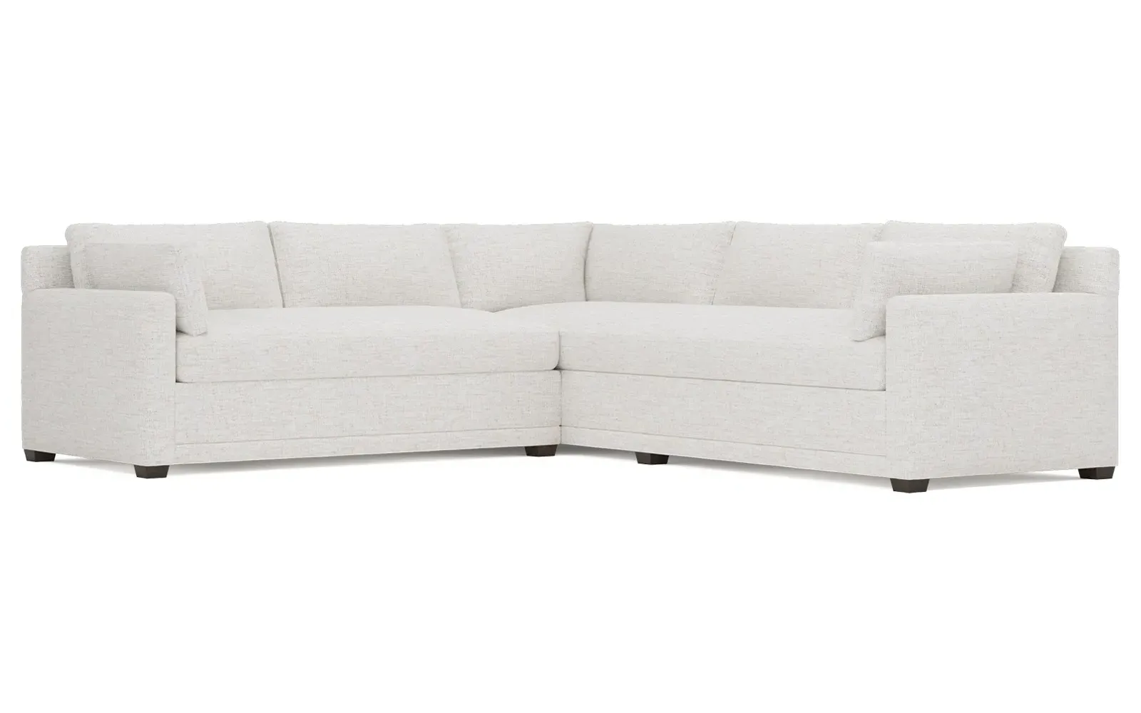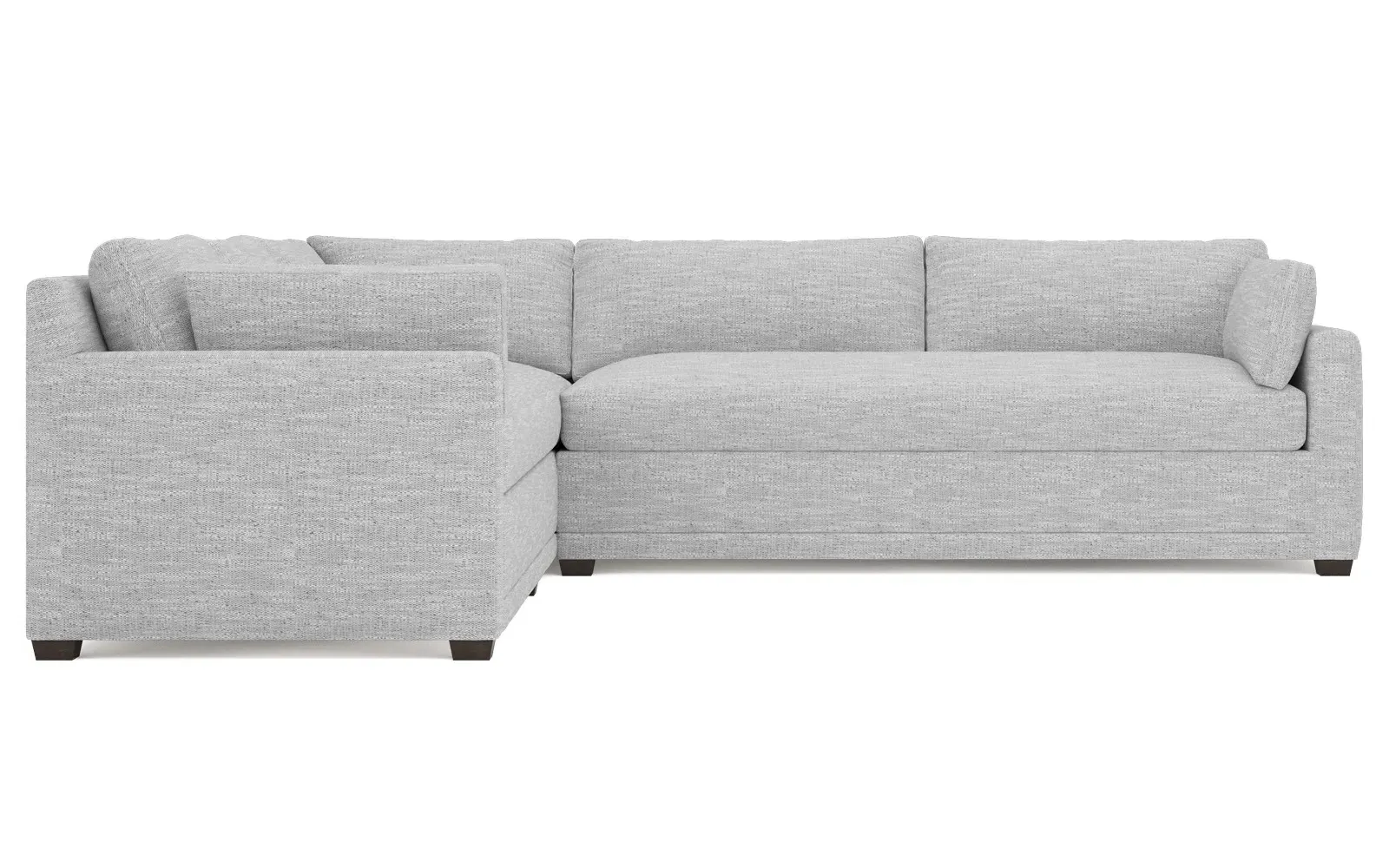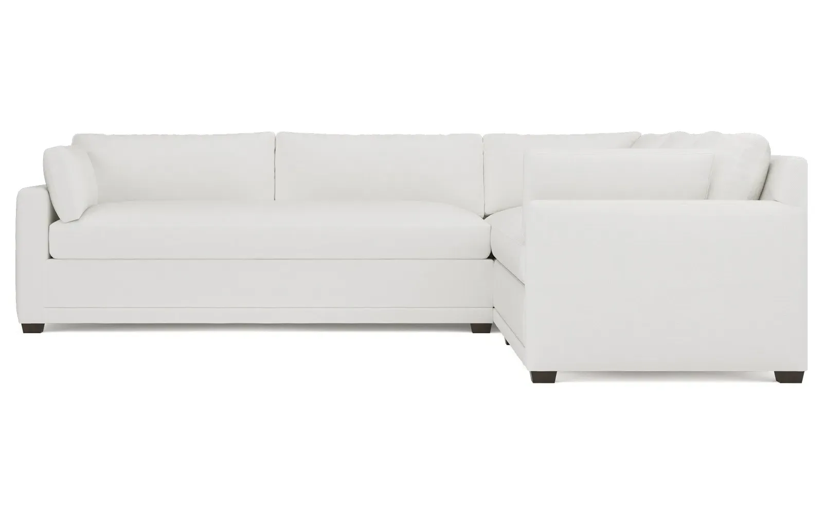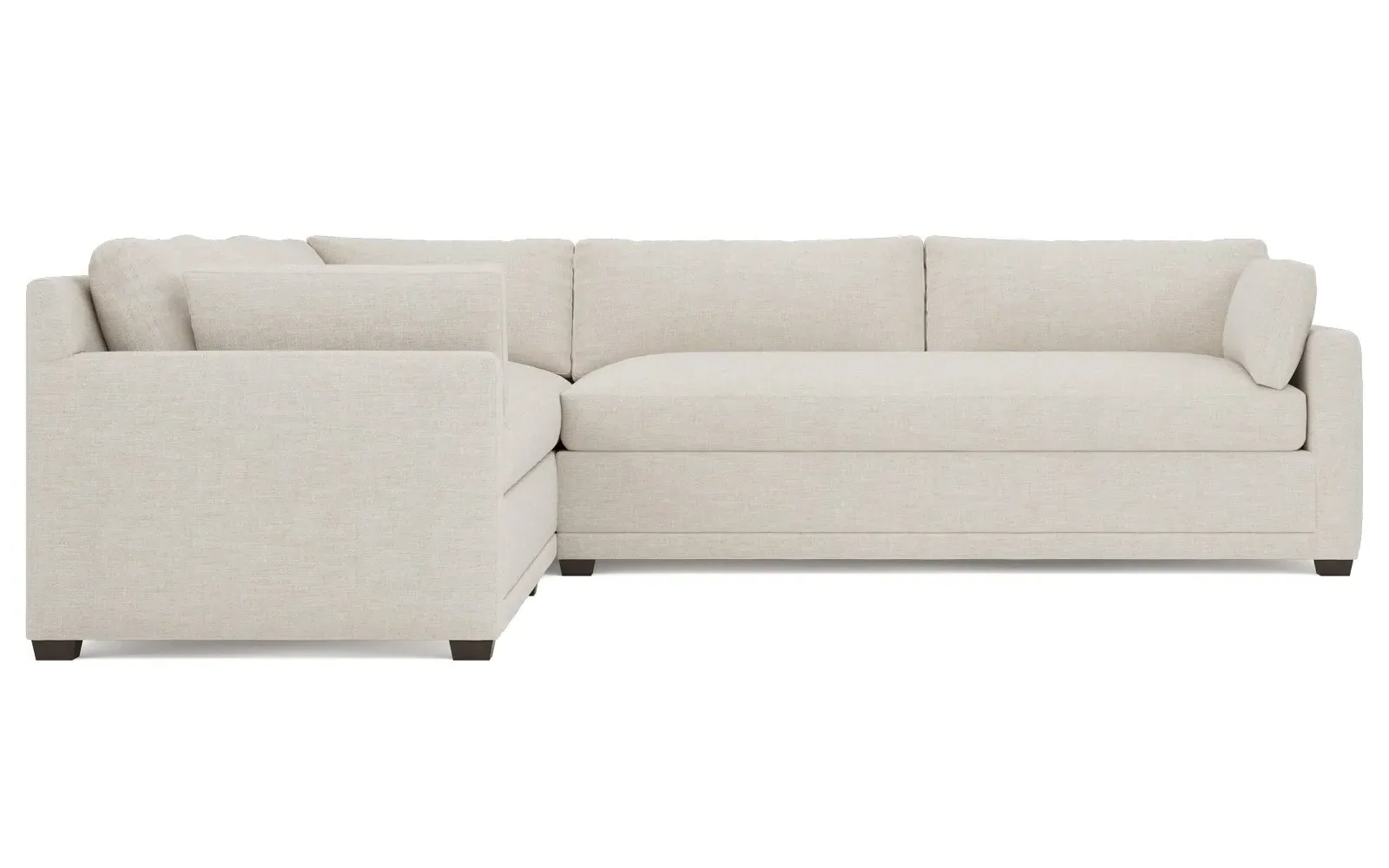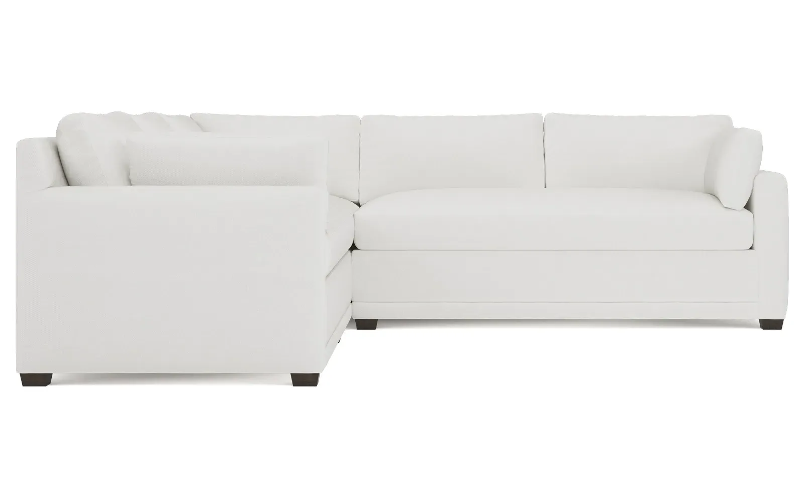 With a generous profile and plush box cushions, the left 110” Weybridge corner sectional is perfect for large gatherings. Streamlined track arms and tapered wood legs elevate the simple, modern silhouette. Soft and supportive cushioning offers plush, cloud-like comfort, with a foam core surrounded by a blend of fiber, down, and feather fill. The long bench seat provides uninterrupted comfort. Choose from a variety of upholstery options, including linen, velvet, and performance fabrics. <b>Overall Dimensions:</b> 110" W x 116" D x 35" H. <b>End Sofa Dimensions:</b> 71” W x 39” D x 35” H; <b>End Sofa with Corner Dimensions:</b> 116” W x 39” D x 35” H; <b>Seat Dimensions:</b> 24” D x 21” H; <b>Arm Height:</b> 25”; <b>Leg Height:</b> 2”. <b>Materials:</b> FSC®-certified, US-sourced, formaldehyde-free solid kiln-dried hardwood and furniture-grade laminates. <b>Material Finish:</b> Espresso. <b>Pieces Included:</b> Right end sofa with corner, left end sofa.