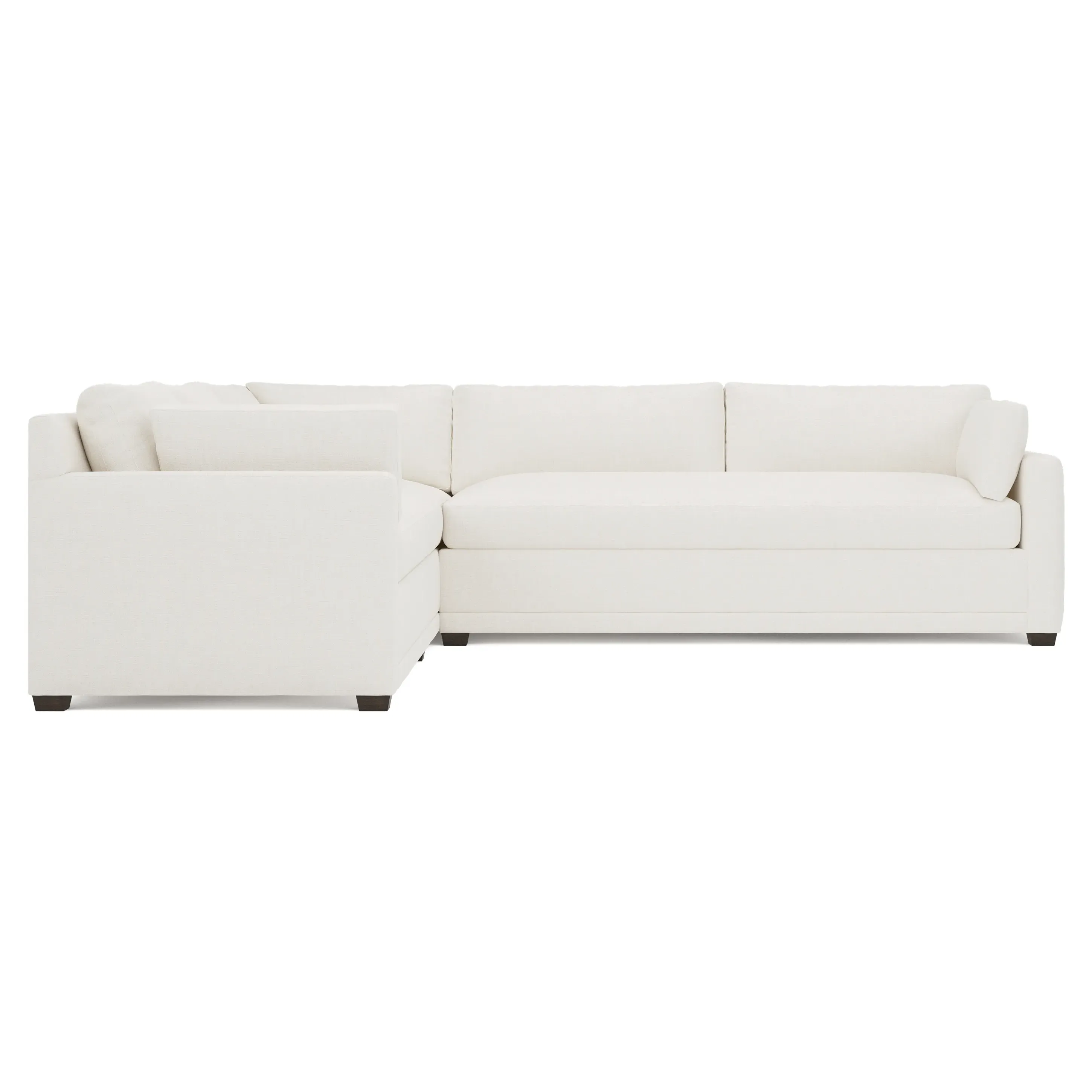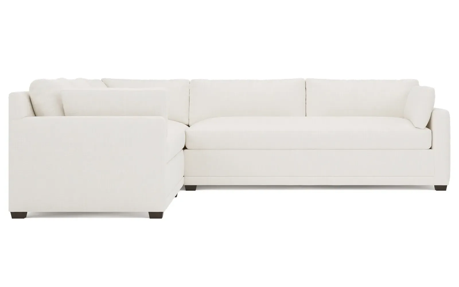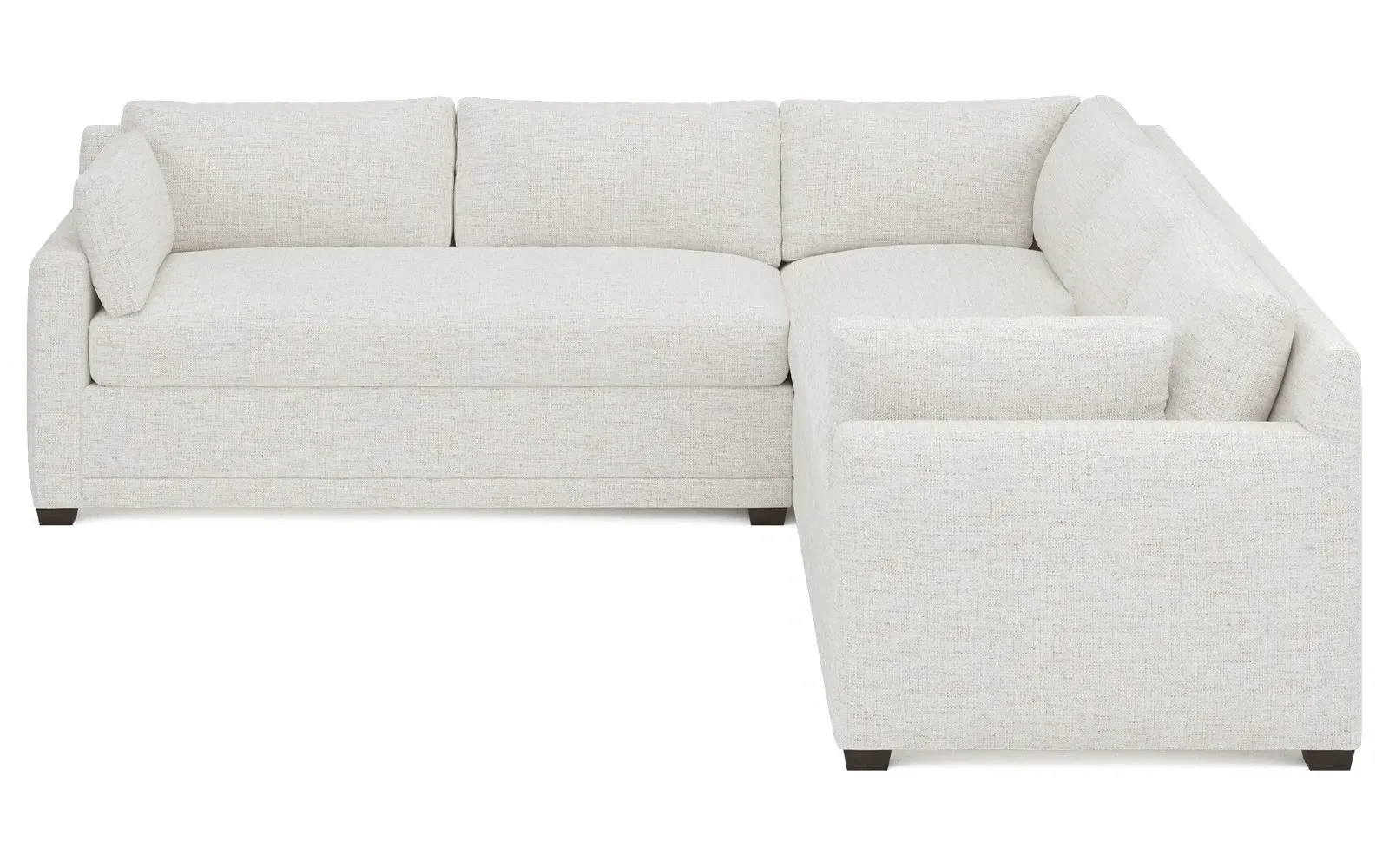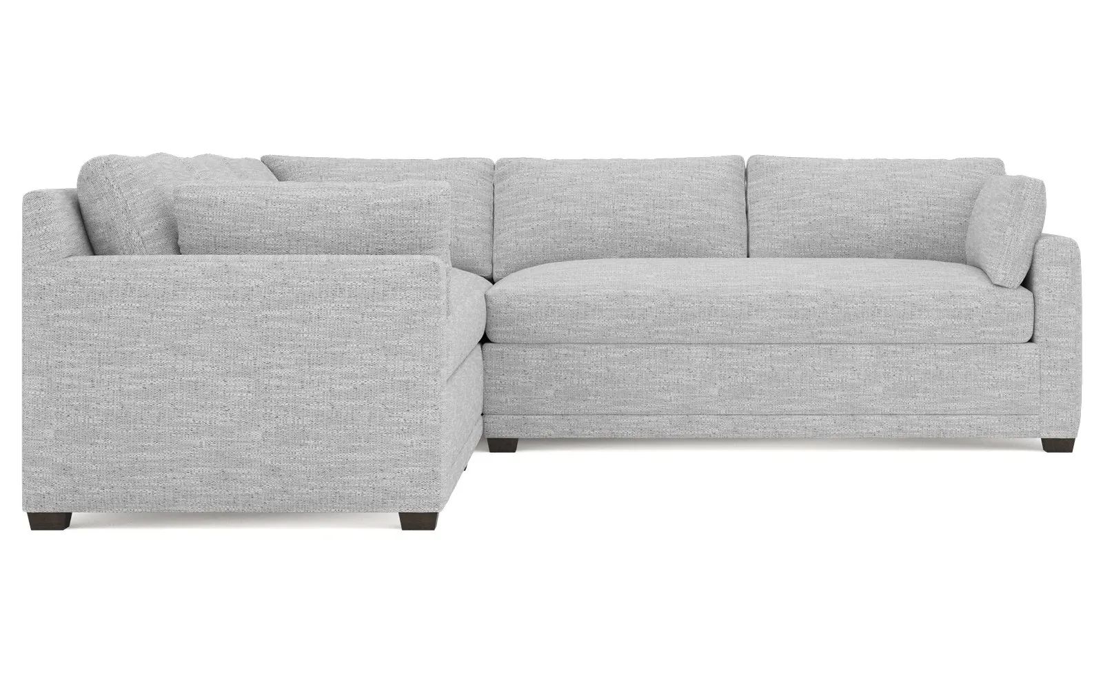 With a generous profile and plush box cushions, the left 110” Weybridge corner sectional is perfect for large gatherings. Streamlined track arms and tapered wood legs elevate the simple, modern silhouette. Soft and supportive cushioning offers plush, cloud-like comfort, with a foam core surrounded by a blend of fiber, down, and feather fill. The long bench seat provides uninterrupted comfort. Choose from a variety of upholstery options, including linen, velvet, and performance fabrics. <b>Overall Dimensions:</b> 110" W x 116" D x 35" H. <b>End Sofa Dimensions:</b> 71” W x 39” D x 35” H; <b>End Sofa with Corner Dimensions:</b> 116” W x 39” D x 35” H; <b>Seat Dimensions:</b> 24” D x 21” H; <b>Arm Height:</b> 25”; <b>Leg Height:</b> 2”. <b>Materials:</b> FSC®-certified, US-sourced, formaldehyde-free solid kiln-dried hardwood and furniture-grade laminates. <b>Material Finish:</b> Espresso. <b>Pieces Included:</b> Right end sofa with corner, left end sofa.