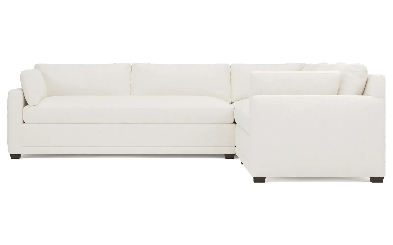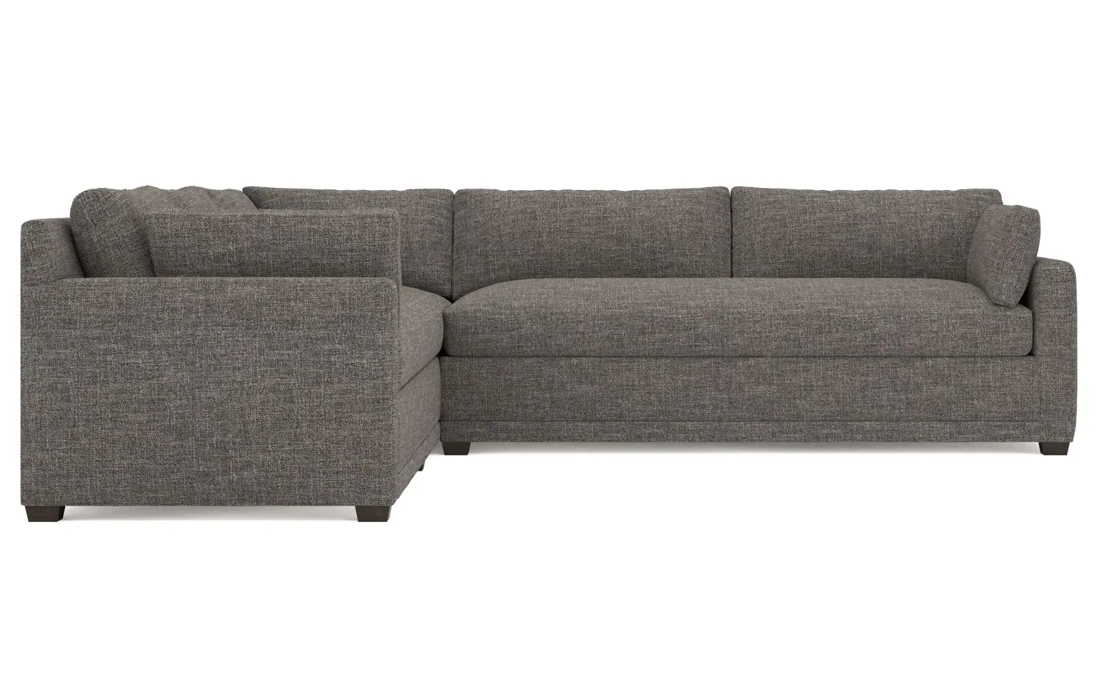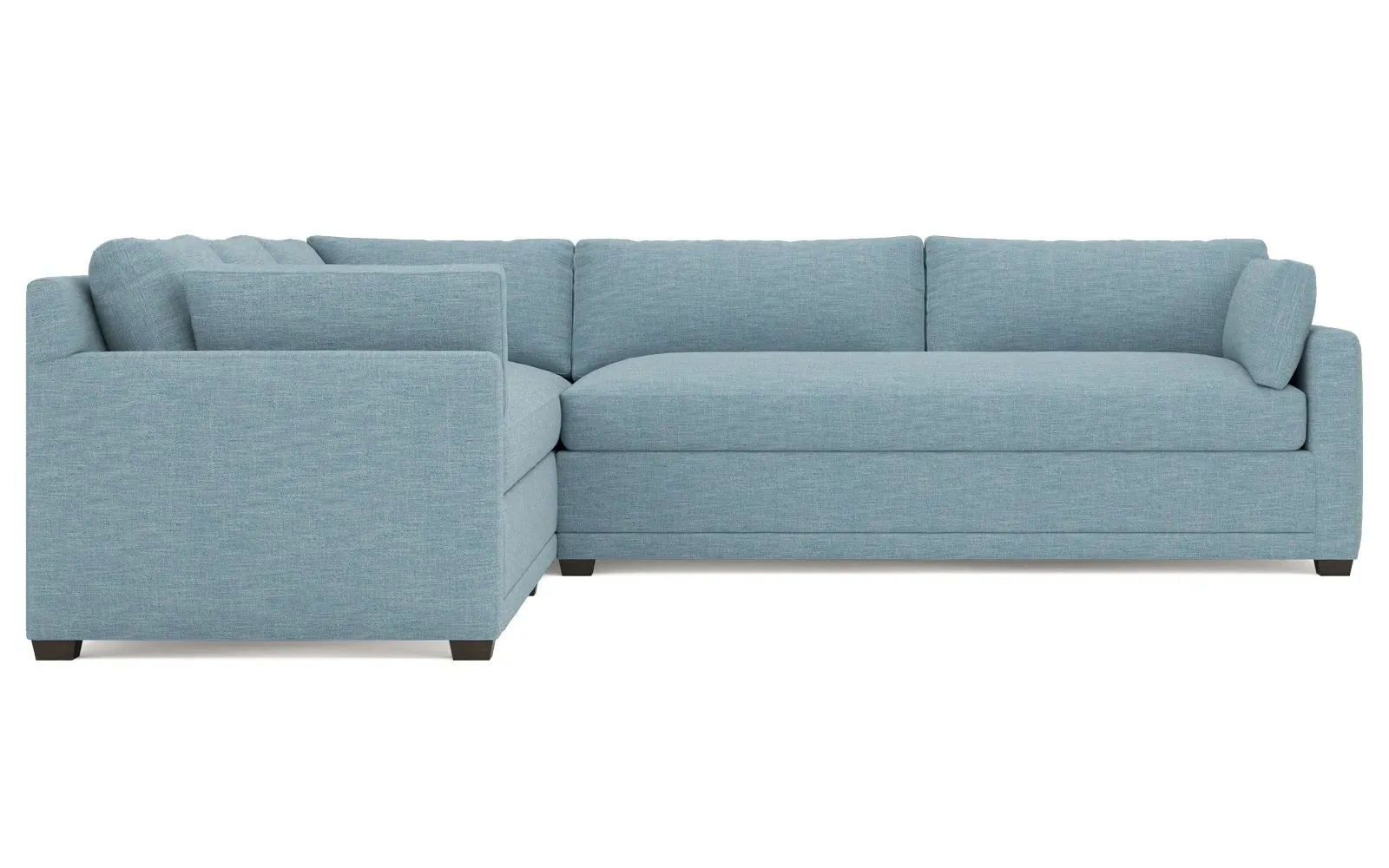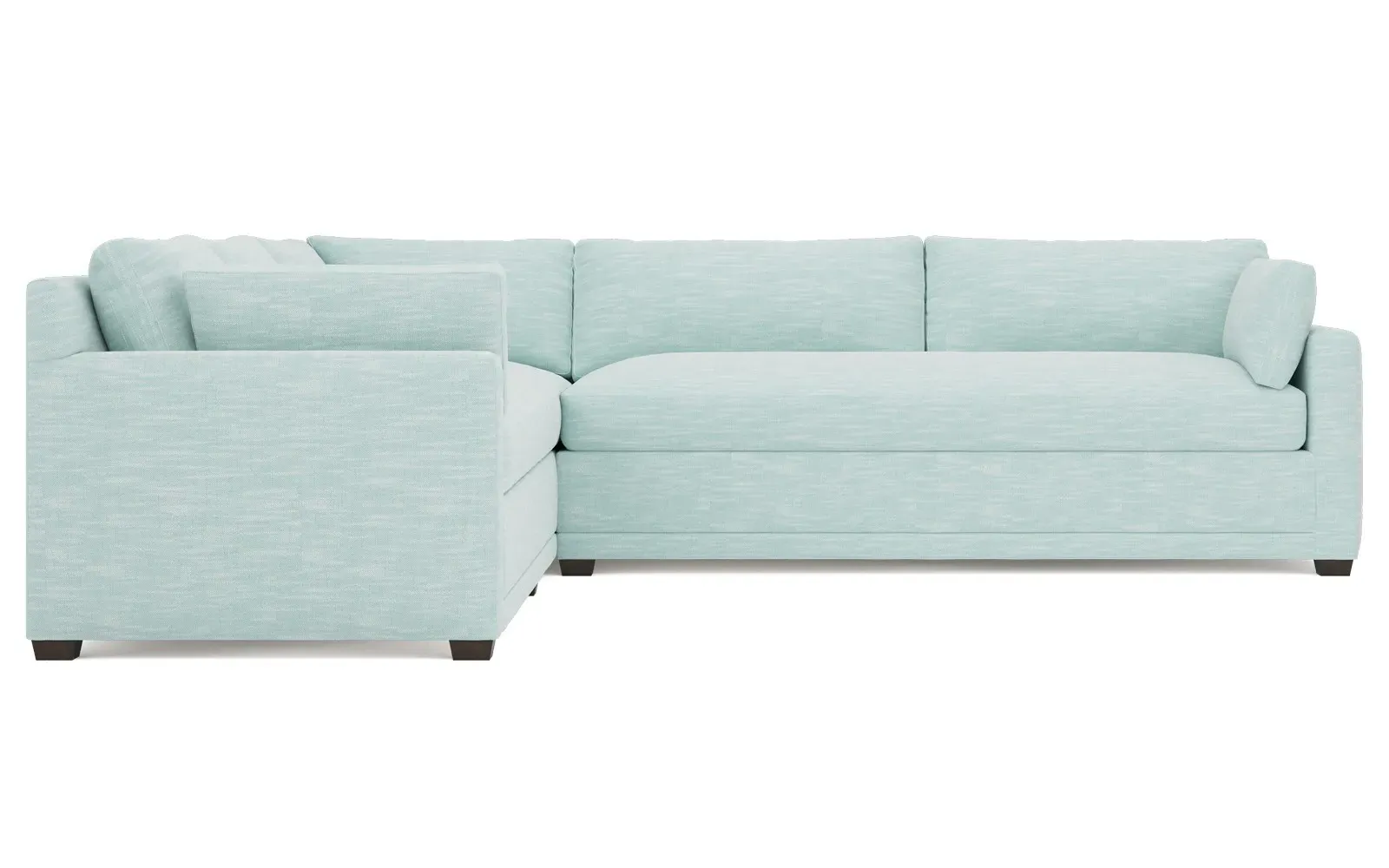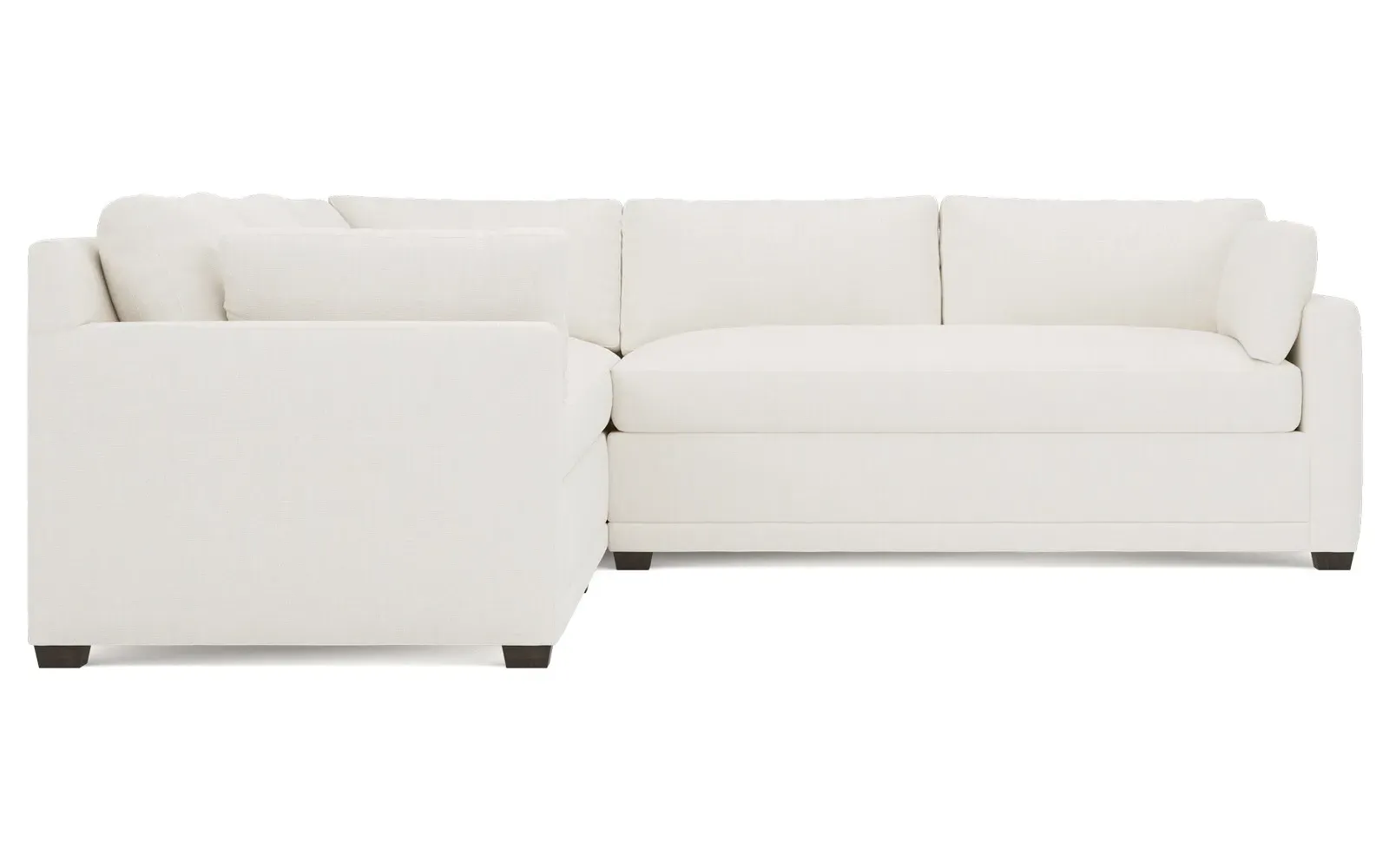 With a generous profile and plush box cushions, the left 110” Weybridge corner sectional is perfect for large gatherings. Streamlined track arms and tapered wood legs elevate the simple, modern silhouette. Soft and supportive cushioning offers plush, cloud-like comfort, with a foam core surrounded by a blend of fiber, down, and feather fill. The long bench seat provides uninterrupted comfort. Choose from a variety of upholstery options, including linen, velvet, and performance fabrics. <b>Overall Dimensions:</b> 110" W x 116" D x 35" H. <b>End Sofa Dimensions:</b> 71” W x 39” D x 35” H; <b>End Sofa with Corner Dimensions:</b> 116” W x 39” D x 35” H; <b>Seat Dimensions:</b> 24” D x 21” H; <b>Arm Height:</b> 25”; <b>Leg Height:</b> 2”. <b>Materials:</b> FSC®-certified, US-sourced, formaldehyde-free solid kiln-dried hardwood and furniture-grade laminates. <b>Material Finish:</b> Espresso. <b>Pieces Included:</b> Right end sofa with corner, left end sofa.