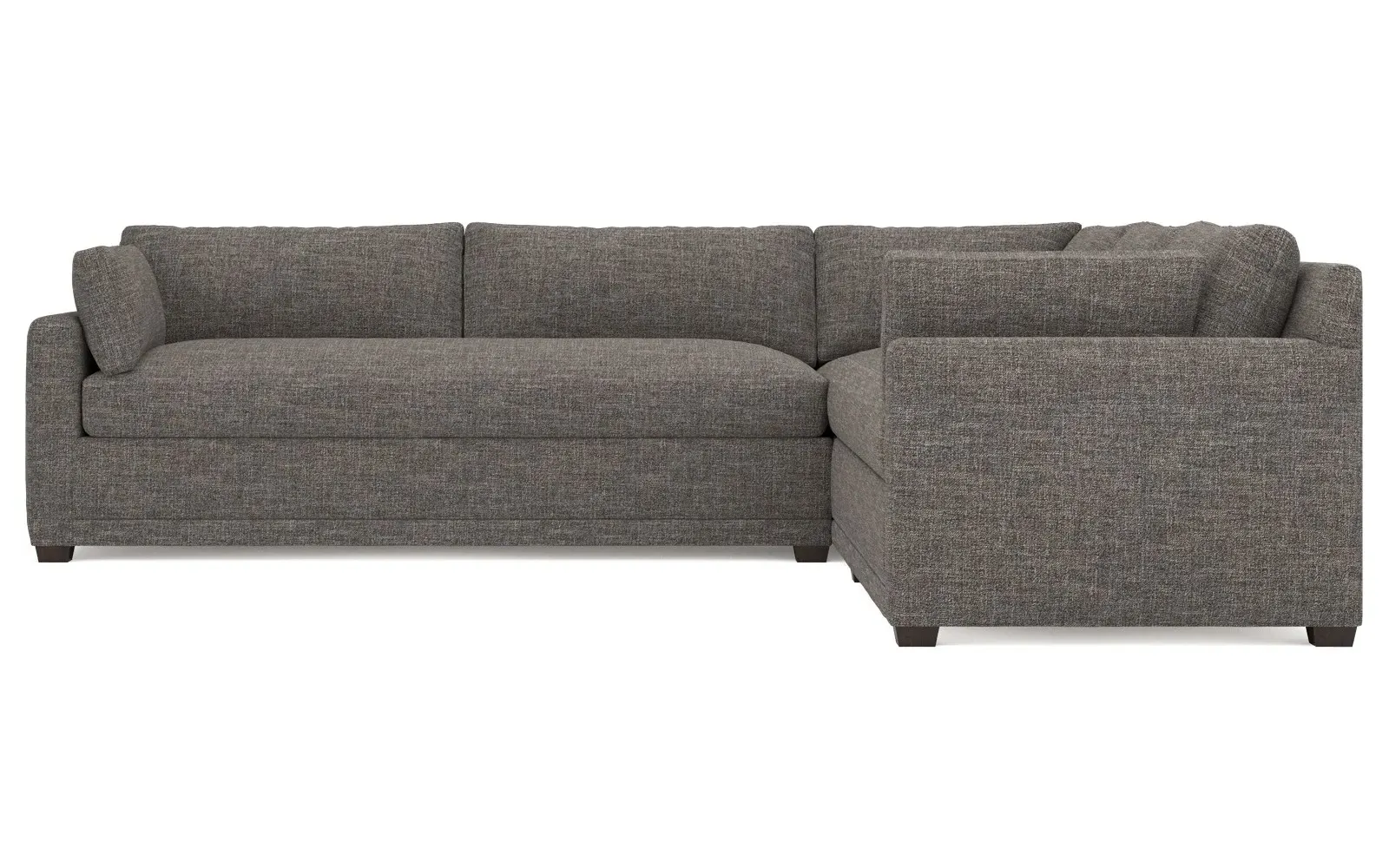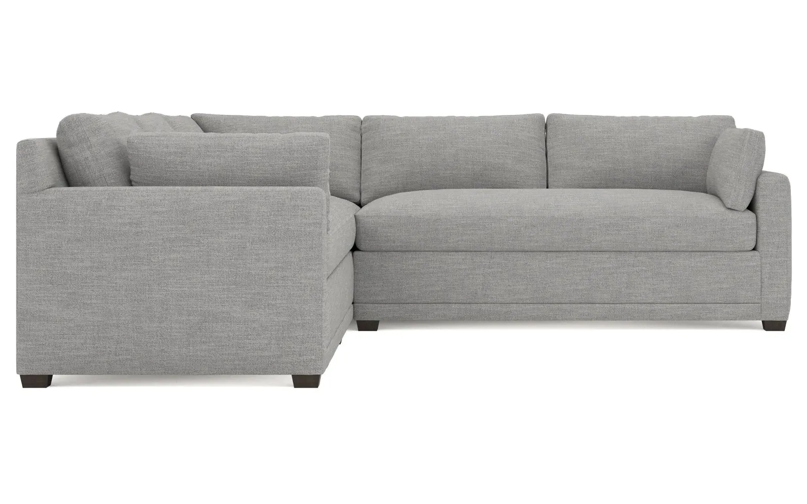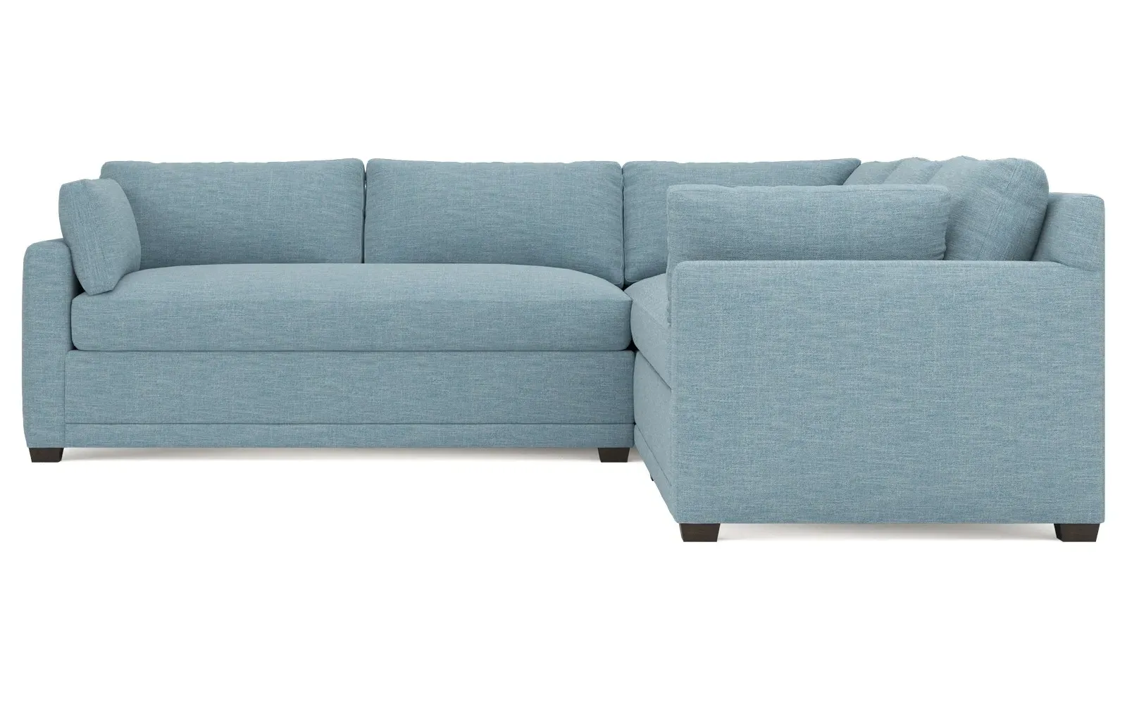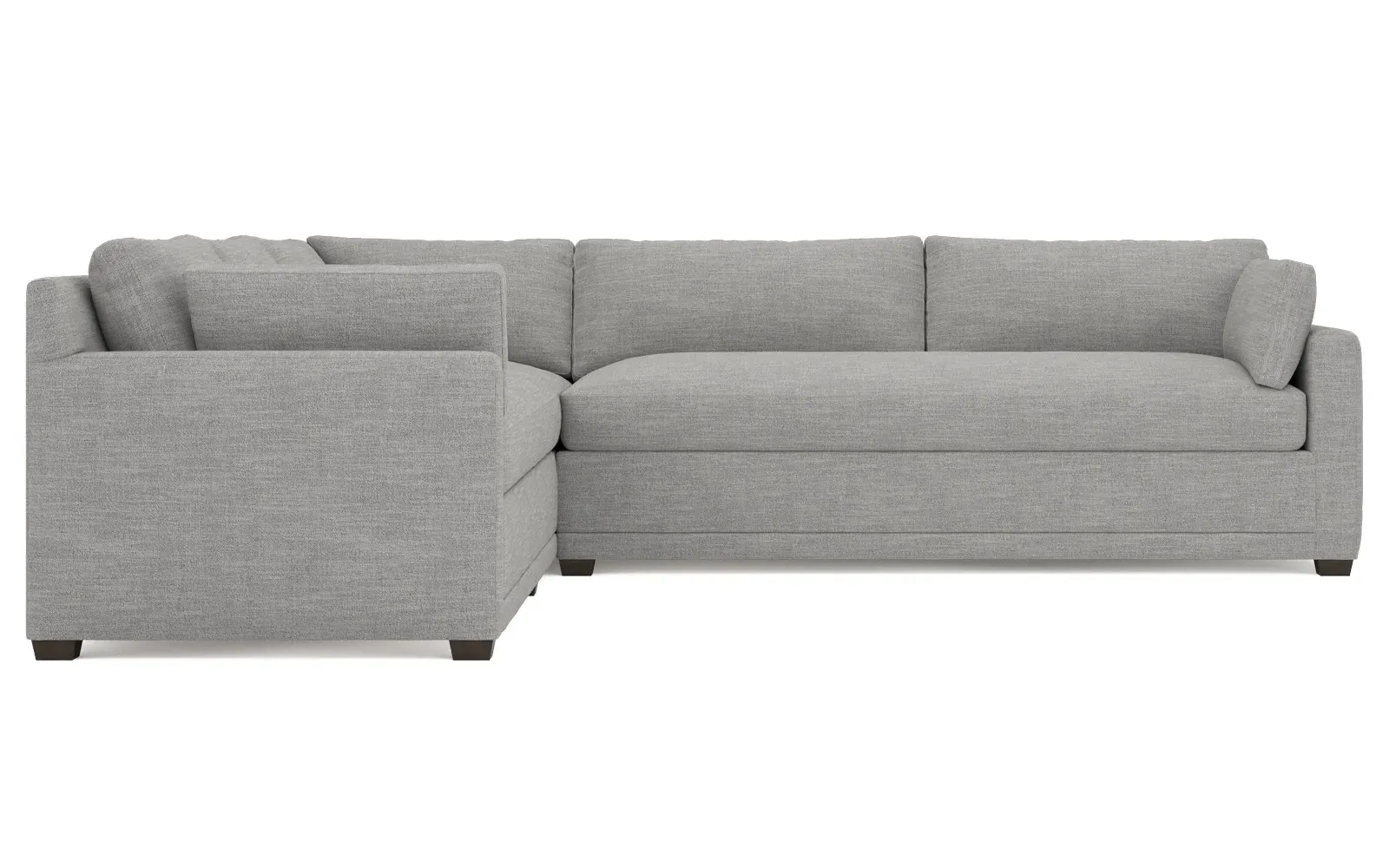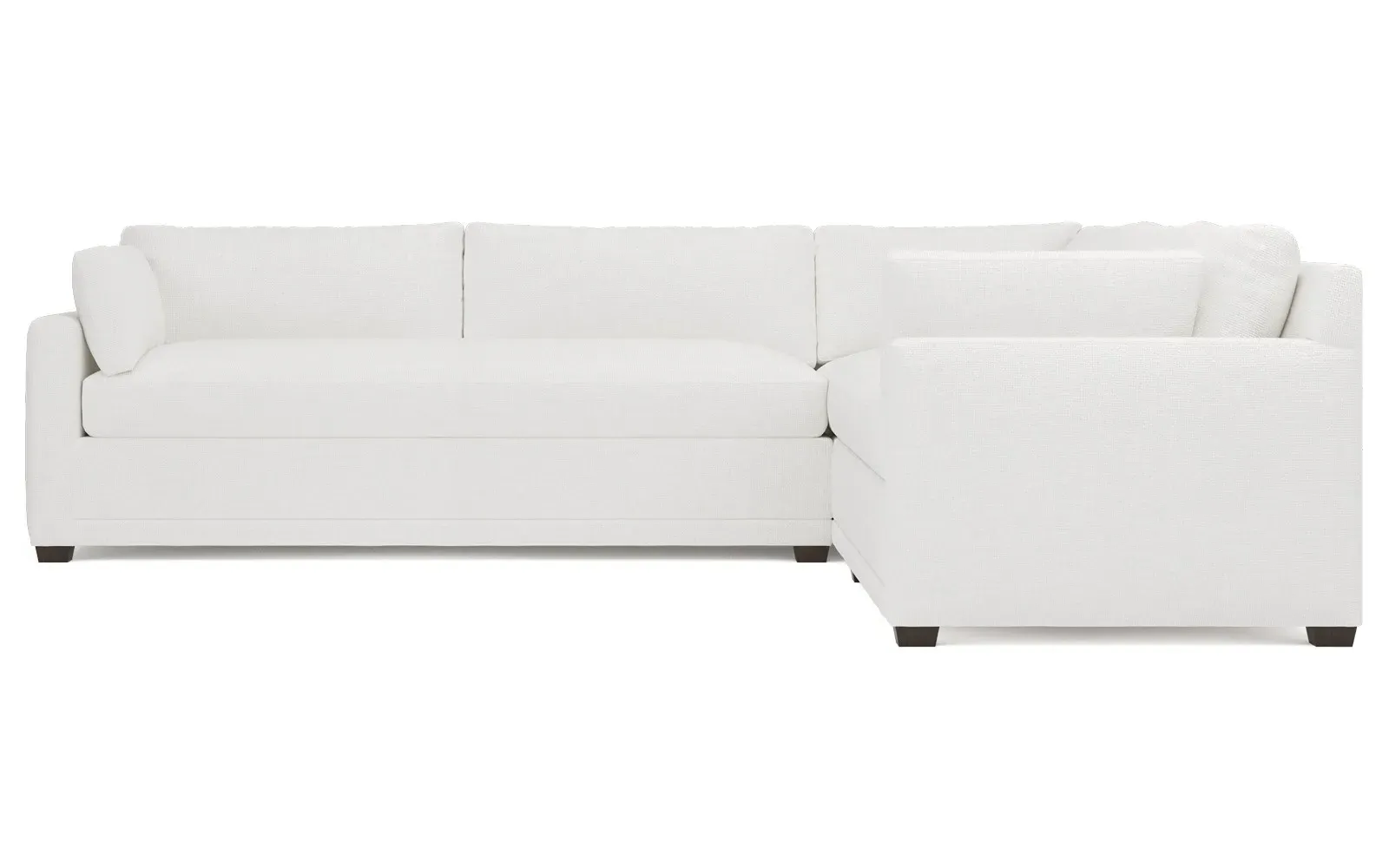 With a generous profile and plush box cushions, the left 110” Weybridge corner sectional is perfect for large gatherings. Streamlined track arms and tapered wood legs elevate the simple, modern silhouette. Soft and supportive cushioning offers plush, cloud-like comfort, with a foam core surrounded by a blend of fiber, down, and feather fill. The long bench seat provides uninterrupted comfort. Choose from a variety of upholstery options, including linen, velvet, and performance fabrics. <b>Overall Dimensions:</b> 110" W x 116" D x 35" H. <b>End Sofa Dimensions:</b> 71” W x 39” D x 35” H; <b>End Sofa with Corner Dimensions:</b> 116” W x 39” D x 35” H; <b>Seat Dimensions:</b> 24” D x 21” H; <b>Arm Height:</b> 25”; <b>Leg Height:</b> 2”. <b>Materials:</b> FSC®-certified, US-sourced, formaldehyde-free solid kiln-dried hardwood and furniture-grade laminates. <b>Material Finish:</b> Espresso. <b>Pieces Included:</b> Right end sofa with corner, left end sofa.