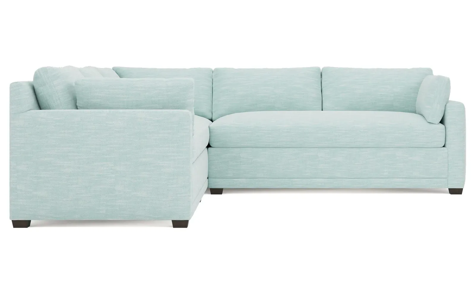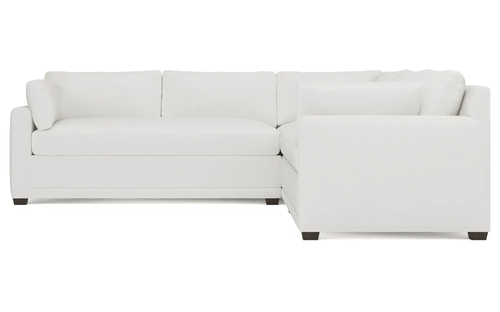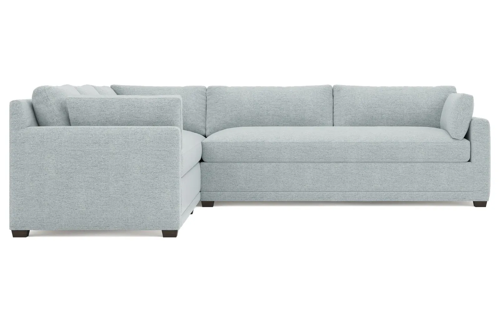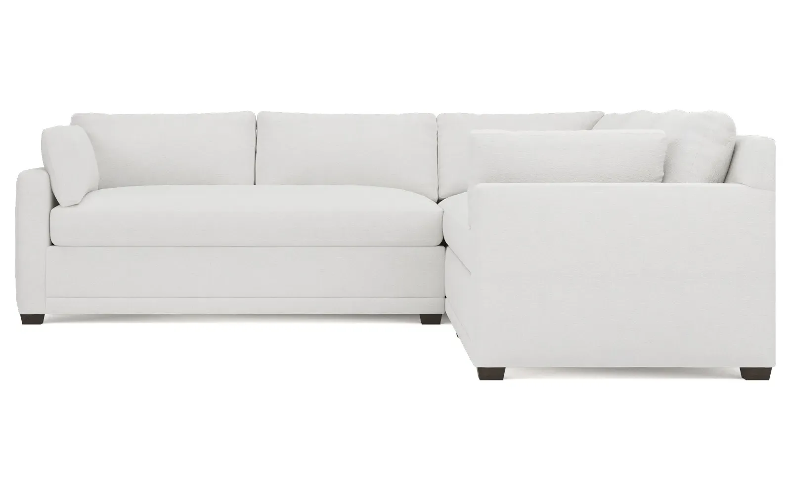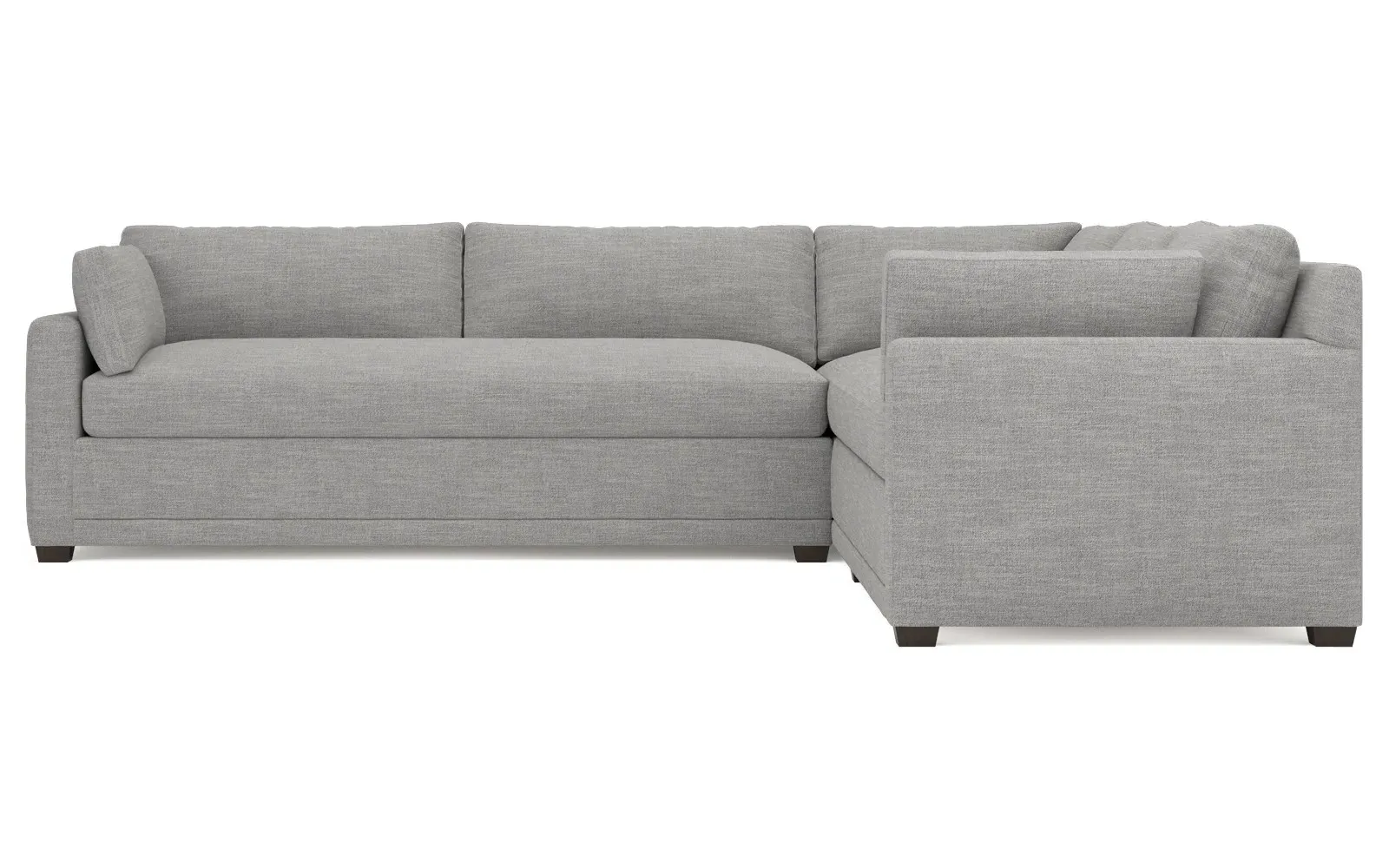 With a generous profile and plush box cushions, the left 110” Weybridge corner sectional is perfect for large gatherings. Streamlined track arms and tapered wood legs elevate the simple, modern silhouette. Soft and supportive cushioning offers plush, cloud-like comfort, with a foam core surrounded by a blend of fiber, down, and feather fill. The long bench seat provides uninterrupted comfort. Choose from a variety of upholstery options, including linen, velvet, and performance fabrics. <b>Overall Dimensions:</b> 110" W x 116" D x 35" H. <b>End Sofa Dimensions:</b> 71” W x 39” D x 35” H; <b>End Sofa with Corner Dimensions:</b> 116” W x 39” D x 35” H; <b>Seat Dimensions:</b> 24” D x 21” H; <b>Arm Height:</b> 25”; <b>Leg Height:</b> 2”. <b>Materials:</b> FSC®-certified, US-sourced, formaldehyde-free solid kiln-dried hardwood and furniture-grade laminates. <b>Material Finish:</b> Espresso. <b>Pieces Included:</b> Right end sofa with corner, left end sofa.
