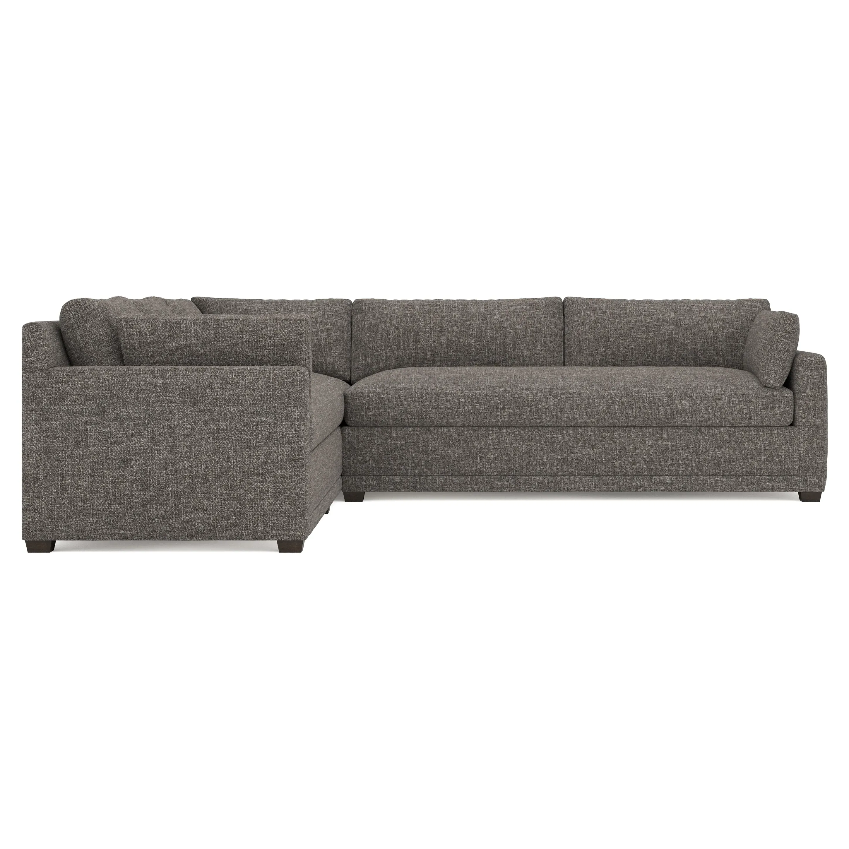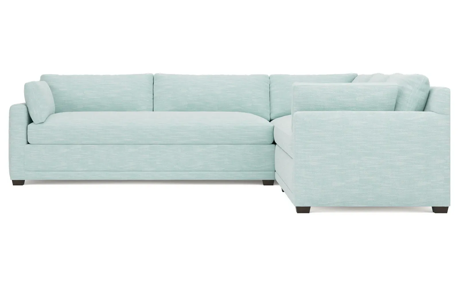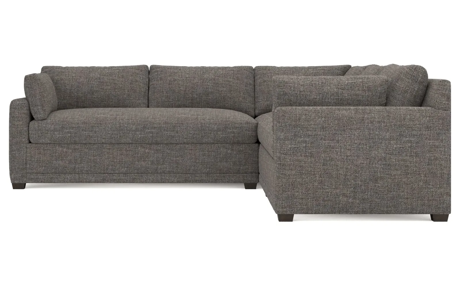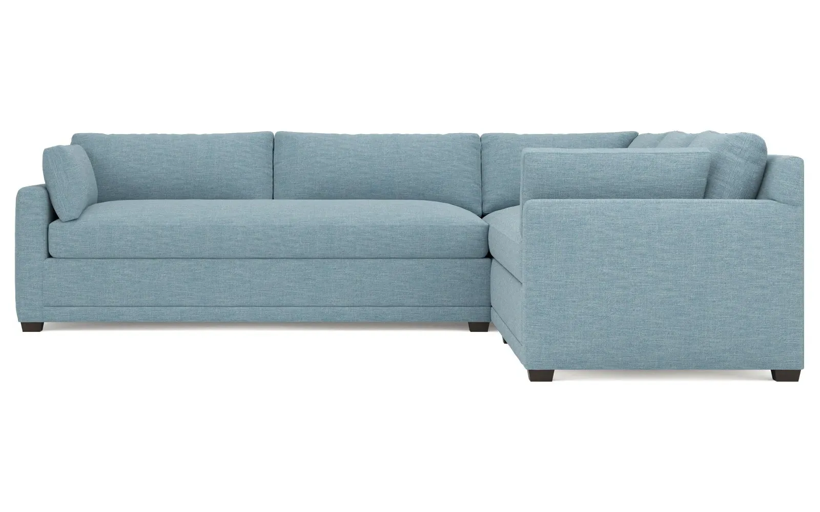 With a generous profile and plush box cushions, the left 110” Weybridge corner sectional is perfect for large gatherings. Streamlined track arms and tapered wood legs elevate the simple, modern silhouette. Soft and supportive cushioning offers plush, cloud-like comfort, with a foam core surrounded by a blend of fiber, down, and feather fill. The long bench seat provides uninterrupted comfort. Choose from a variety of upholstery options, including linen, velvet, and performance fabrics. <b>Overall Dimensions:</b> 110" W x 116" D x 35" H. <b>End Sofa Dimensions:</b> 71” W x 39” D x 35” H; <b>End Sofa with Corner Dimensions:</b> 116” W x 39” D x 35” H; <b>Seat Dimensions:</b> 24” D x 21” H; <b>Arm Height:</b> 25”; <b>Leg Height:</b> 2”. <b>Materials:</b> FSC®-certified, US-sourced, formaldehyde-free solid kiln-dried hardwood and furniture-grade laminates. <b>Material Finish:</b> Espresso. <b>Pieces Included:</b> Right end sofa with corner, left end sofa.
