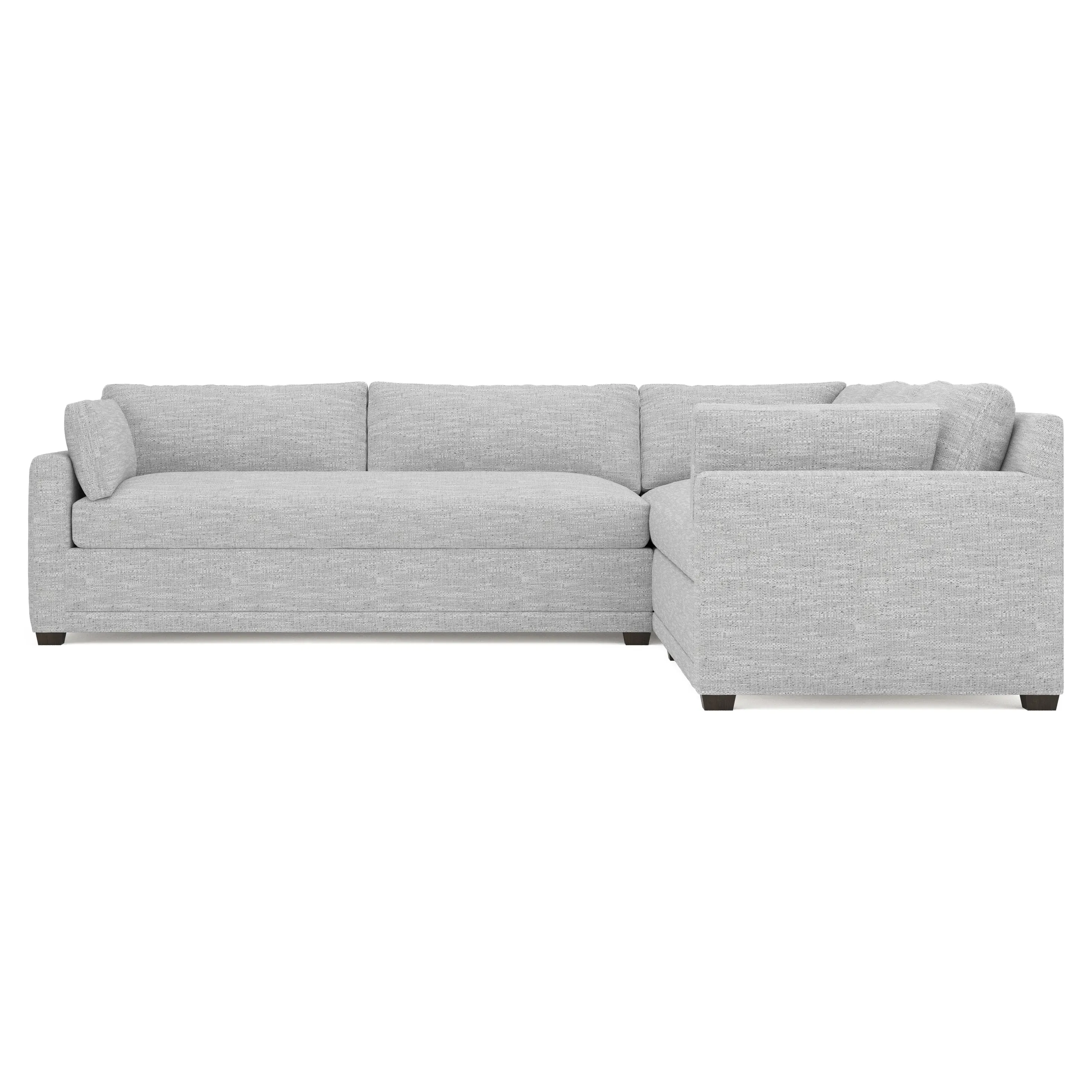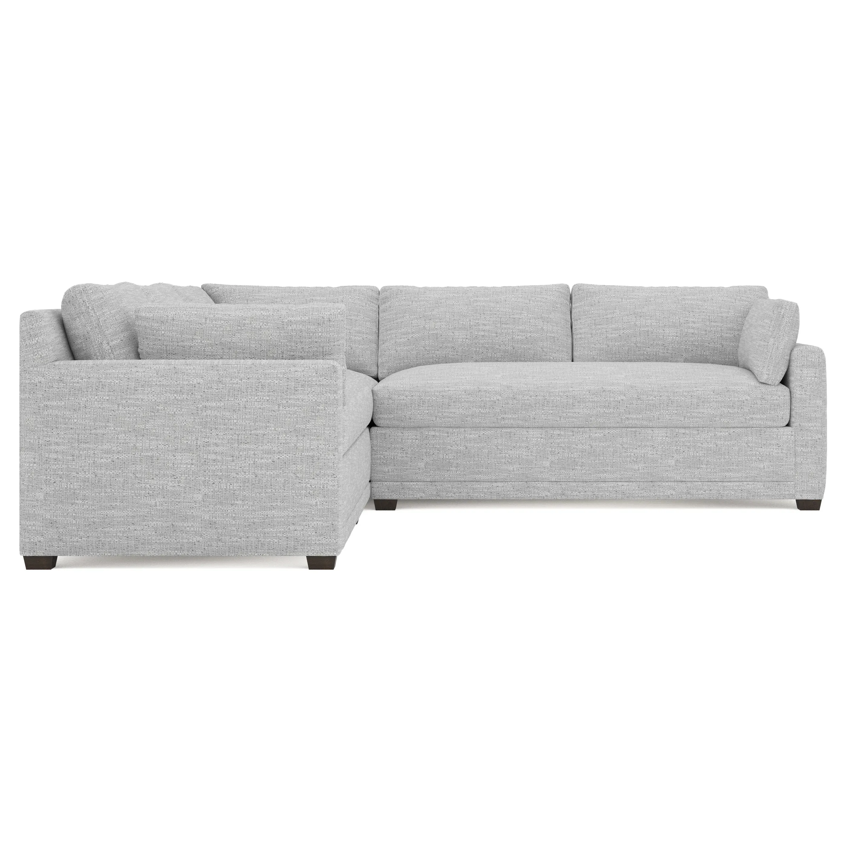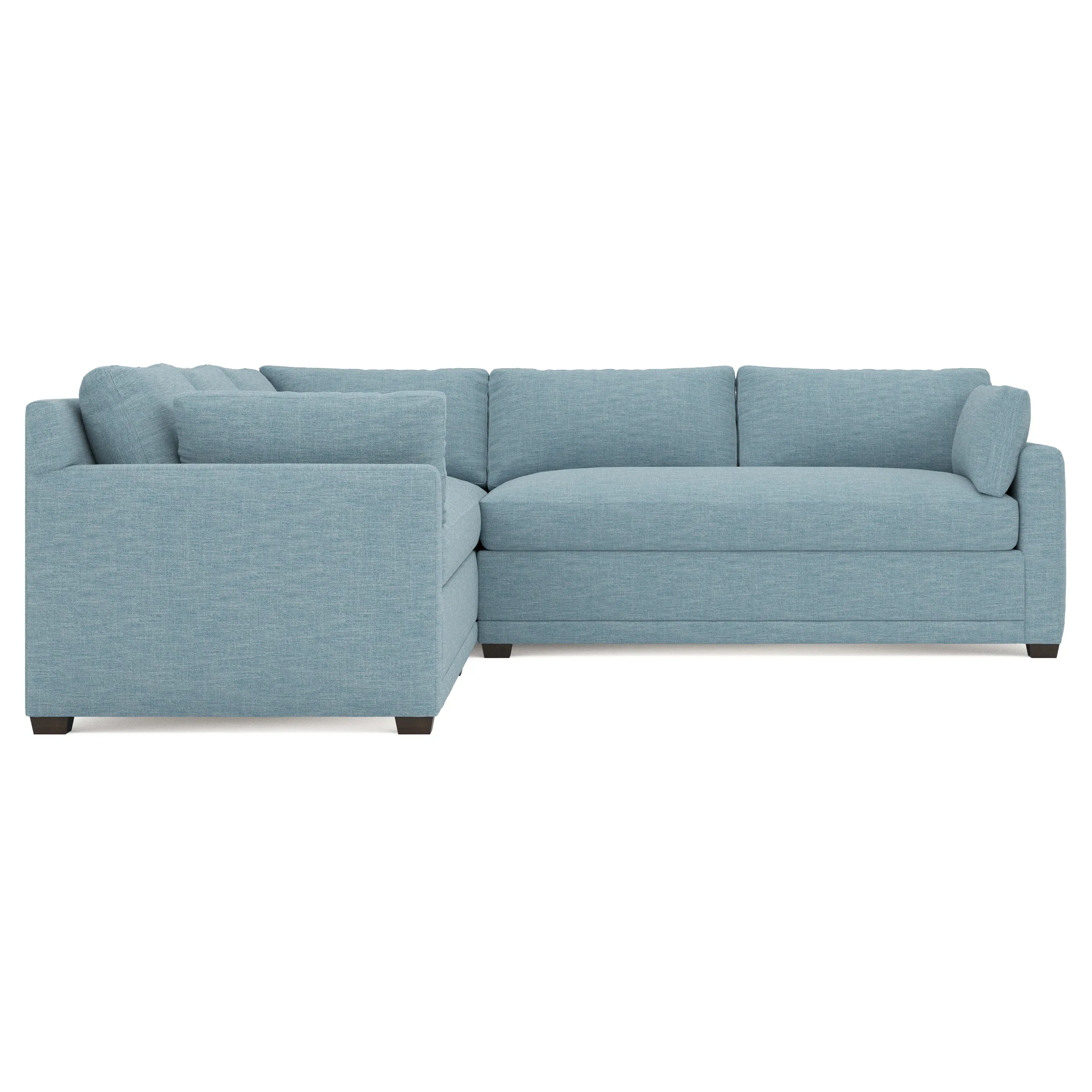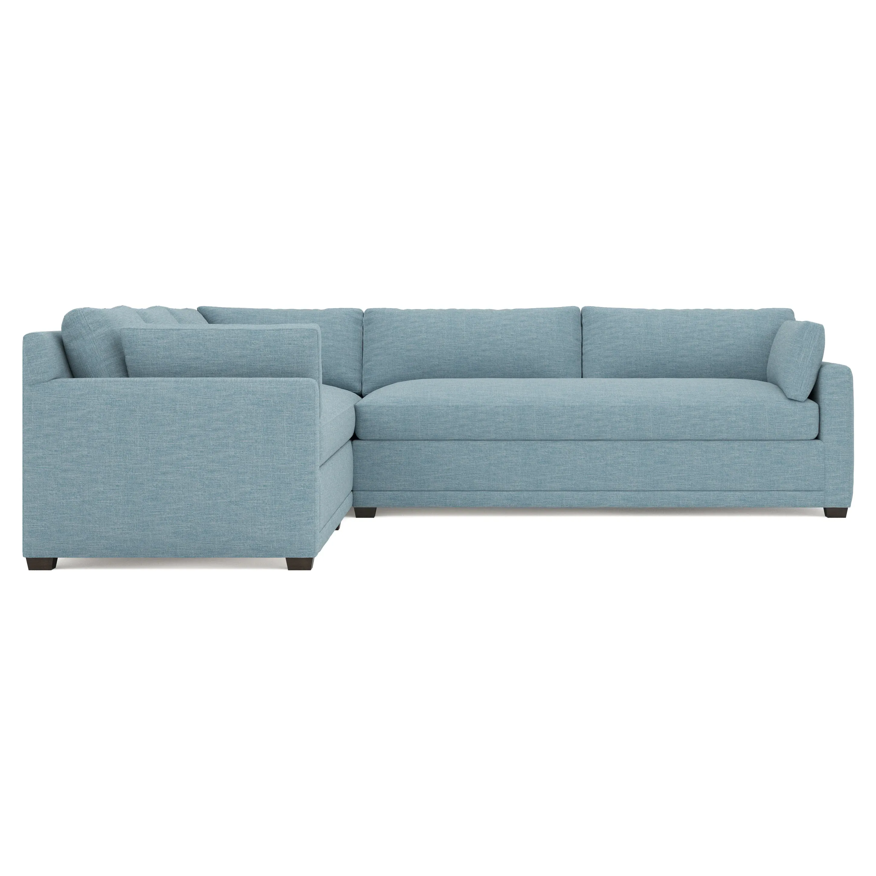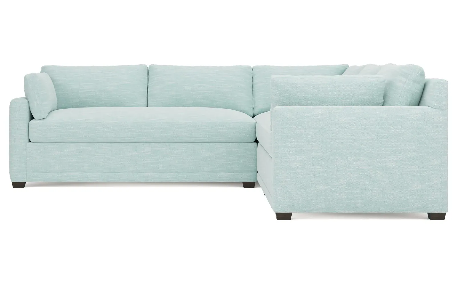 With a generous profile and plush box cushions, the left 110” Weybridge corner sectional is perfect for large gatherings. Streamlined track arms and tapered wood legs elevate the simple, modern silhouette. Soft and supportive cushioning offers plush, cloud-like comfort, with a foam core surrounded by a blend of fiber, down, and feather fill. The long bench seat provides uninterrupted comfort. Choose from a variety of upholstery options, including linen, velvet, and performance fabrics. <b>Overall Dimensions:</b> 110" W x 116" D x 35" H. <b>End Sofa Dimensions:</b> 71” W x 39” D x 35” H; <b>End Sofa with Corner Dimensions:</b> 116” W x 39” D x 35” H; <b>Seat Dimensions:</b> 24” D x 21” H; <b>Arm Height:</b> 25”; <b>Leg Height:</b> 2”. <b>Materials:</b> FSC®-certified, US-sourced, formaldehyde-free solid kiln-dried hardwood and furniture-grade laminates. <b>Material Finish:</b> Espresso. <b>Pieces Included:</b> Right end sofa with corner, left end sofa.