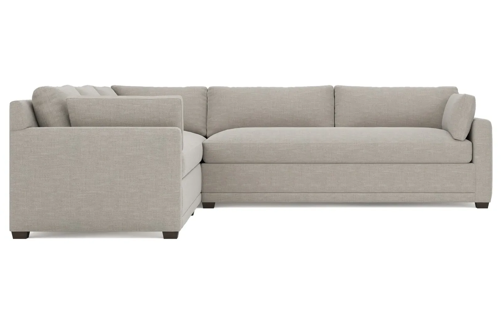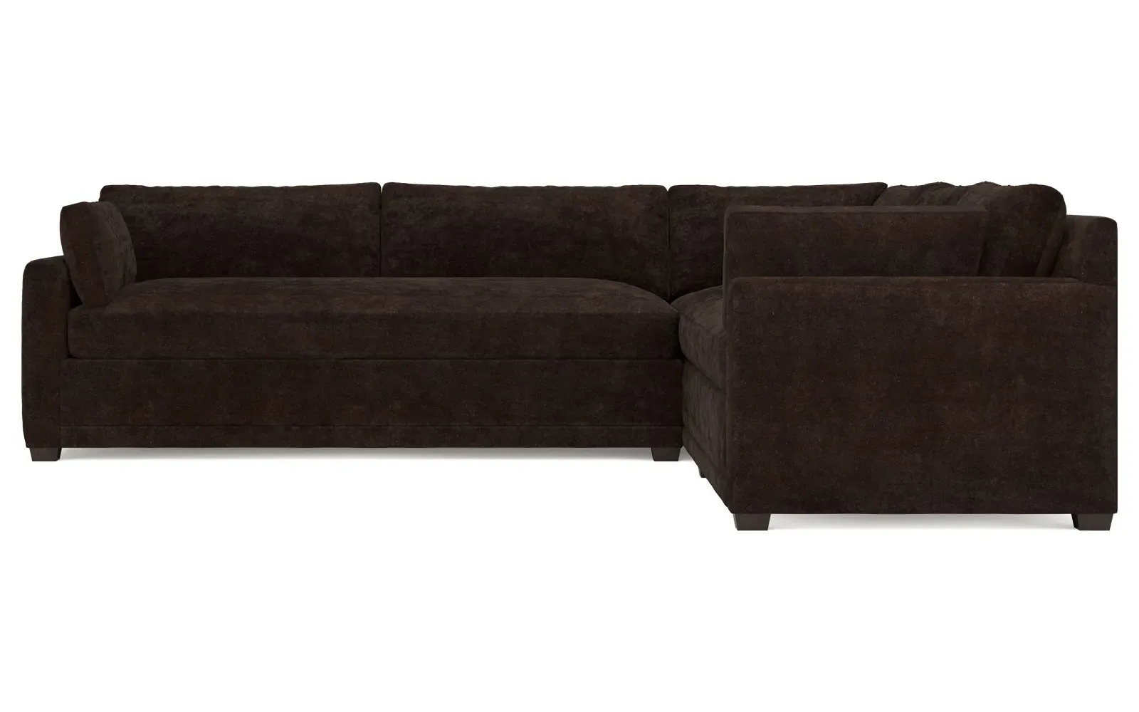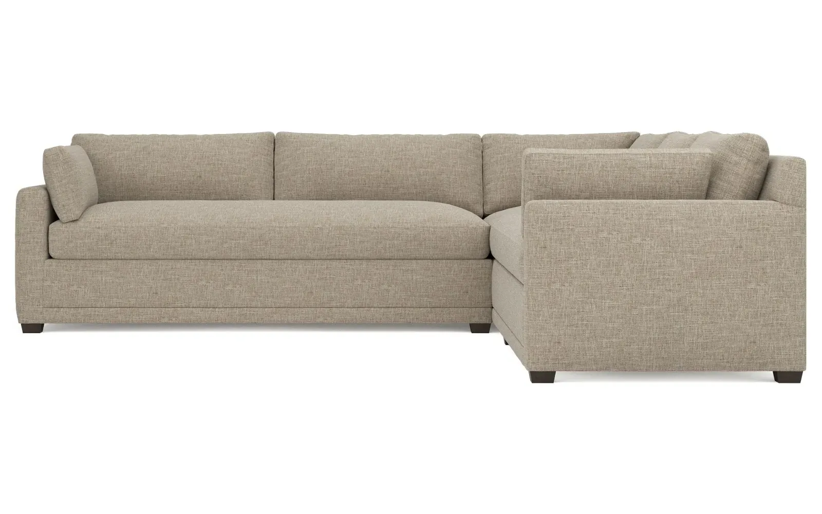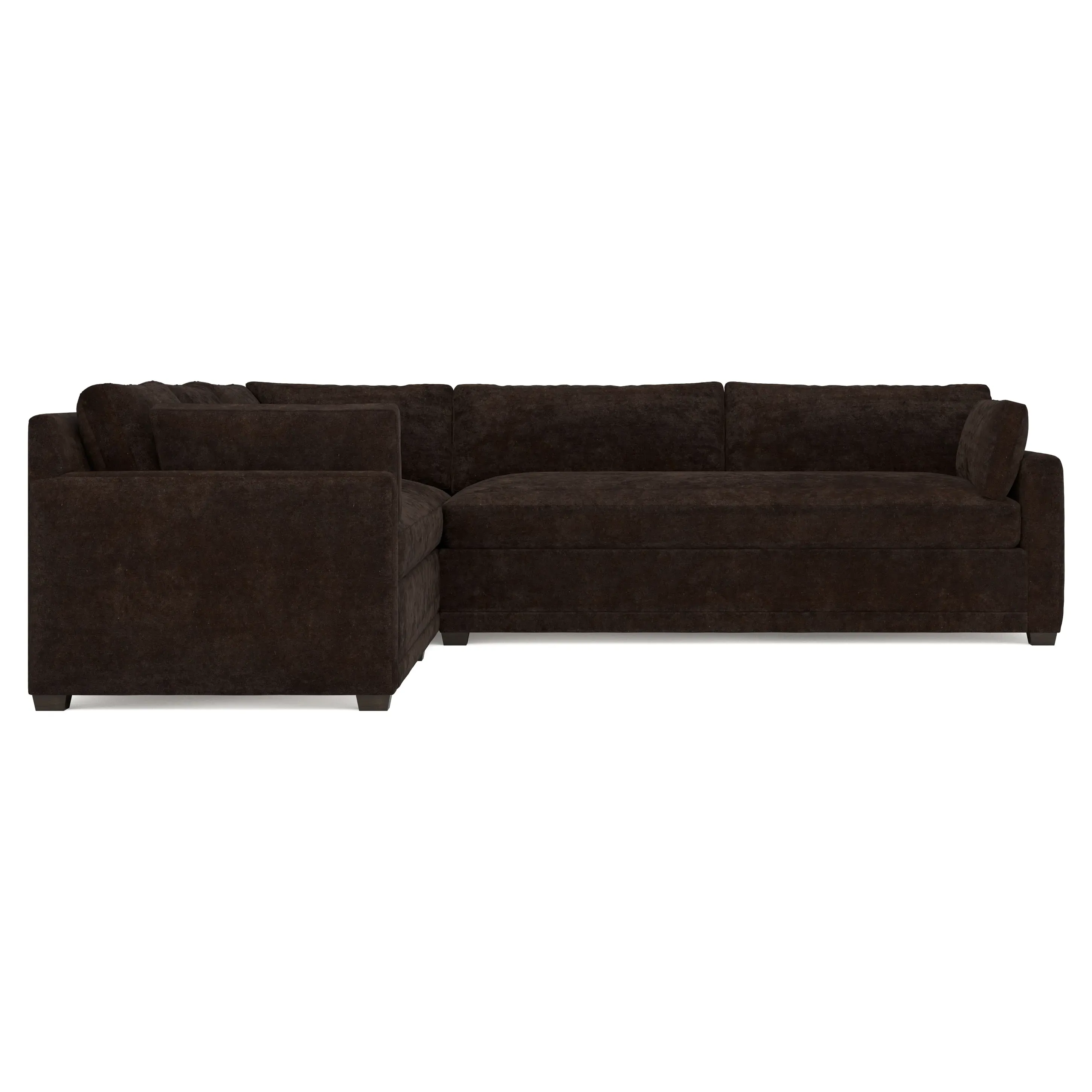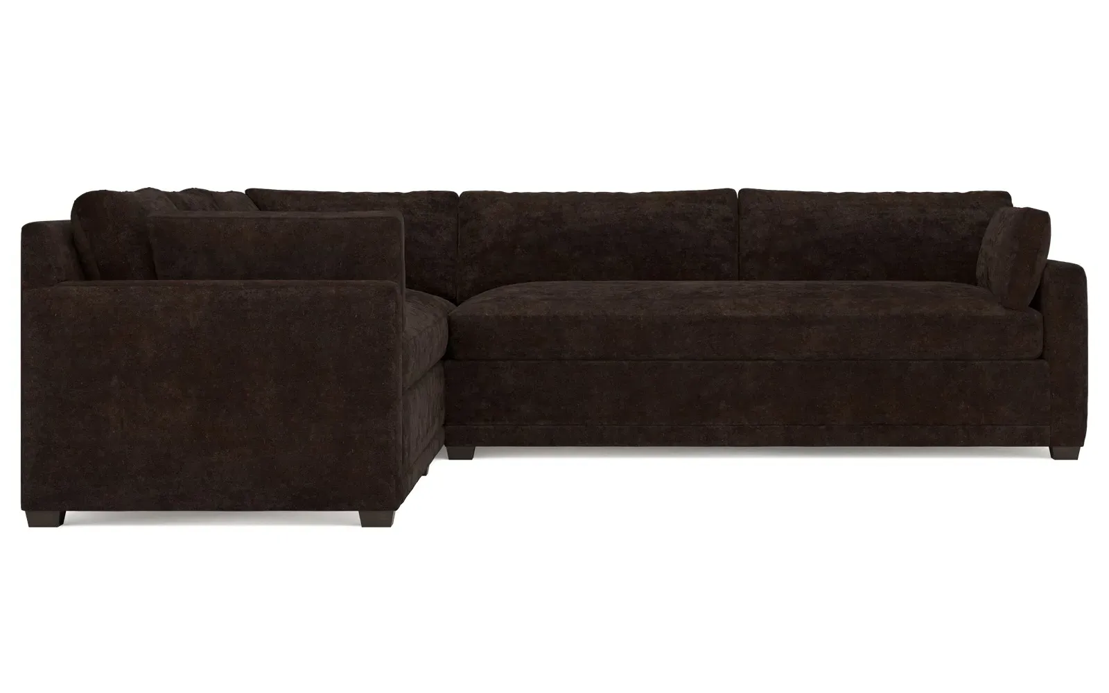 With a generous profile and plush box cushions, the left 123” Weybridge corner sectional is perfect for large gatherings. Streamlined track arms and tapered wood legs elevate the simple, modern silhouette. Soft and supportive cushioning offers plush, cloud-like comfort, with a foam core surrounded by a blend of fiber, down, and feather fill. The long bench seat provides uninterrupted comfort. Choose from a variety of upholstery options, including linen, velvet, and performance fabrics. <b>Overall Dimensions:</b> 123" W x 116" D x 35" H. <b>End Sofa Dimensions:</b> 84” W x 39” D x 35” H; <b>End Sofa with Corner Dimensions:</b> 116” W x 39” D x 35” H; <b>Seat Dimensions:</b> 24” D x 21” H; <b>Arm Height:</b> 25”; <b>Leg Height:</b> 2”. <b>Materials:</b> FSC®-certified, US-sourced, formaldehyde-free solid kiln-dried hardwood and furniture-grade laminates. <b>Material Finish:</b> Espresso. <b>Pieces Included:</b> Right end sofa with corner, left end sofa.