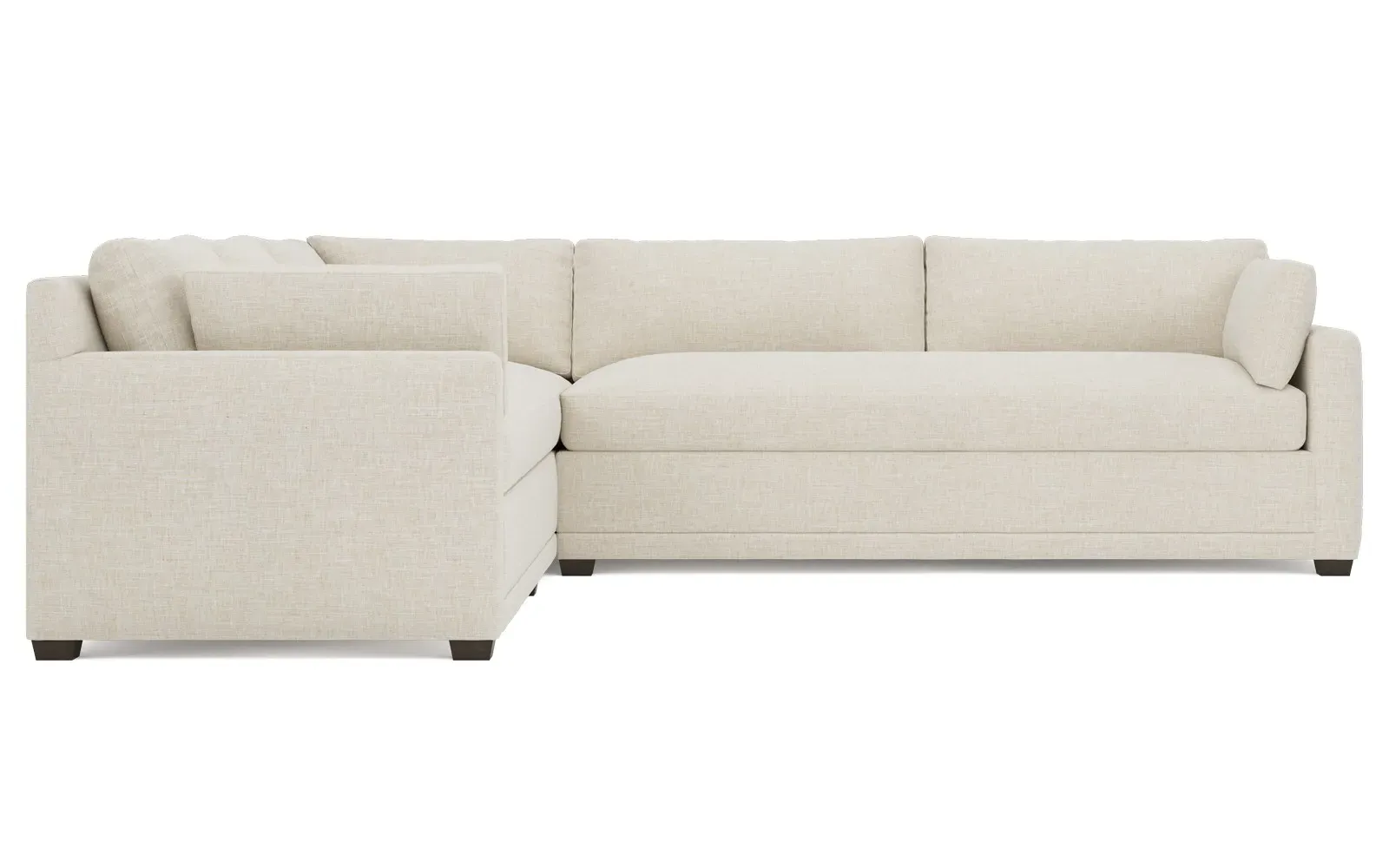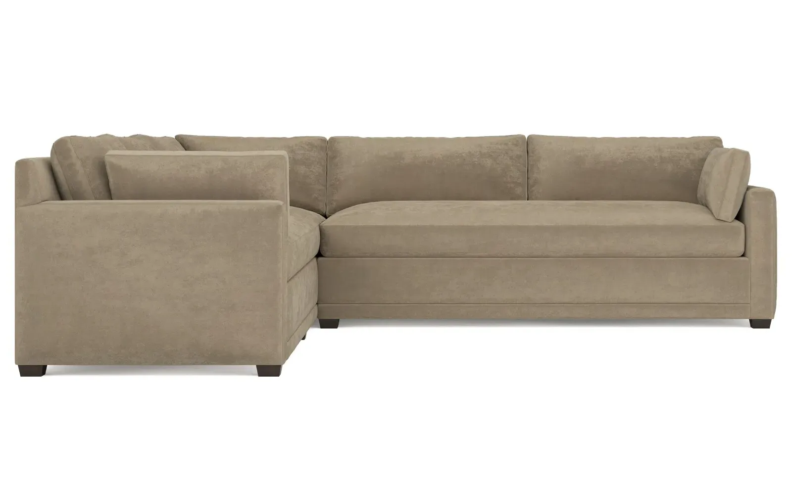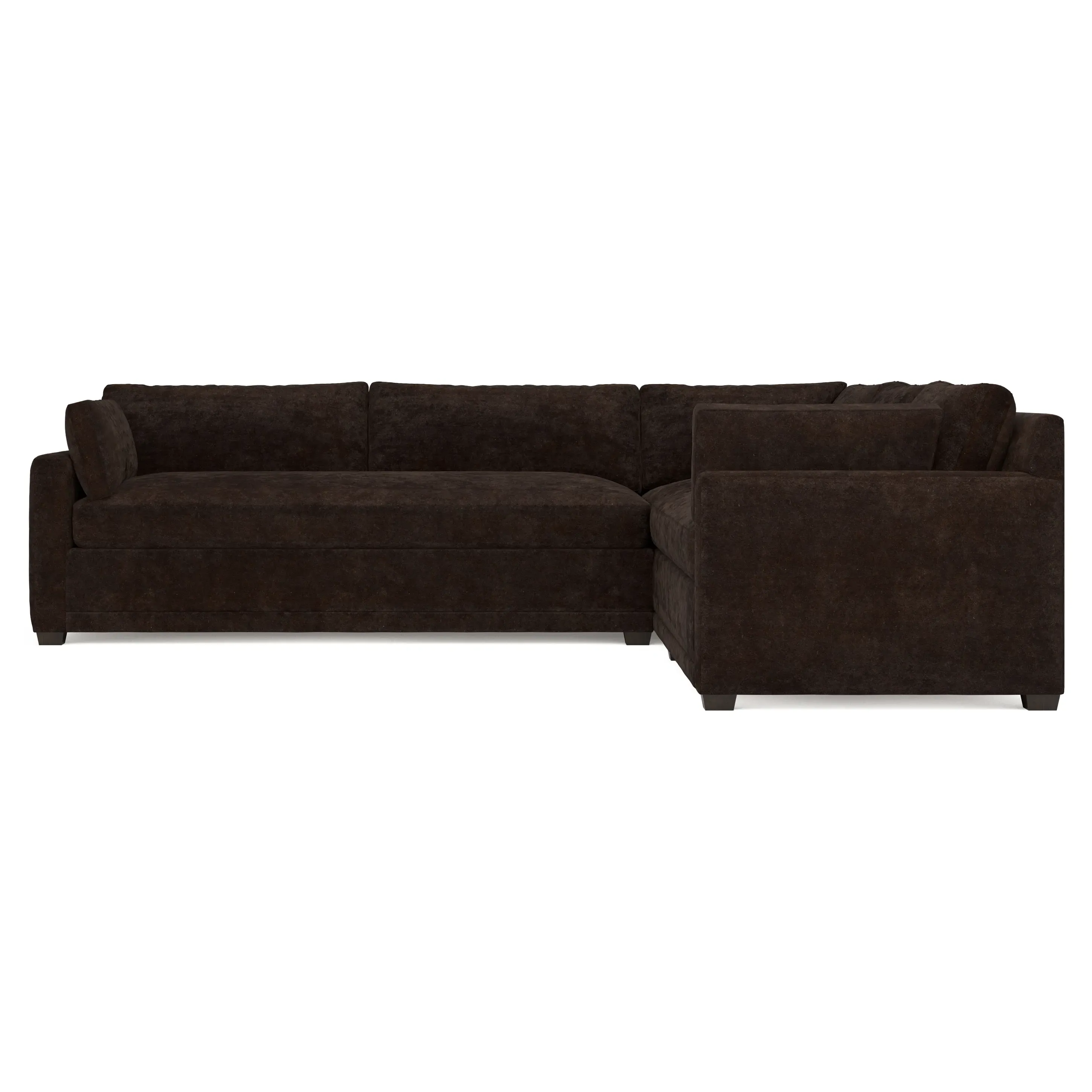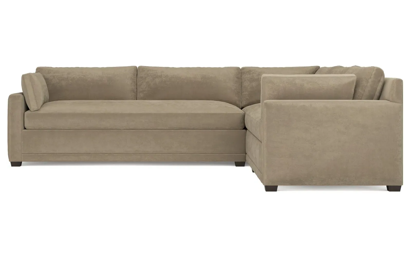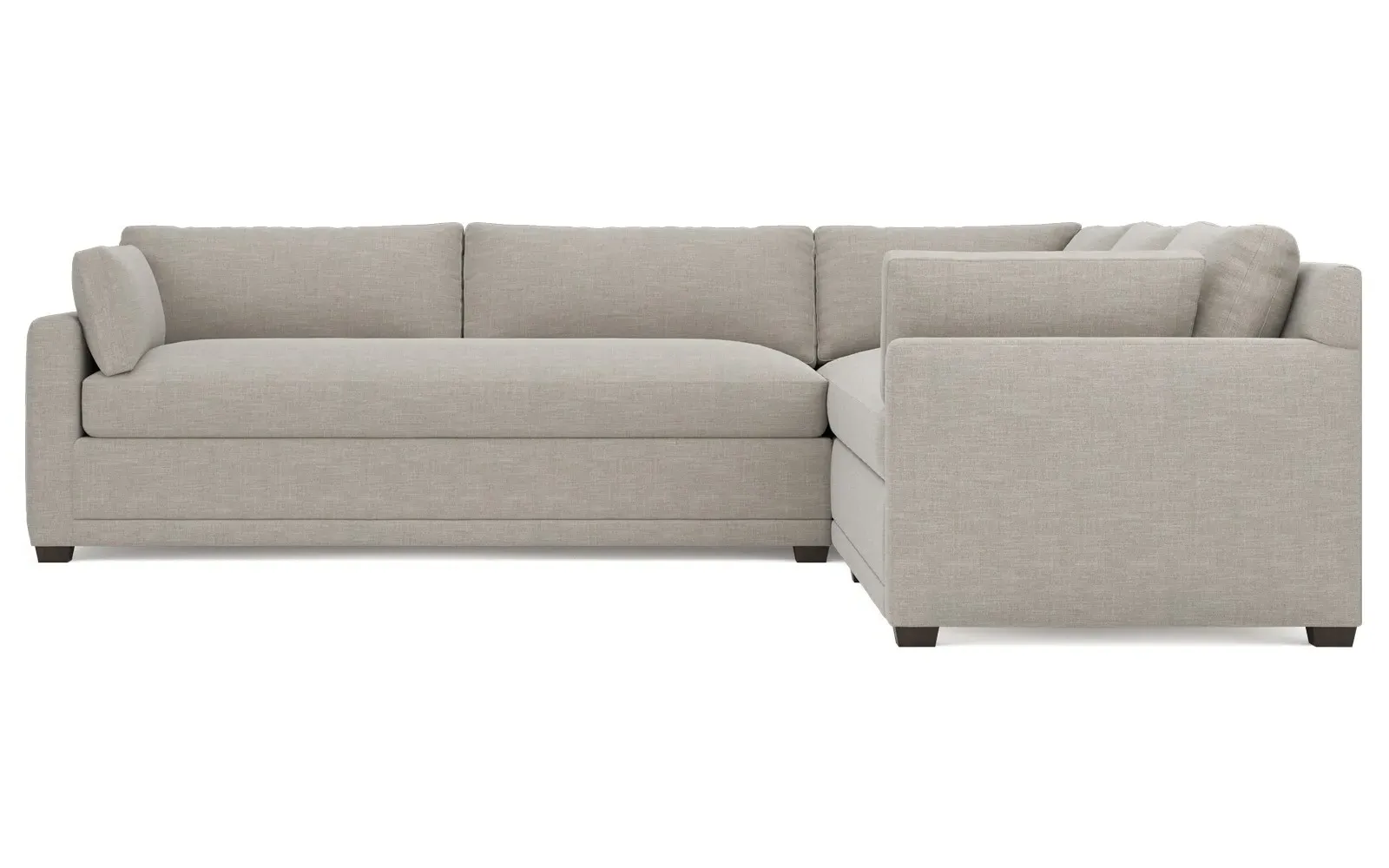 With a generous profile and plush box cushions, the left 123” Weybridge corner sectional is perfect for large gatherings. Streamlined track arms and tapered wood legs elevate the simple, modern silhouette. Soft and supportive cushioning offers plush, cloud-like comfort, with a foam core surrounded by a blend of fiber, down, and feather fill. The long bench seat provides uninterrupted comfort. Choose from a variety of upholstery options, including linen, velvet, and performance fabrics. <b>Overall Dimensions:</b> 123" W x 116" D x 35" H. <b>End Sofa Dimensions:</b> 84” W x 39” D x 35” H; <b>End Sofa with Corner Dimensions:</b> 116” W x 39” D x 35” H; <b>Seat Dimensions:</b> 24” D x 21” H; <b>Arm Height:</b> 25”; <b>Leg Height:</b> 2”. <b>Materials:</b> FSC®-certified, US-sourced, formaldehyde-free solid kiln-dried hardwood and furniture-grade laminates. <b>Material Finish:</b> Espresso. <b>Pieces Included:</b> Right end sofa with corner, left end sofa.