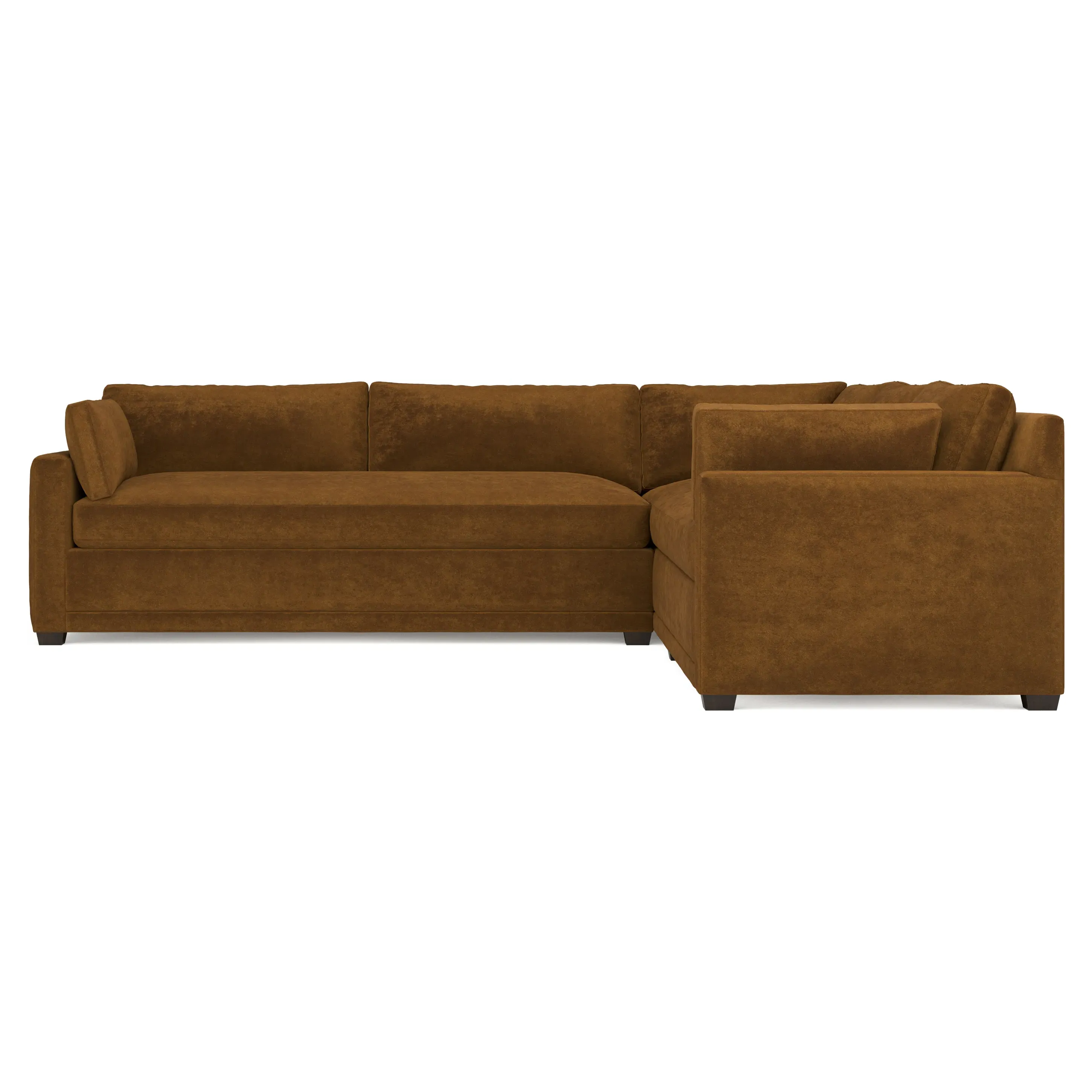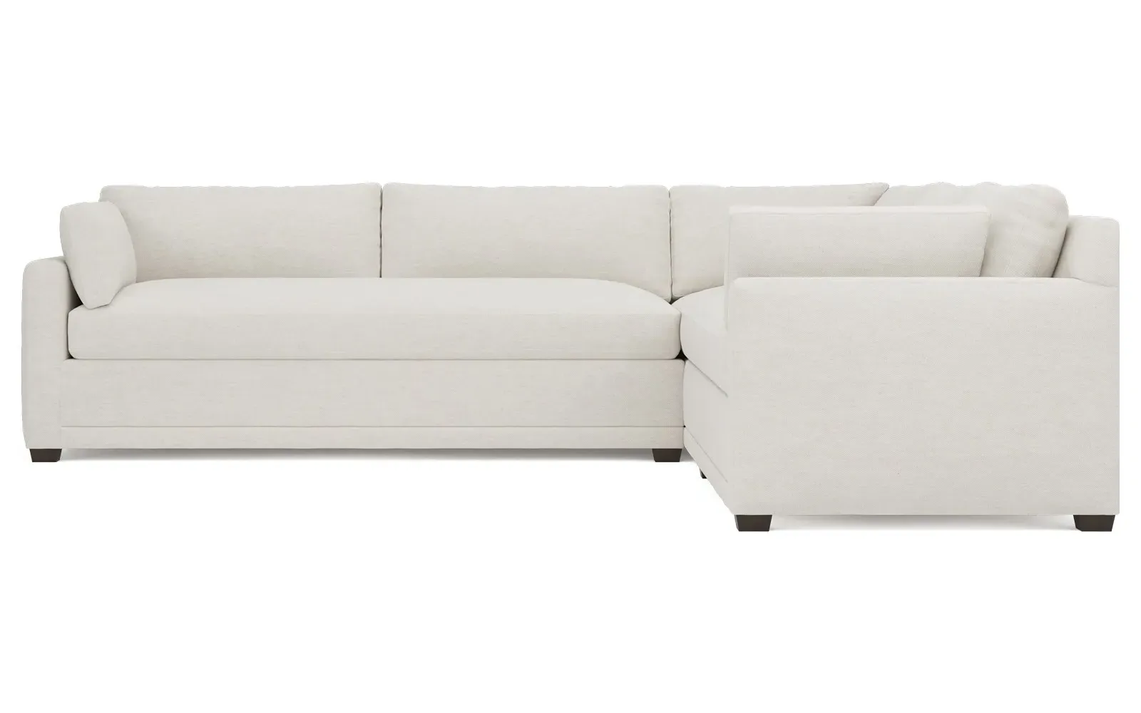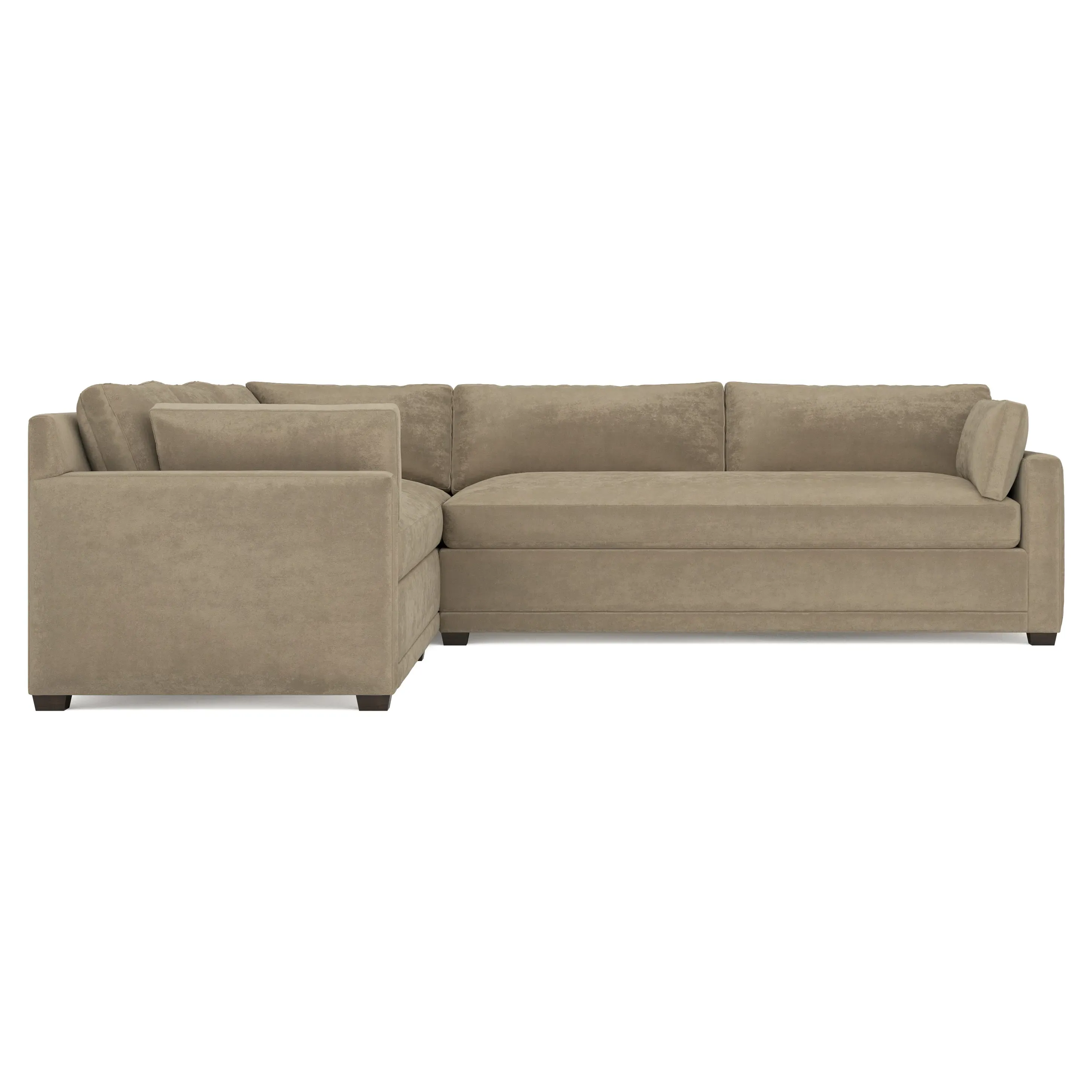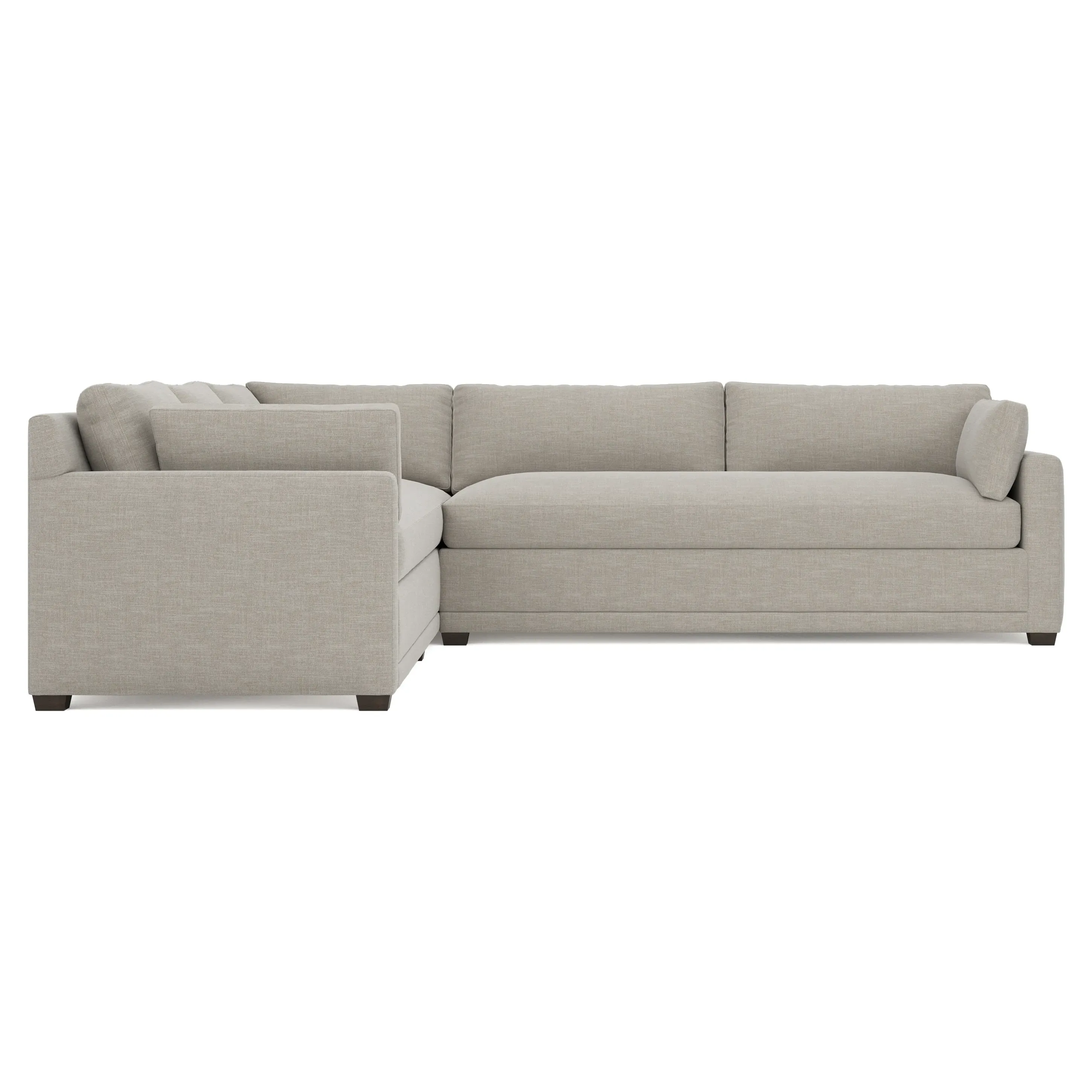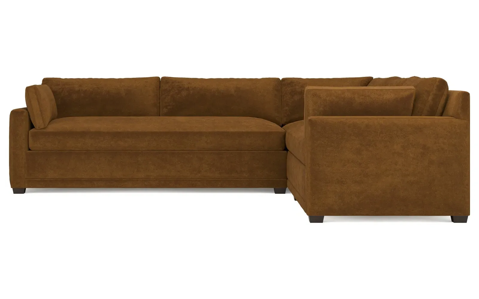 With a generous profile and plush box cushions, the left 123” Weybridge corner sectional is perfect for large gatherings. Streamlined track arms and tapered wood legs elevate the simple, modern silhouette. Soft and supportive cushioning offers plush, cloud-like comfort, with a foam core surrounded by a blend of fiber, down, and feather fill. The long bench seat provides uninterrupted comfort. Choose from a variety of upholstery options, including linen, velvet, and performance fabrics. <b>Overall Dimensions:</b> 123" W x 116" D x 35" H. <b>End Sofa Dimensions:</b> 84” W x 39” D x 35” H; <b>End Sofa with Corner Dimensions:</b> 116” W x 39” D x 35” H; <b>Seat Dimensions:</b> 24” D x 21” H; <b>Arm Height:</b> 25”; <b>Leg Height:</b> 2”. <b>Materials:</b> FSC®-certified, US-sourced, formaldehyde-free solid kiln-dried hardwood and furniture-grade laminates. <b>Material Finish:</b> Espresso. <b>Pieces Included:</b> Right end sofa with corner, left end sofa.