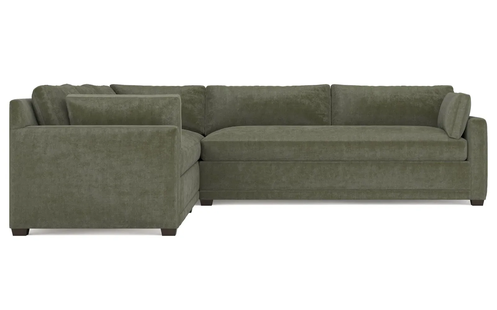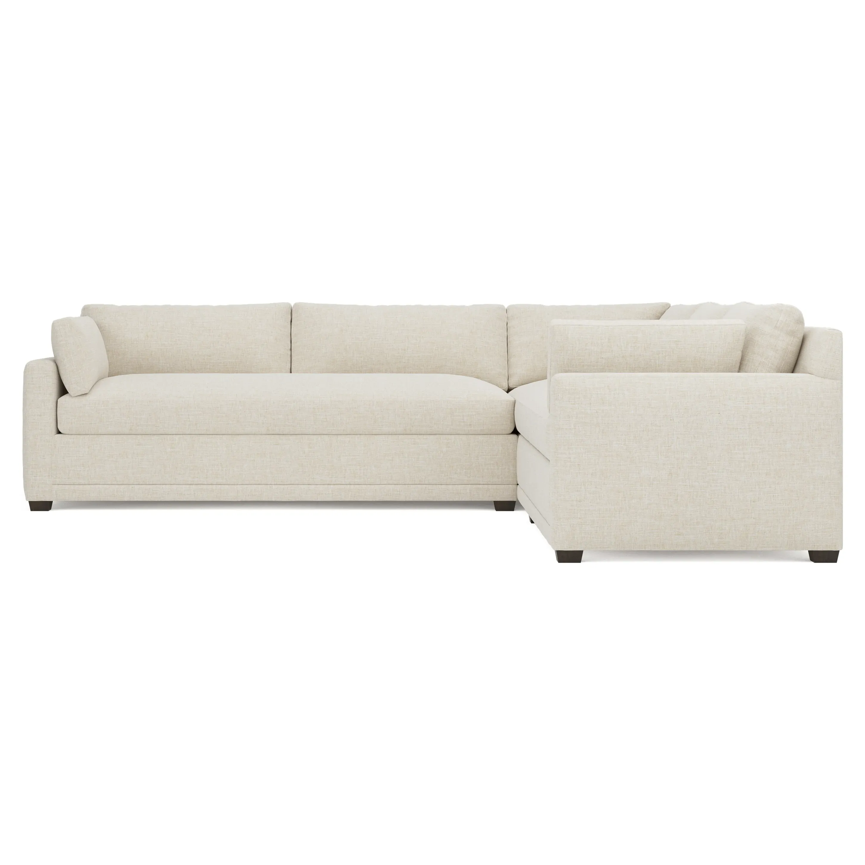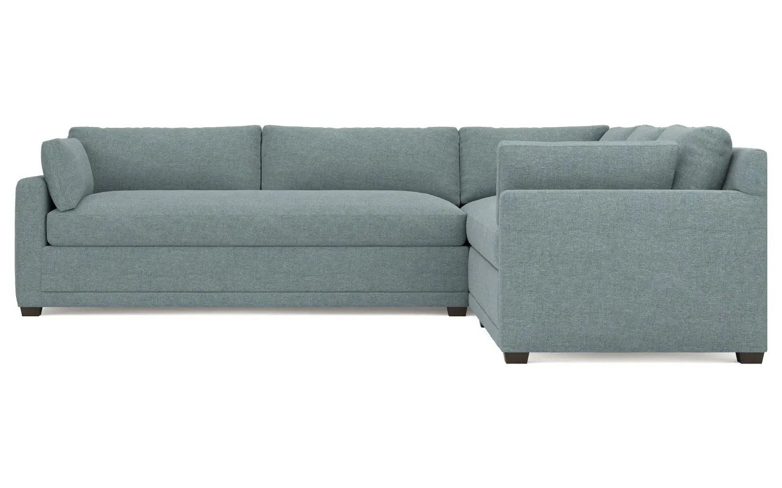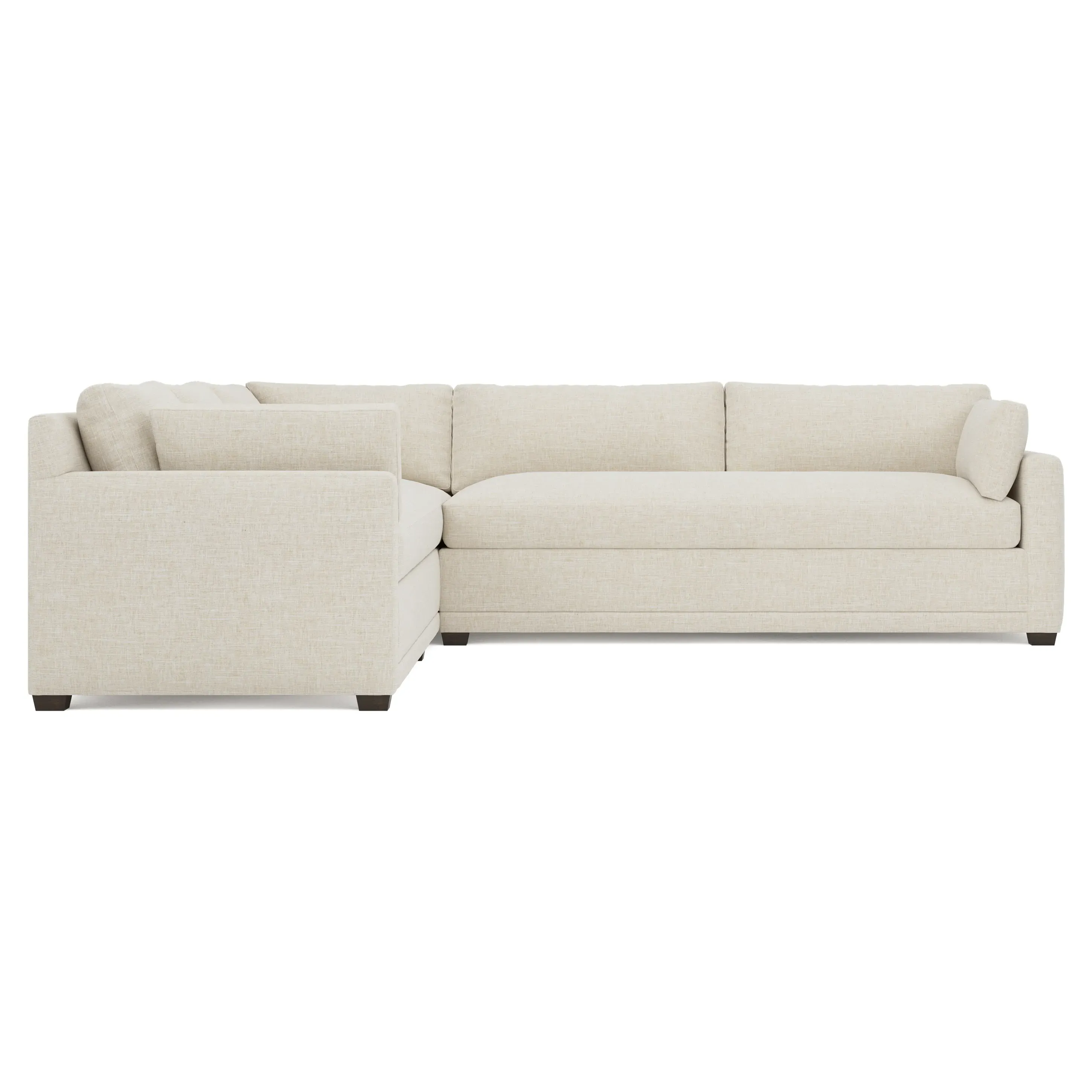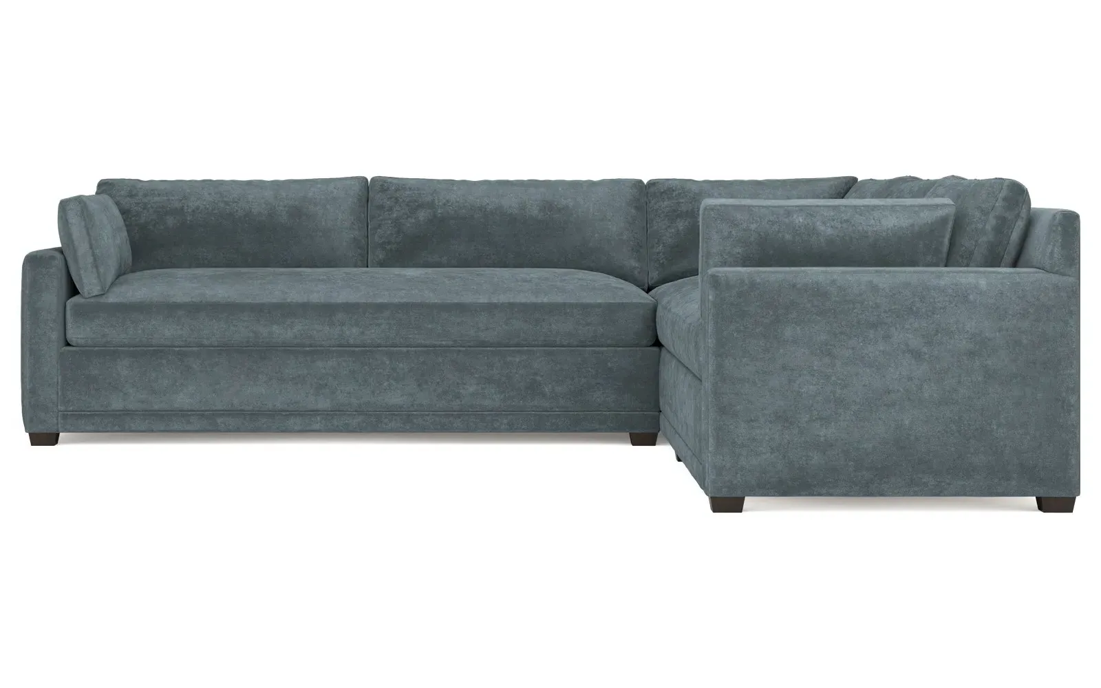 With a generous profile and plush box cushions, the left 123” Weybridge corner sectional is perfect for large gatherings. Streamlined track arms and tapered wood legs elevate the simple, modern silhouette. Soft and supportive cushioning offers plush, cloud-like comfort, with a foam core surrounded by a blend of fiber, down, and feather fill. The long bench seat provides uninterrupted comfort. Choose from a variety of upholstery options, including linen, velvet, and performance fabrics. <b>Overall Dimensions:</b> 123" W x 116" D x 35" H. <b>End Sofa Dimensions:</b> 84” W x 39” D x 35” H; <b>End Sofa with Corner Dimensions:</b> 116” W x 39” D x 35” H; <b>Seat Dimensions:</b> 24” D x 21” H; <b>Arm Height:</b> 25”; <b>Leg Height:</b> 2”. <b>Materials:</b> FSC®-certified, US-sourced, formaldehyde-free solid kiln-dried hardwood and furniture-grade laminates. <b>Material Finish:</b> Espresso. <b>Pieces Included:</b> Right end sofa with corner, left end sofa.