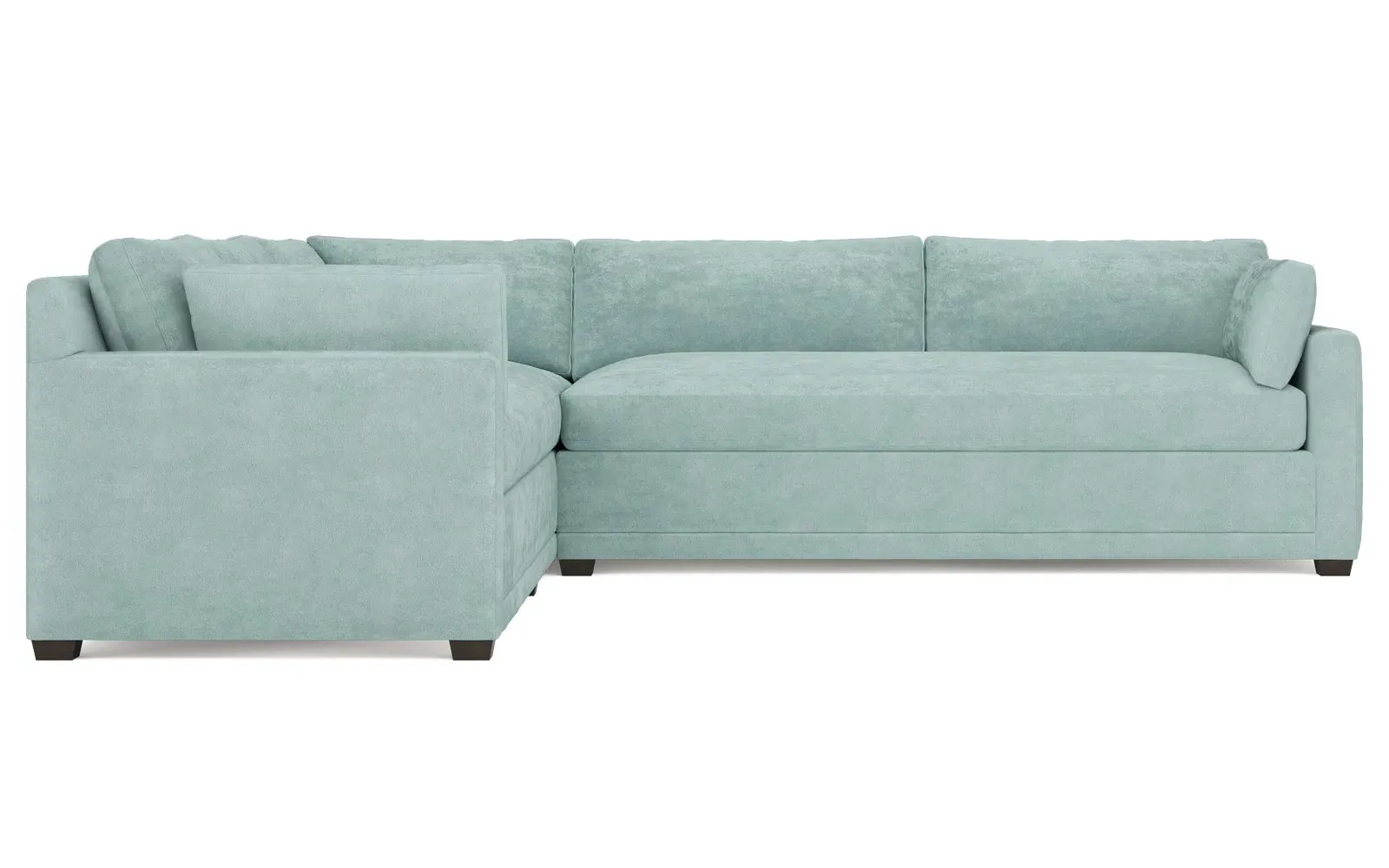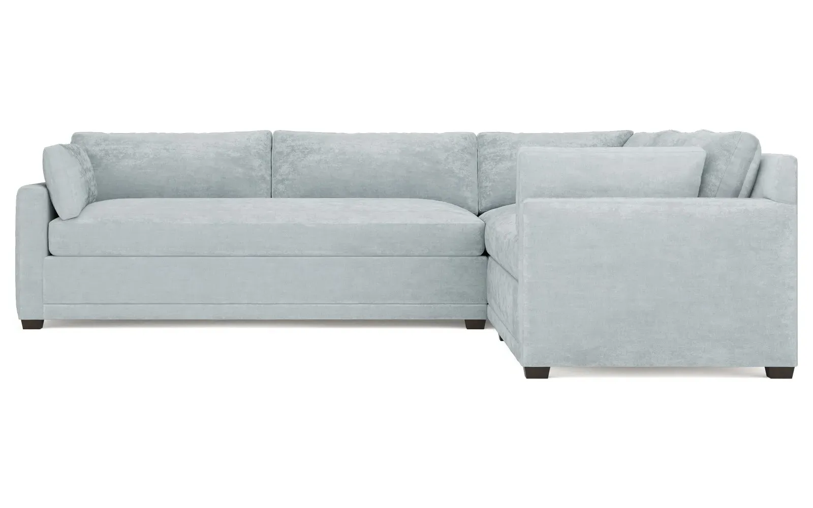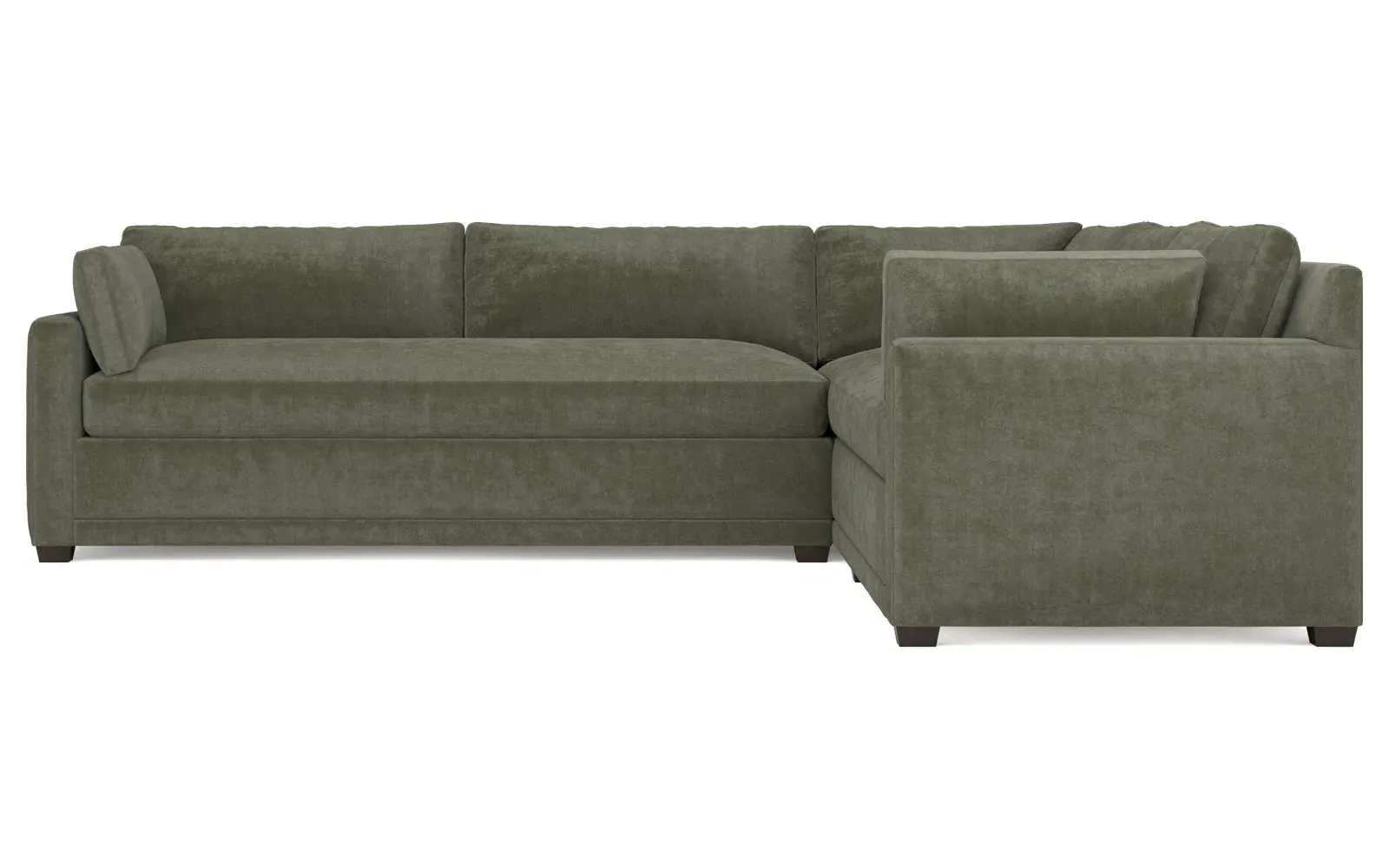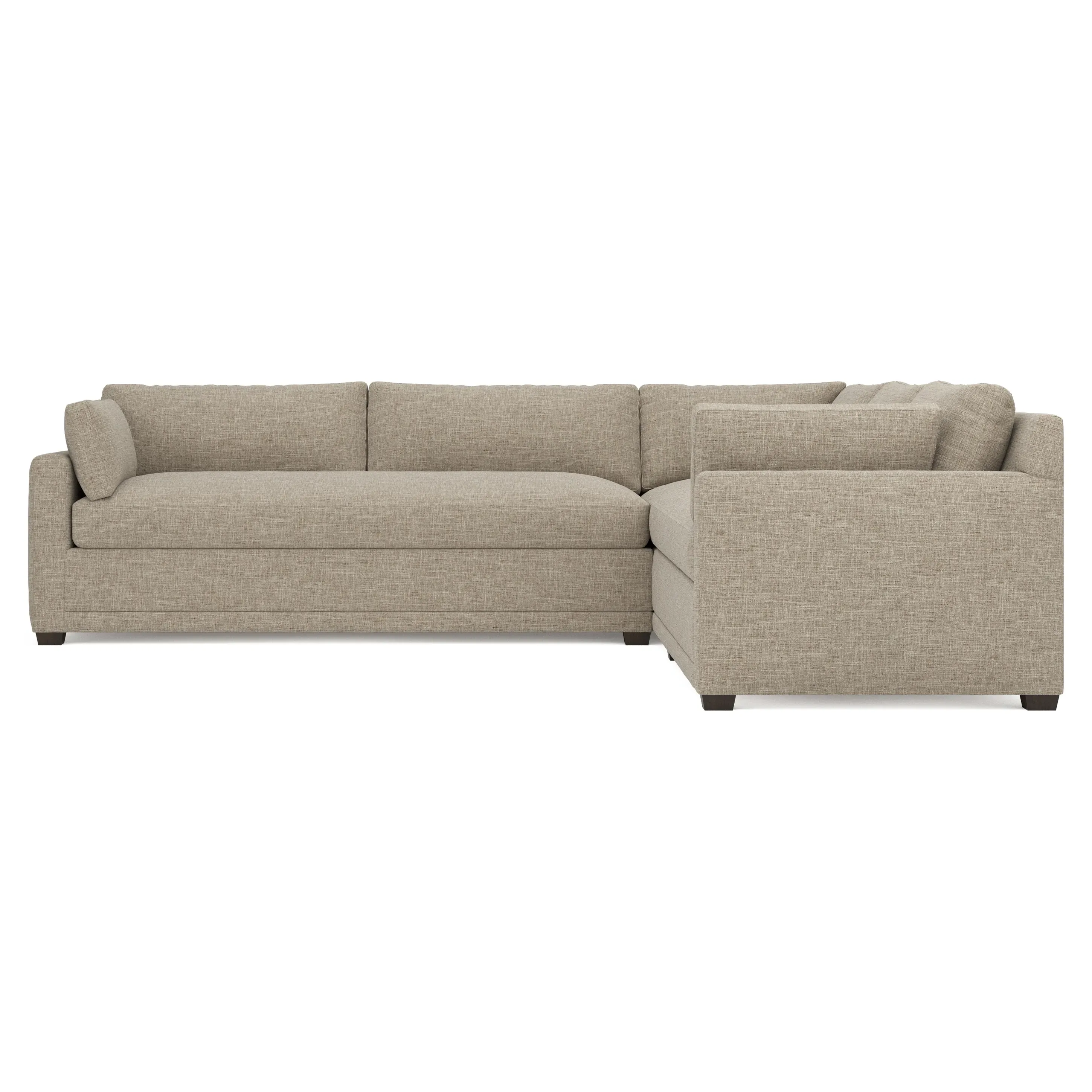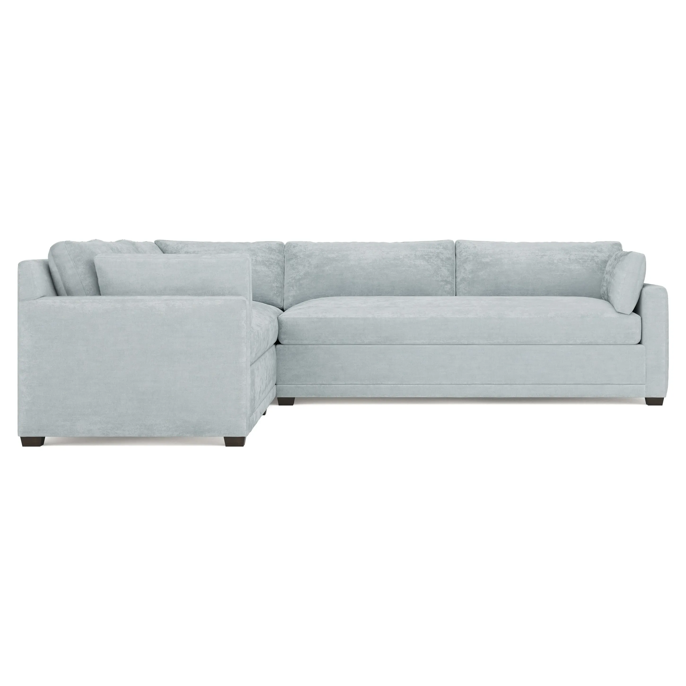 With a generous profile and plush box cushions, the left 123” Weybridge corner sectional is perfect for large gatherings. Streamlined track arms and tapered wood legs elevate the simple, modern silhouette. Soft and supportive cushioning offers plush, cloud-like comfort, with a foam core surrounded by a blend of fiber, down, and feather fill. The long bench seat provides uninterrupted comfort. Choose from a variety of upholstery options, including linen, velvet, and performance fabrics. <b>Overall Dimensions:</b> 123" W x 116" D x 35" H. <b>End Sofa Dimensions:</b> 84” W x 39” D x 35” H; <b>End Sofa with Corner Dimensions:</b> 116” W x 39” D x 35” H; <b>Seat Dimensions:</b> 24” D x 21” H; <b>Arm Height:</b> 25”; <b>Leg Height:</b> 2”. <b>Materials:</b> FSC®-certified, US-sourced, formaldehyde-free solid kiln-dried hardwood and furniture-grade laminates. <b>Material Finish:</b> Espresso. <b>Pieces Included:</b> Right end sofa with corner, left end sofa.