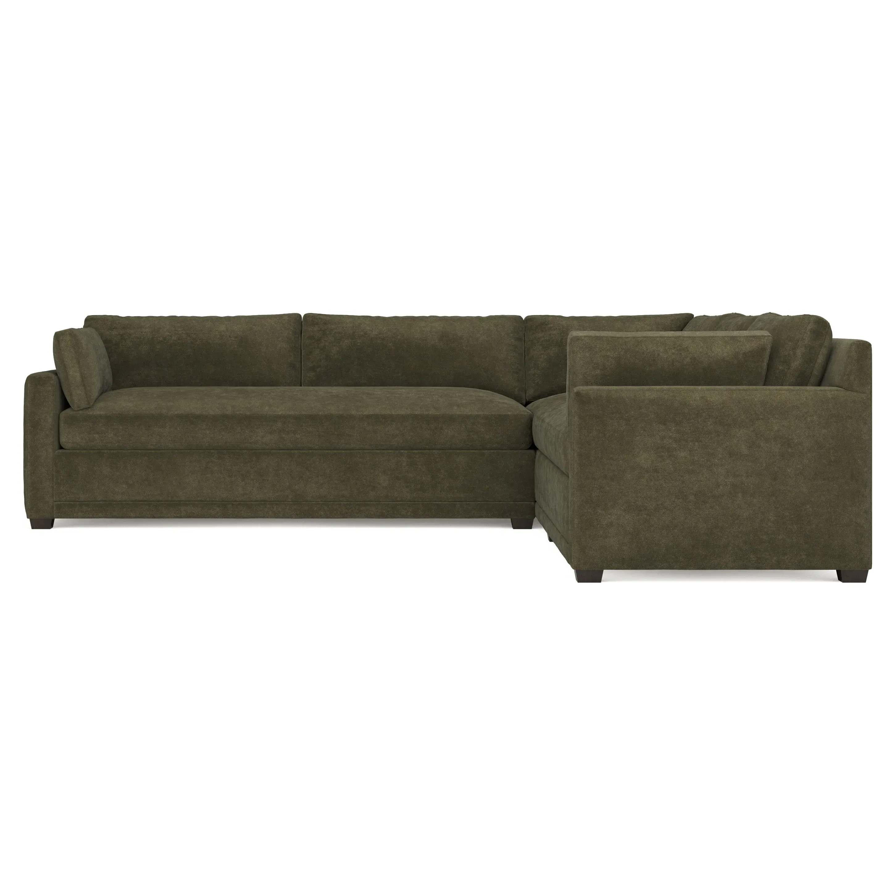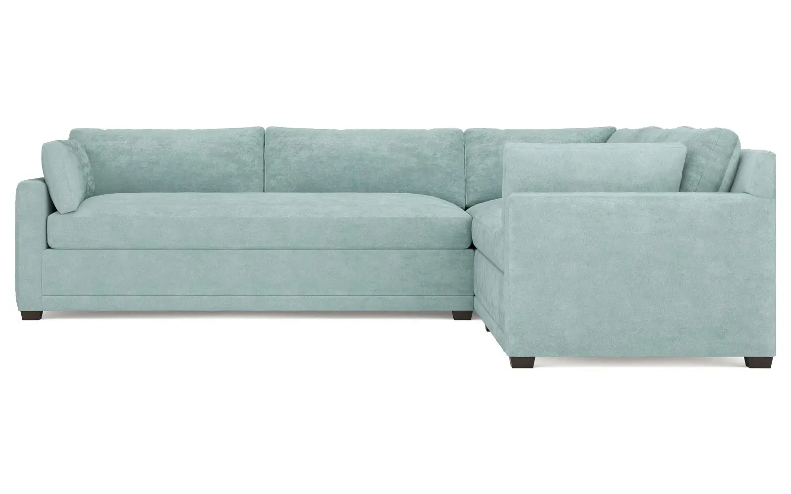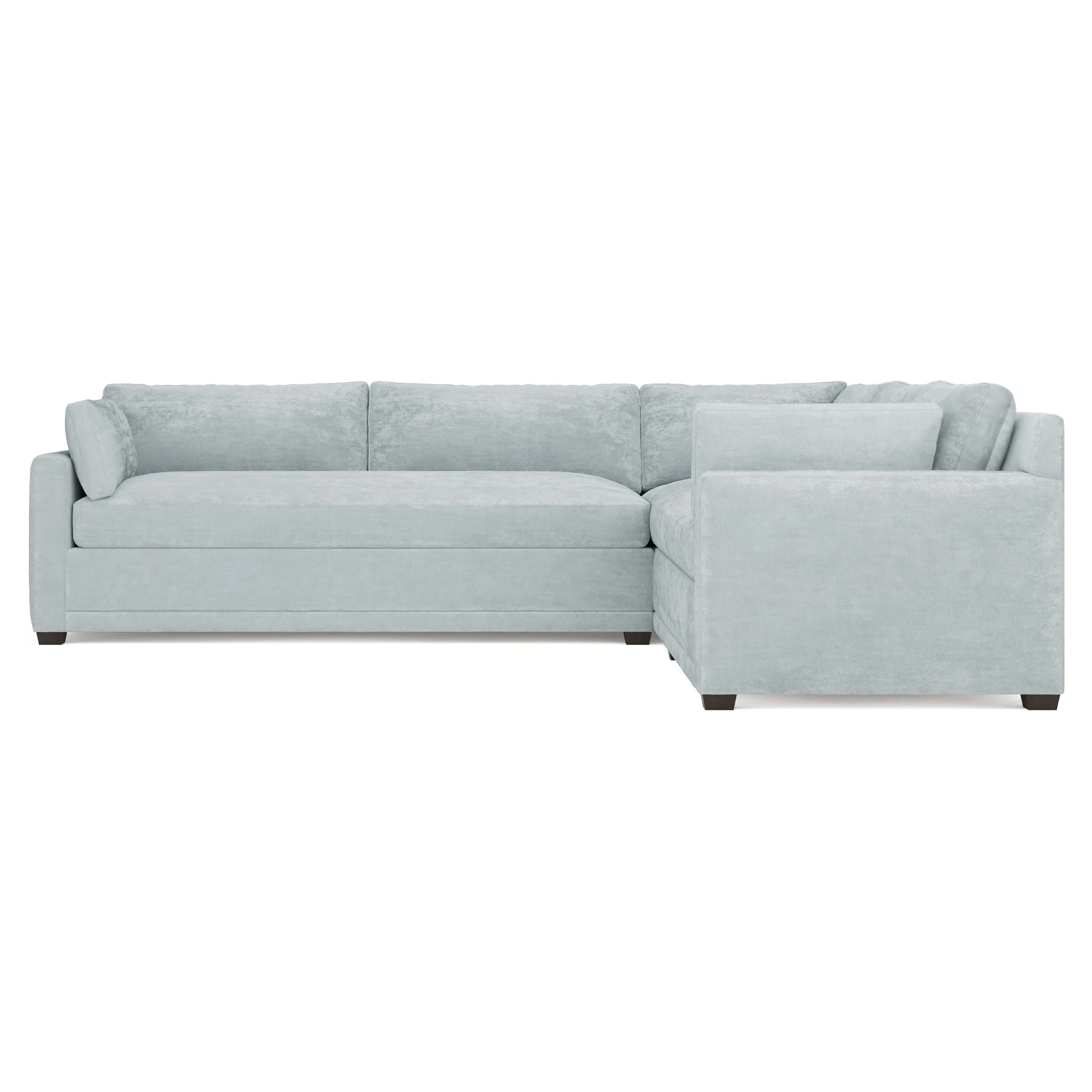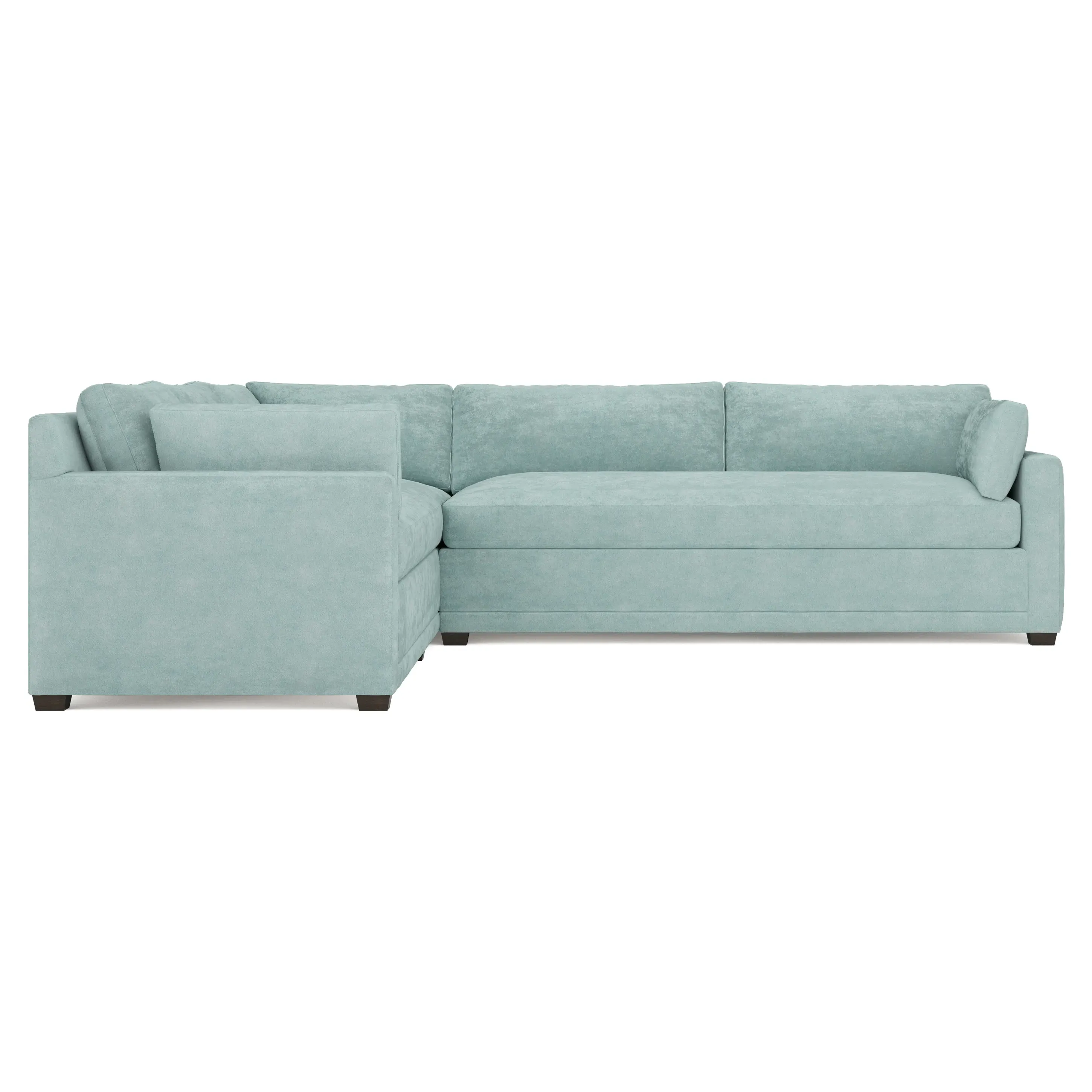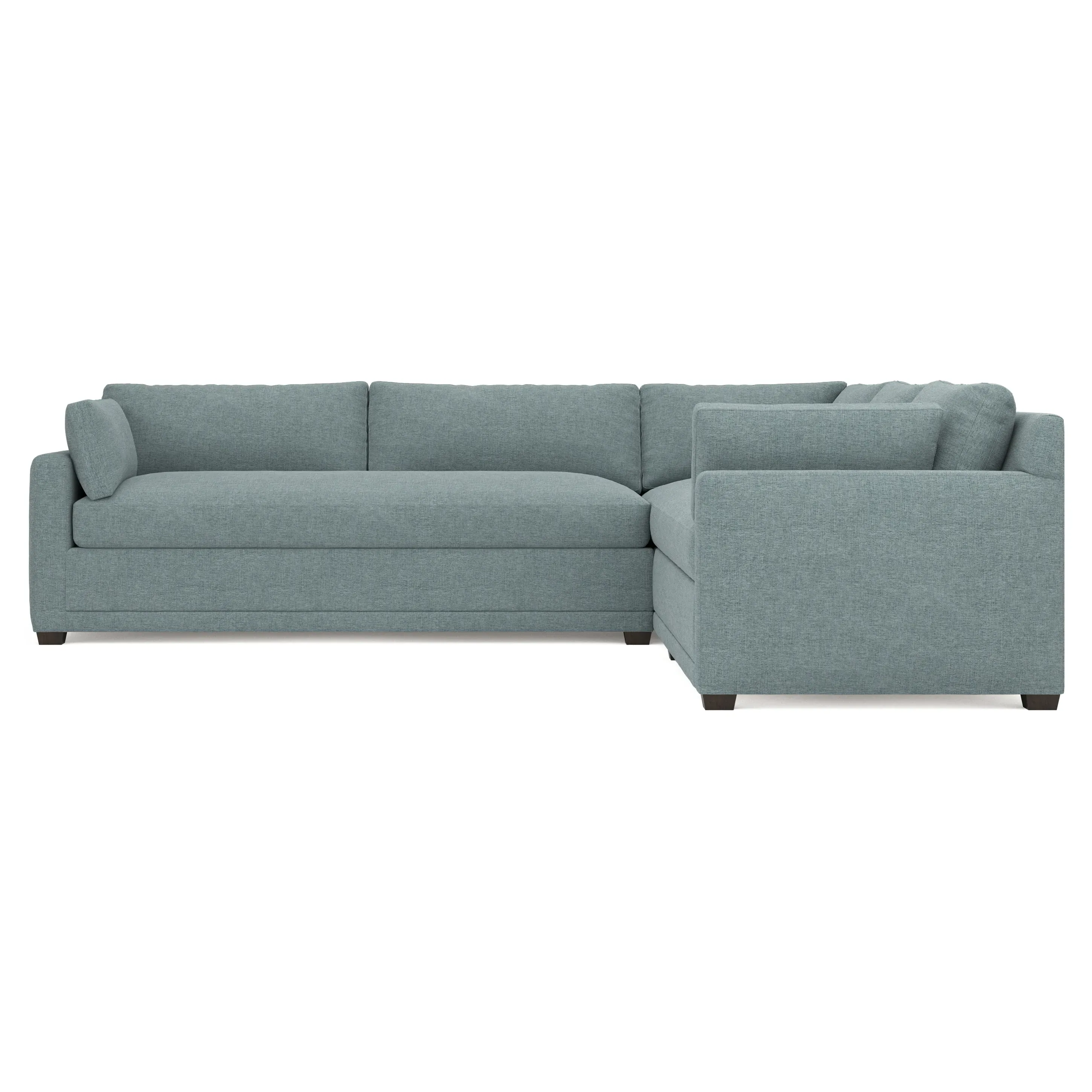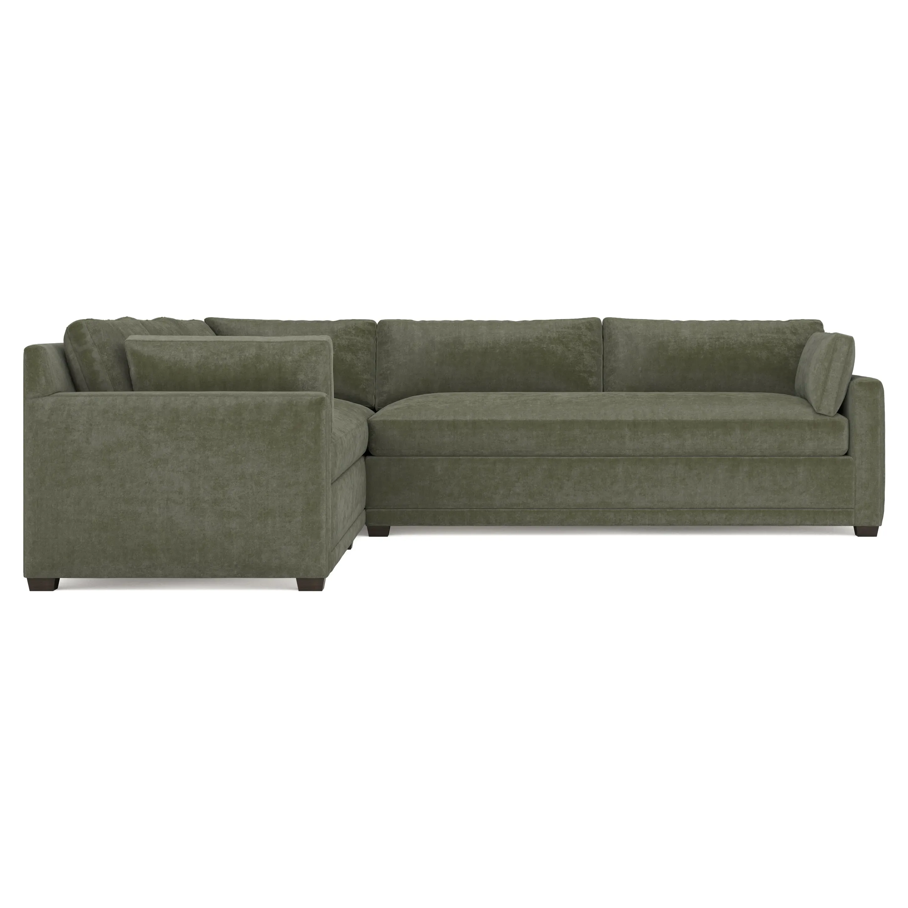With a generous profile and plush box cushions, the left 123” Weybridge corner sectional is perfect for large gatherings. Streamlined track arms and tapered wood legs elevate the simple, modern silhouette. Soft and supportive cushioning offers plush, cloud-like comfort, with a foam core surrounded by a blend of fiber, down, and feather fill. The long bench seat provides uninterrupted comfort. Choose from a variety of upholstery options, including linen, velvet, and performance fabrics. <b>Overall Dimensions:</b> 123" W x 116" D x 35" H. <b>End Sofa Dimensions:</b> 84” W x 39” D x 35” H; <b>End Sofa with Corner Dimensions:</b> 116” W x 39” D x 35” H; <b>Seat Dimensions:</b> 24” D x 21” H; <b>Arm Height:</b> 25”; <b>Leg Height:</b> 2”. <b>Materials:</b> FSC®-certified, US-sourced, formaldehyde-free solid kiln-dried hardwood and furniture-grade laminates. <b>Material Finish:</b> Espresso. <b>Pieces Included:</b> Right end sofa with corner, left end sofa.