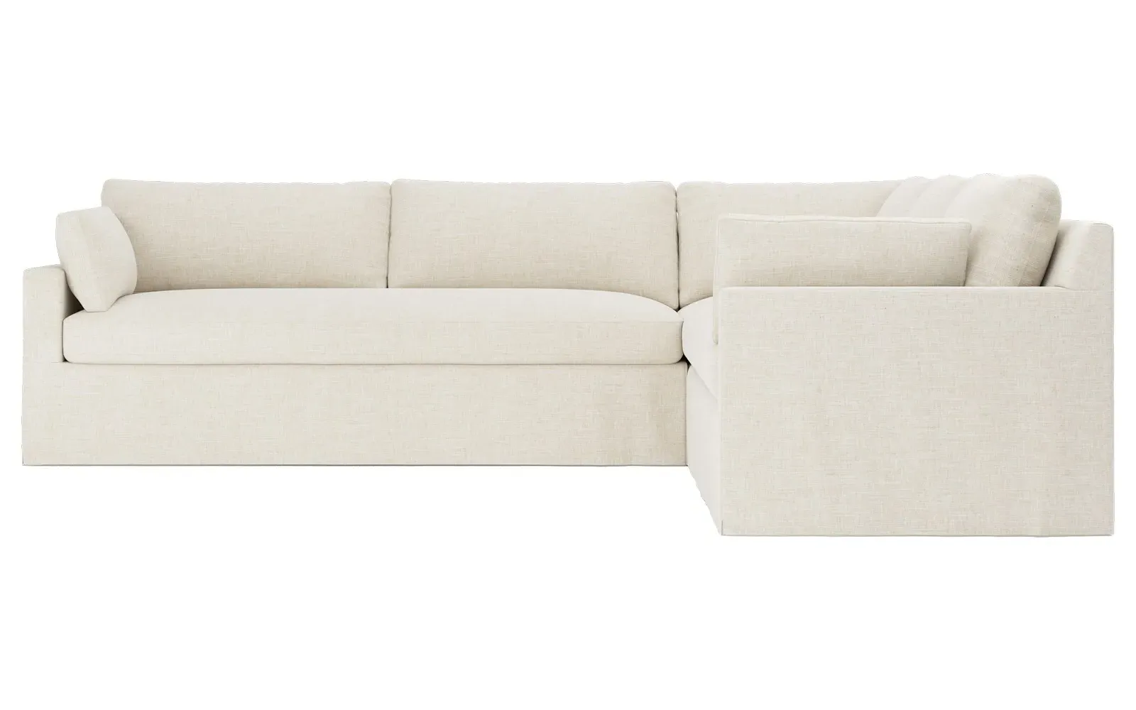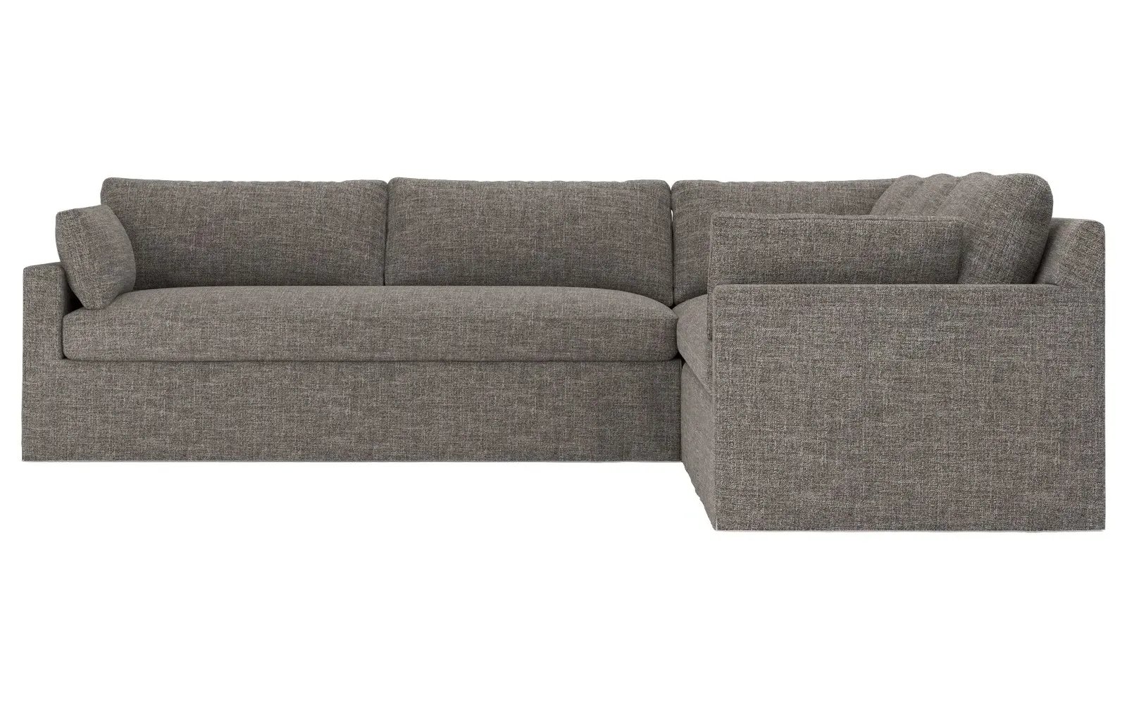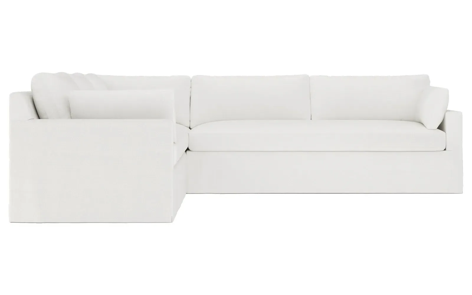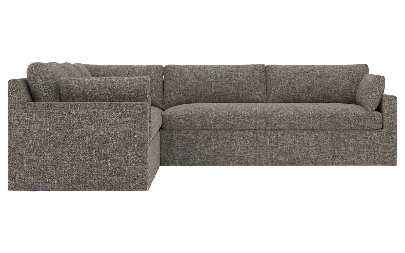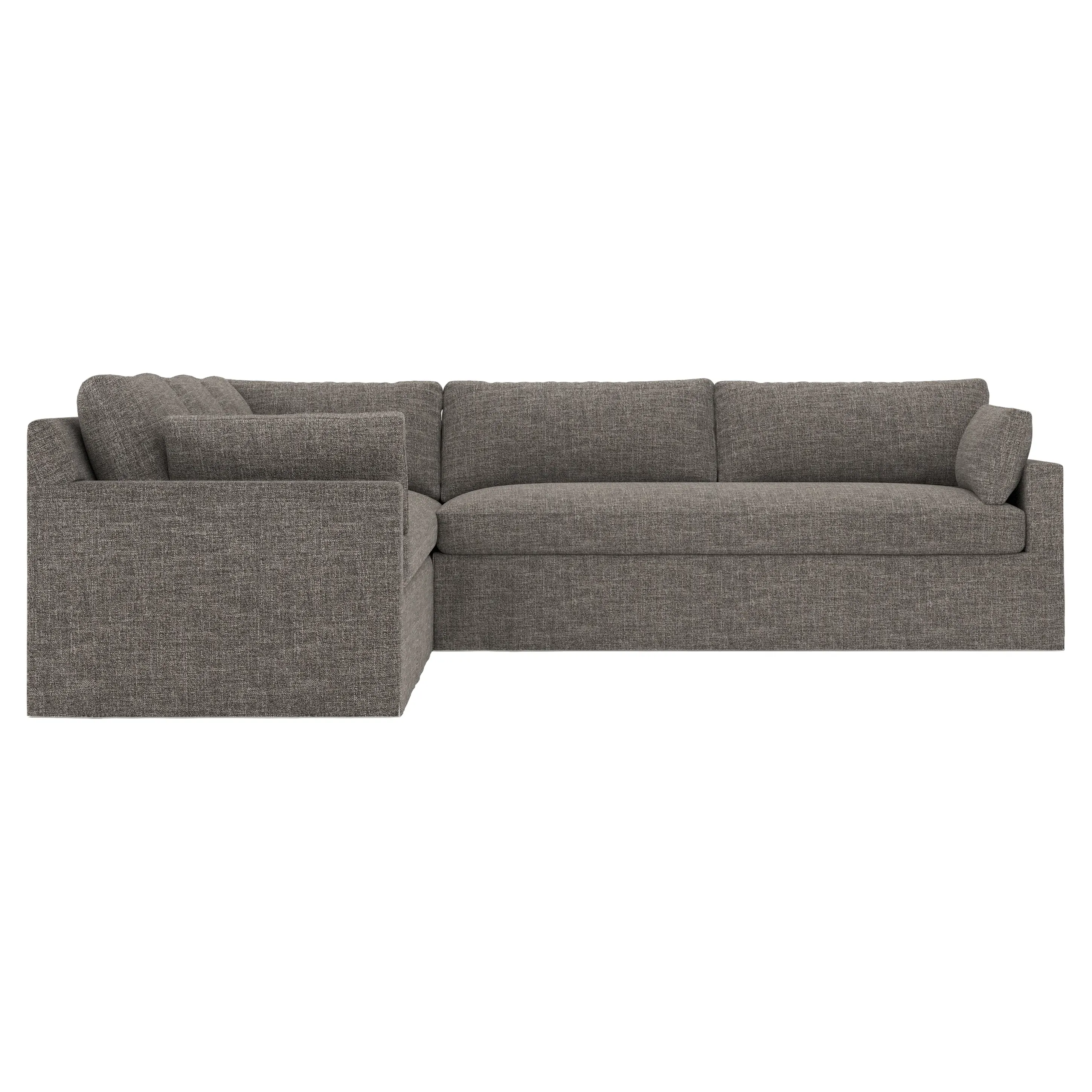 With a generous profile and plush box cushions, the left 123” Weybridge corner sectional is perfect for large gatherings. Streamlined track arms and tapered wood legs elevate the simple, modern silhouette. Soft and supportive cushioning offers plush, cloud-like comfort, with a foam core surrounded by a blend of fiber, down, and feather fill. The long bench seat provides uninterrupted comfort. Choose from a variety of upholstery options, including linen, velvet, and performance fabrics. <b>Overall Dimensions:</b> 123" W x 116" D x 35" H. <b>End Sofa Dimensions:</b> 84” W x 39” D x 35” H; <b>End Sofa with Corner Dimensions:</b> 116” W x 39” D x 35” H; <b>Seat Dimensions:</b> 24” D x 21” H; <b>Arm Height:</b> 25”; <b>Leg Height:</b> 2”. <b>Materials:</b> FSC®-certified, US-sourced, formaldehyde-free solid kiln-dried hardwood and furniture-grade laminates. <b>Material Finish:</b> Espresso. <b>Pieces Included:</b> Right end sofa with corner, left end sofa.