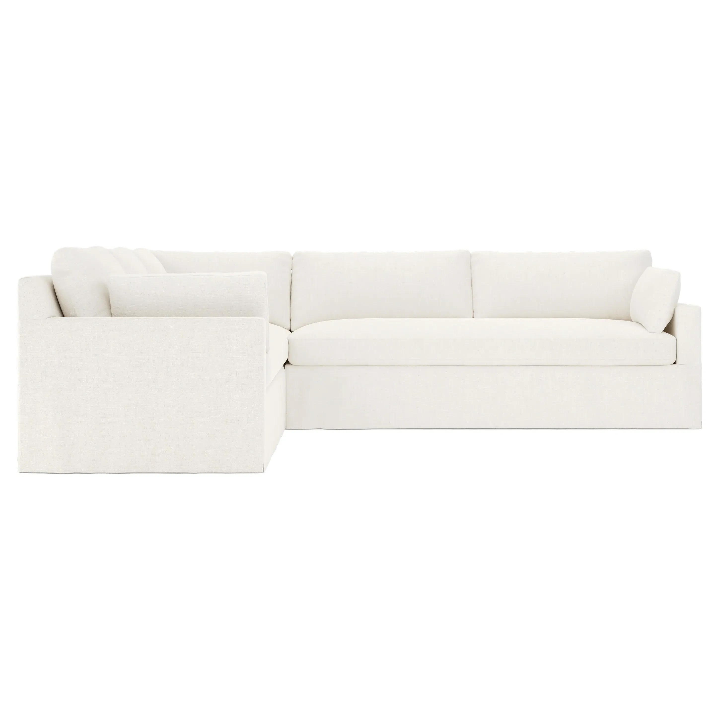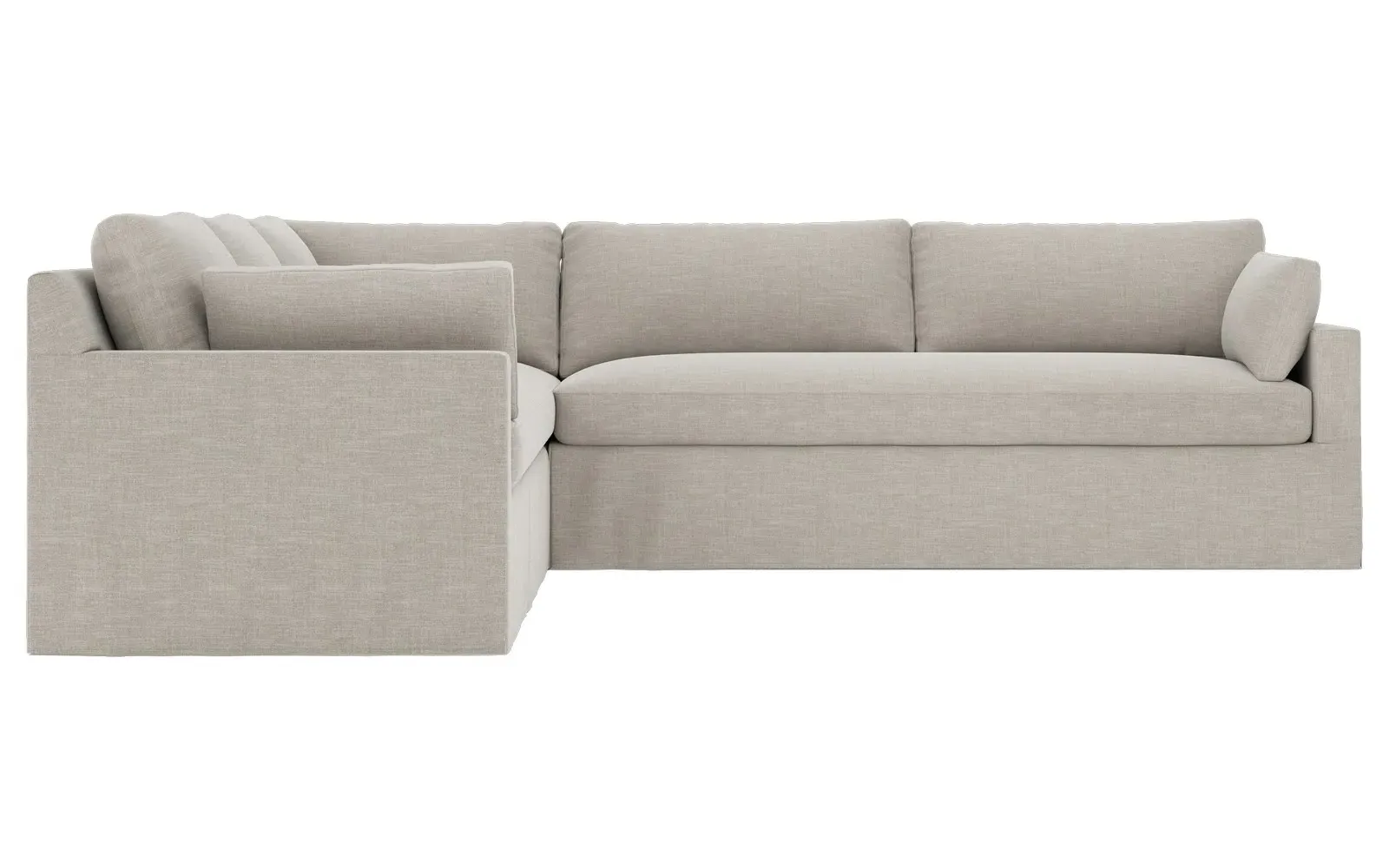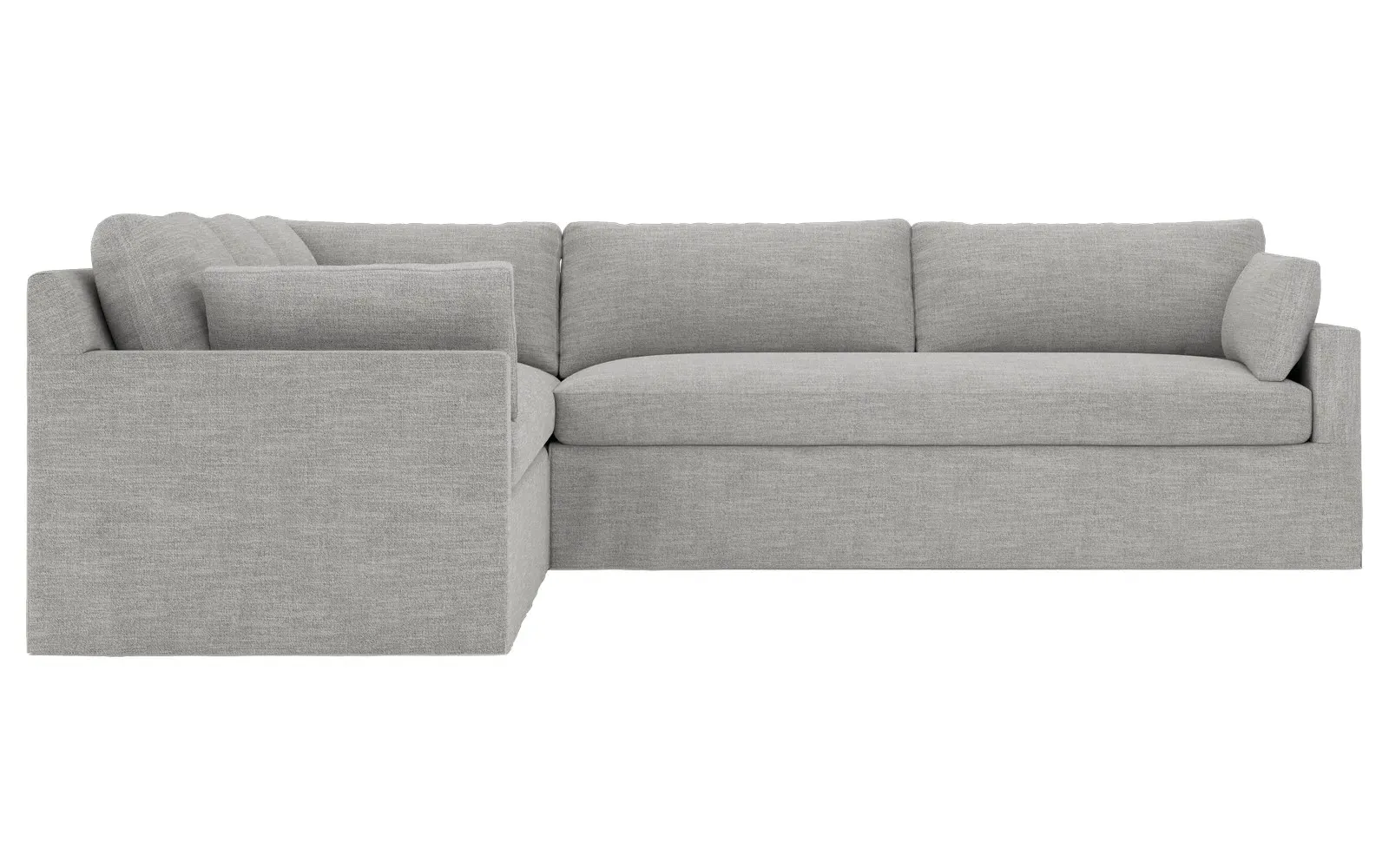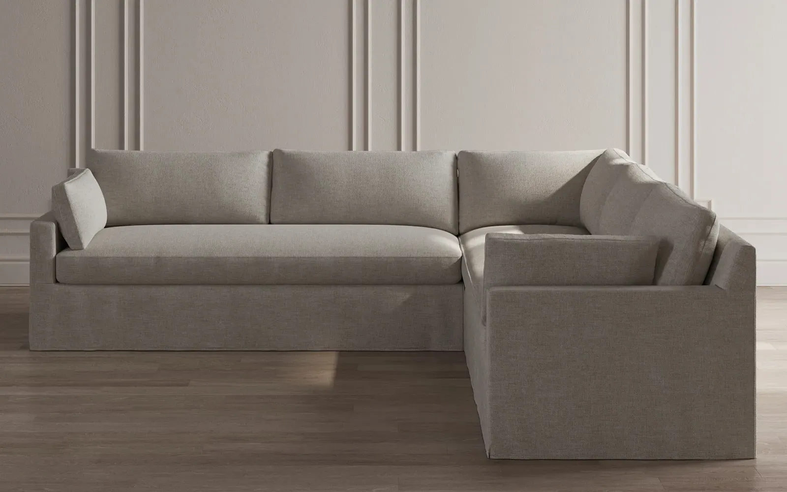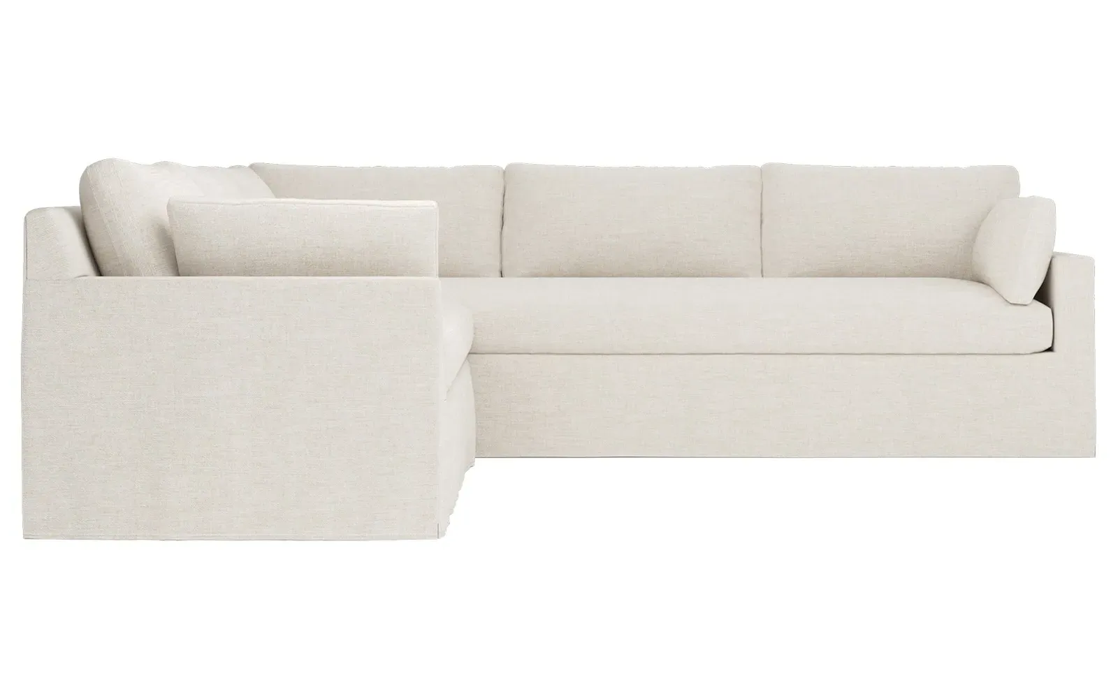 With a generous profile and plush box cushions, the left 123” Weybridge corner sectional is perfect for large gatherings. Streamlined track arms and tapered wood legs elevate the simple, modern silhouette. Soft and supportive cushioning offers plush, cloud-like comfort, with a foam core surrounded by a blend of fiber, down, and feather fill. The long bench seat provides uninterrupted comfort. Choose from a variety of upholstery options, including linen, velvet, and performance fabrics. <b>Overall Dimensions:</b> 123" W x 116" D x 35" H. <b>End Sofa Dimensions:</b> 84” W x 39” D x 35” H; <b>End Sofa with Corner Dimensions:</b> 116” W x 39” D x 35” H; <b>Seat Dimensions:</b> 24” D x 21” H; <b>Arm Height:</b> 25”; <b>Leg Height:</b> 2”. <b>Materials:</b> FSC®-certified, US-sourced, formaldehyde-free solid kiln-dried hardwood and furniture-grade laminates. <b>Material Finish:</b> Espresso. <b>Pieces Included:</b> Right end sofa with corner, left end sofa.