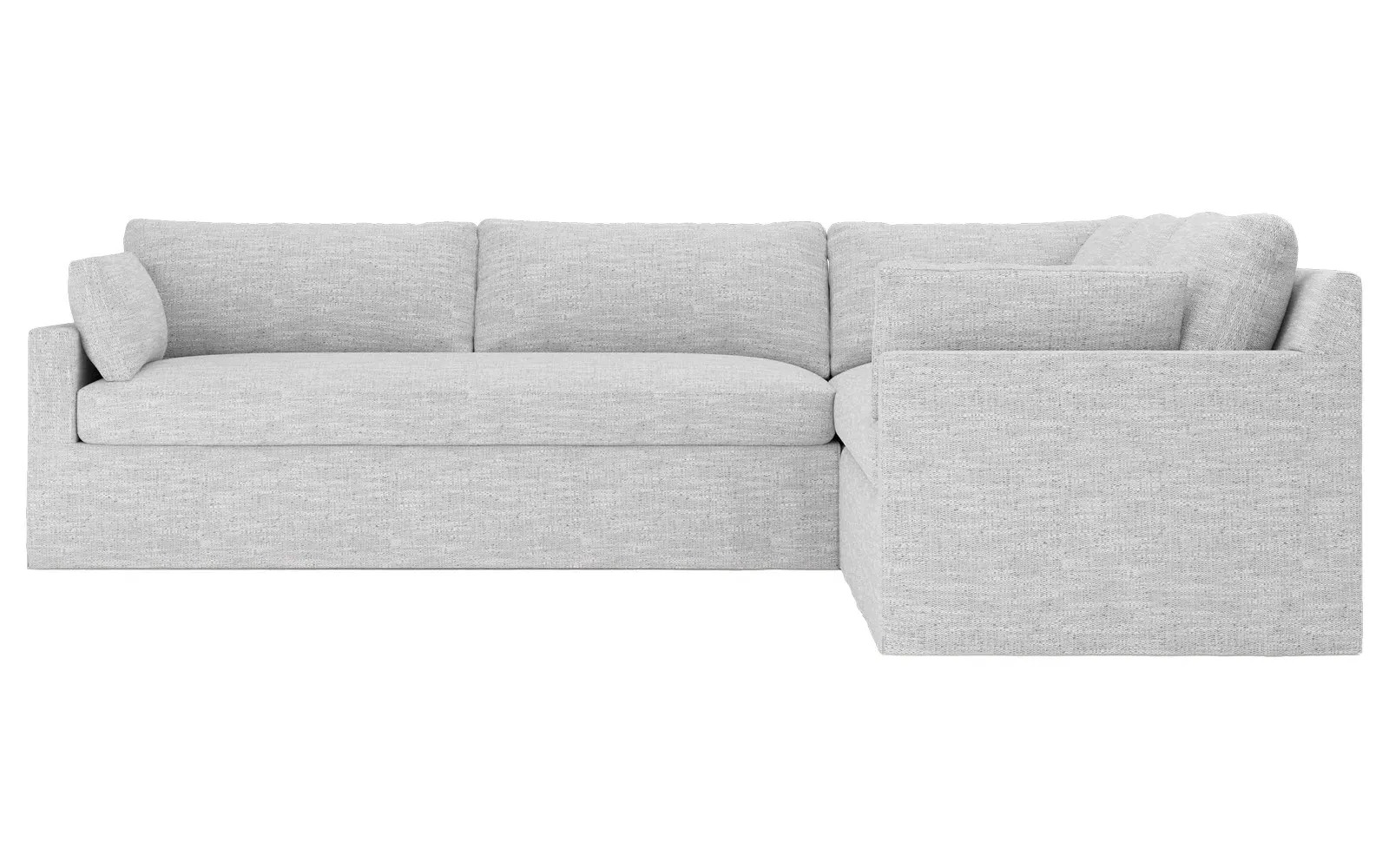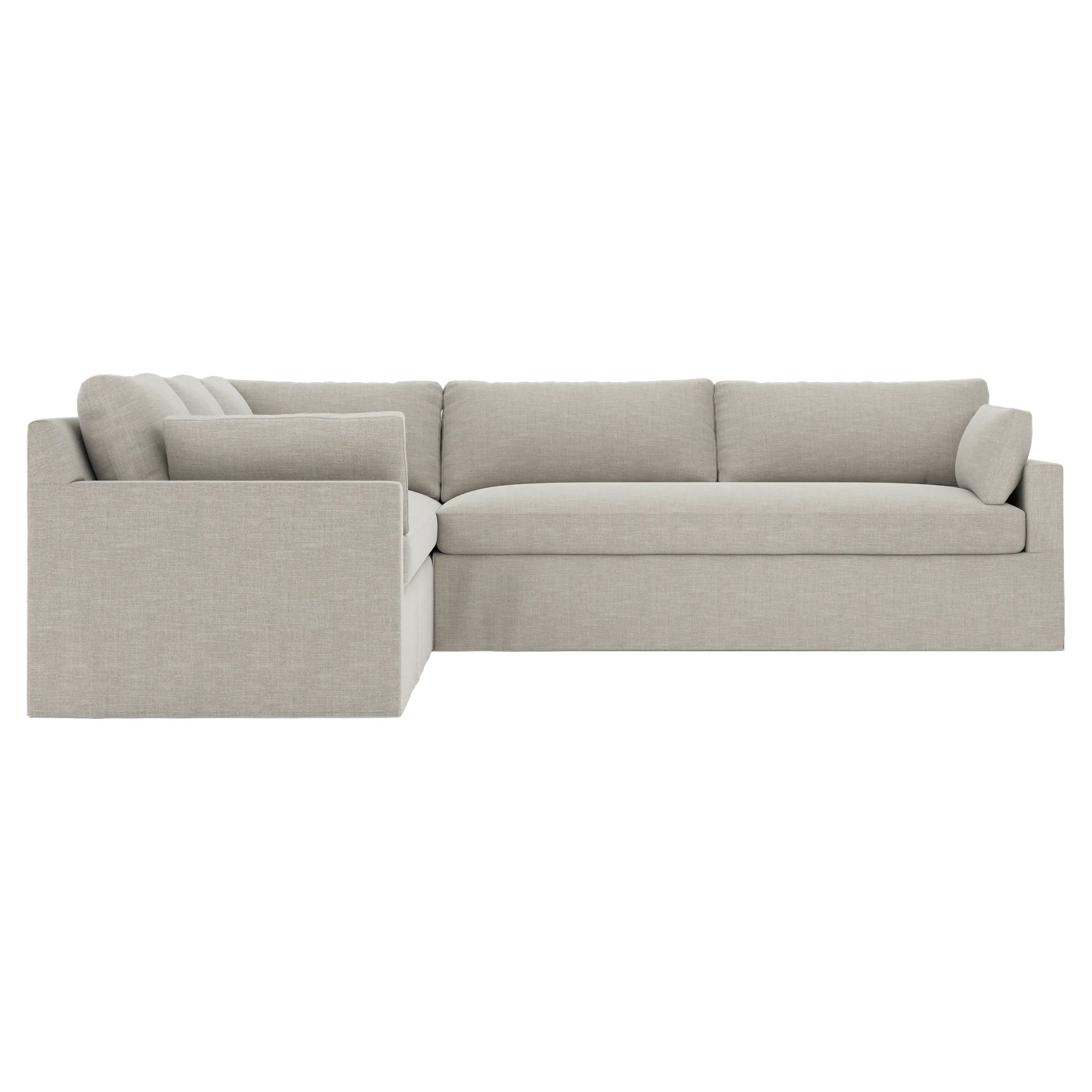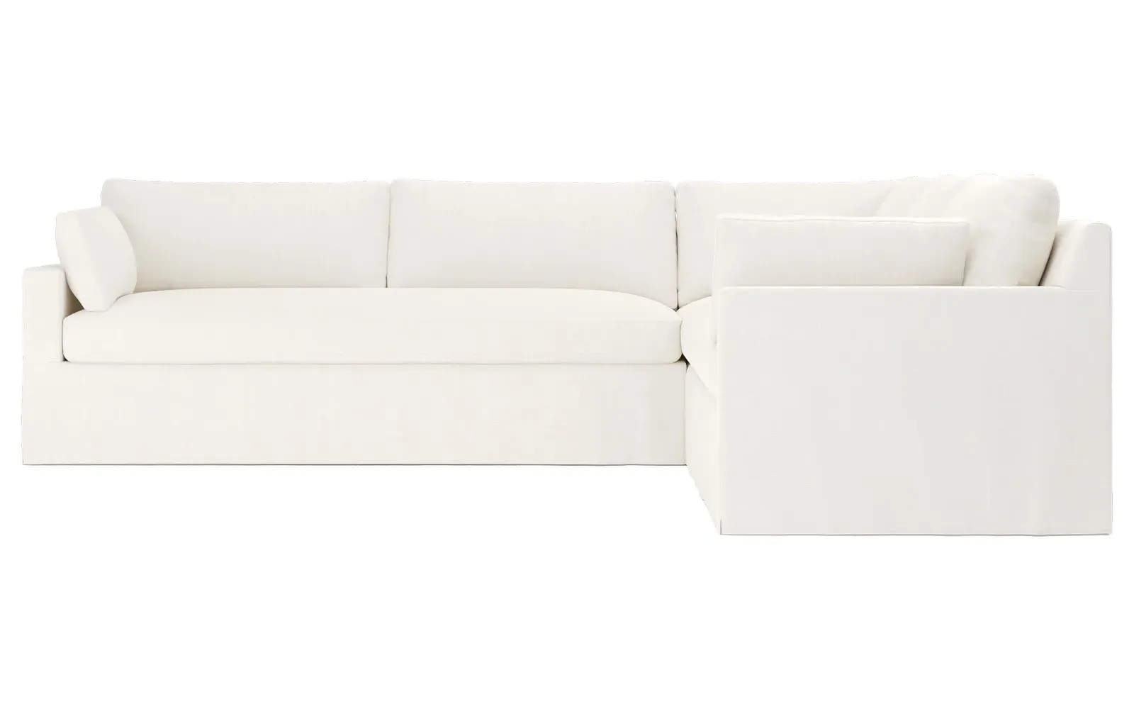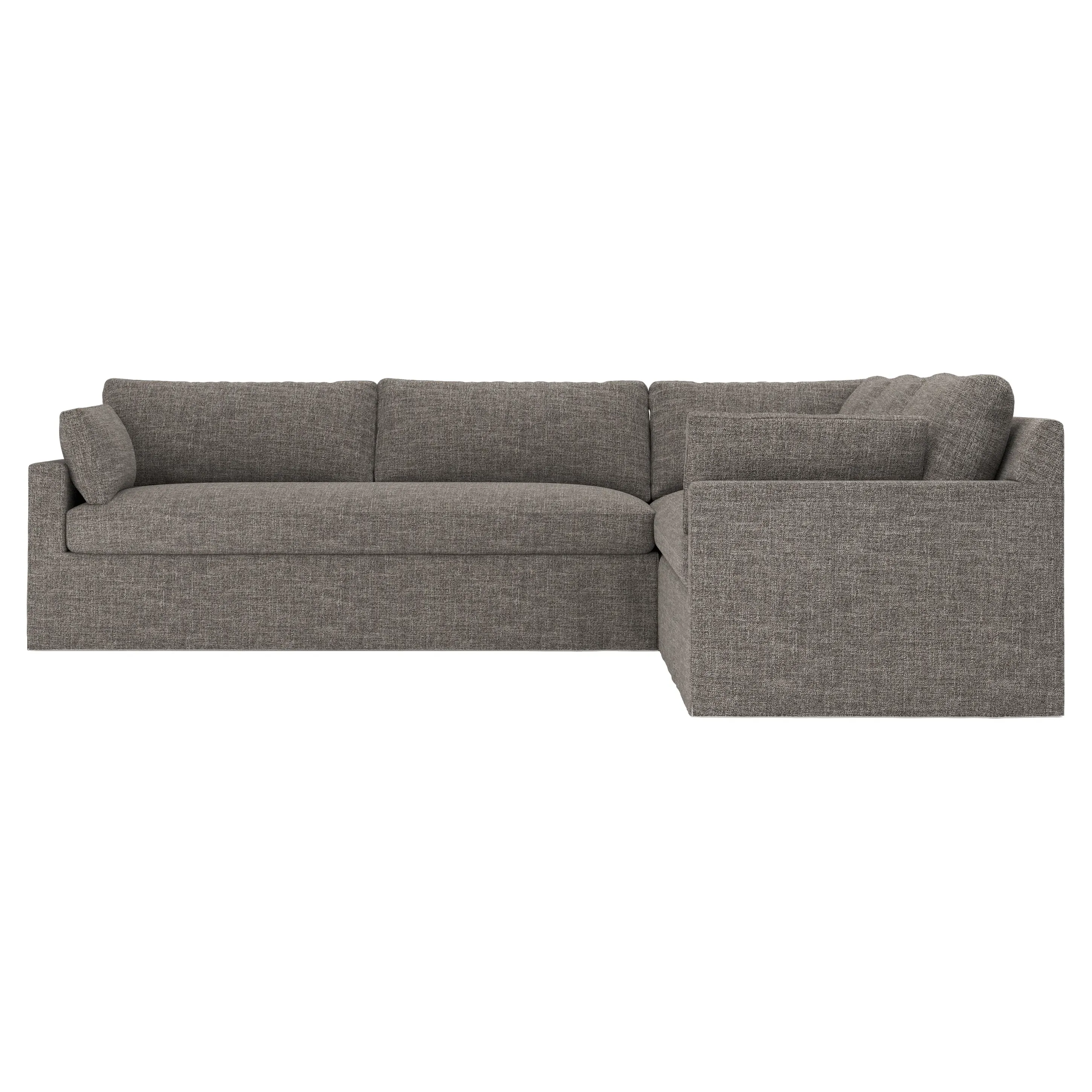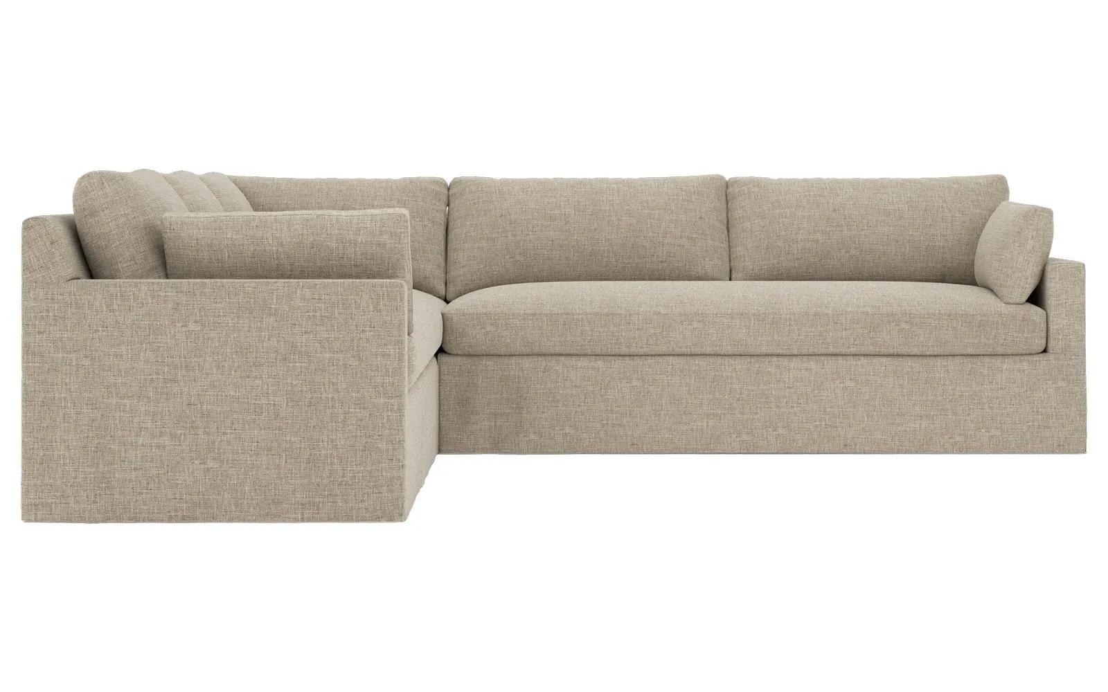 With a generous profile and plush box cushions, the left 123” Weybridge corner sectional is perfect for large gatherings. Streamlined track arms and tapered wood legs elevate the simple, modern silhouette. Soft and supportive cushioning offers plush, cloud-like comfort, with a foam core surrounded by a blend of fiber, down, and feather fill. The long bench seat provides uninterrupted comfort. Choose from a variety of upholstery options, including linen, velvet, and performance fabrics. <b>Overall Dimensions:</b> 123" W x 116" D x 35" H. <b>End Sofa Dimensions:</b> 84” W x 39” D x 35” H; <b>End Sofa with Corner Dimensions:</b> 116” W x 39” D x 35” H; <b>Seat Dimensions:</b> 24” D x 21” H; <b>Arm Height:</b> 25”; <b>Leg Height:</b> 2”. <b>Materials:</b> FSC®-certified, US-sourced, formaldehyde-free solid kiln-dried hardwood and furniture-grade laminates. <b>Material Finish:</b> Espresso. <b>Pieces Included:</b> Right end sofa with corner, left end sofa.