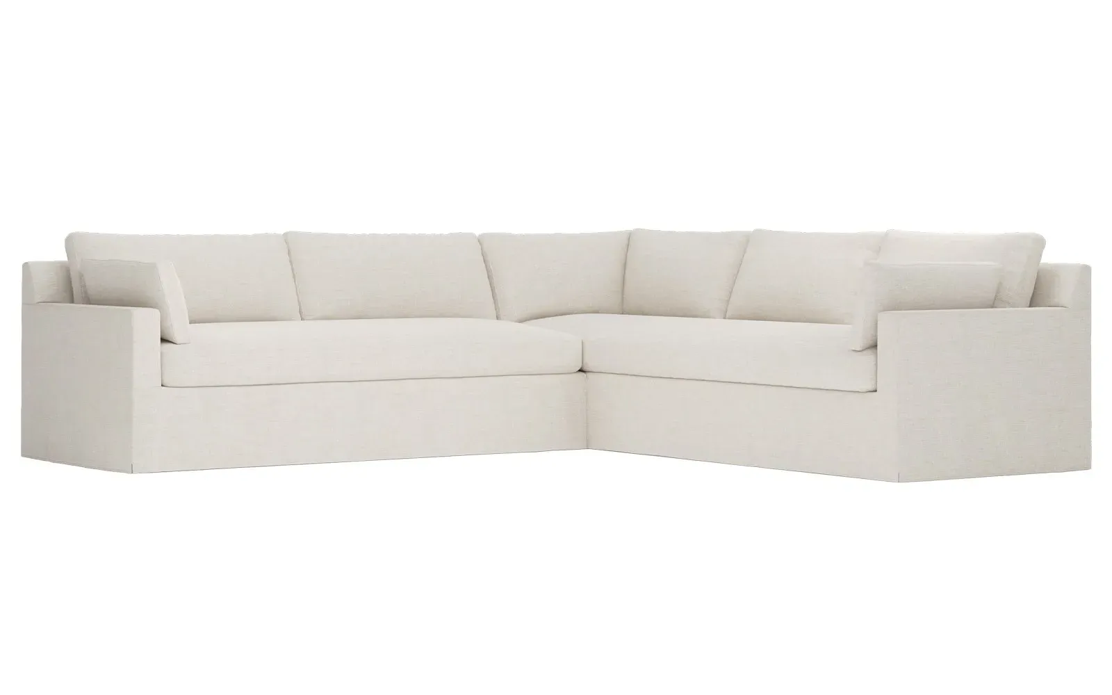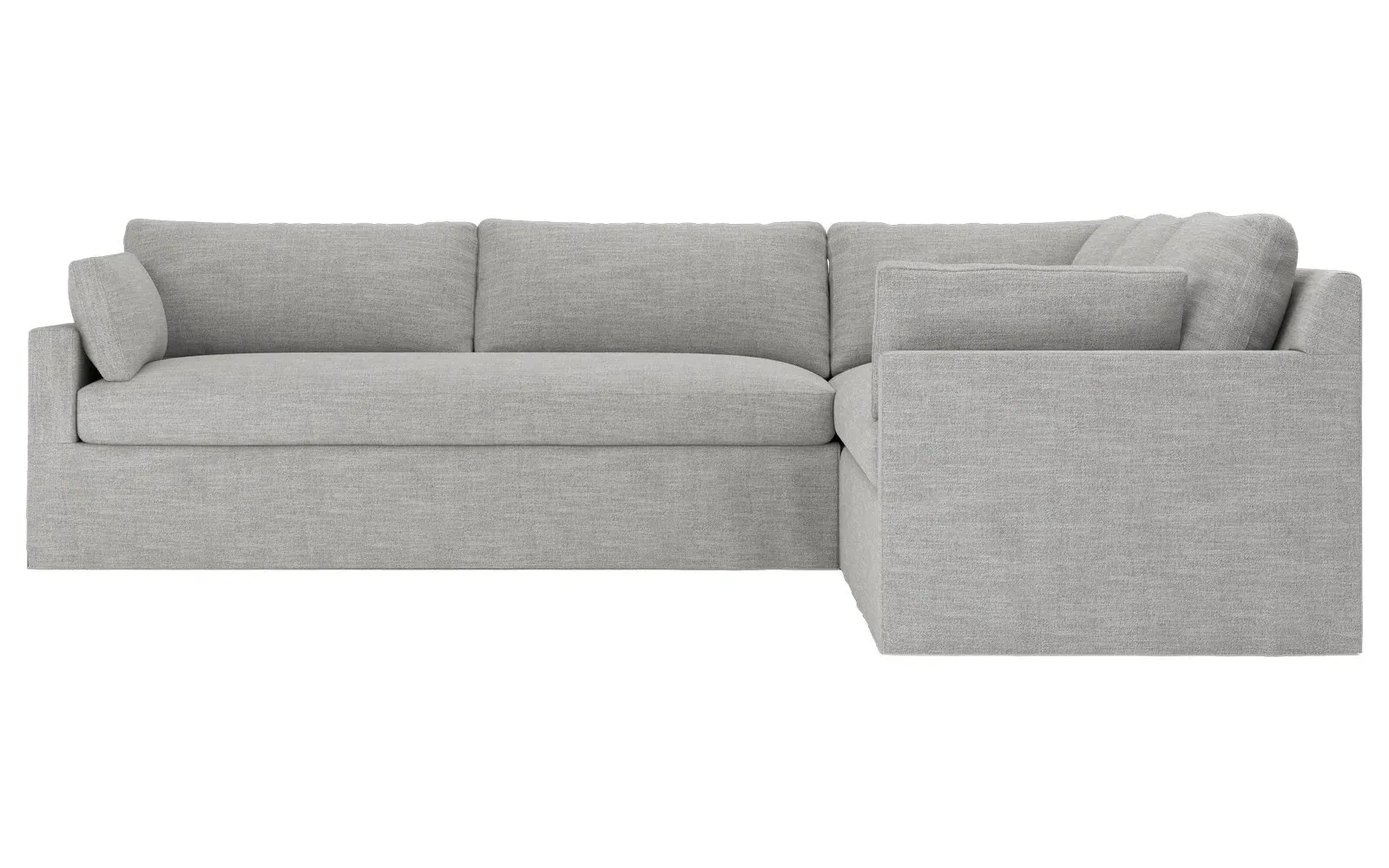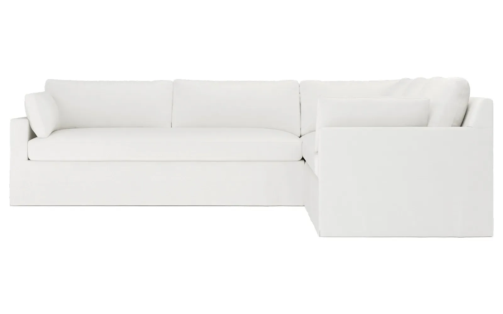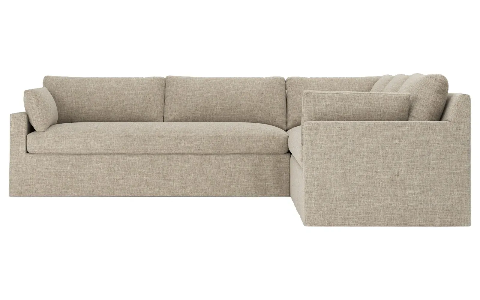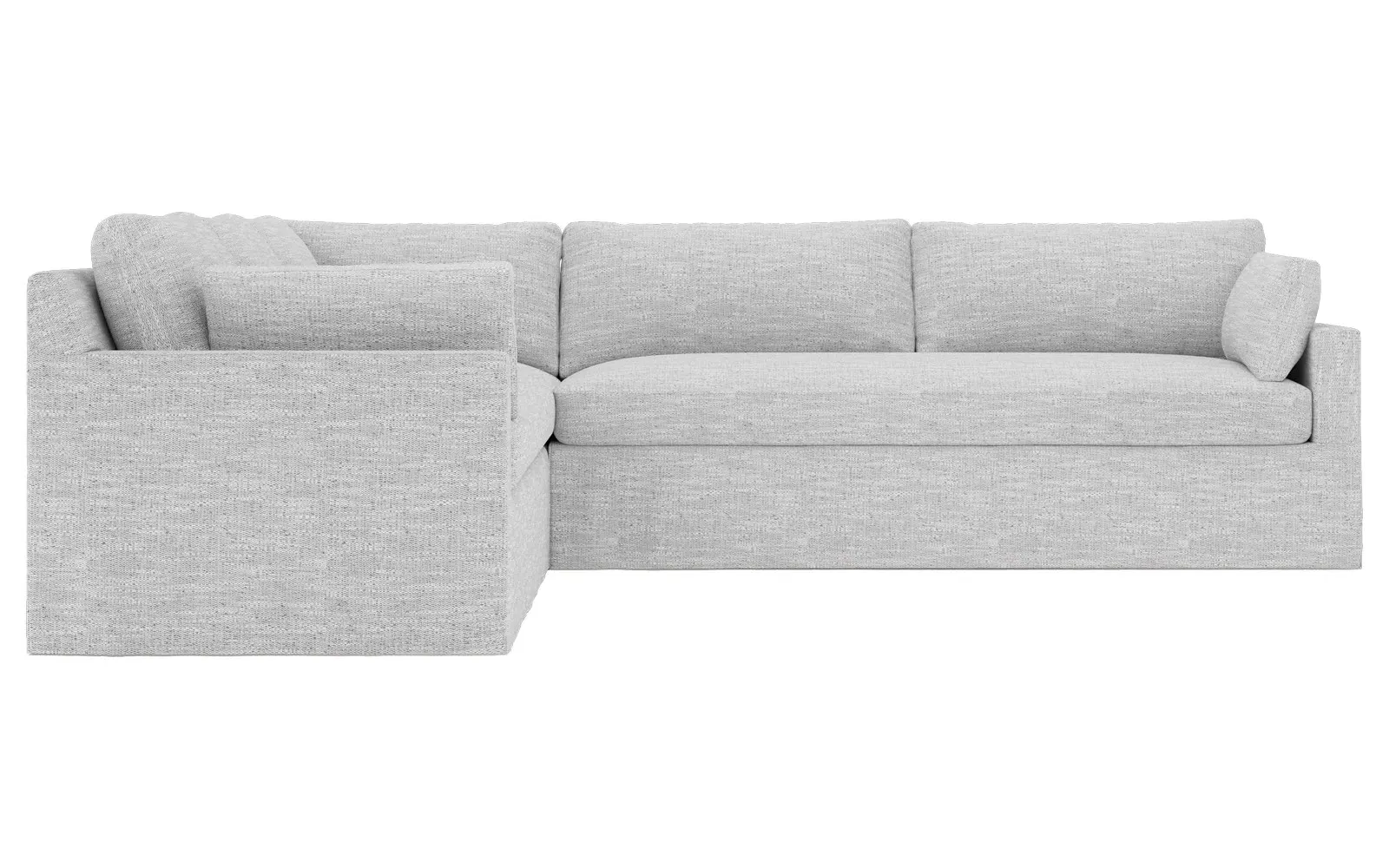 With a generous profile and plush box cushions, the left 123” Weybridge corner sectional is perfect for large gatherings. Streamlined track arms and tapered wood legs elevate the simple, modern silhouette. Soft and supportive cushioning offers plush, cloud-like comfort, with a foam core surrounded by a blend of fiber, down, and feather fill. The long bench seat provides uninterrupted comfort. Choose from a variety of upholstery options, including linen, velvet, and performance fabrics. <b>Overall Dimensions:</b> 123" W x 116" D x 35" H. <b>End Sofa Dimensions:</b> 84” W x 39” D x 35” H; <b>End Sofa with Corner Dimensions:</b> 116” W x 39” D x 35” H; <b>Seat Dimensions:</b> 24” D x 21” H; <b>Arm Height:</b> 25”; <b>Leg Height:</b> 2”. <b>Materials:</b> FSC®-certified, US-sourced, formaldehyde-free solid kiln-dried hardwood and furniture-grade laminates. <b>Material Finish:</b> Espresso. <b>Pieces Included:</b> Right end sofa with corner, left end sofa.