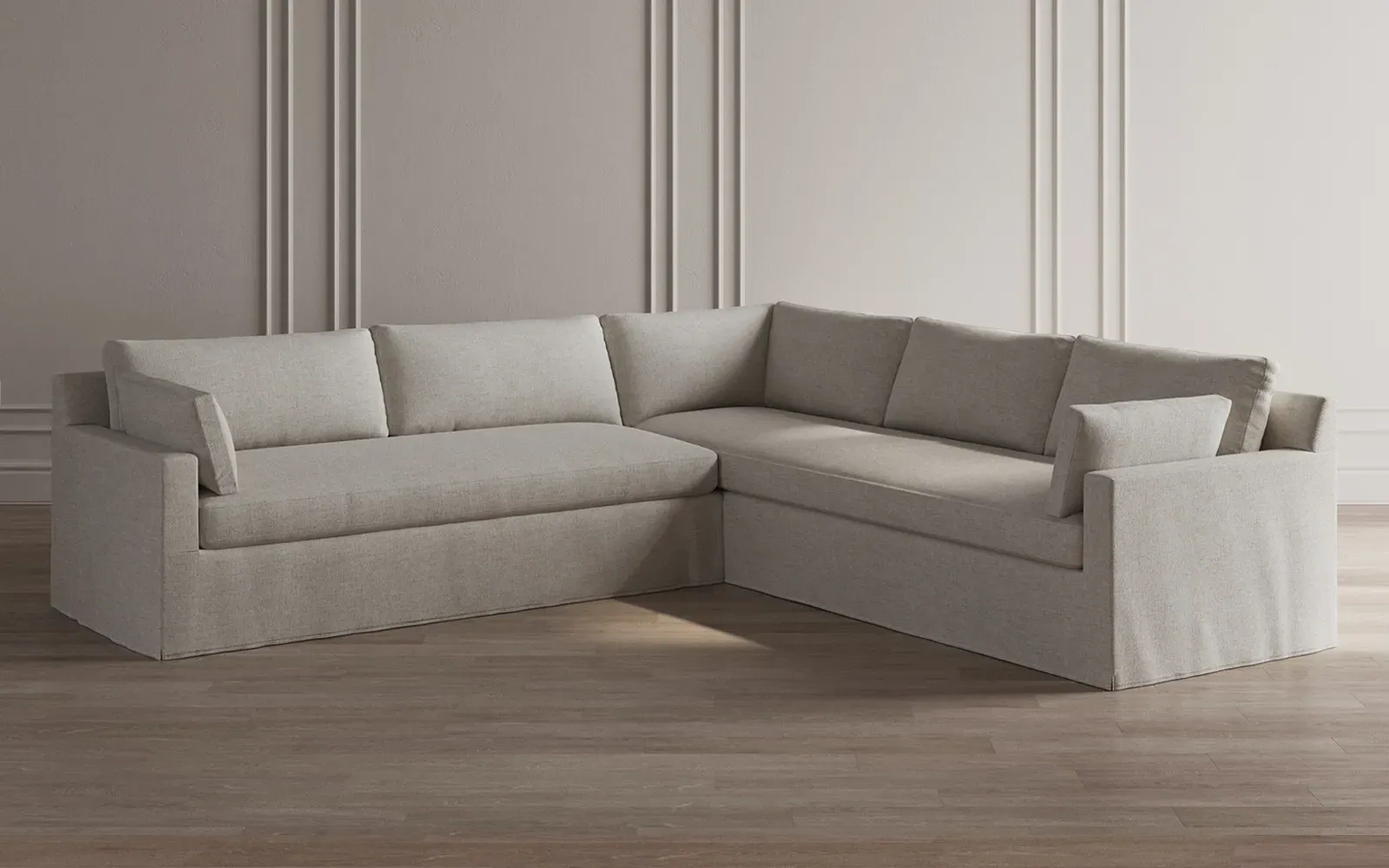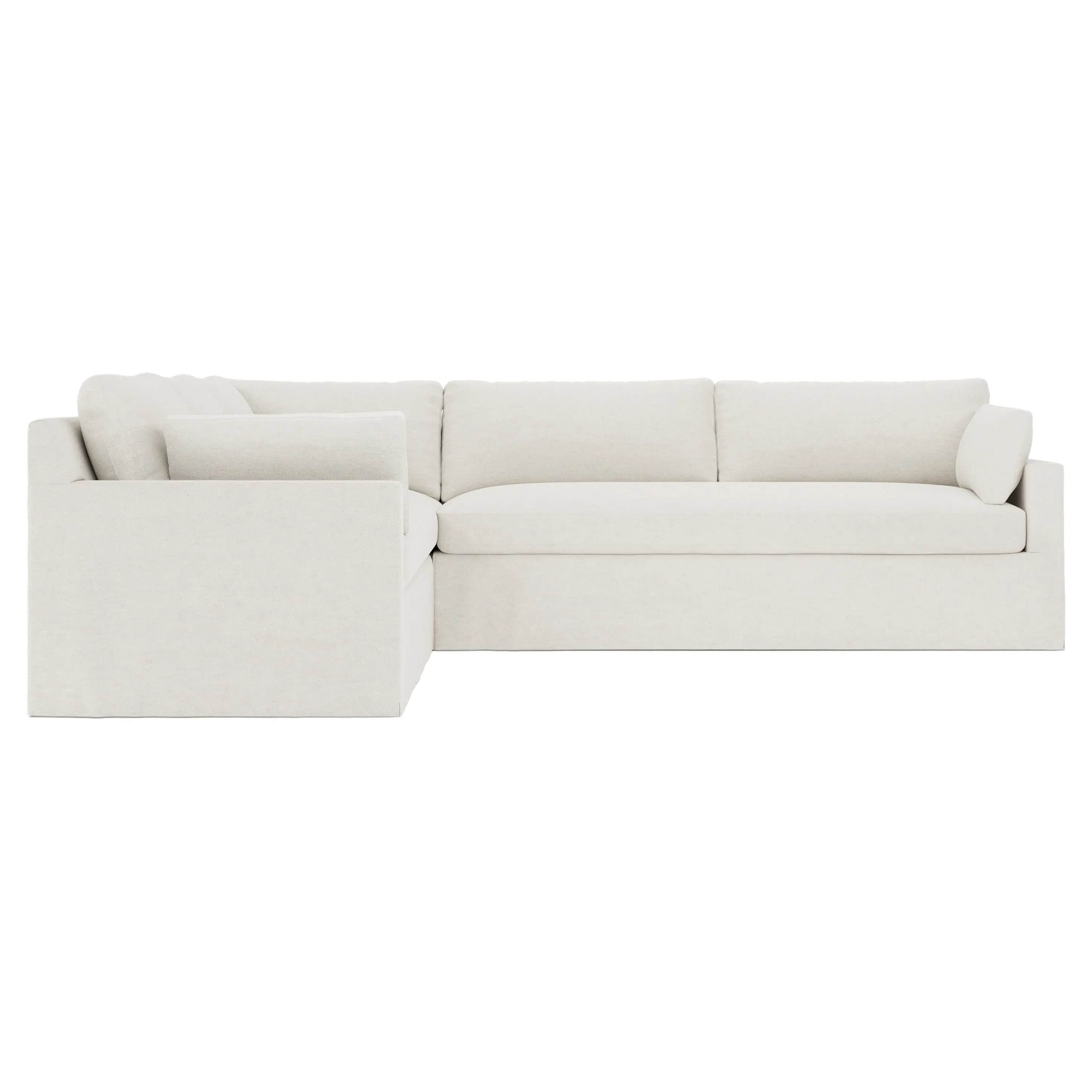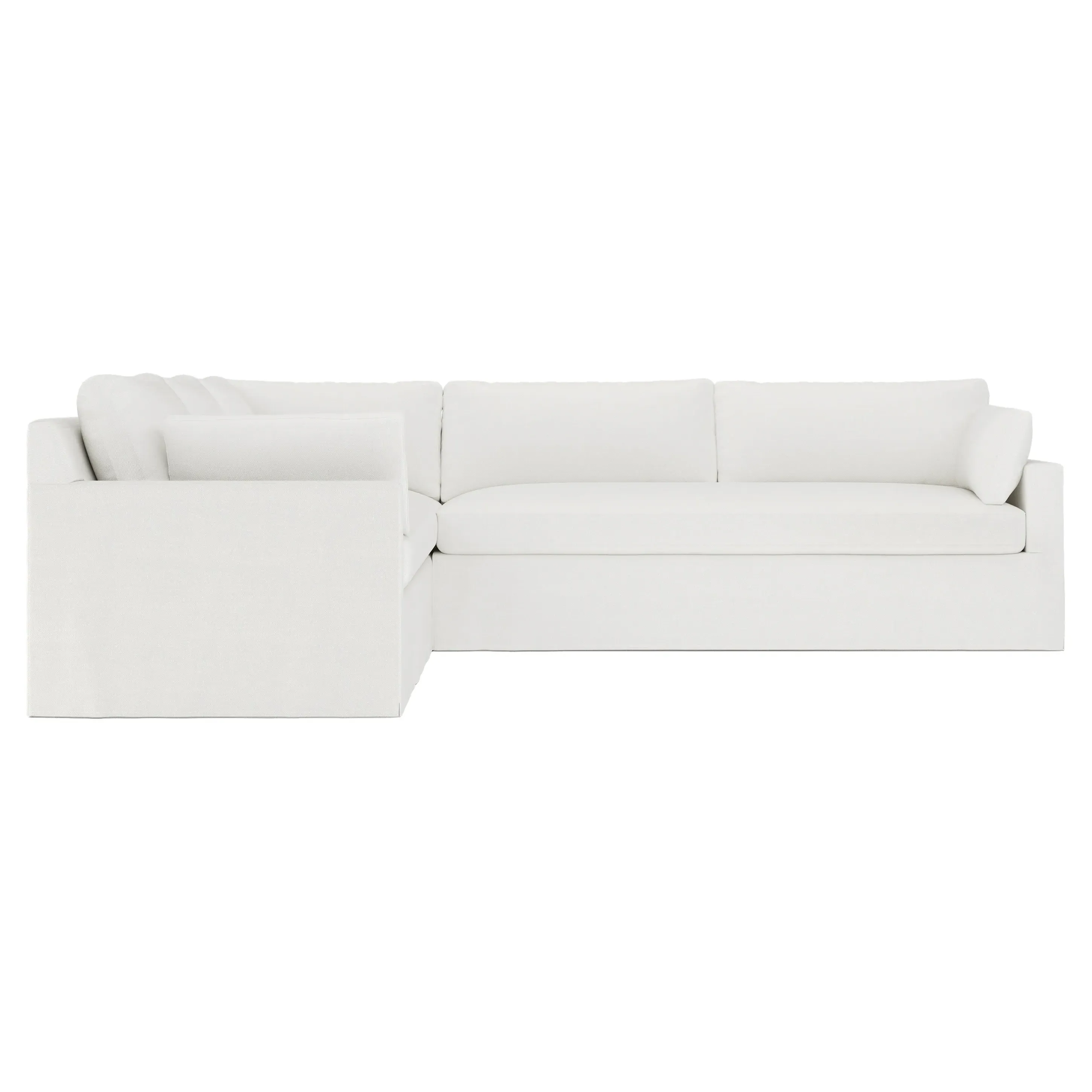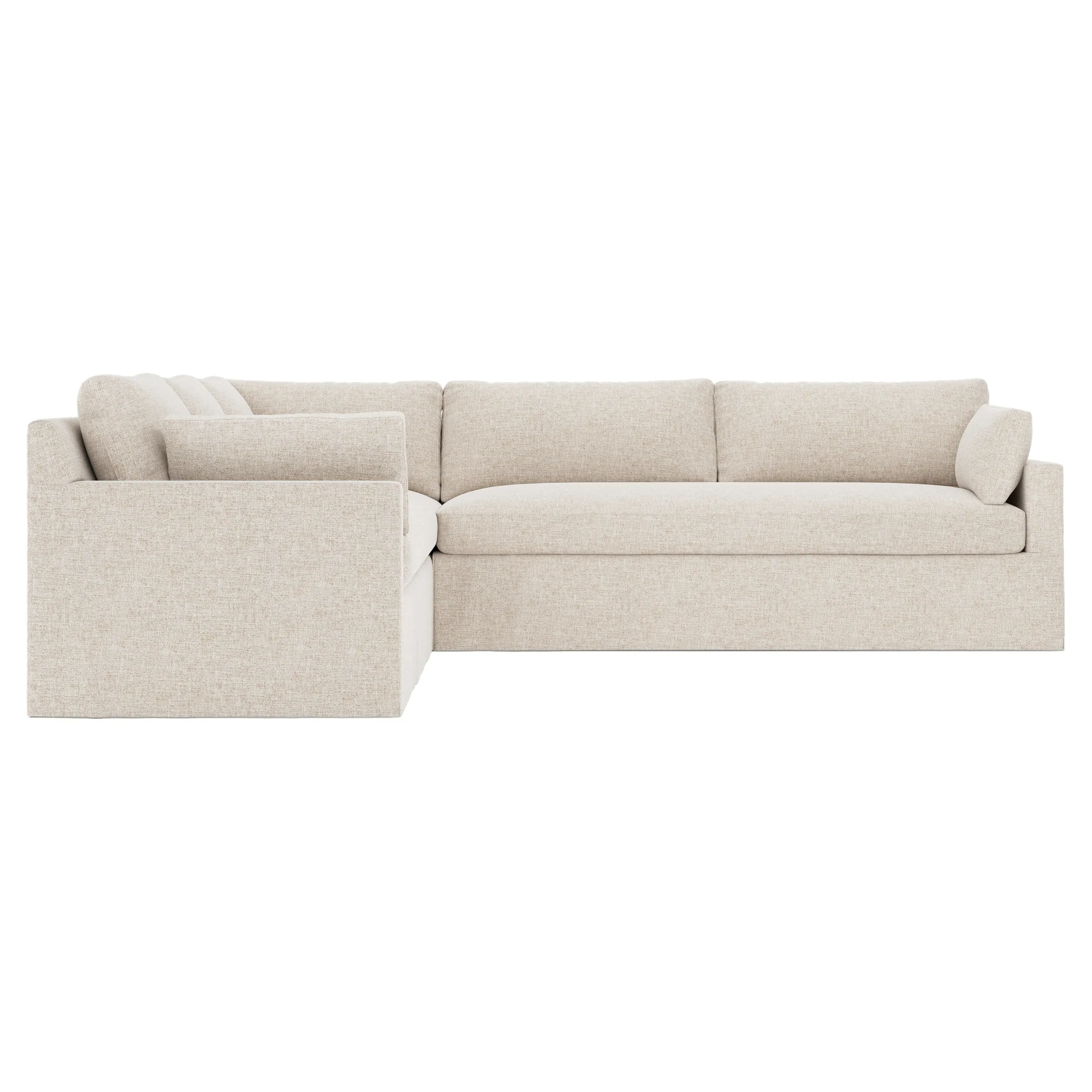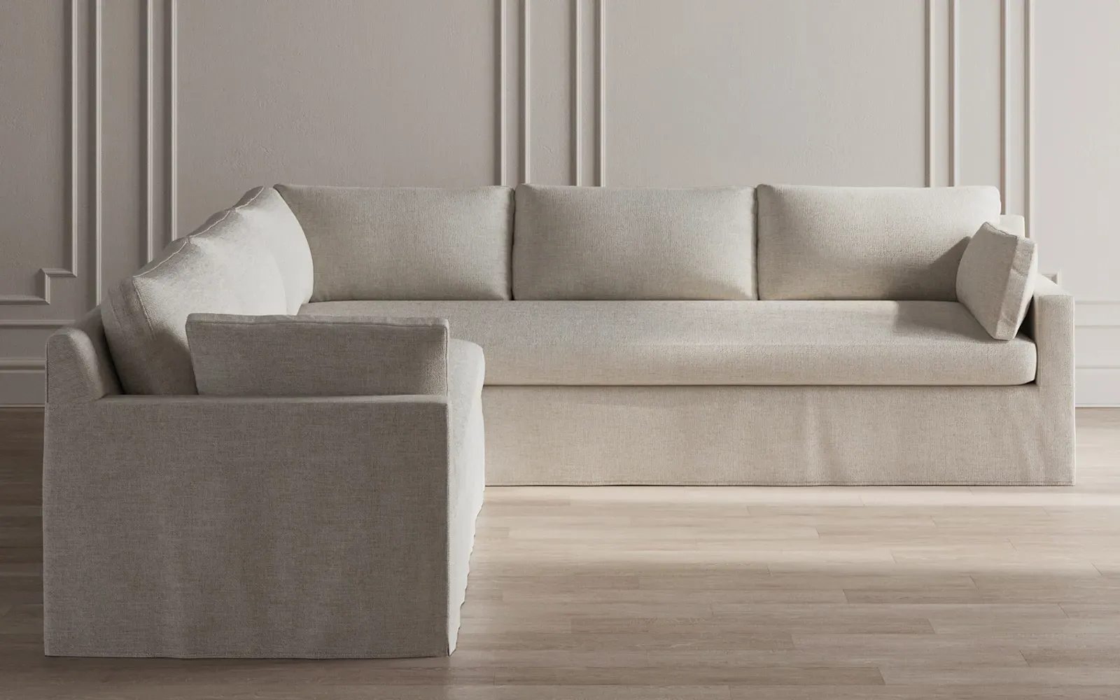 The Weybridge corner sectional offers generous seating with plush box cushions and streamlined track arms. Its foam core surrounded by fiber, down, and feather fill provides cloud-like comfort, while the tapered wood legs add stability. The long bench seat delivers uninterrupted lounging space, and the FSC-certified kiln-dried hardwood frame ensures lasting durability. W312 x D295 x H89 cm.