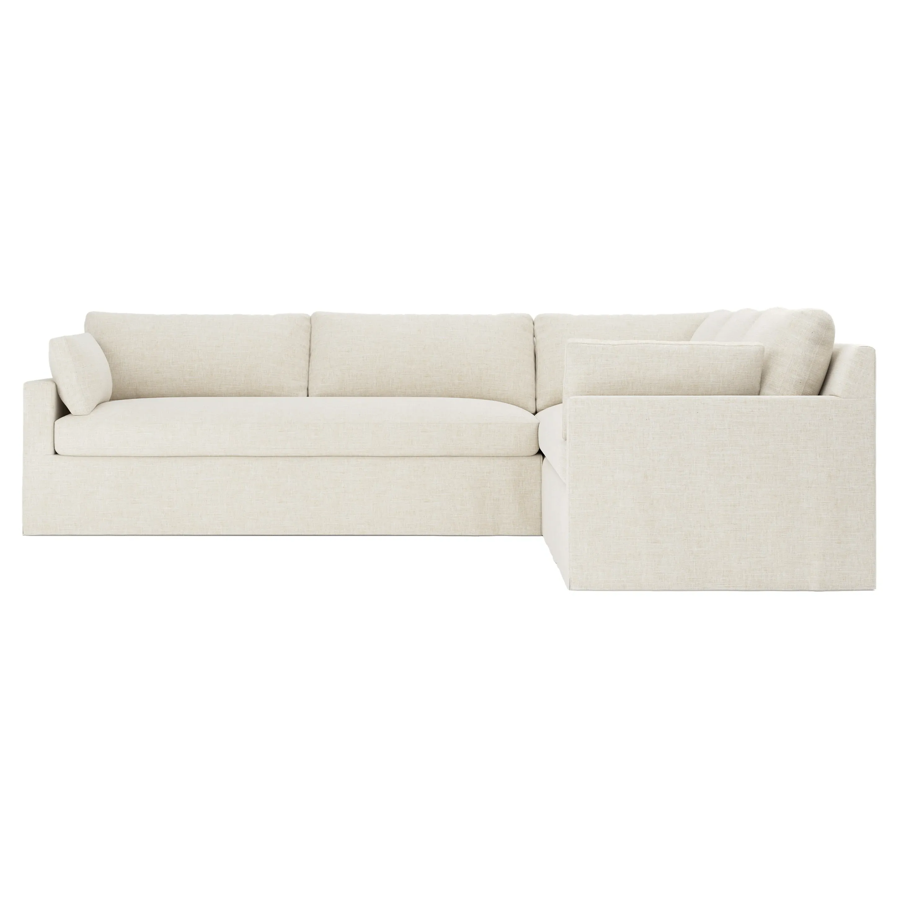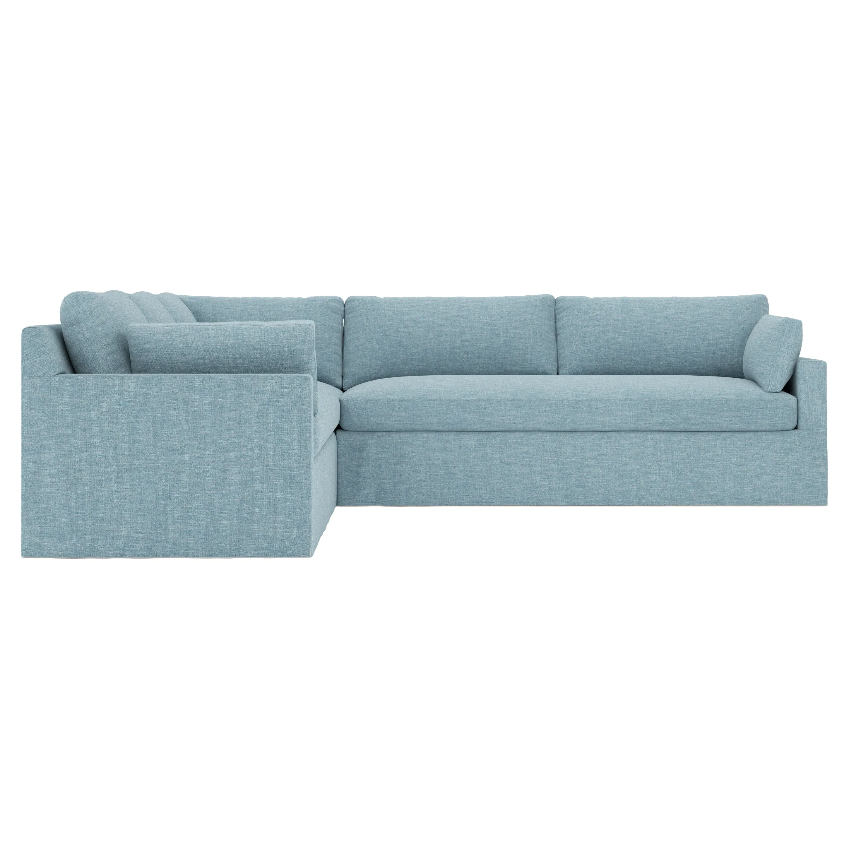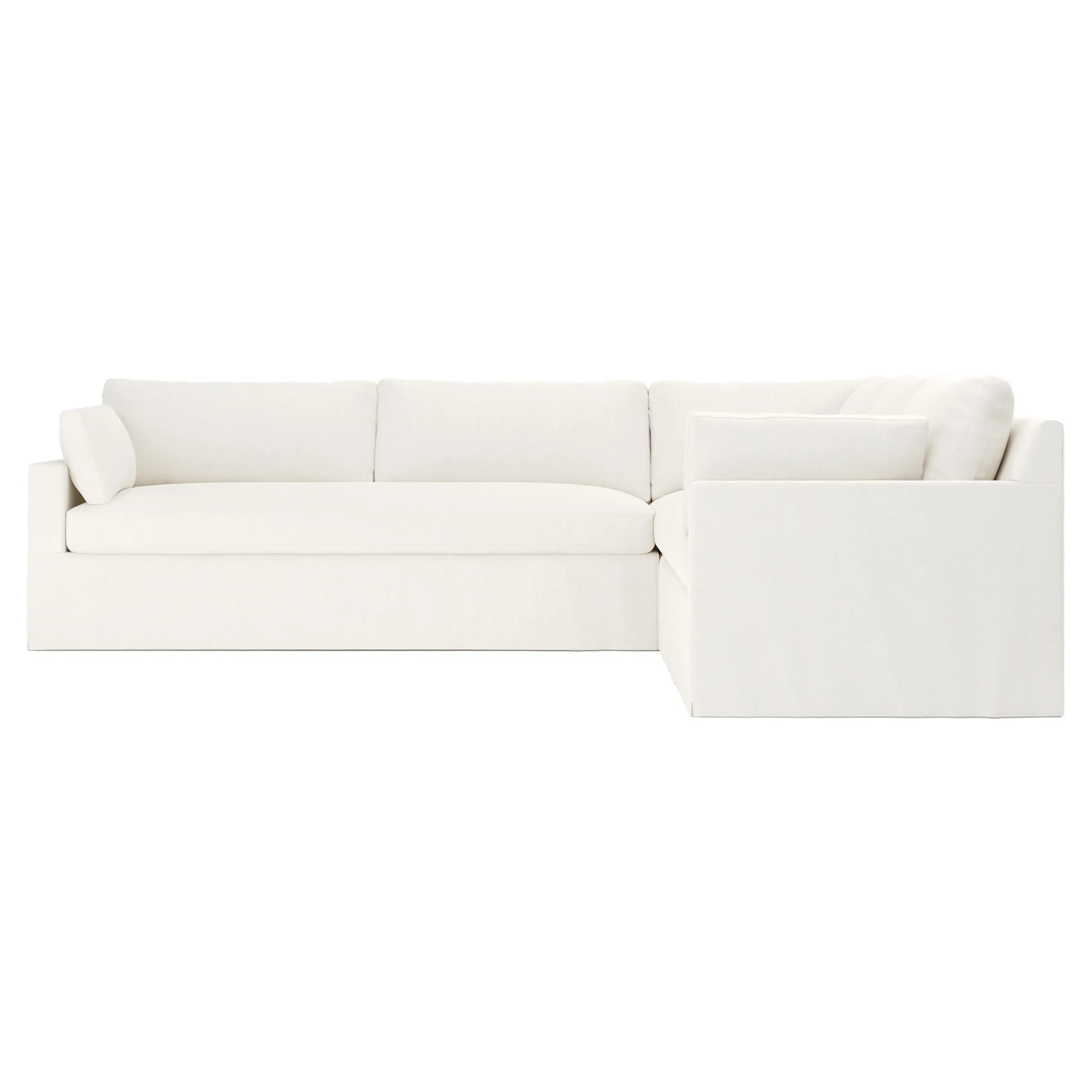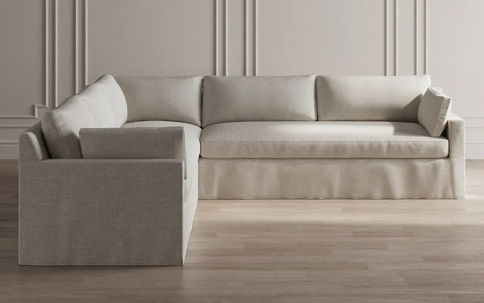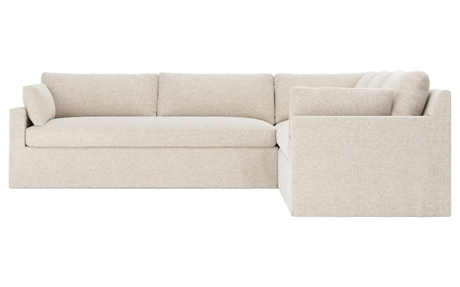 The Weybridge corner sectional offers generous seating with plush box cushions and streamlined track arms. Its foam core surrounded by fiber, down, and feather fill provides cloud-like comfort, while the tapered wood legs add stability. The long bench seat delivers uninterrupted lounging space, and the FSC-certified kiln-dried hardwood frame ensures lasting durability. W312 x D295 x H89 cm.