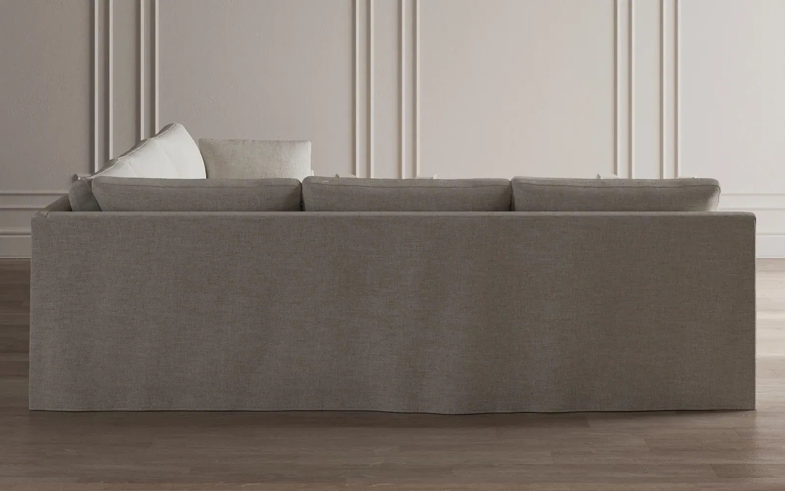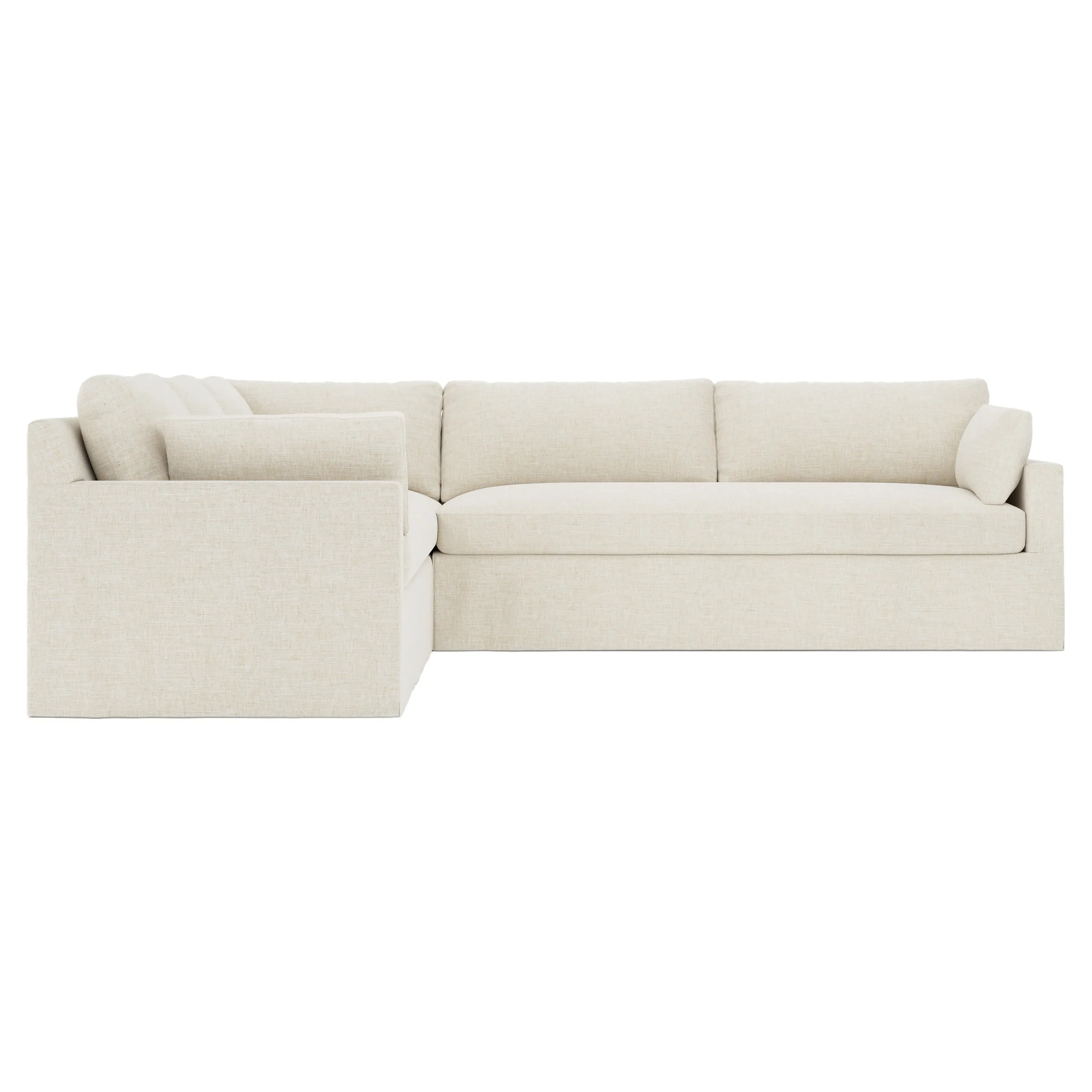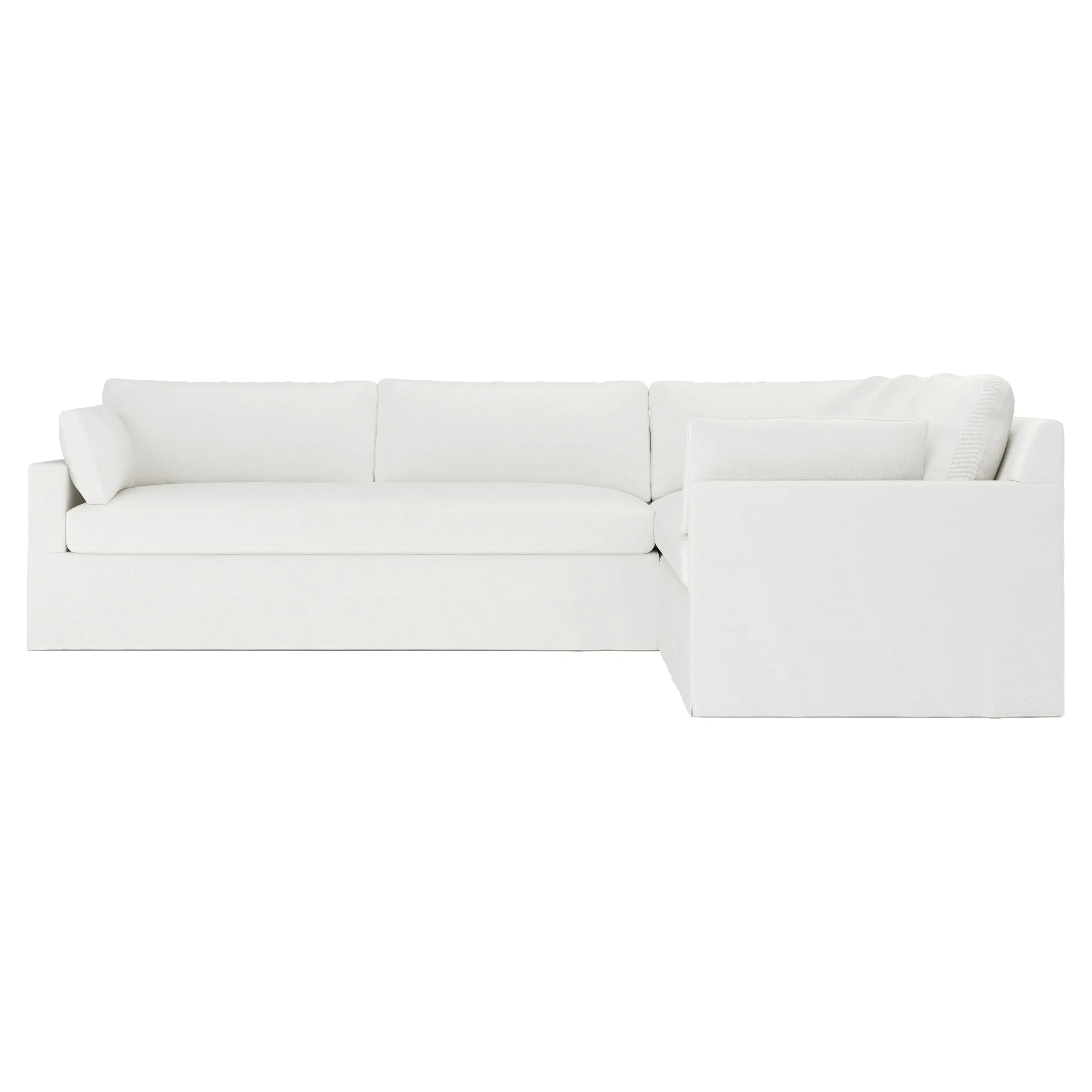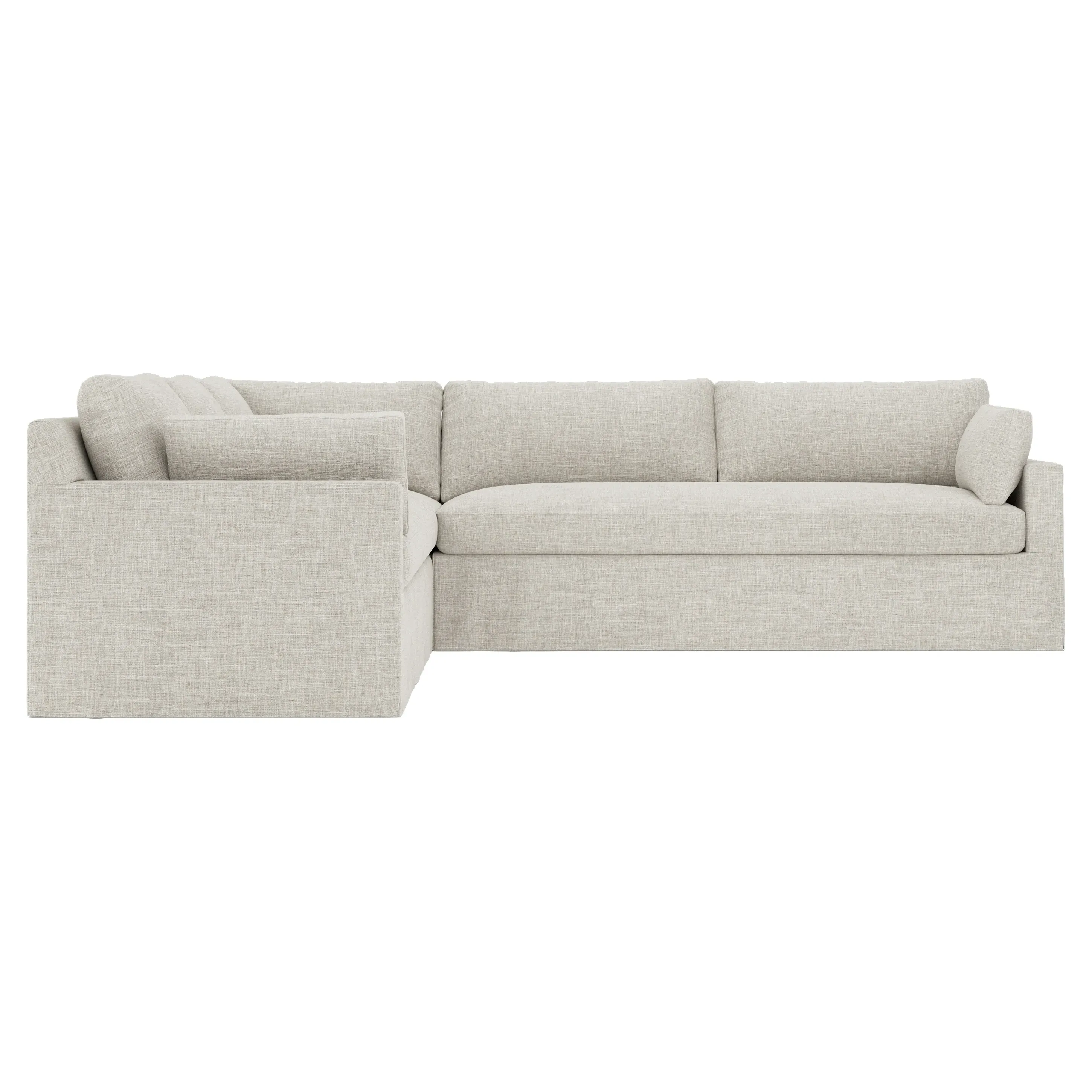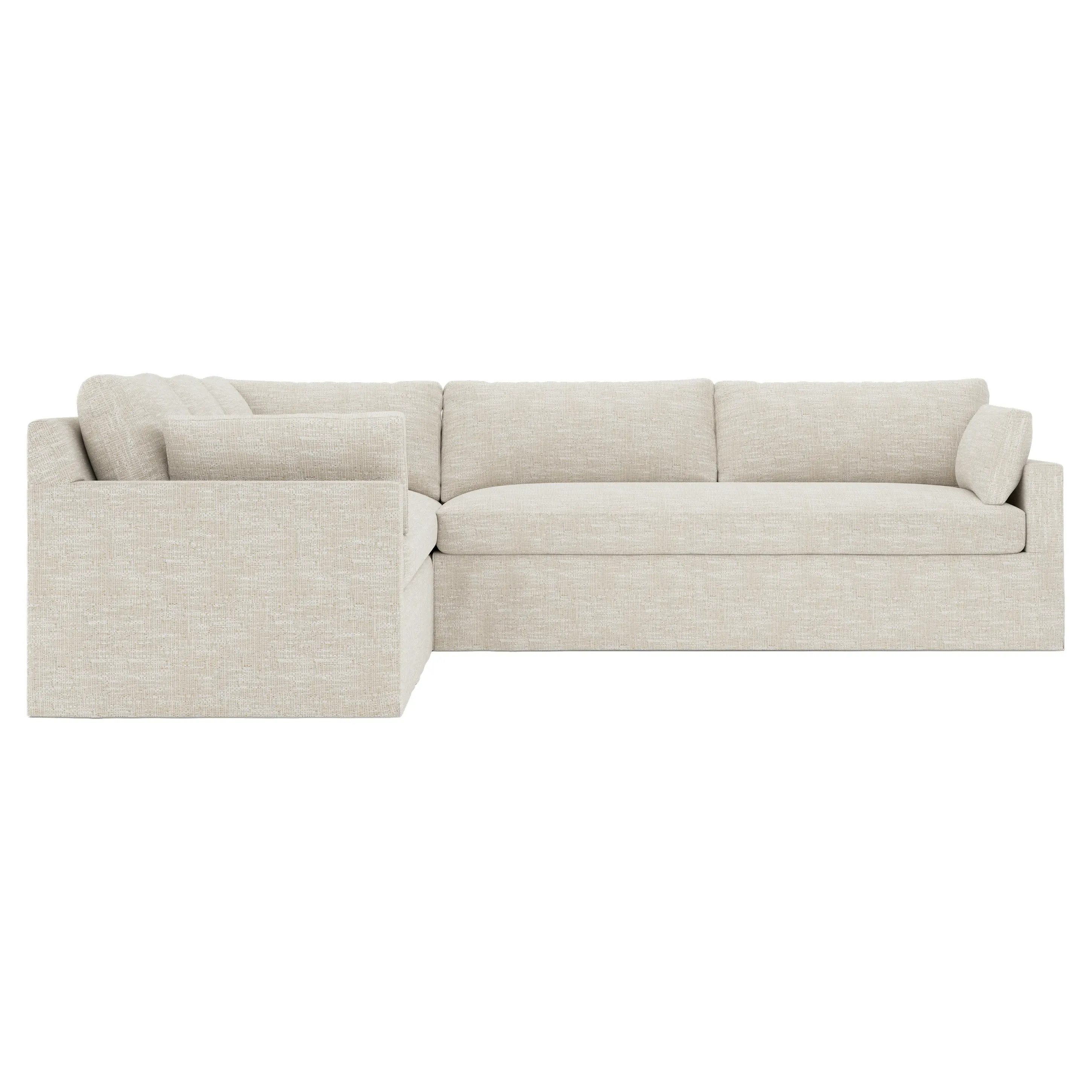 The Weybridge corner sectional offers generous seating with plush box cushions and streamlined track arms. Its foam core surrounded by fiber, down, and feather fill provides cloud-like comfort, while the tapered wood legs add stability. The long bench seat delivers uninterrupted lounging space, and the FSC-certified kiln-dried hardwood frame ensures lasting durability. W312 x D295 x H89 cm.