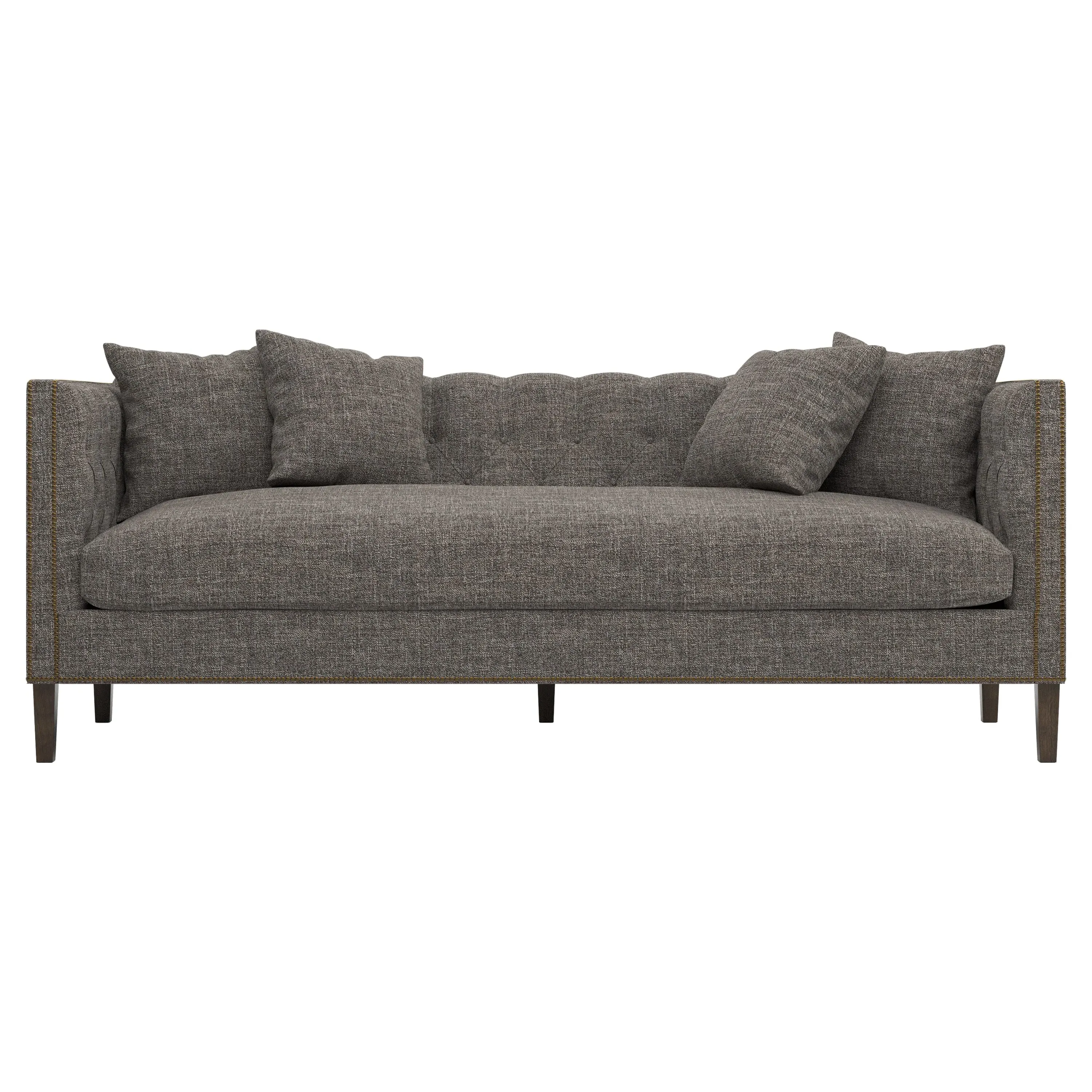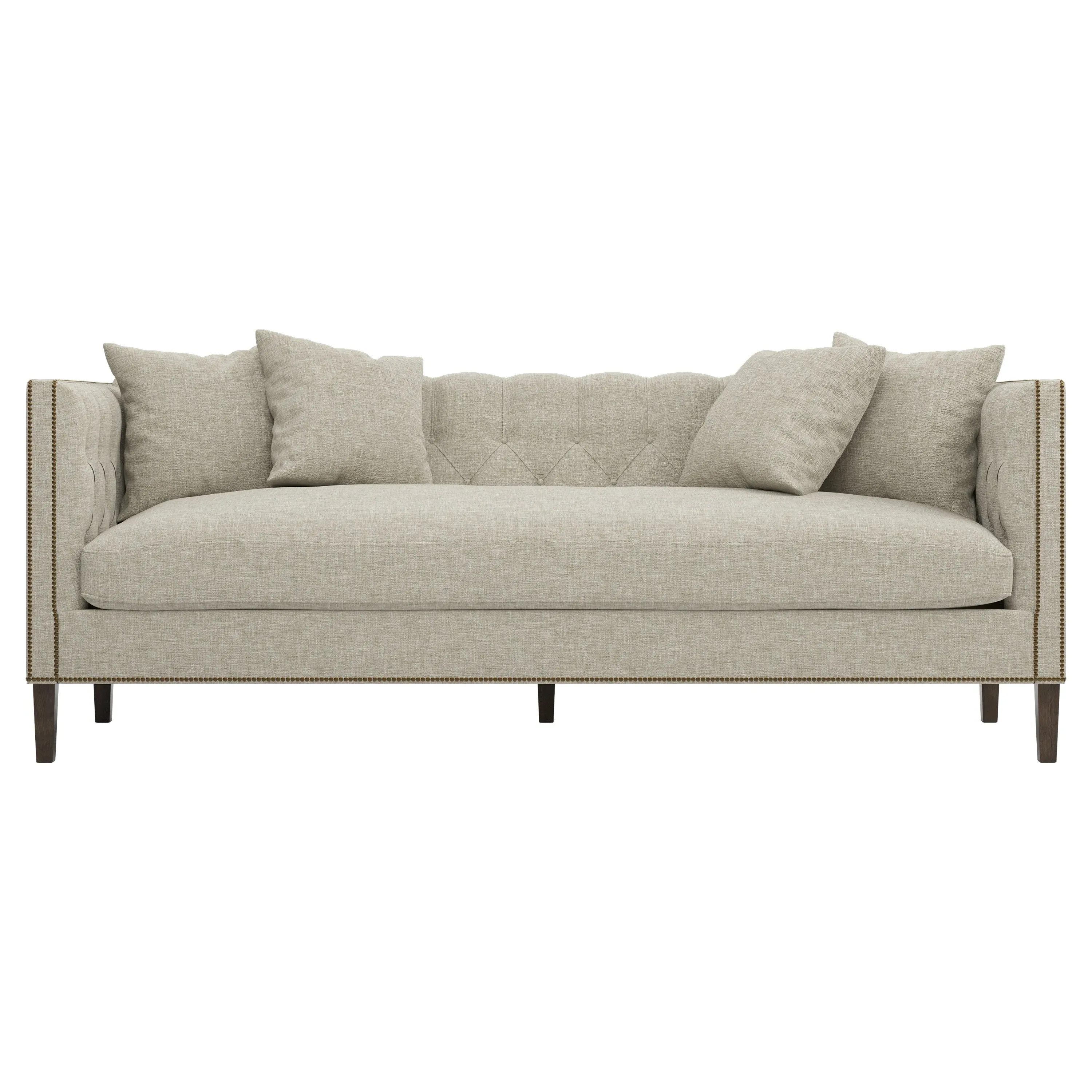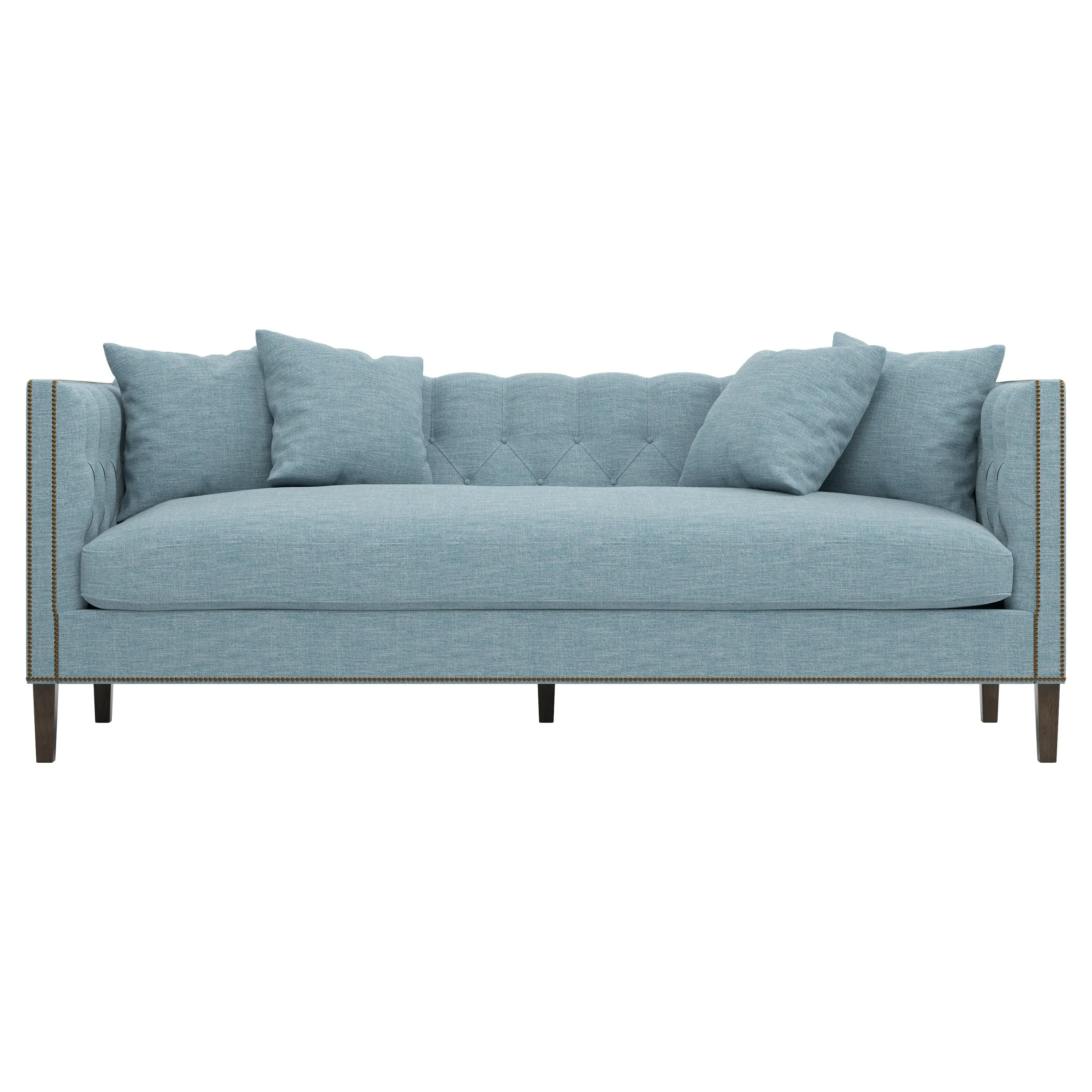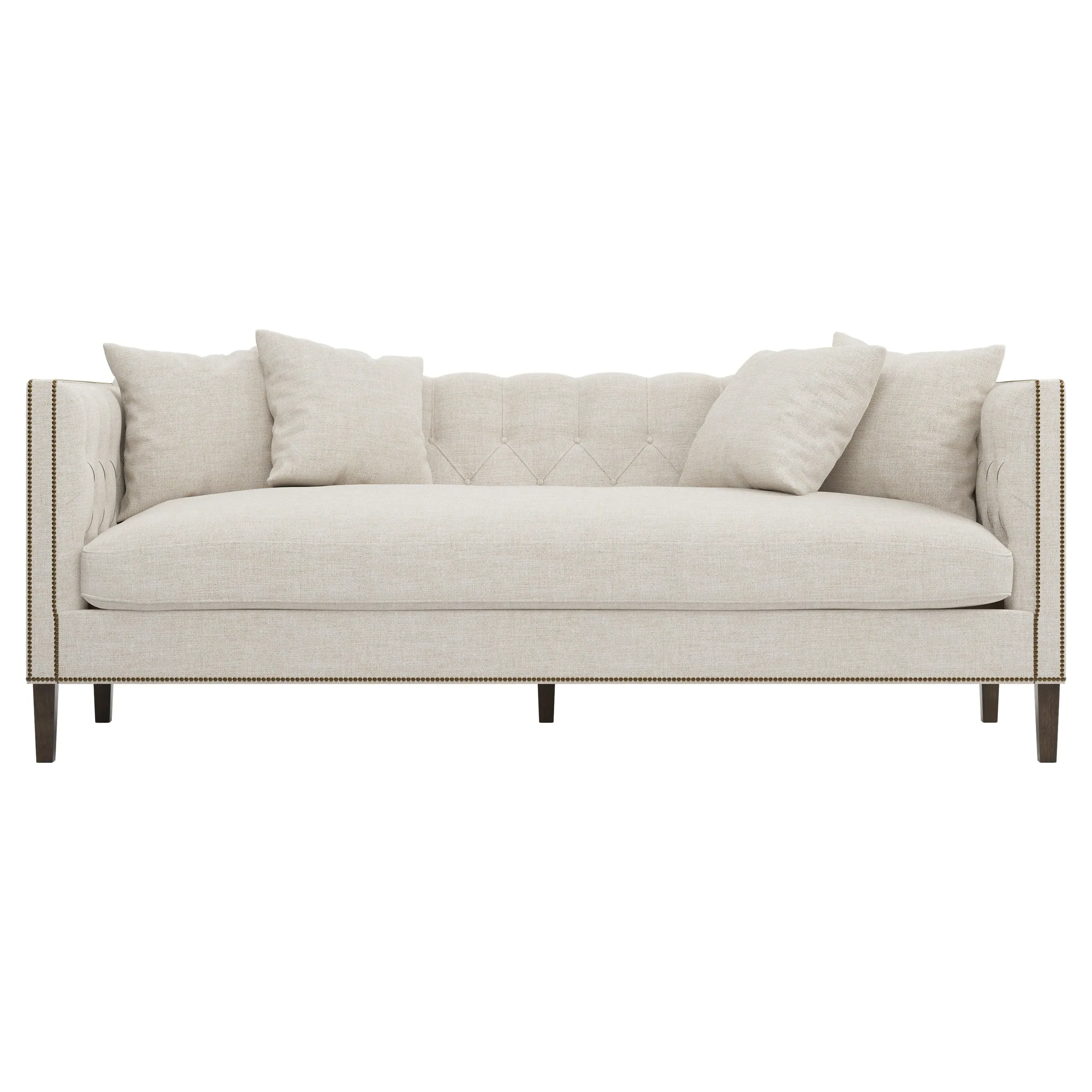 The Winifred sofa combines comfort with its bench cushion design, accented by brass nailhead trim. Its FSC-certified kiln-dried hardwood frame provides lasting durability, while the espresso finish adds rich contrast. The spacious seating suits relaxed gatherings, and the solid construction ensures reliable support. W234 x D91 x H86 cm.